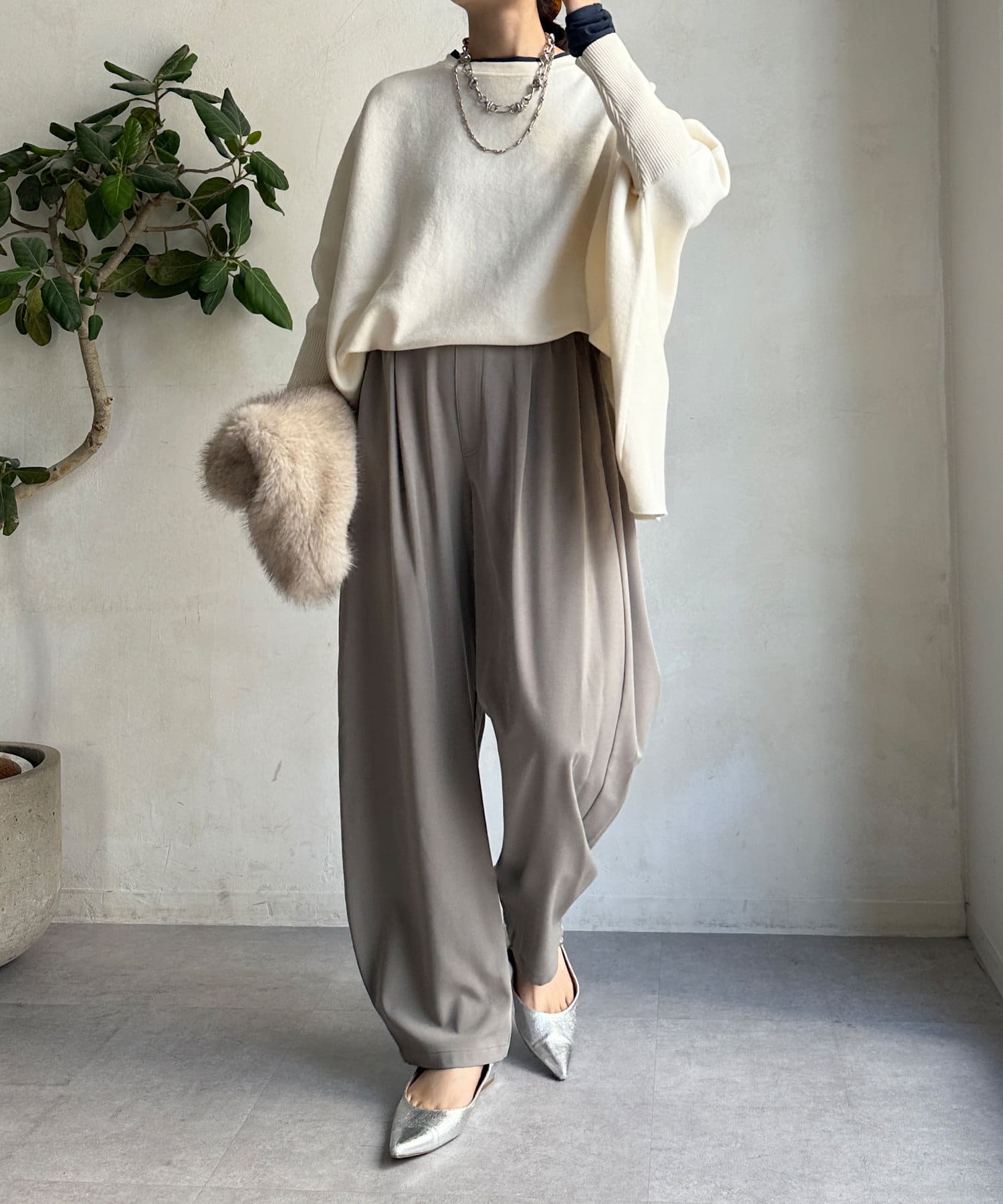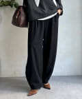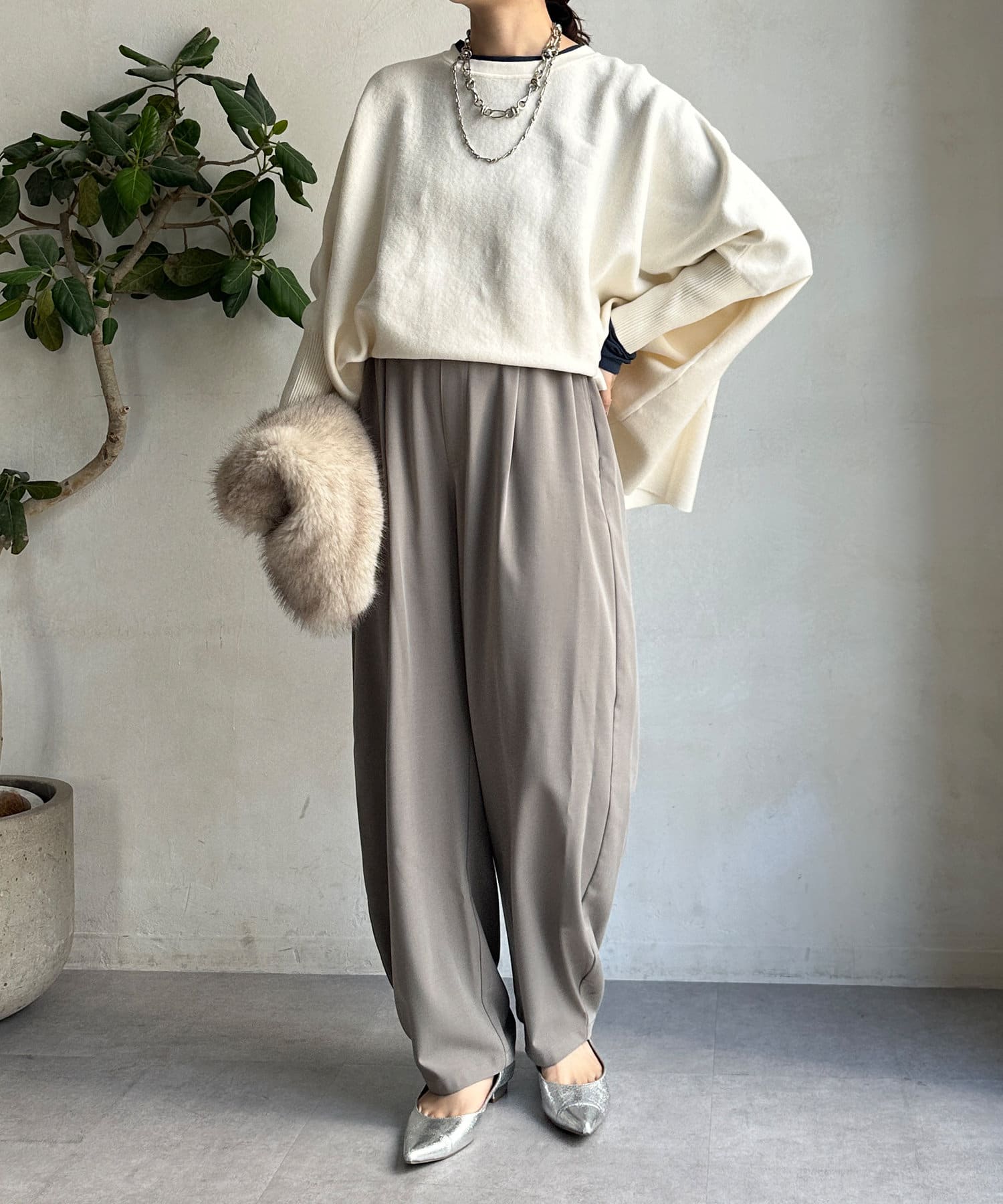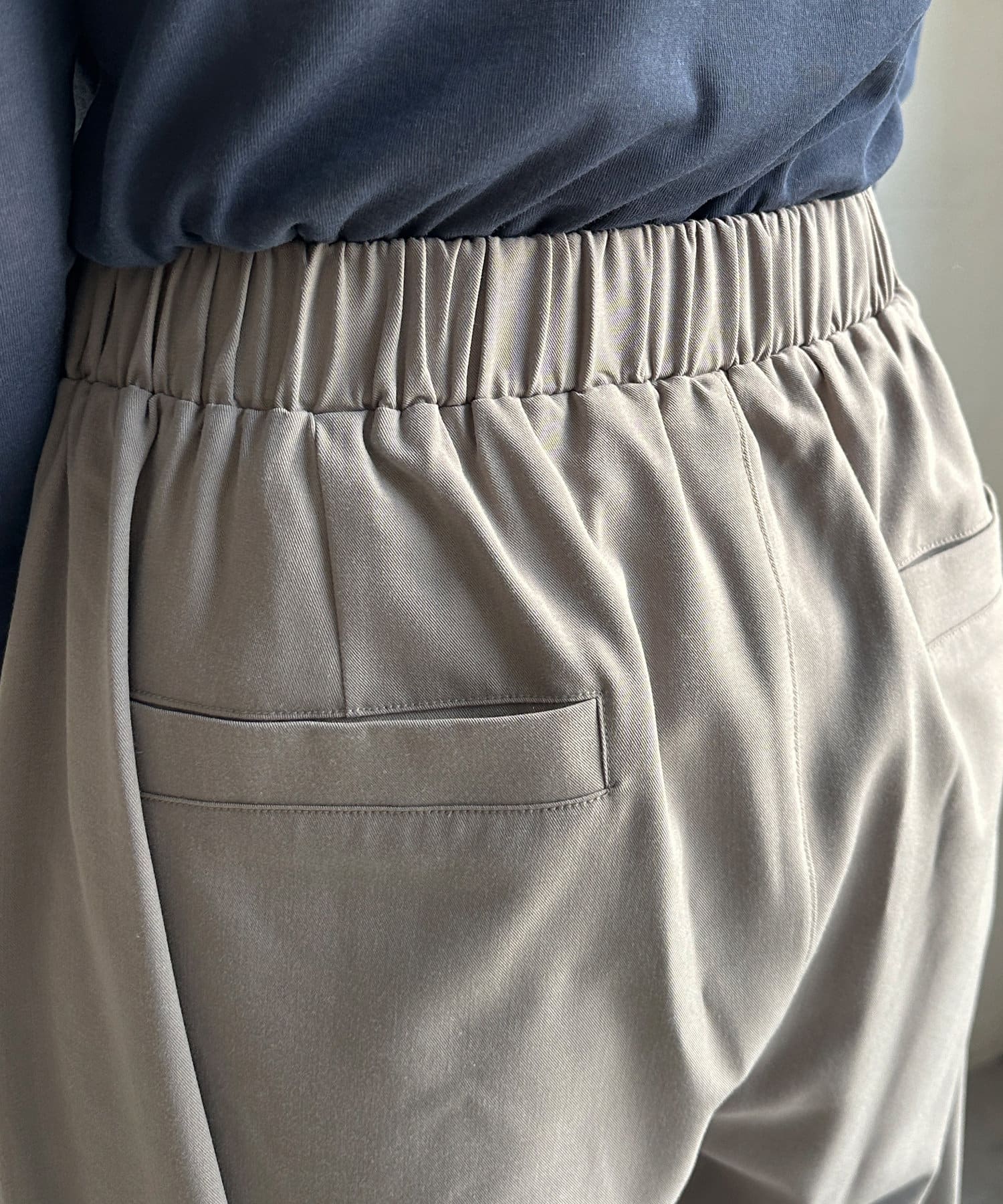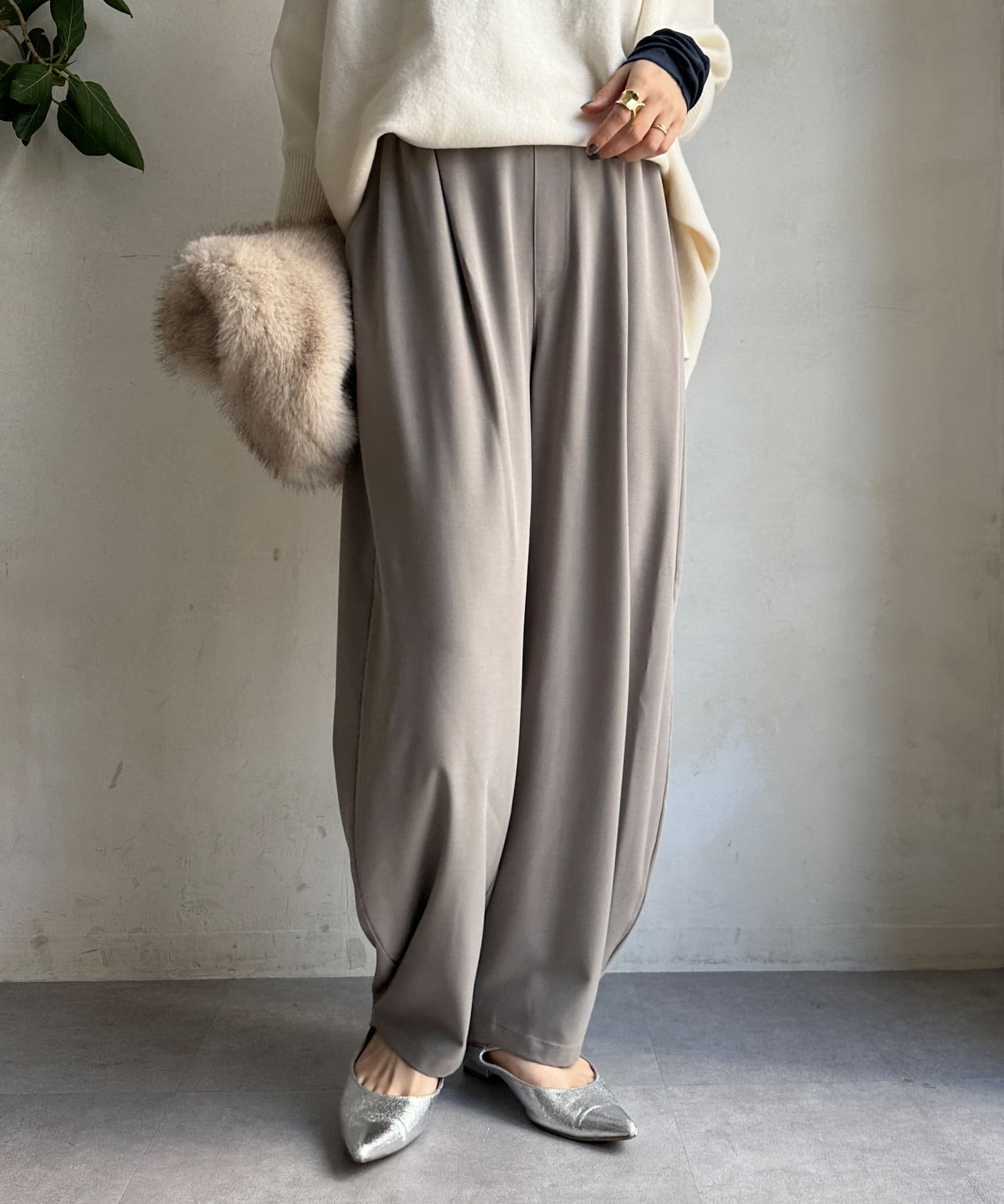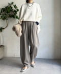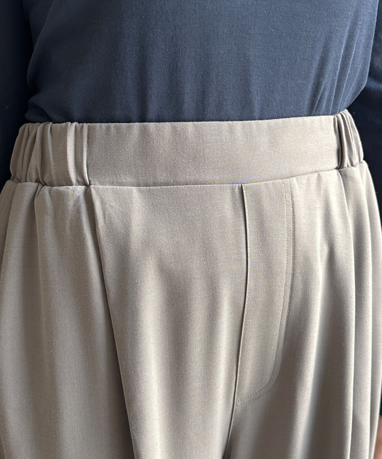 膝回りはゆったりと膨らみがあり、落ち感のある生地で、オン・オフ使えます。