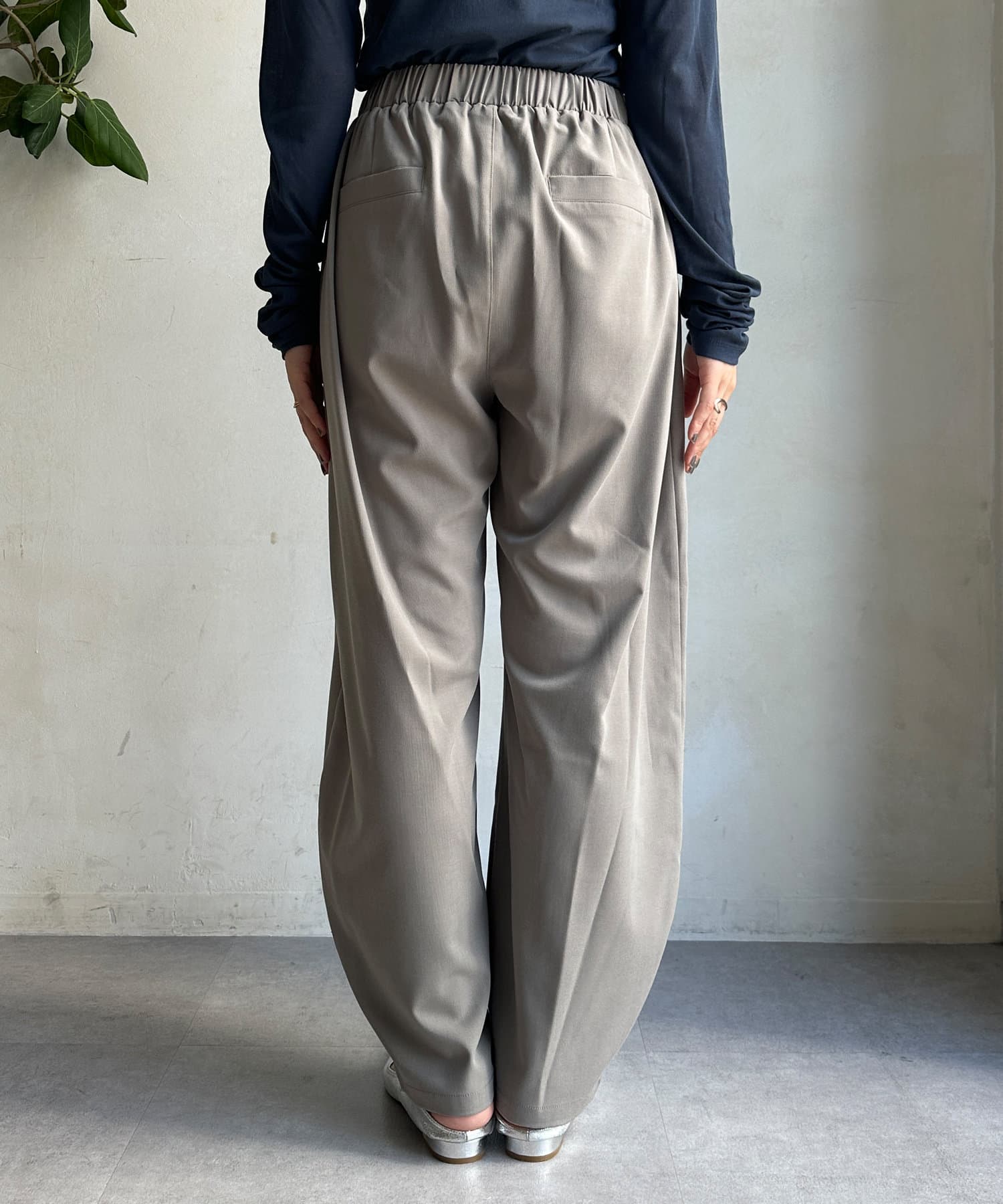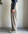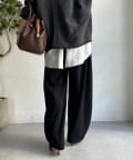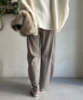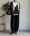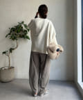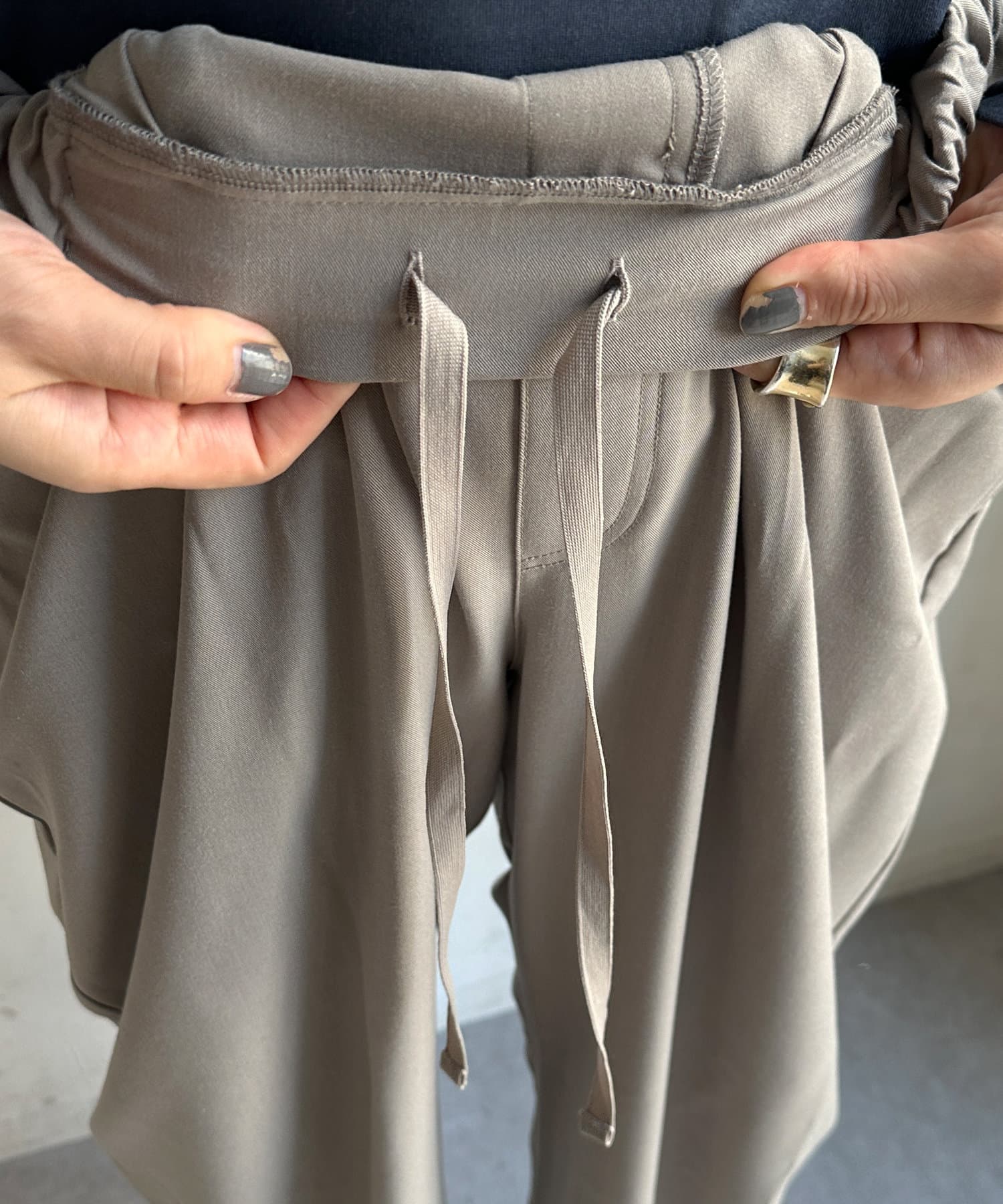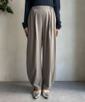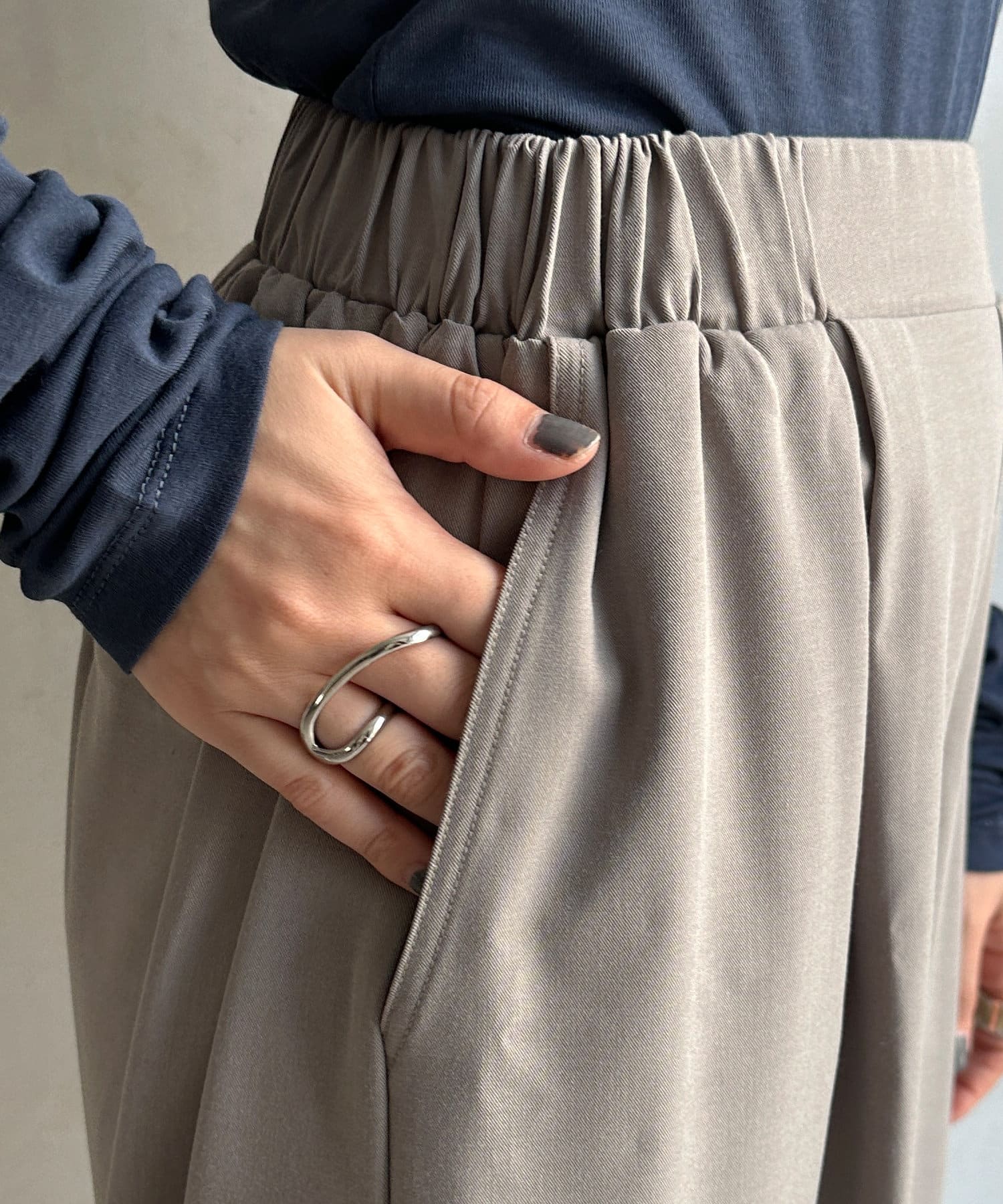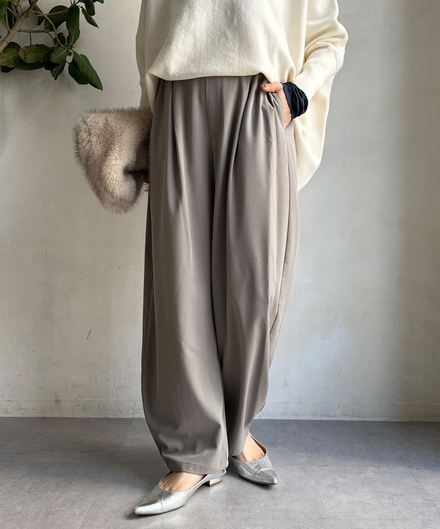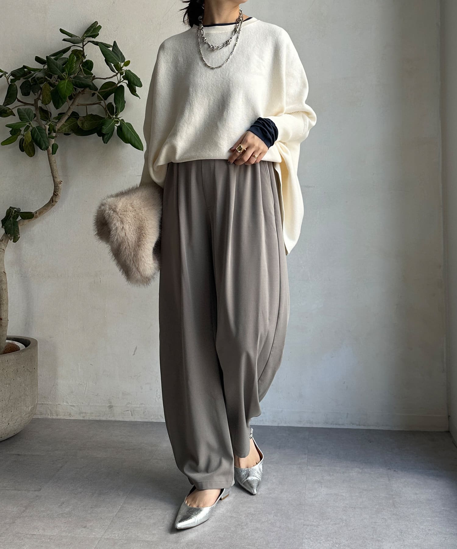 膝回りはゆったりと膨らみがあり、落ち感のある生地で、オン・オフ使えます。