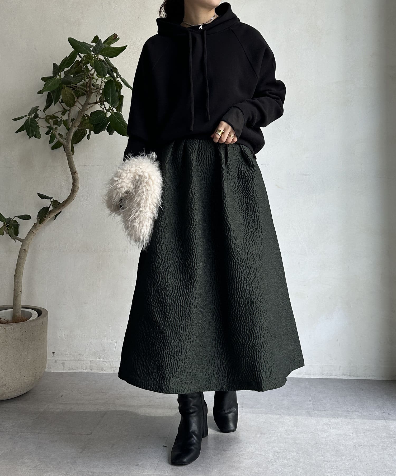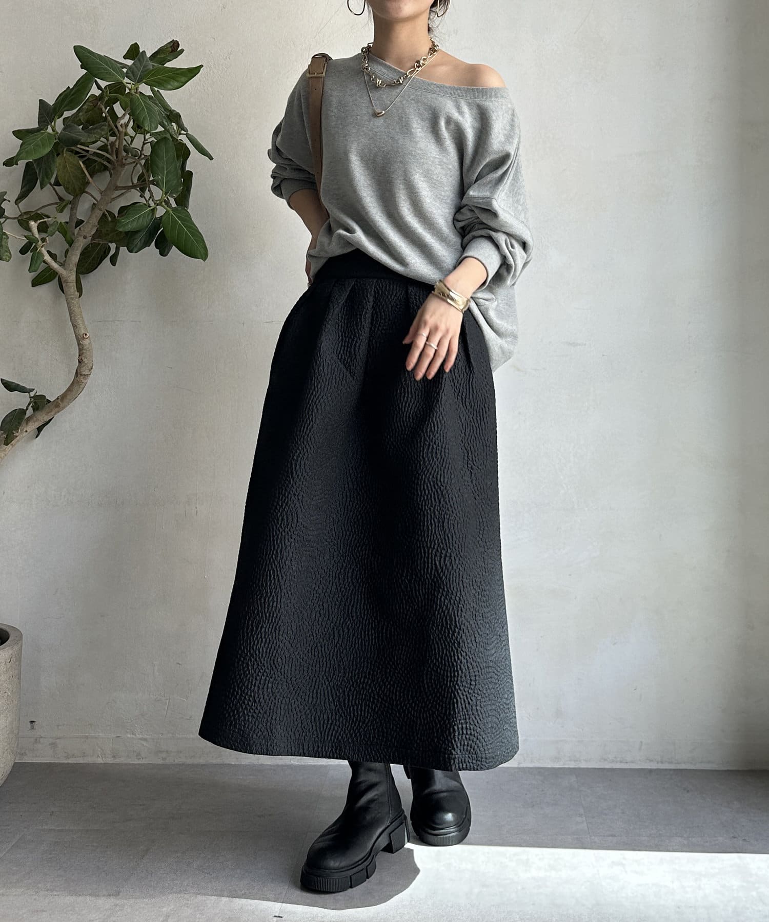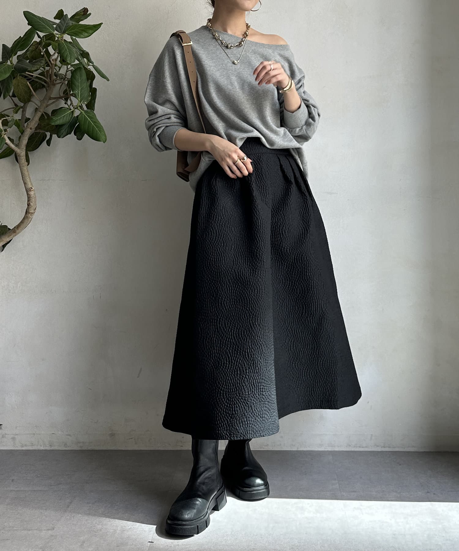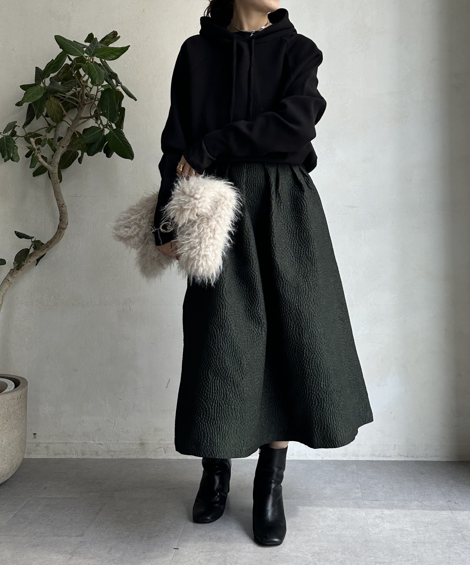 トレンドの凸凹感があるフクレジャガードの素材を使用したスカート。