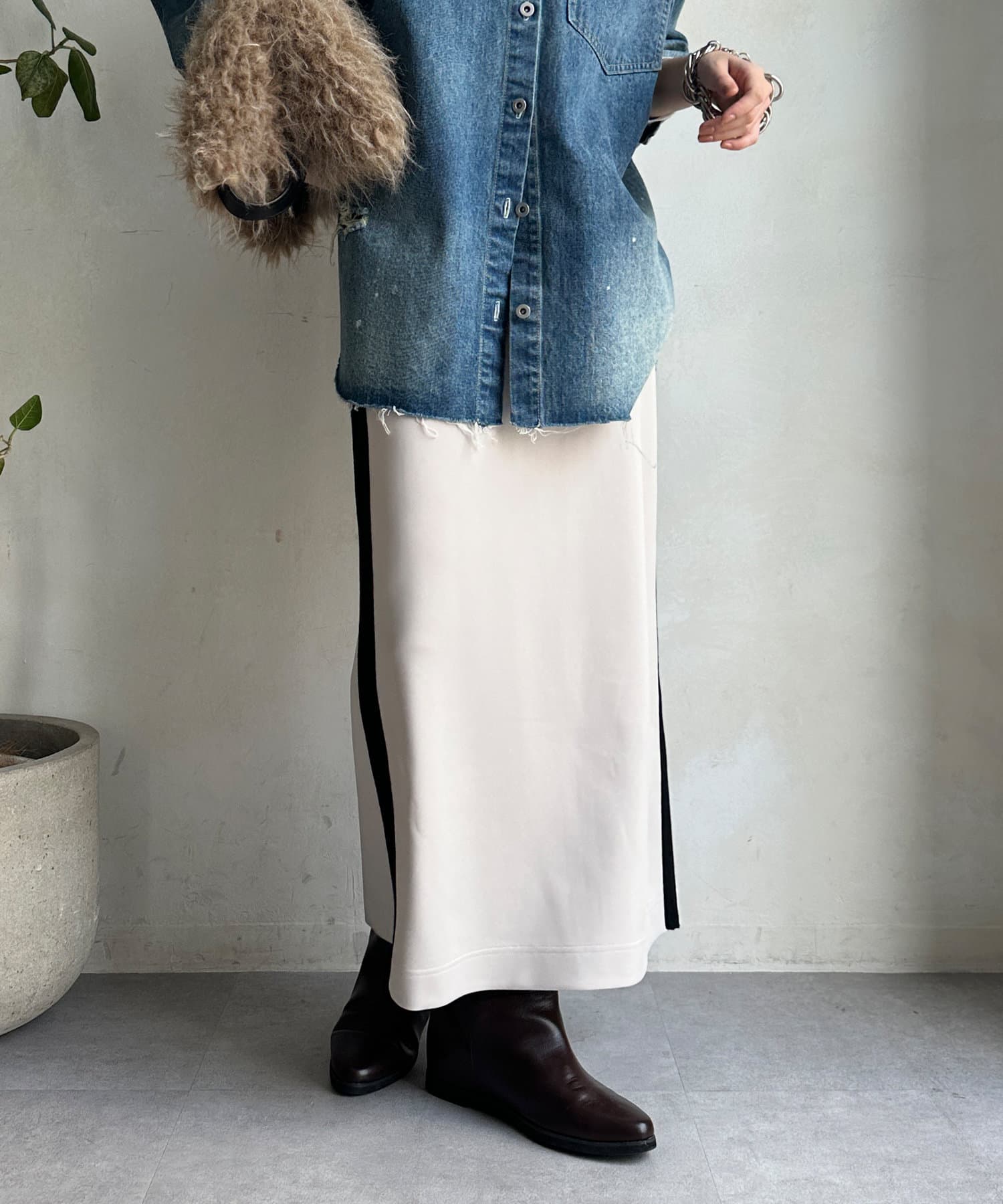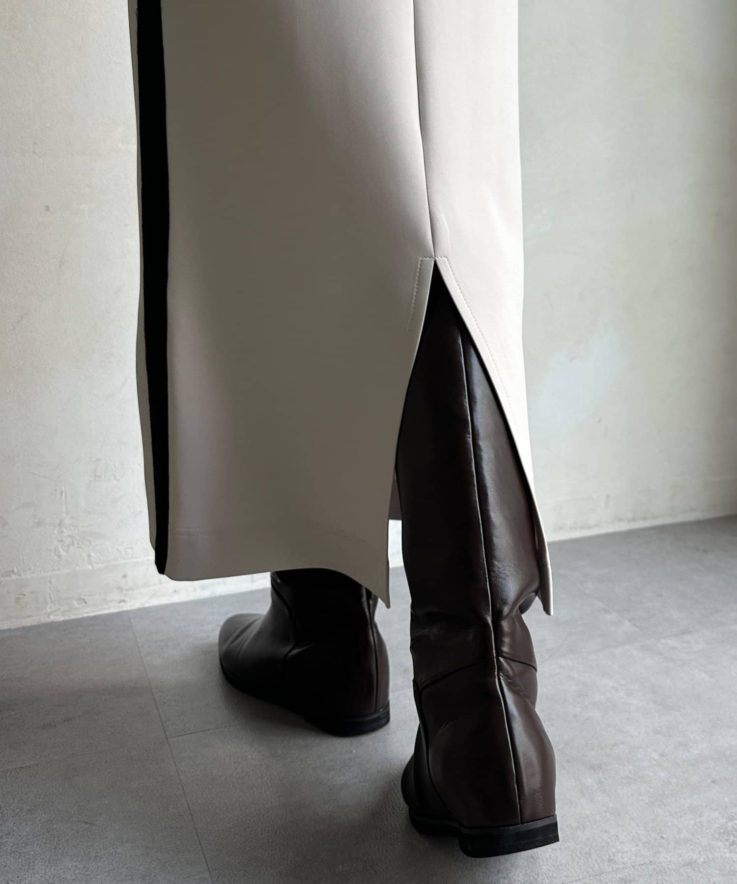 ややハリ感のある素材で仕上げたサイドラインスカート。