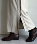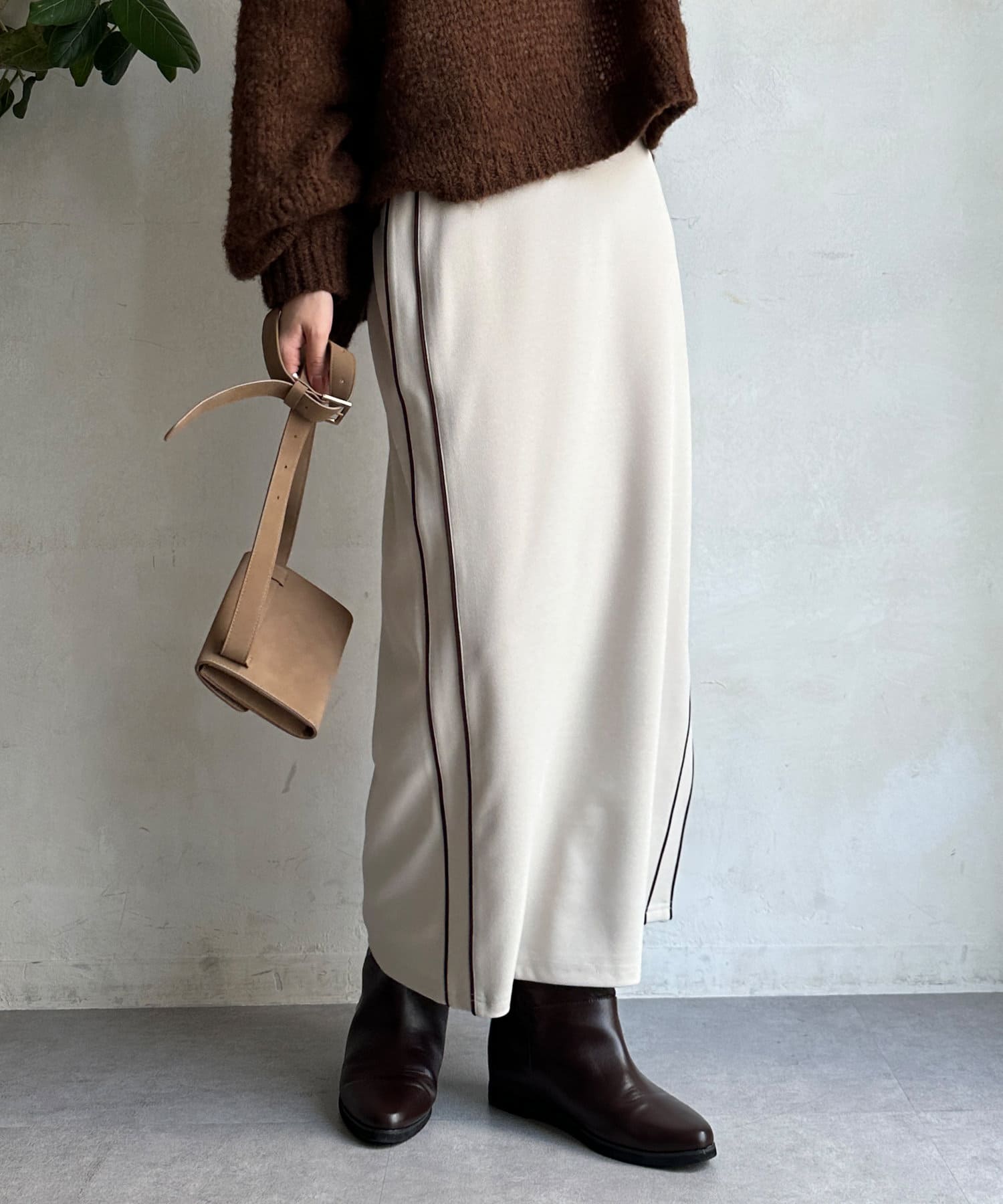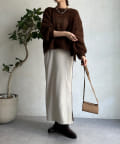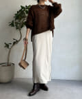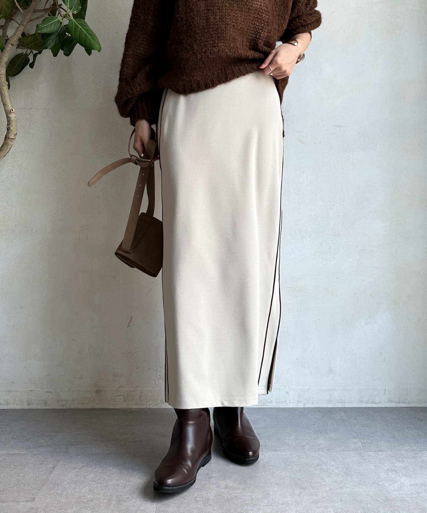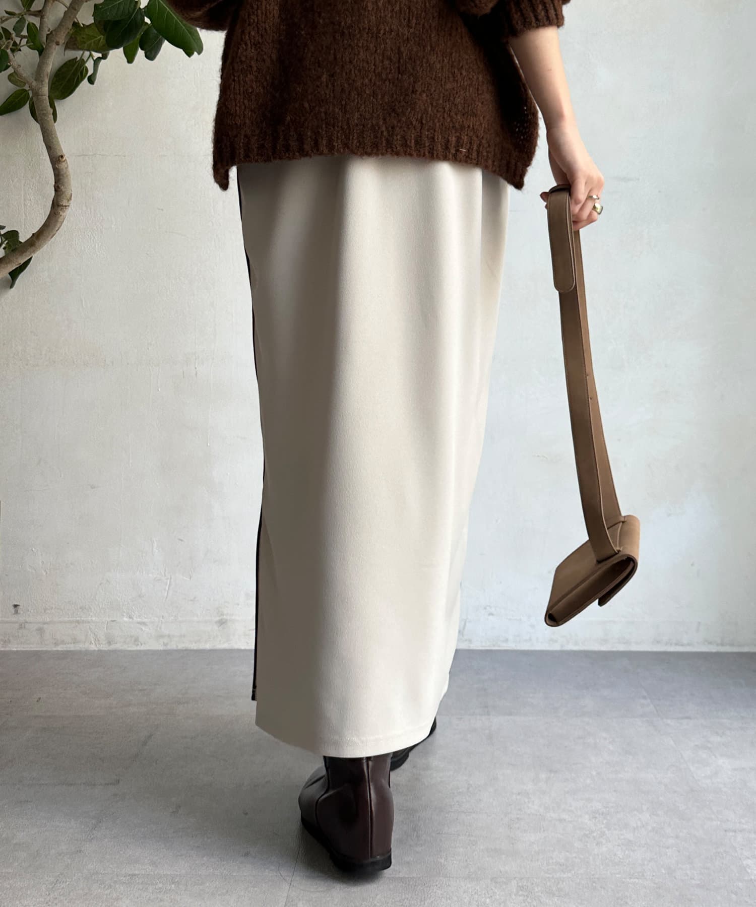 片方の裾にはスリットを施すことで、抜け感をプラス。ブーツなどの秋冬らしいシューズをちらっと覗かせると、スタイリングのポイントになってくれます。