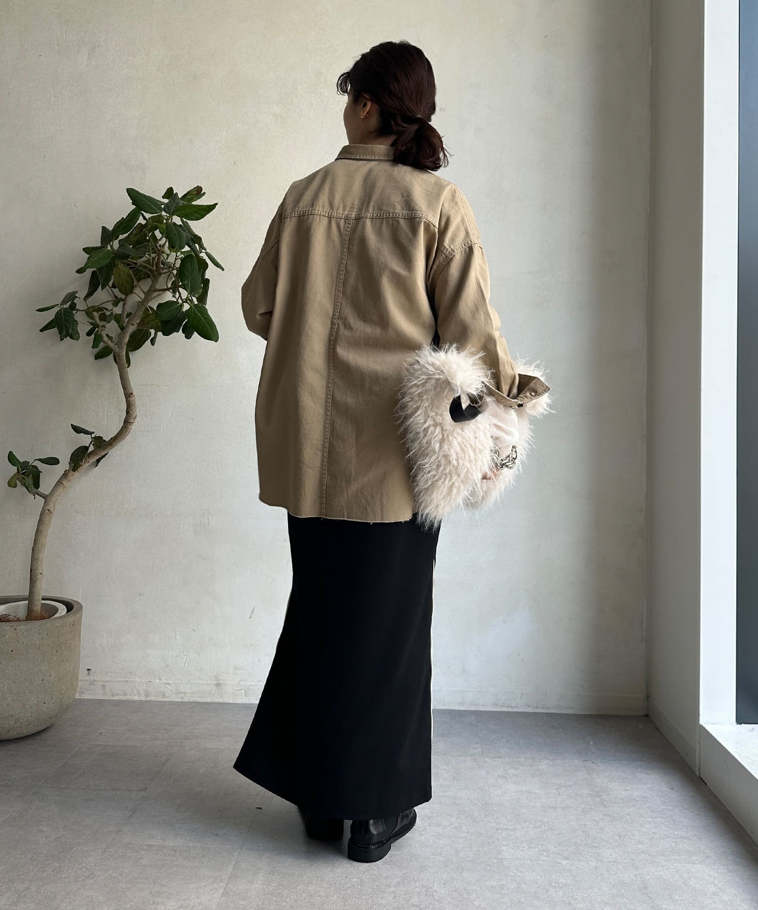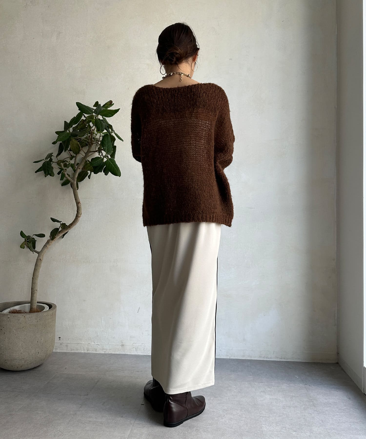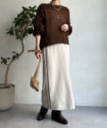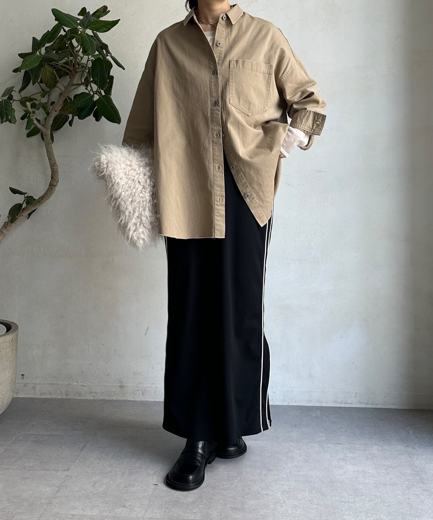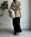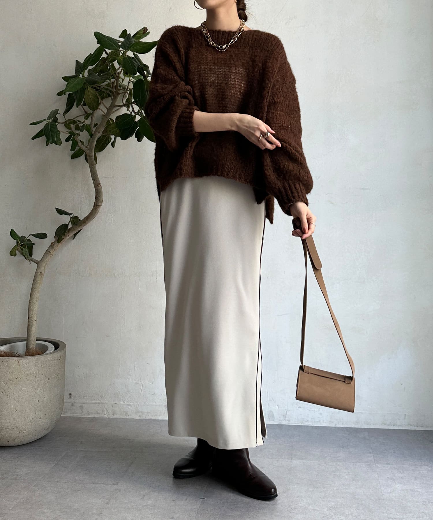 片方の裾にはスリットを施すことで、抜け感をプラス。ブーツなどの秋冬らしいシューズをちらっと覗かせると、スタイリングのポイントになってくれます。