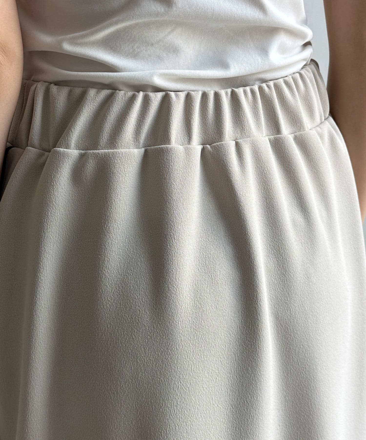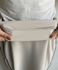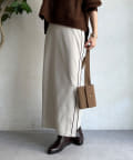伸縮性のある素材を使用し、ウエストはバックゴム仕様に。イージーに着られる着心地がうれしいポイントです。