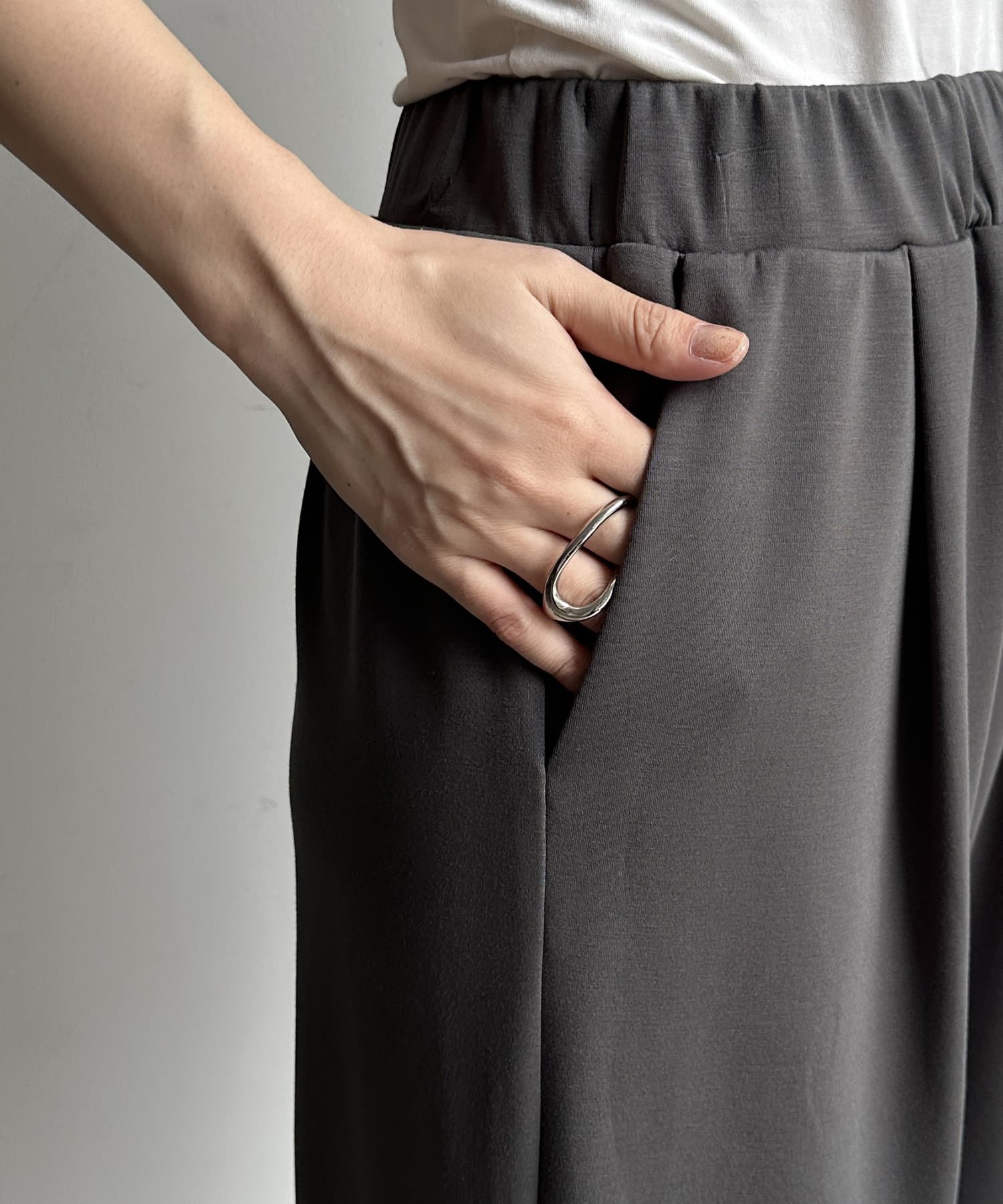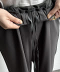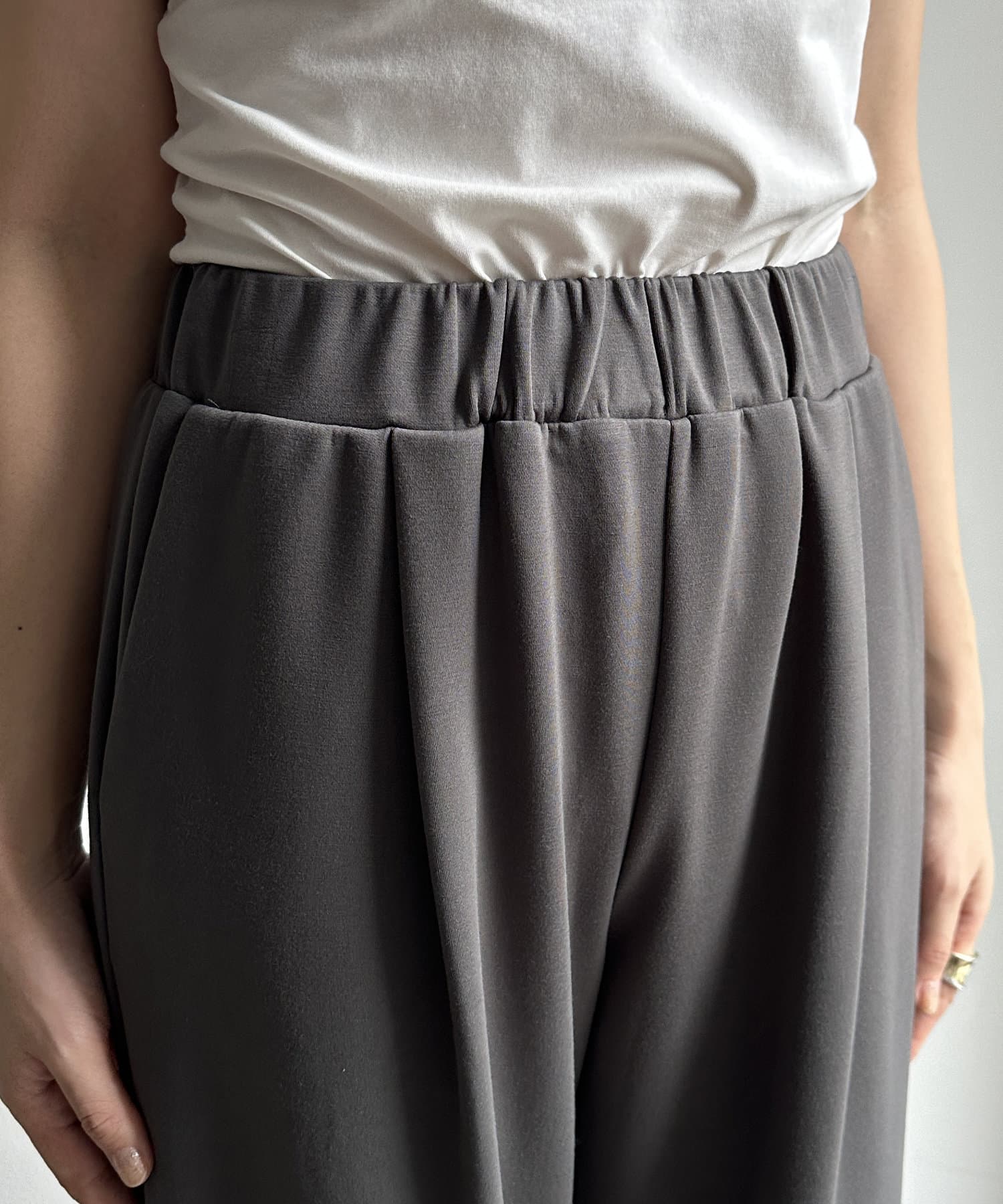 ゆったりと脚のラインを拾わず、ウエストはオールゴム仕様で履き心地はイージー。