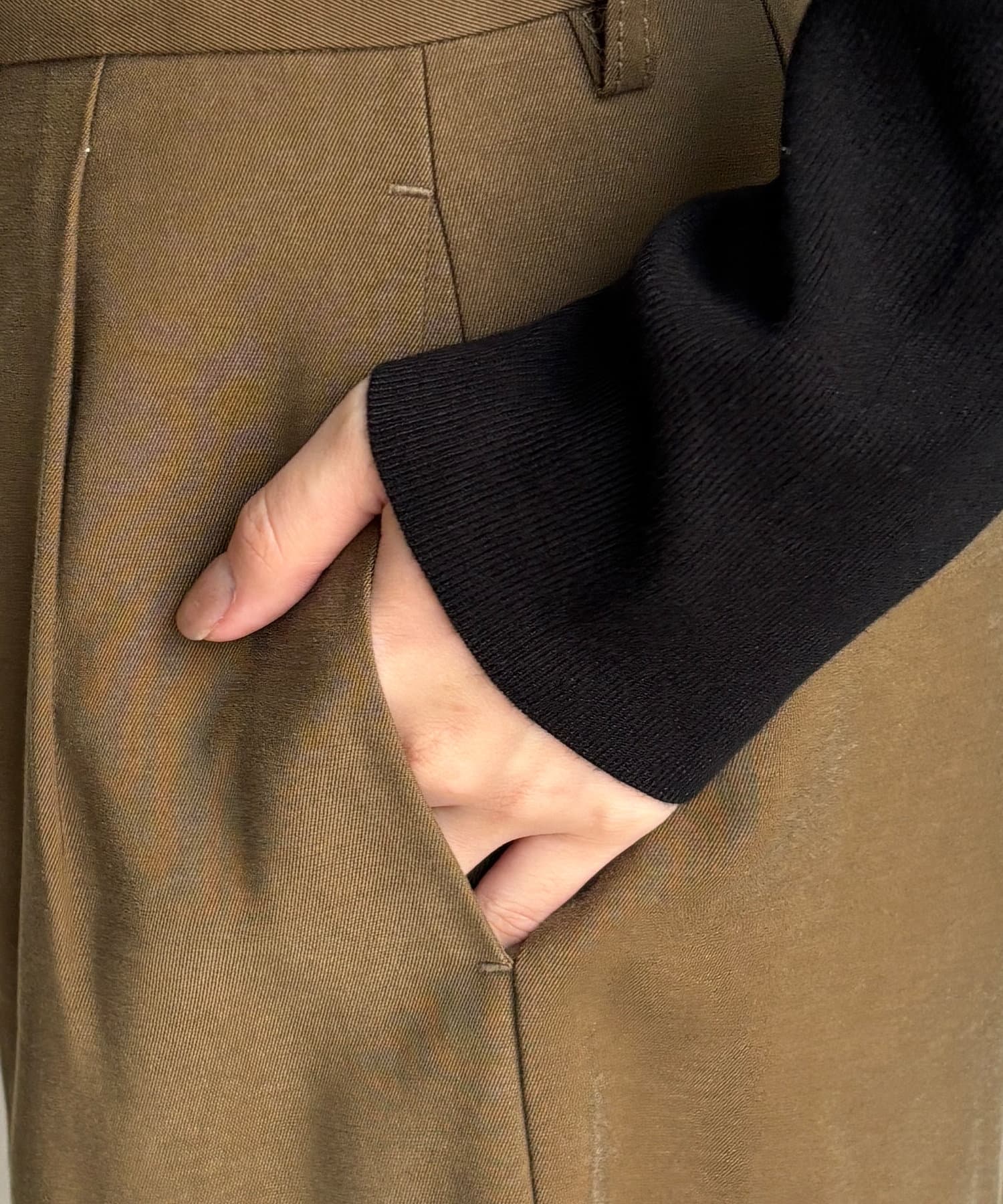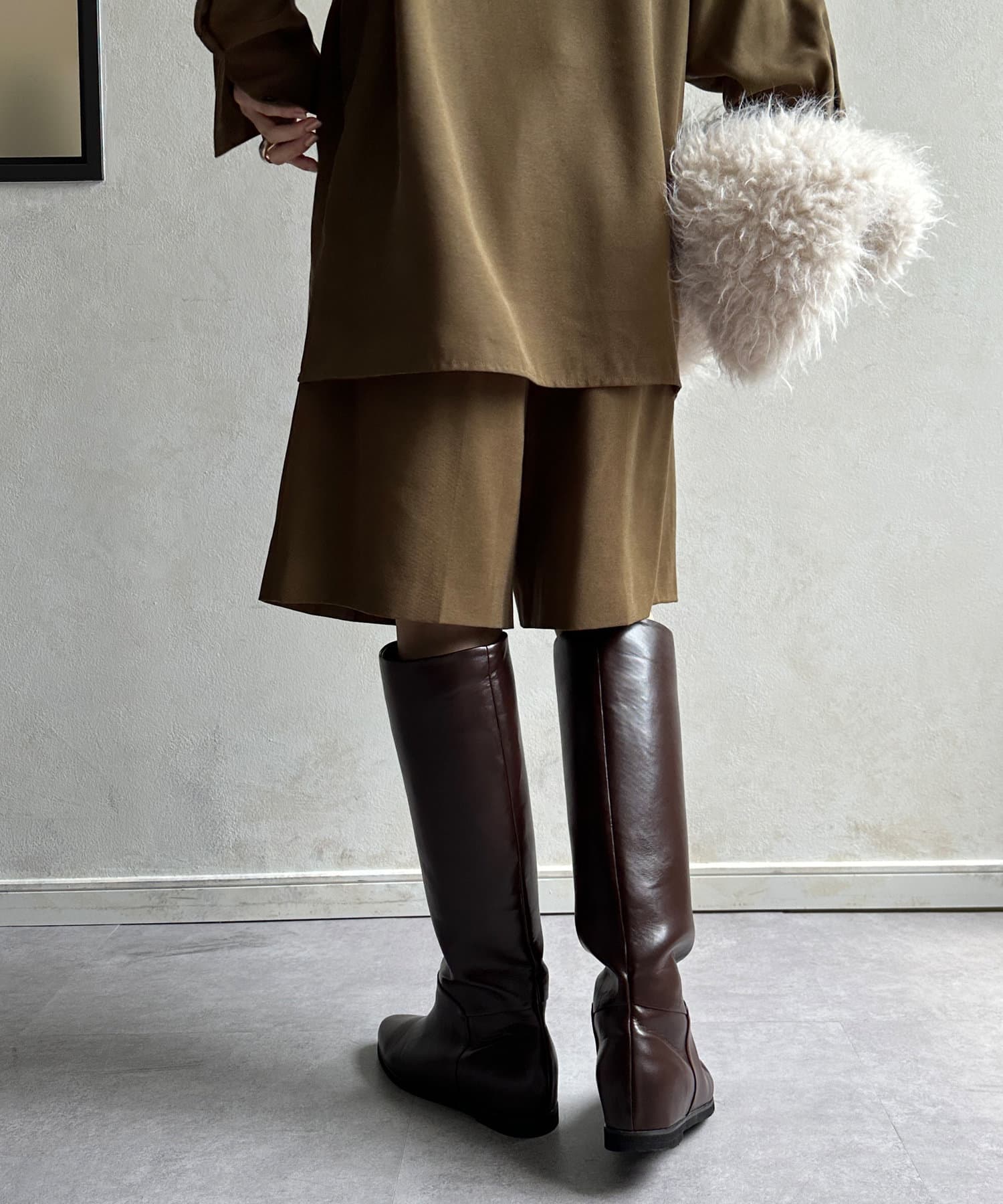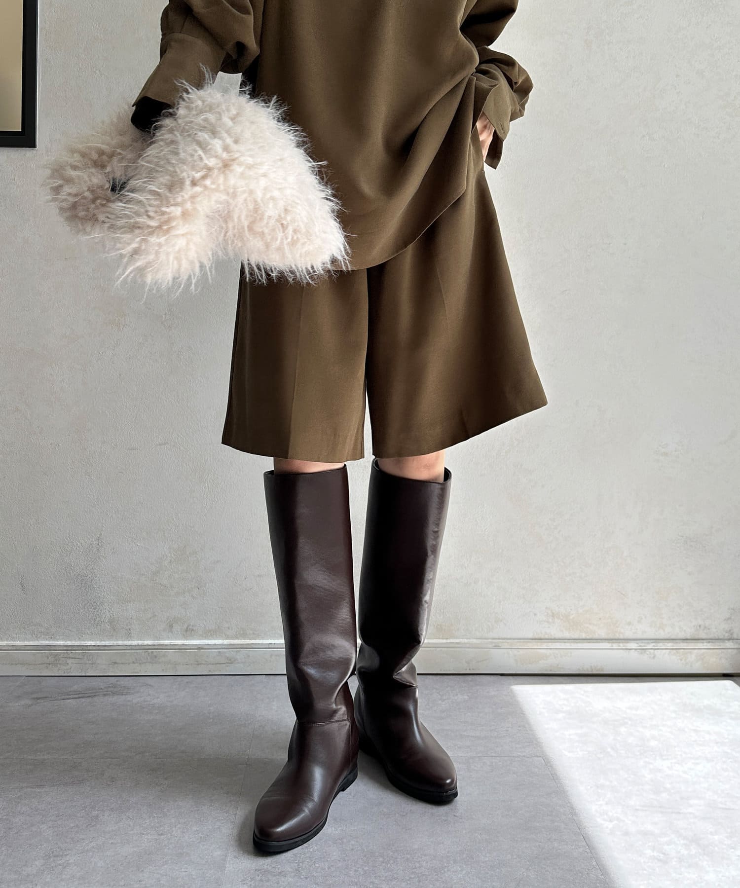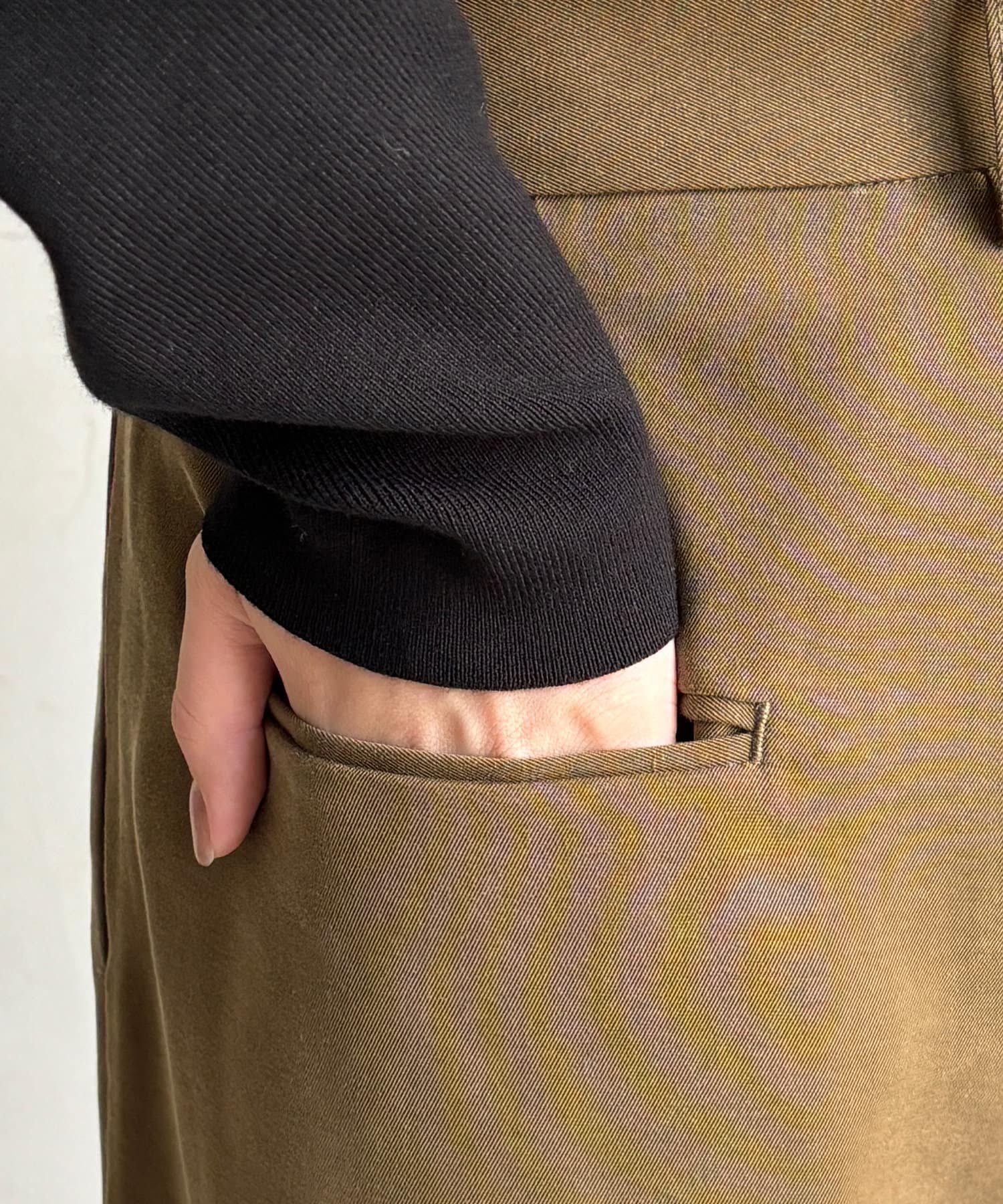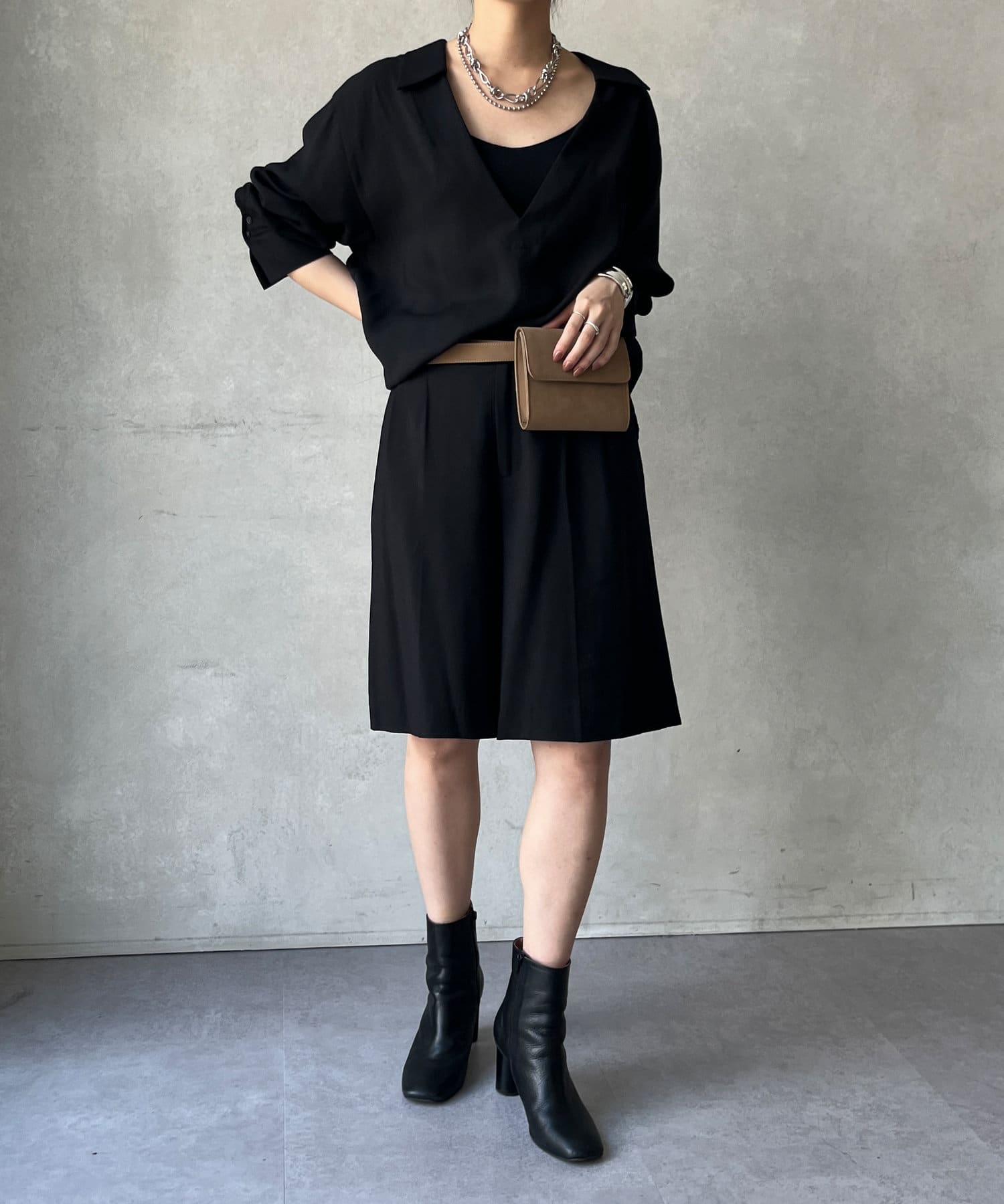 メンズライクになりがちなスタイルを、落ち感のある素材感で仕上げることでDOUDOUらしい印象に。