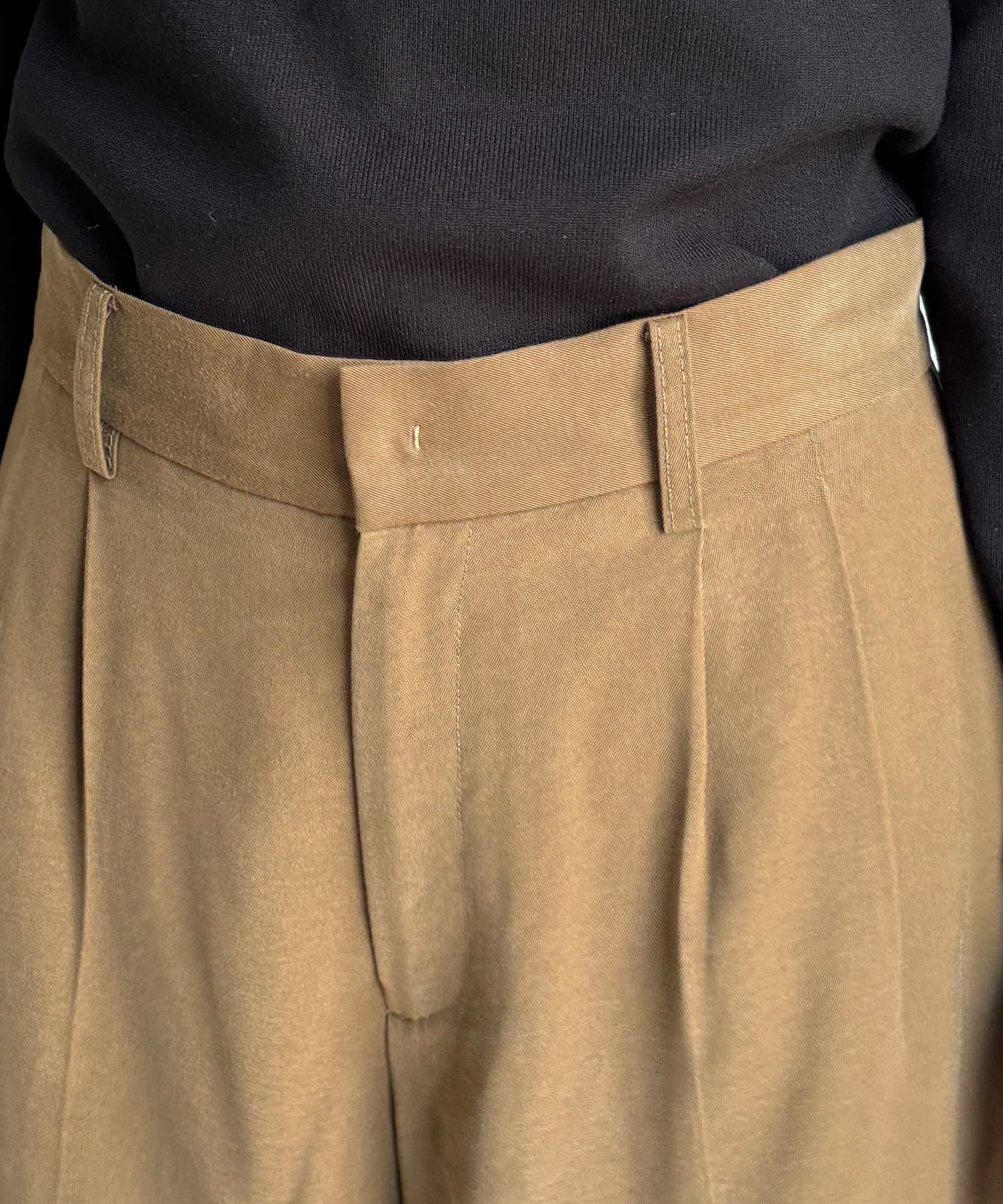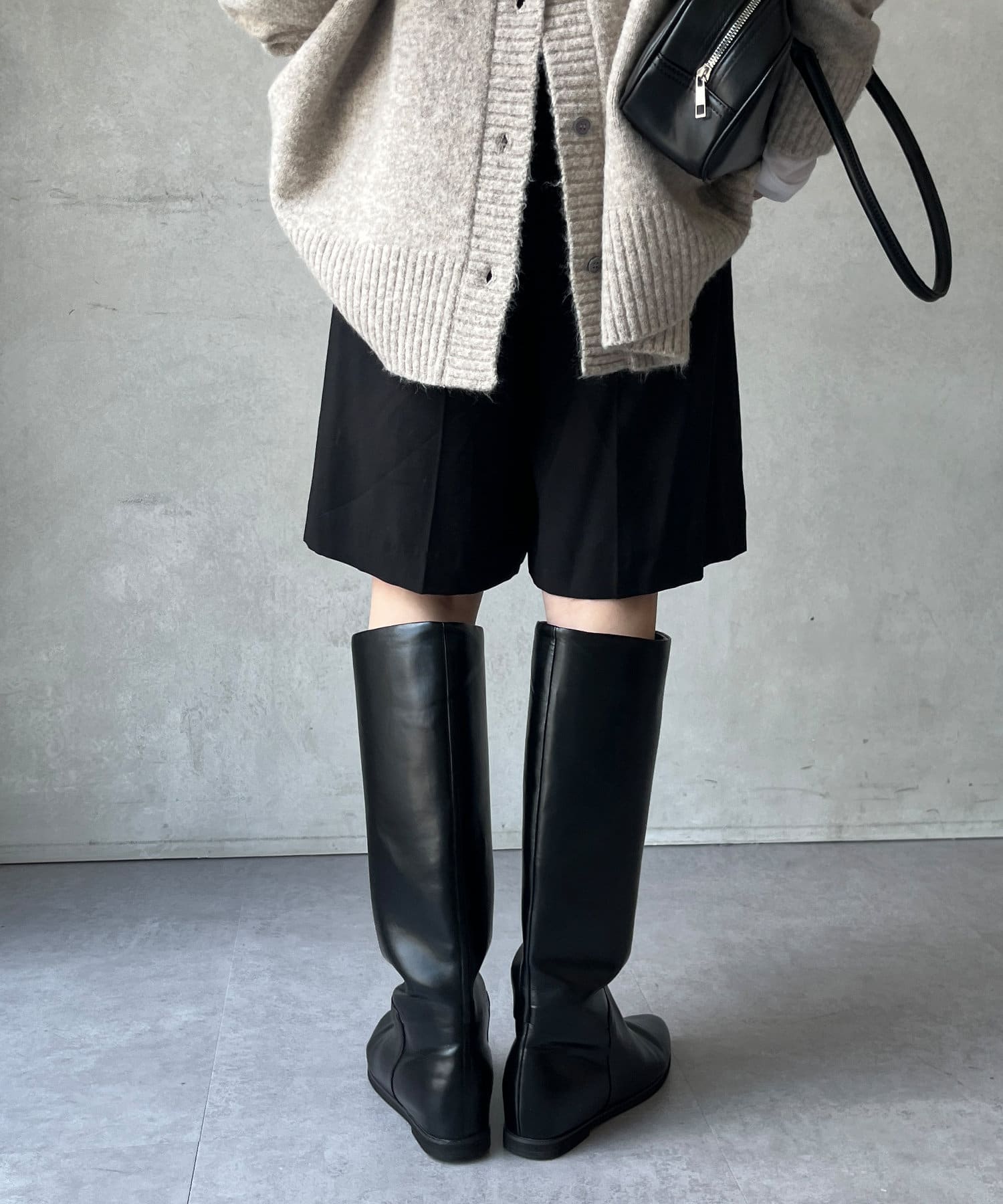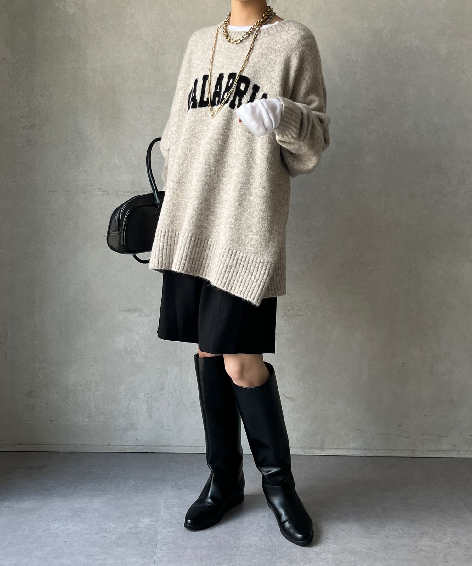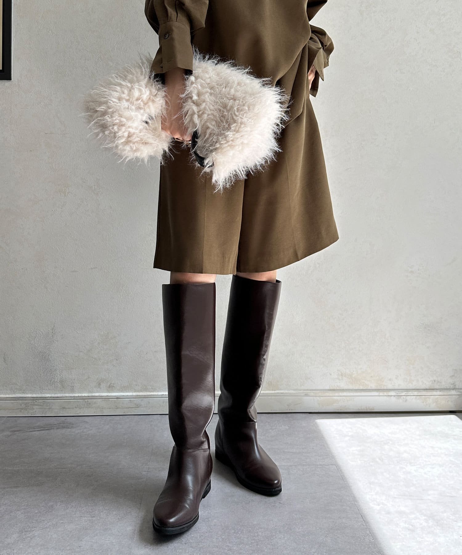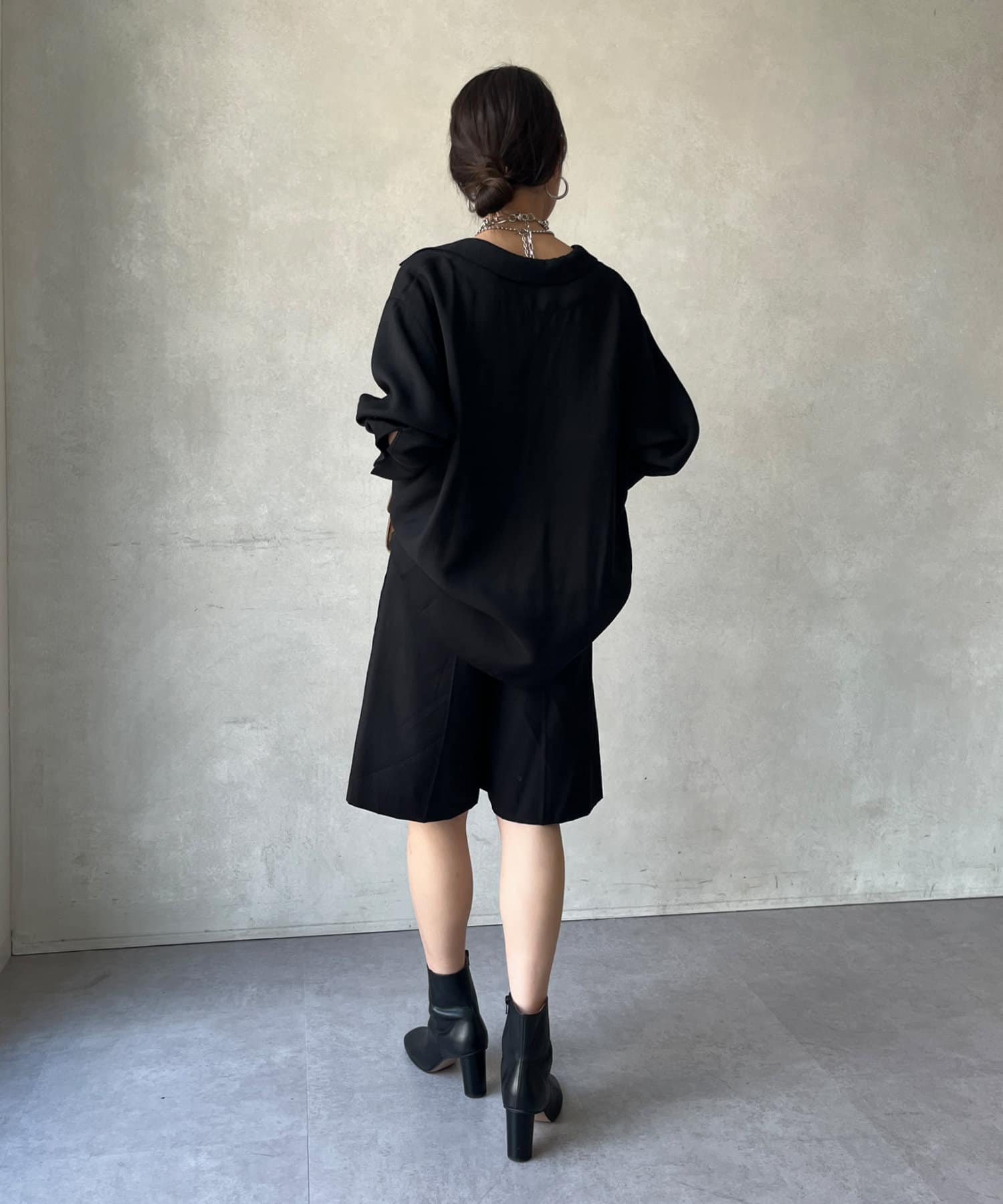 メンズライクになりがちなスタイルを、落ち感のある素材感で仕上げることでDOUDOUらしい印象に。