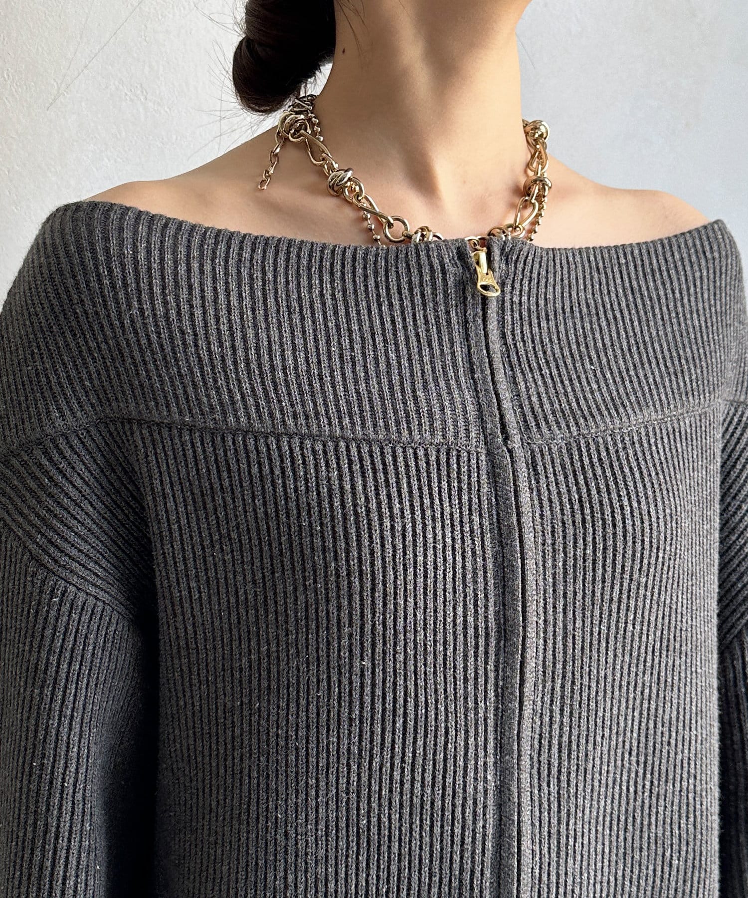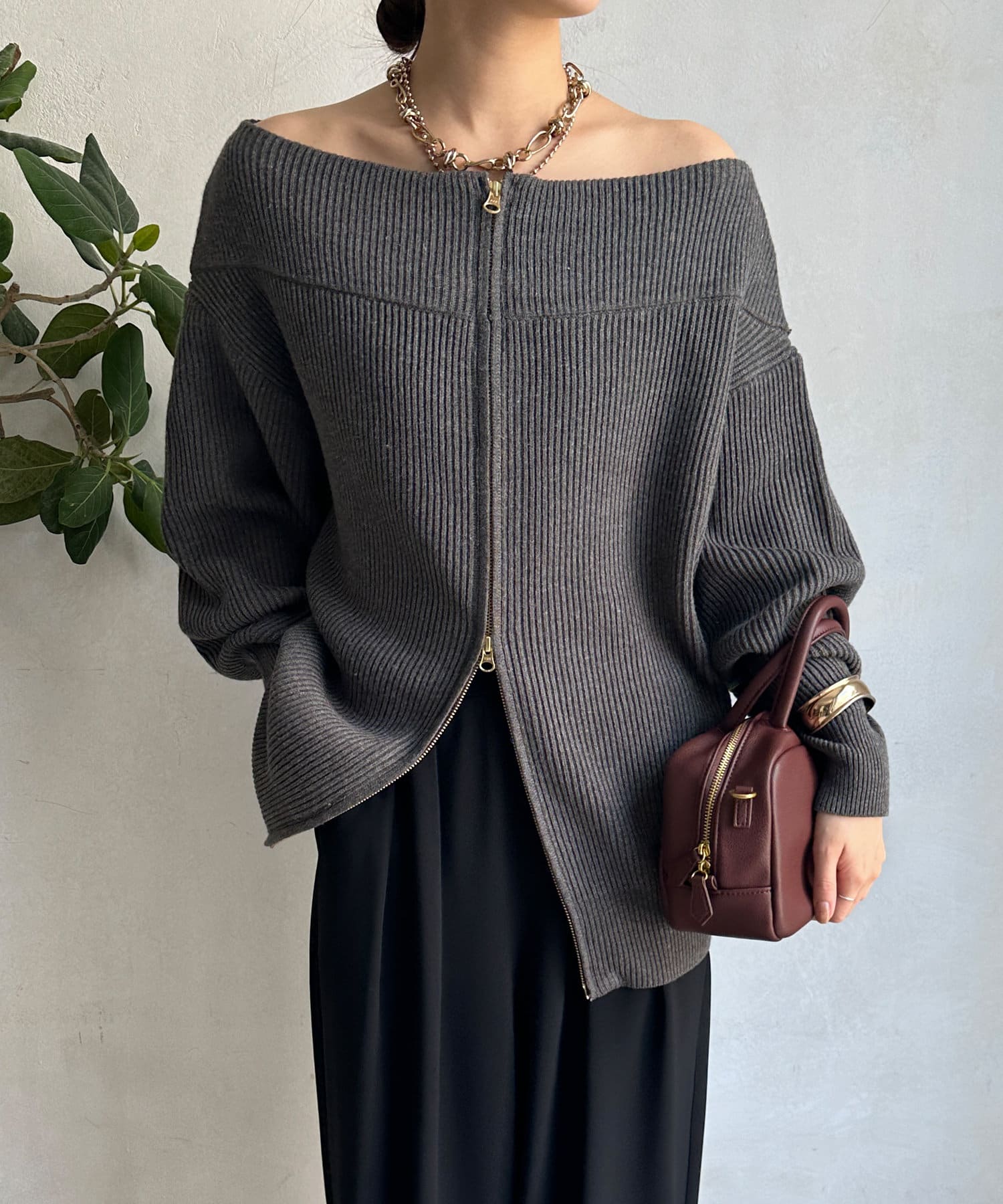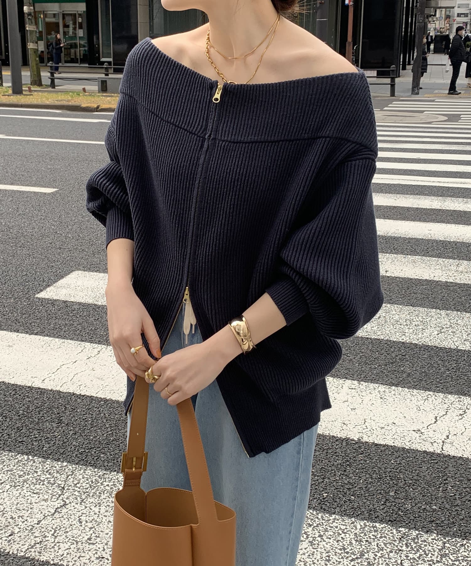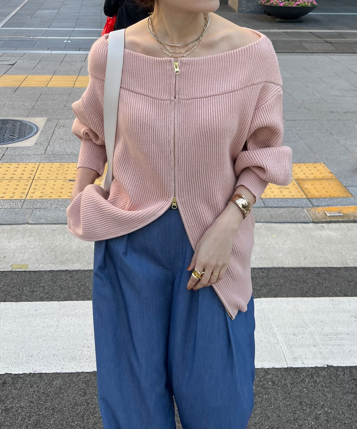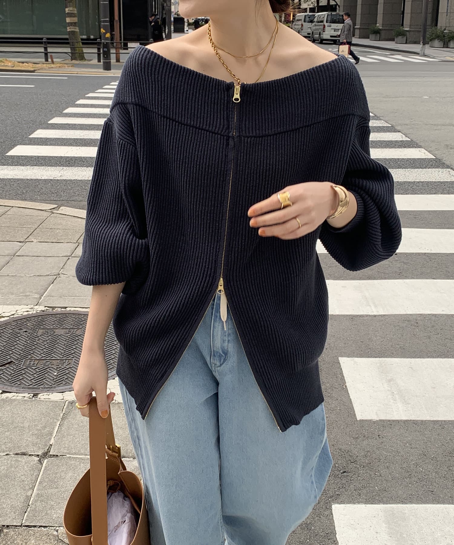 フロントにジップのデザインを施した新鮮な1着。ネックラインを広く取っているため、オフショルとして着用していただけます。