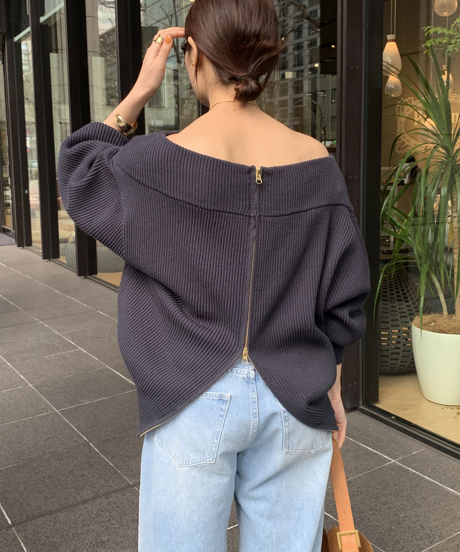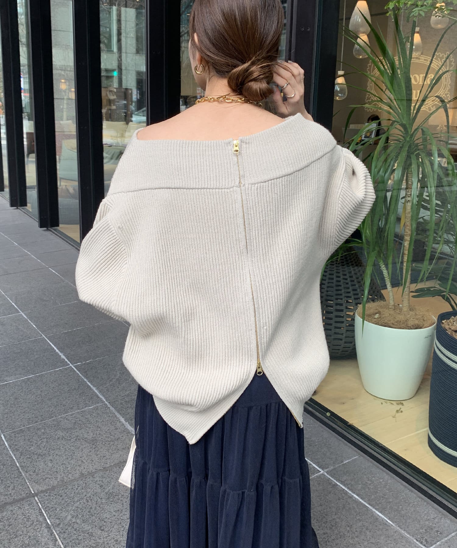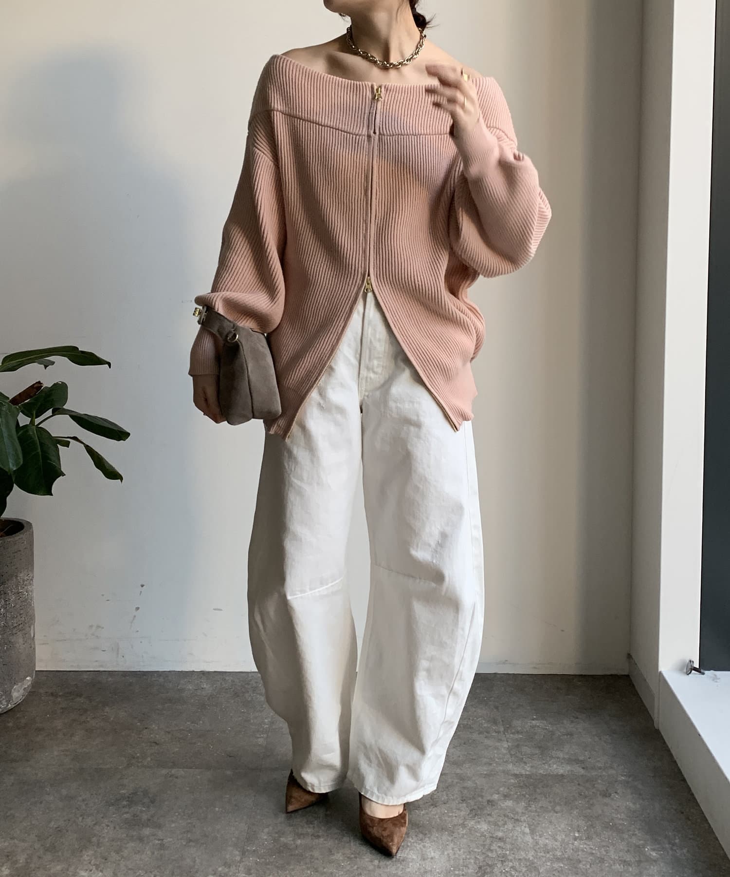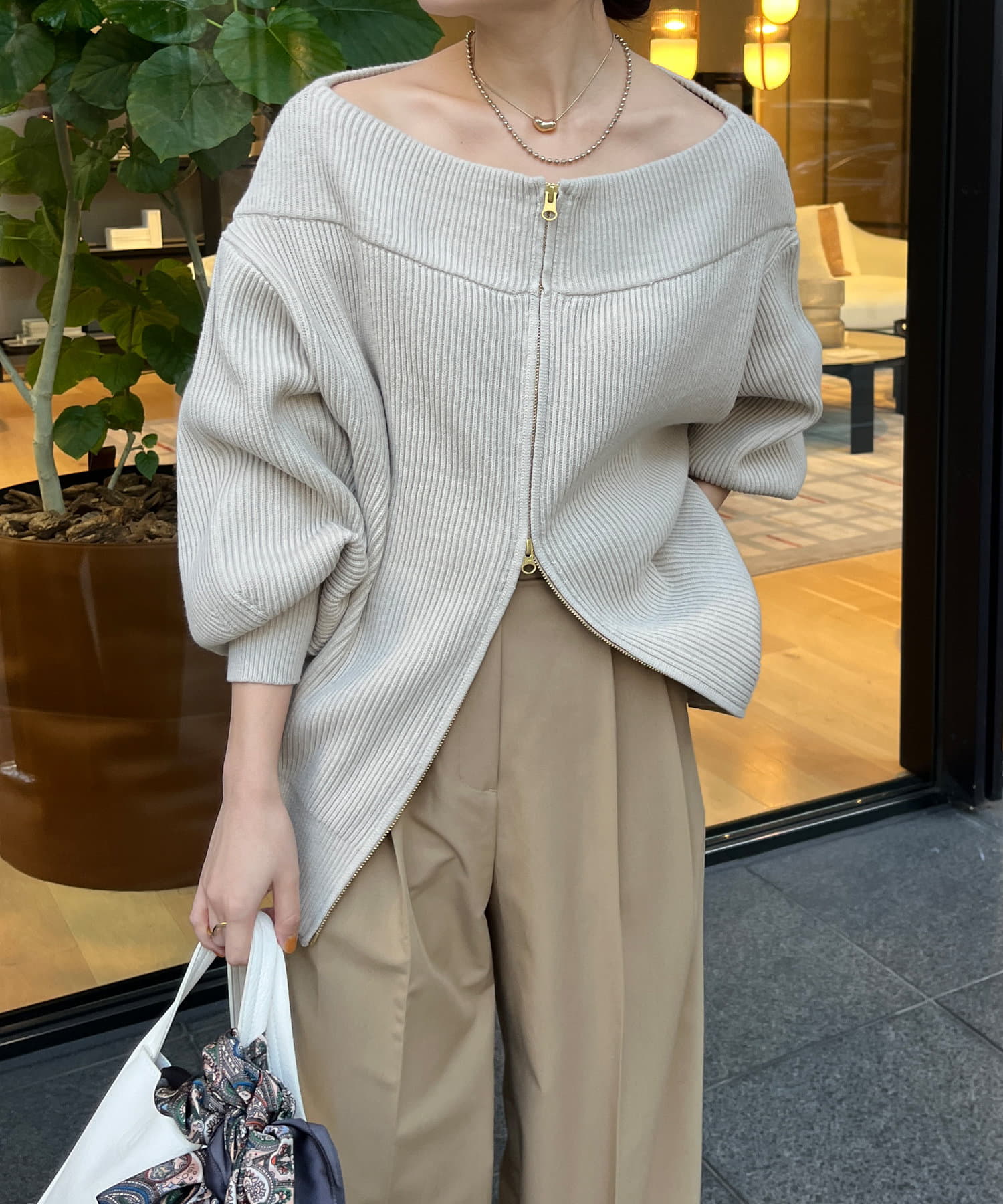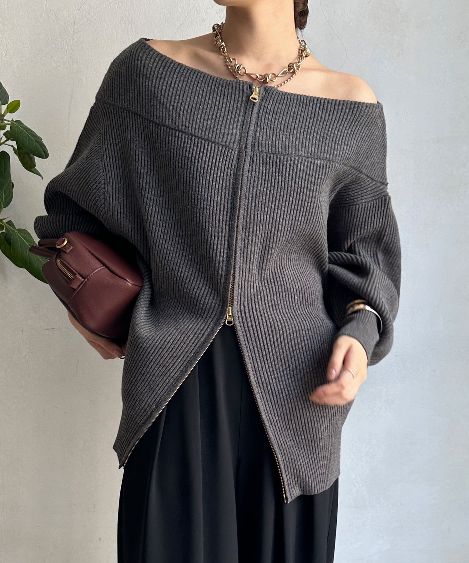 フロントにジップのデザインを施した新鮮な1着。ネックラインを広く取っているため、オフショルとして着用していただけます。