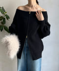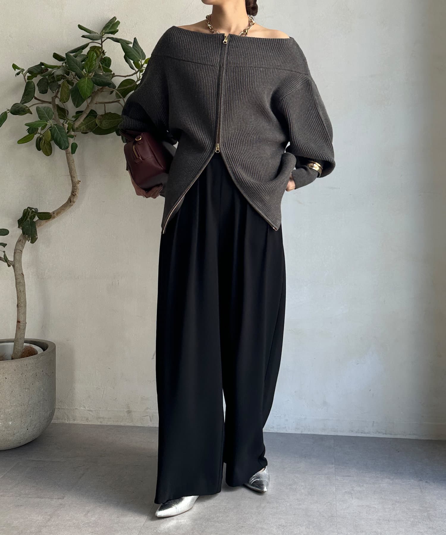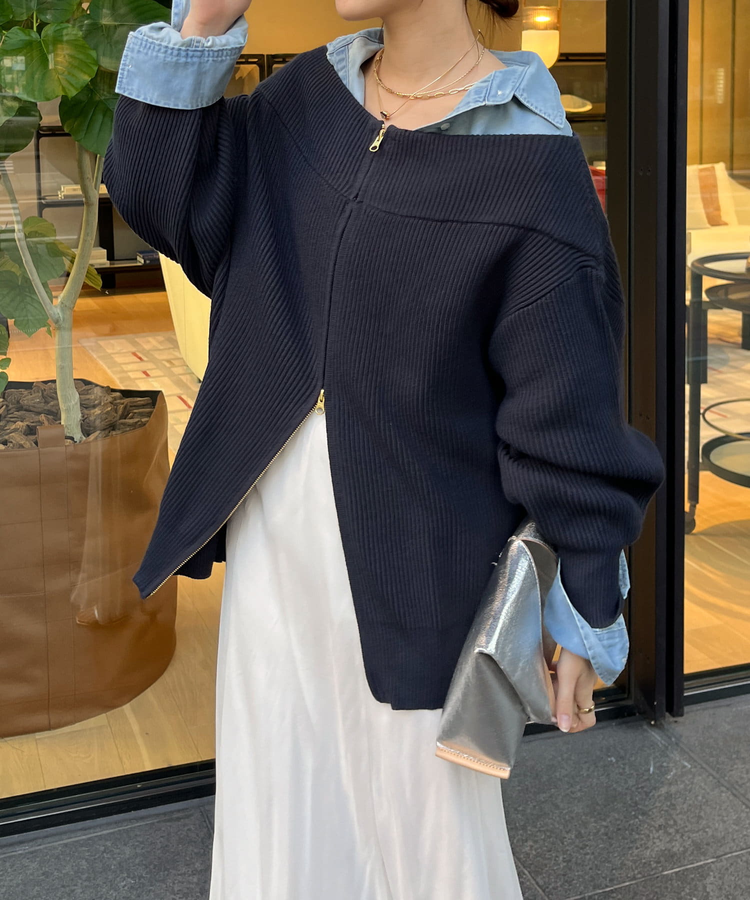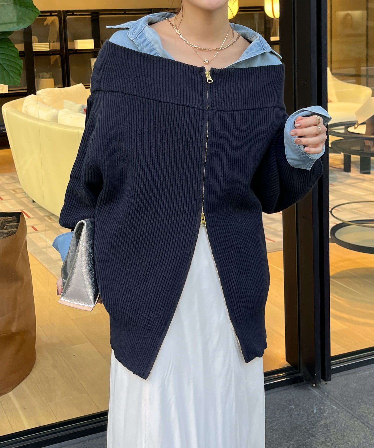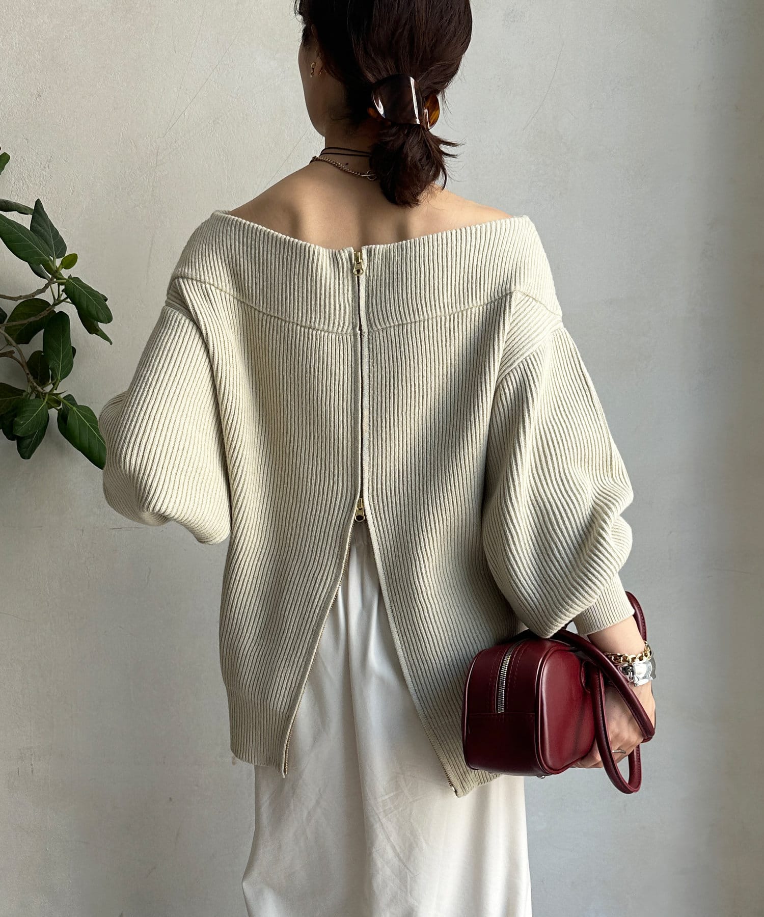 フロントにジップのデザインを施した新鮮な1着。ネックラインを広く取っているため、オフショルとして着用していただけます。