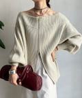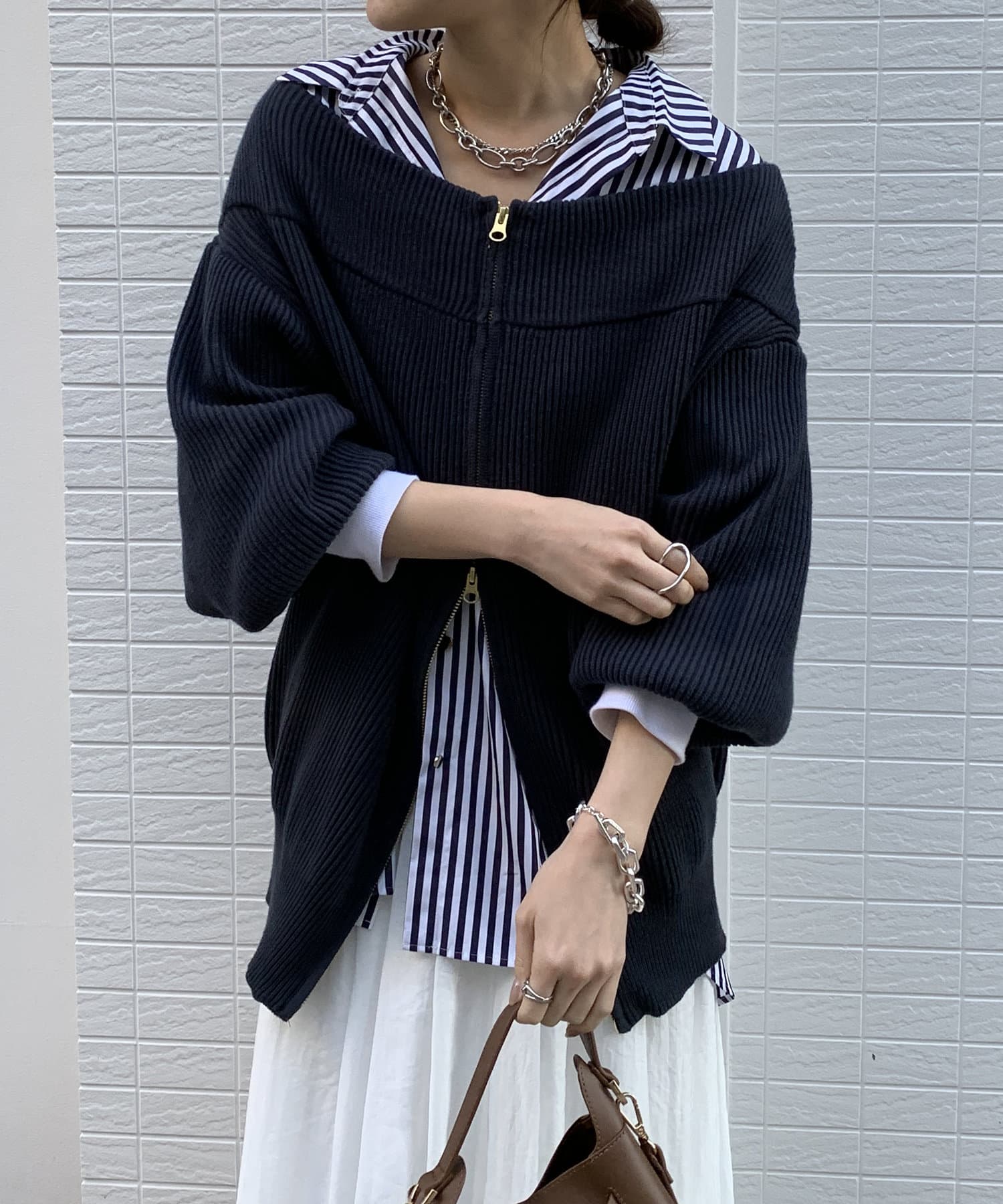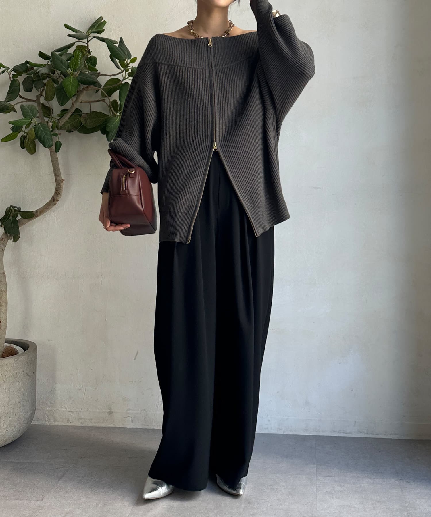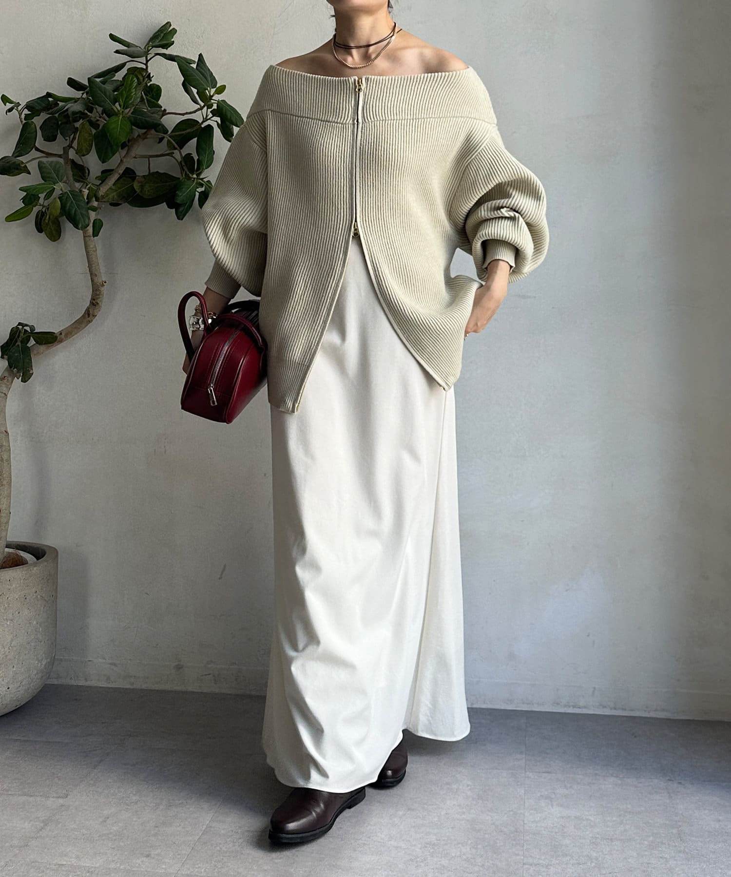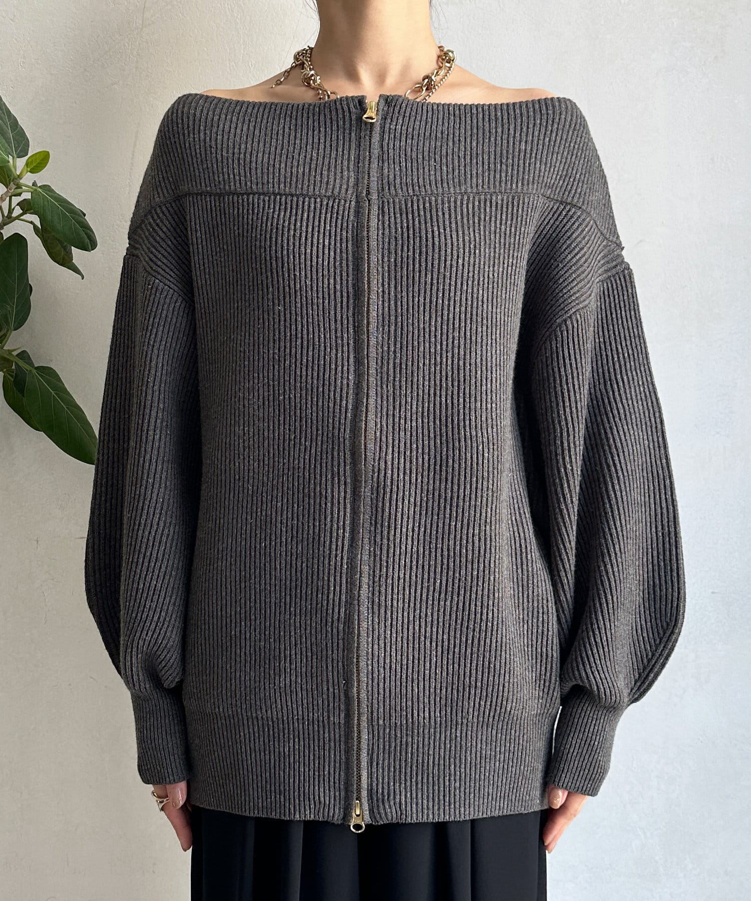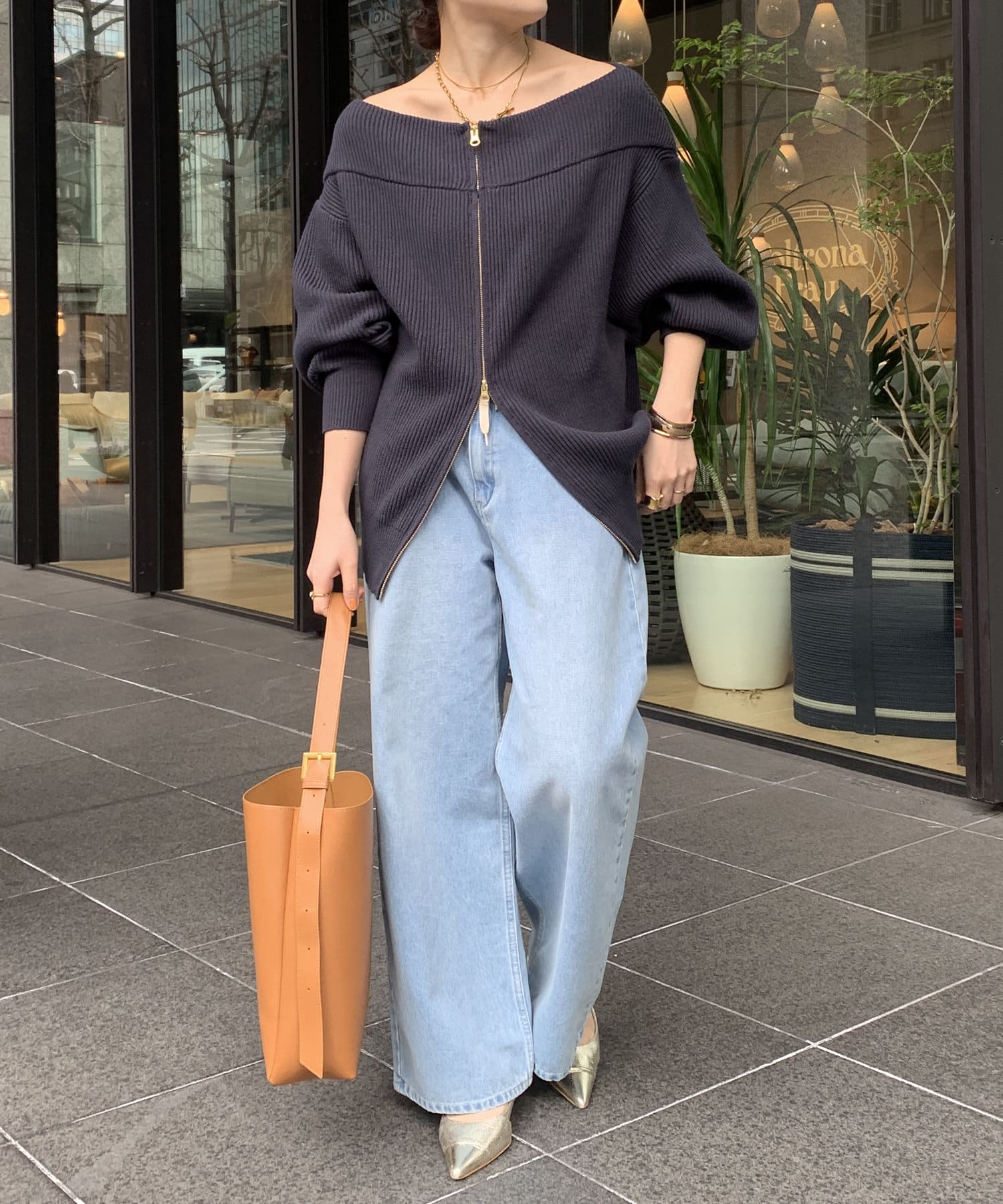 フロントにジップのデザインを施した新鮮な1着。ネックラインを広く取っているため、オフショルとして着用していただけます。