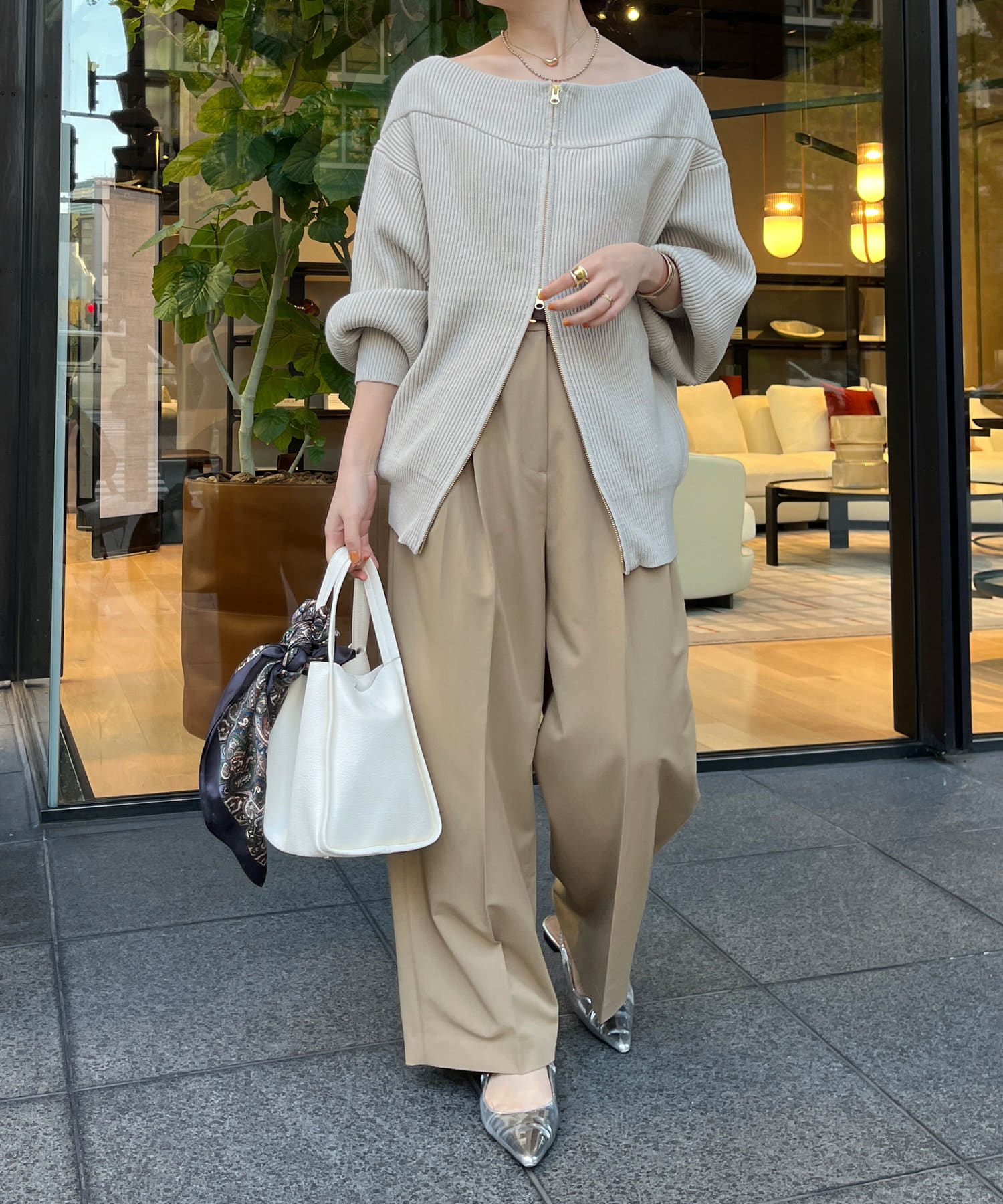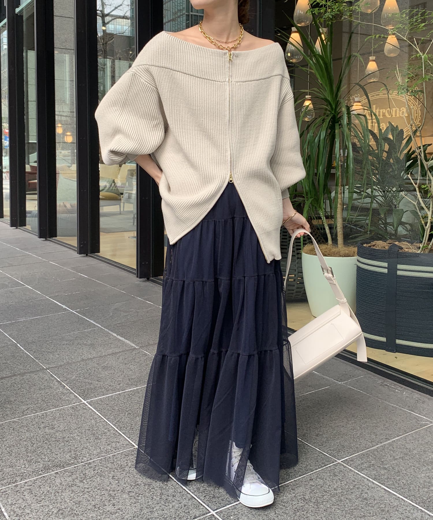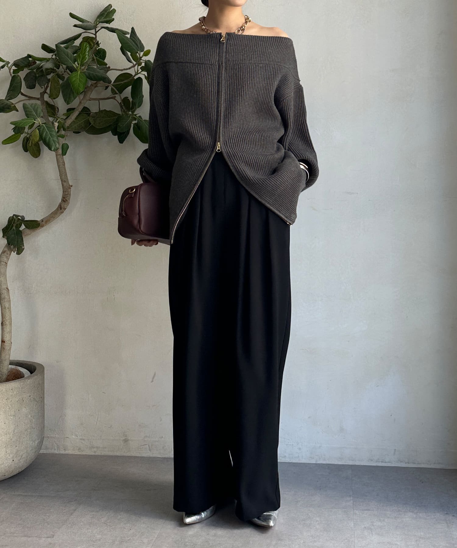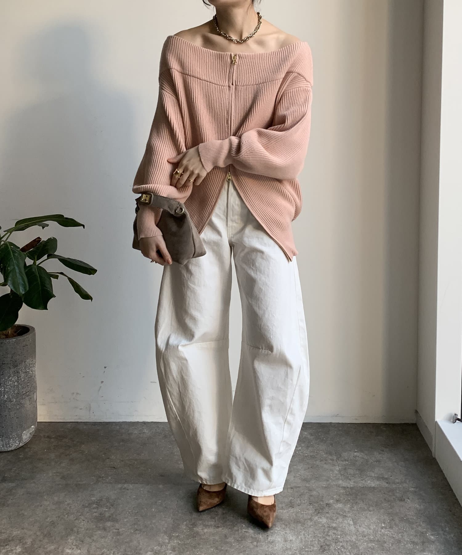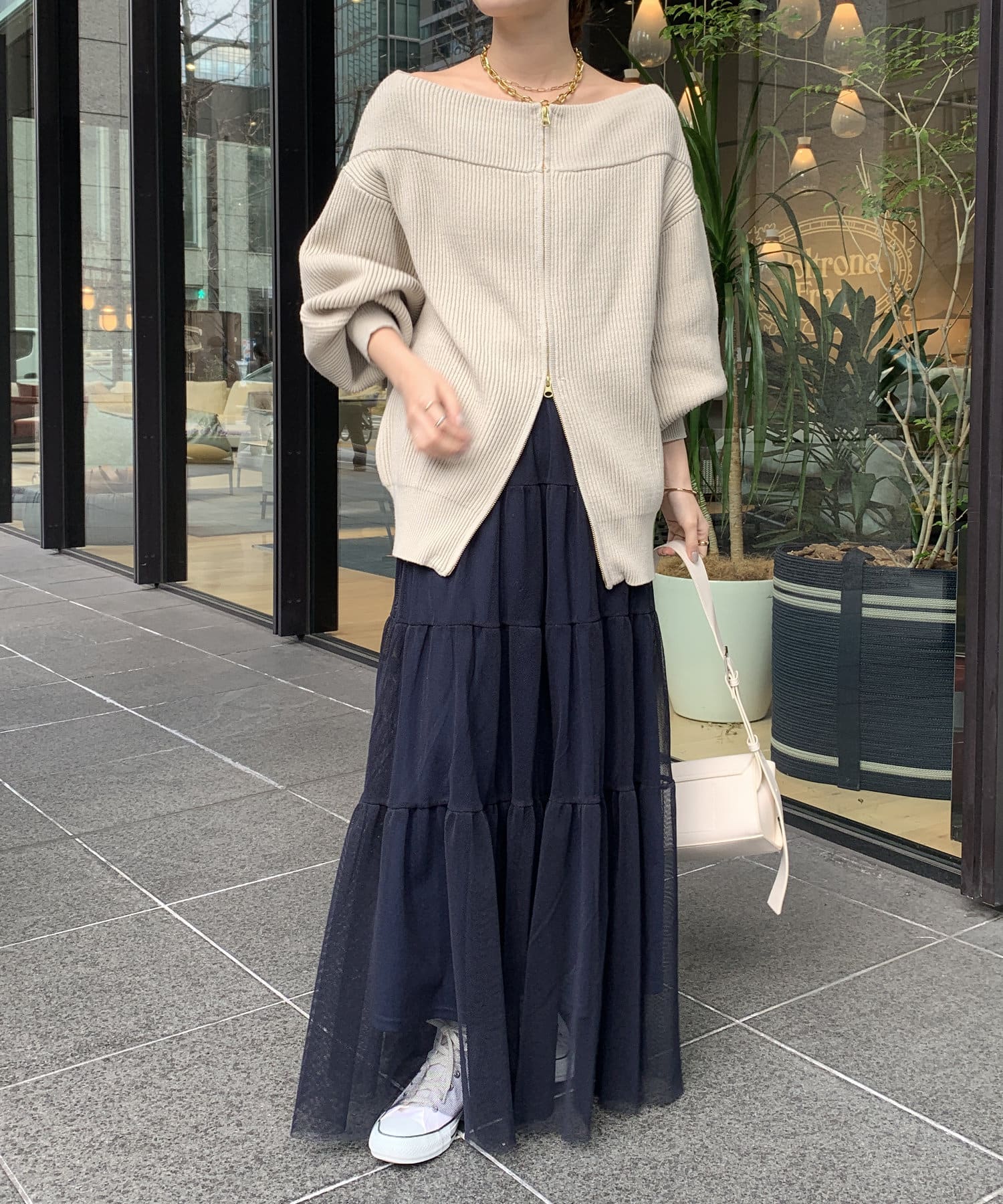 フロントにジップのデザインを施した新鮮な1着。ネックラインを広く取っているため、オフショルとして着用していただけます。
