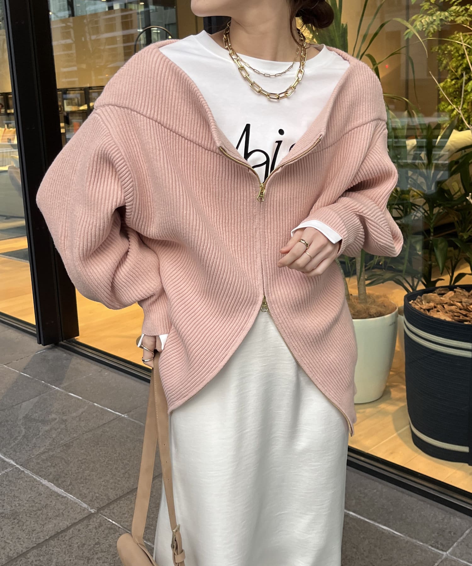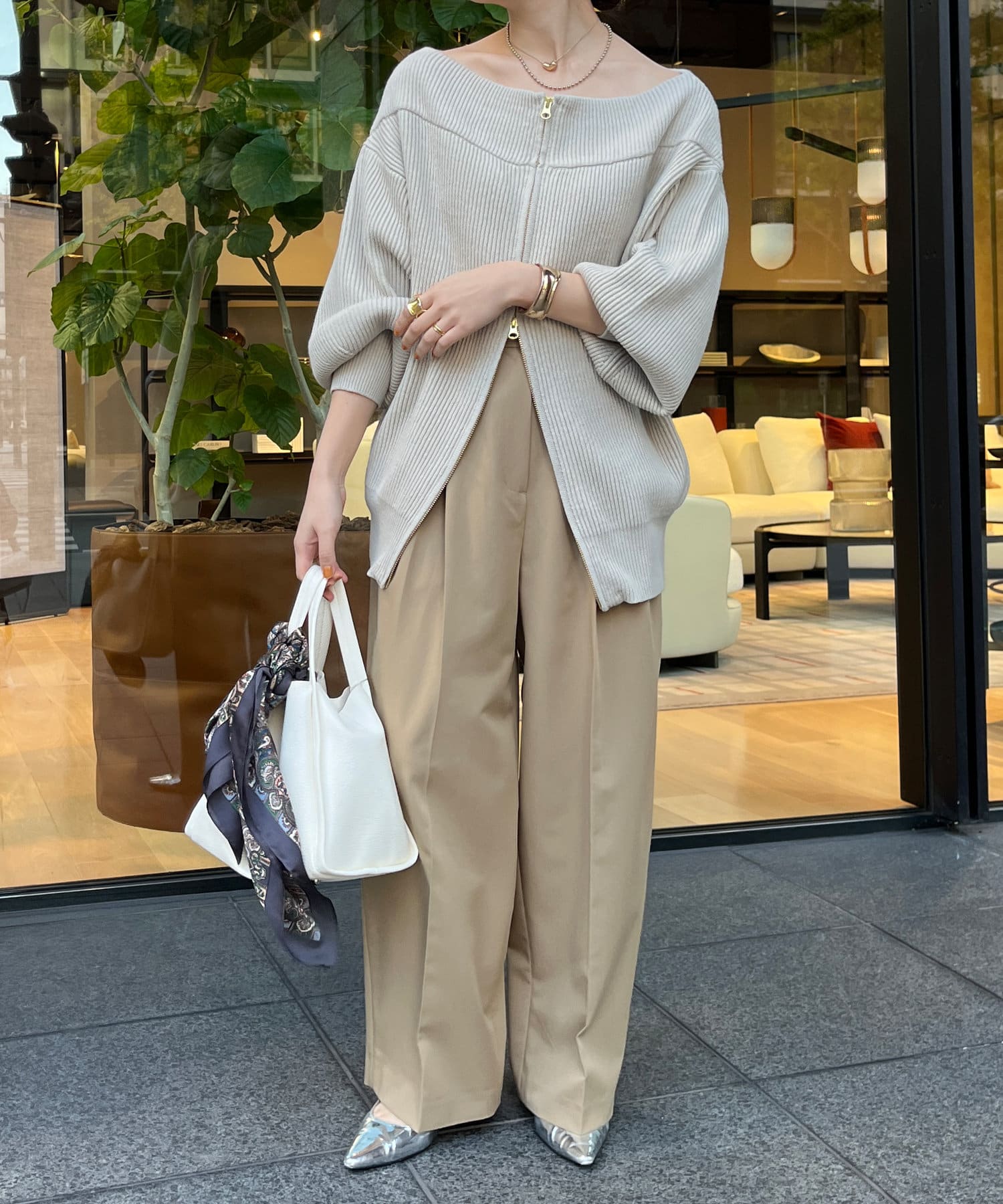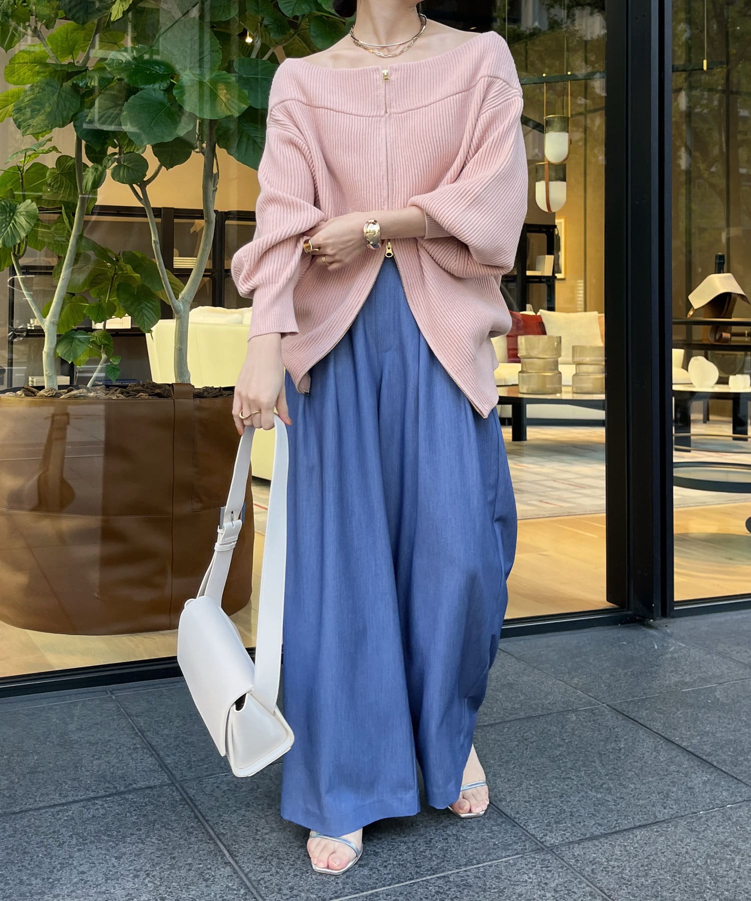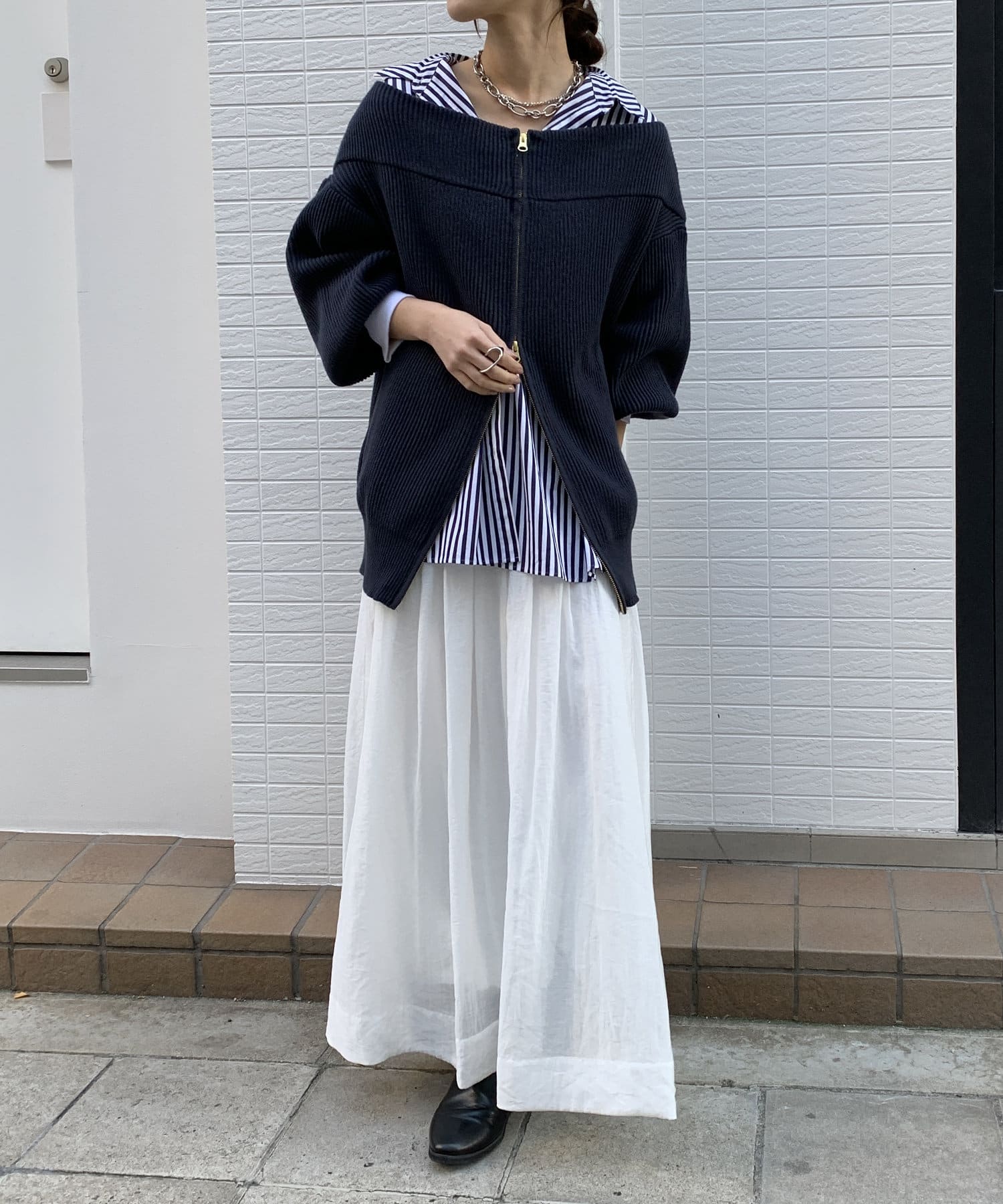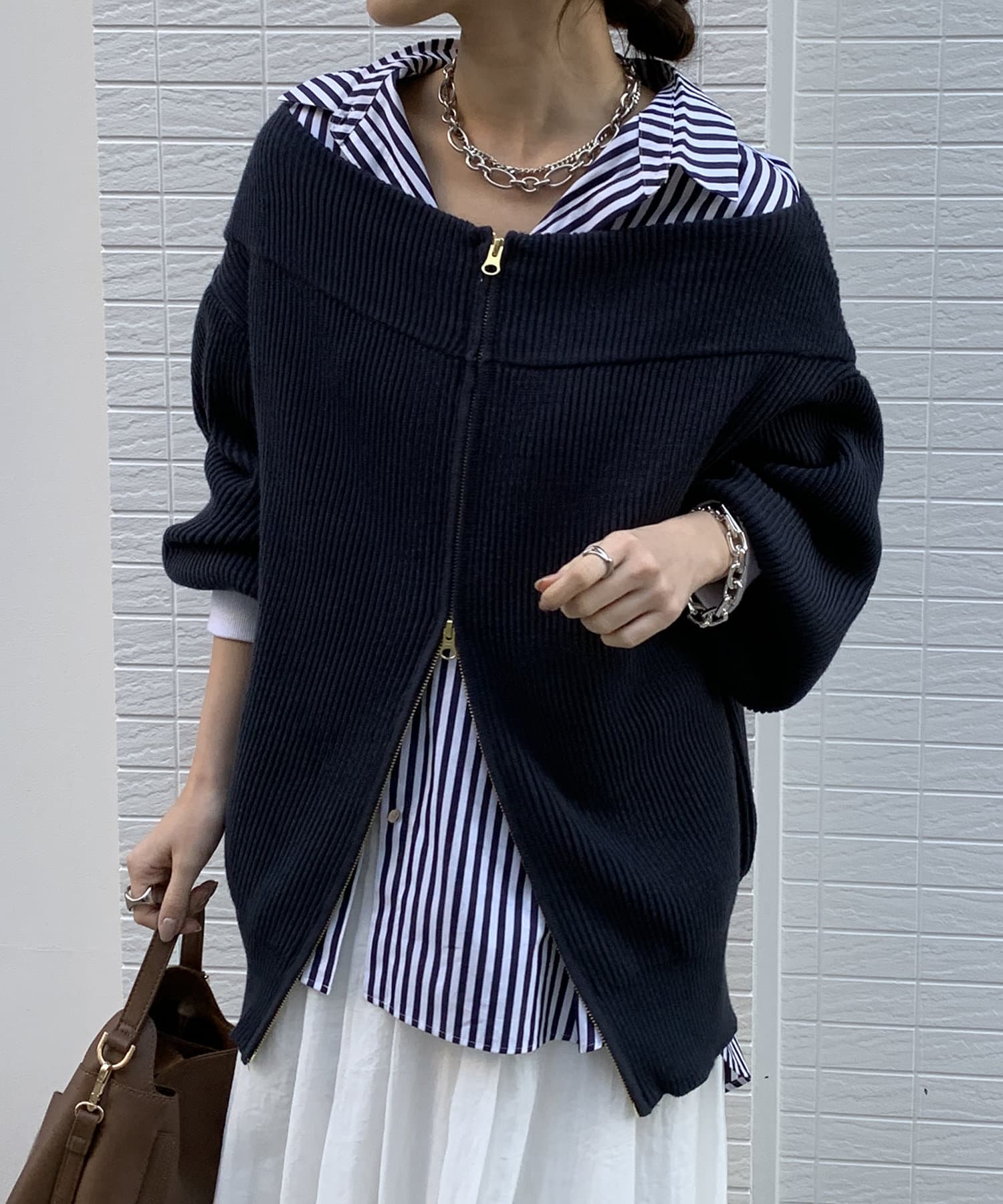 フロントにジップのデザインを施した新鮮な1着。ネックラインを広く取っているため、オフショルとして着用していただけます。