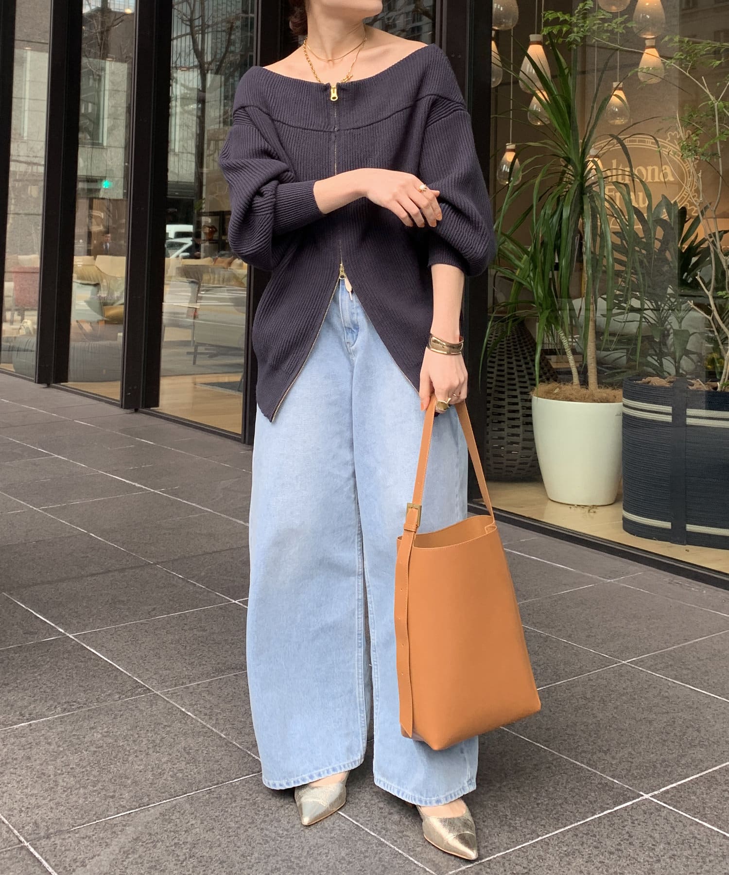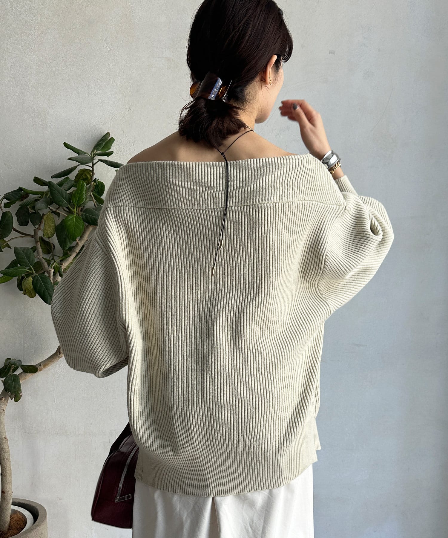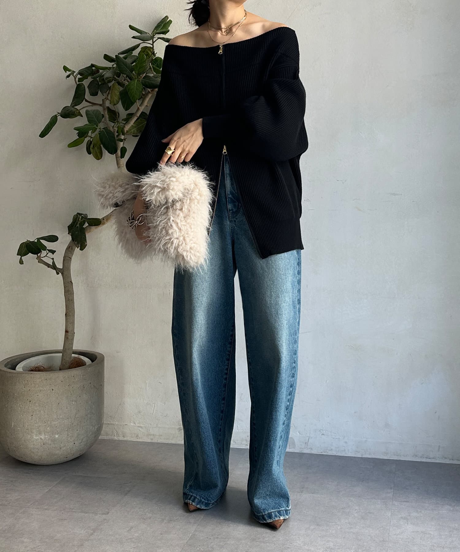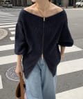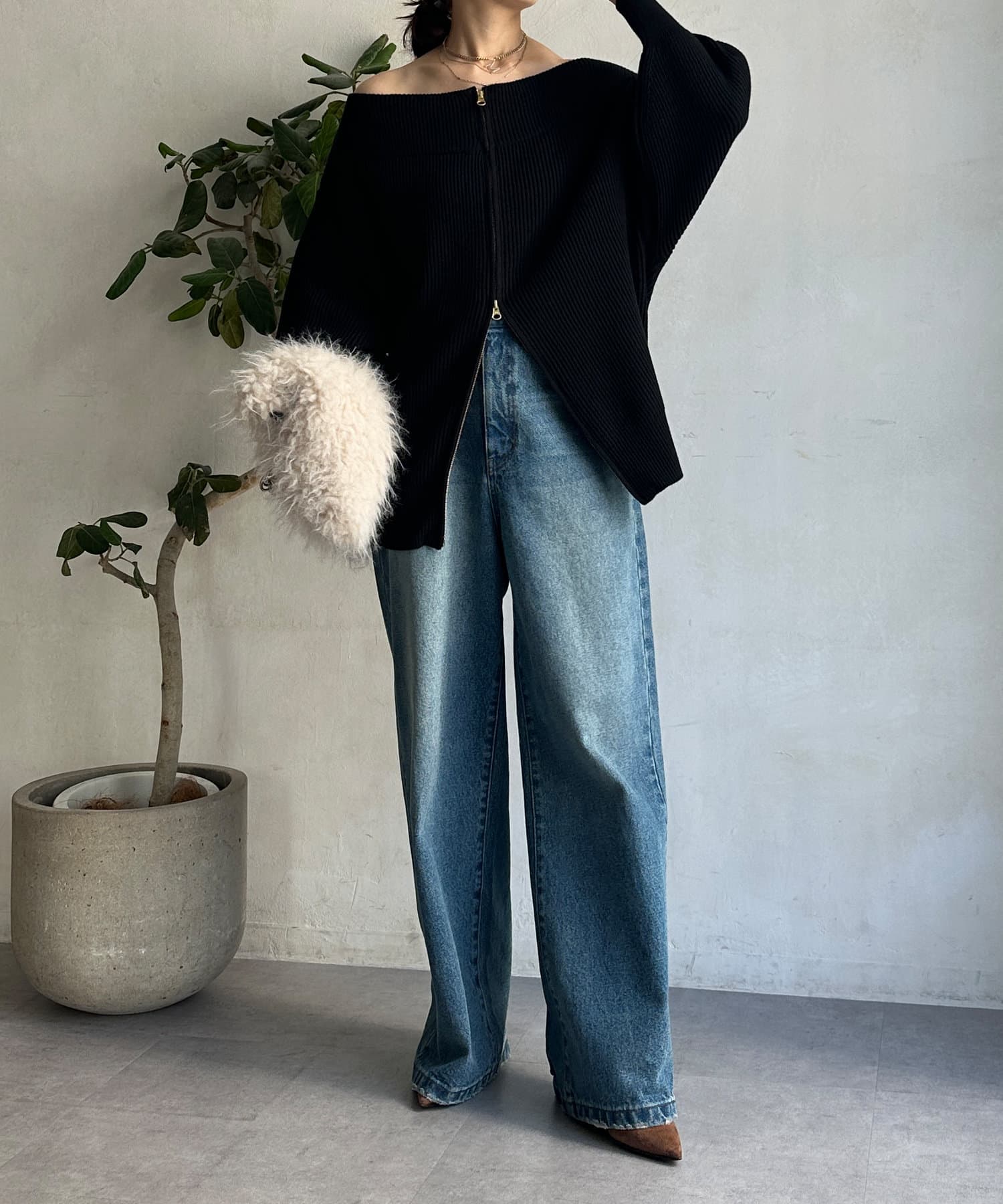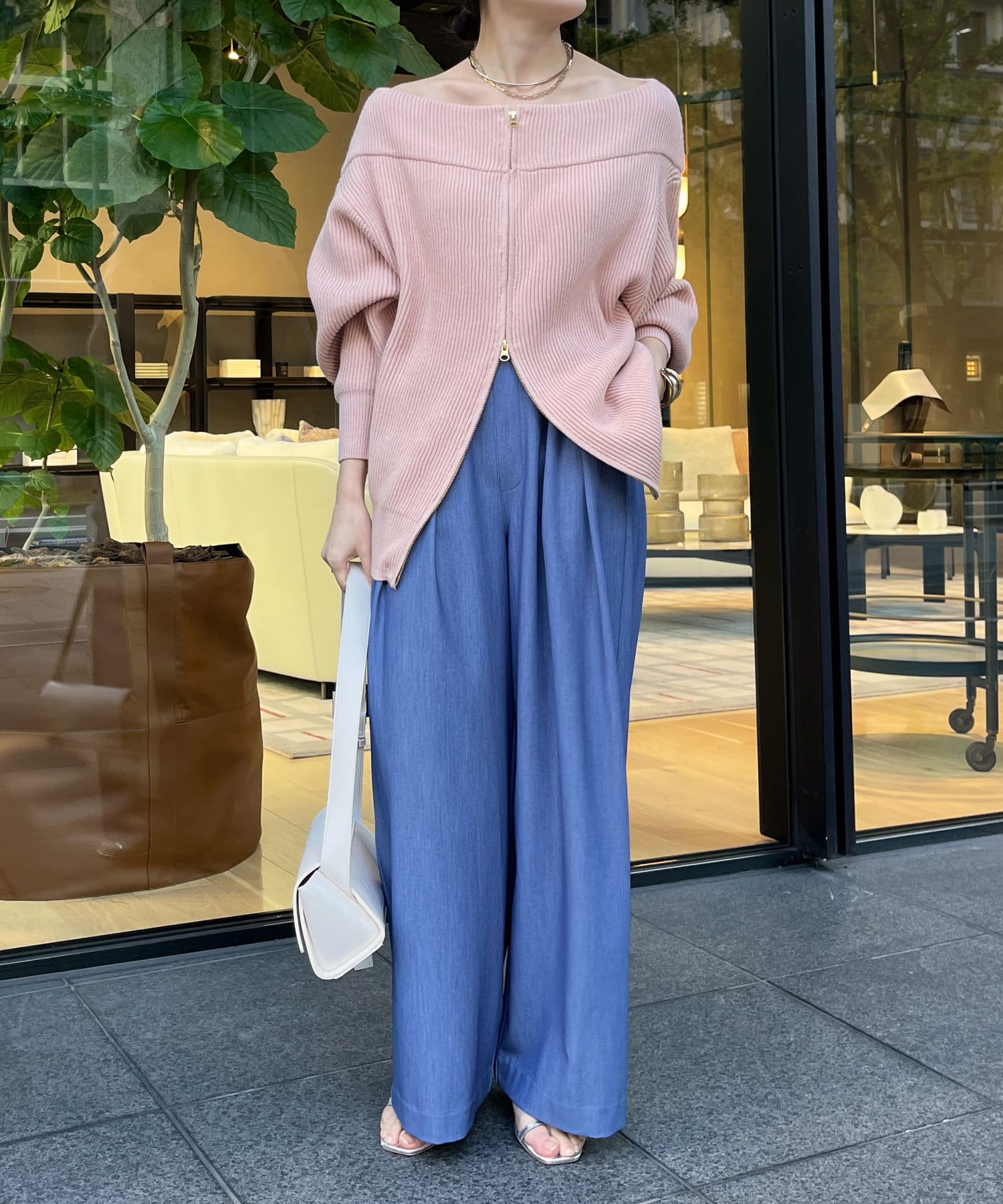 フロントにジップのデザインを施した新鮮な1着。ネックラインを広く取っているため、オフショルとして着用していただけます。
