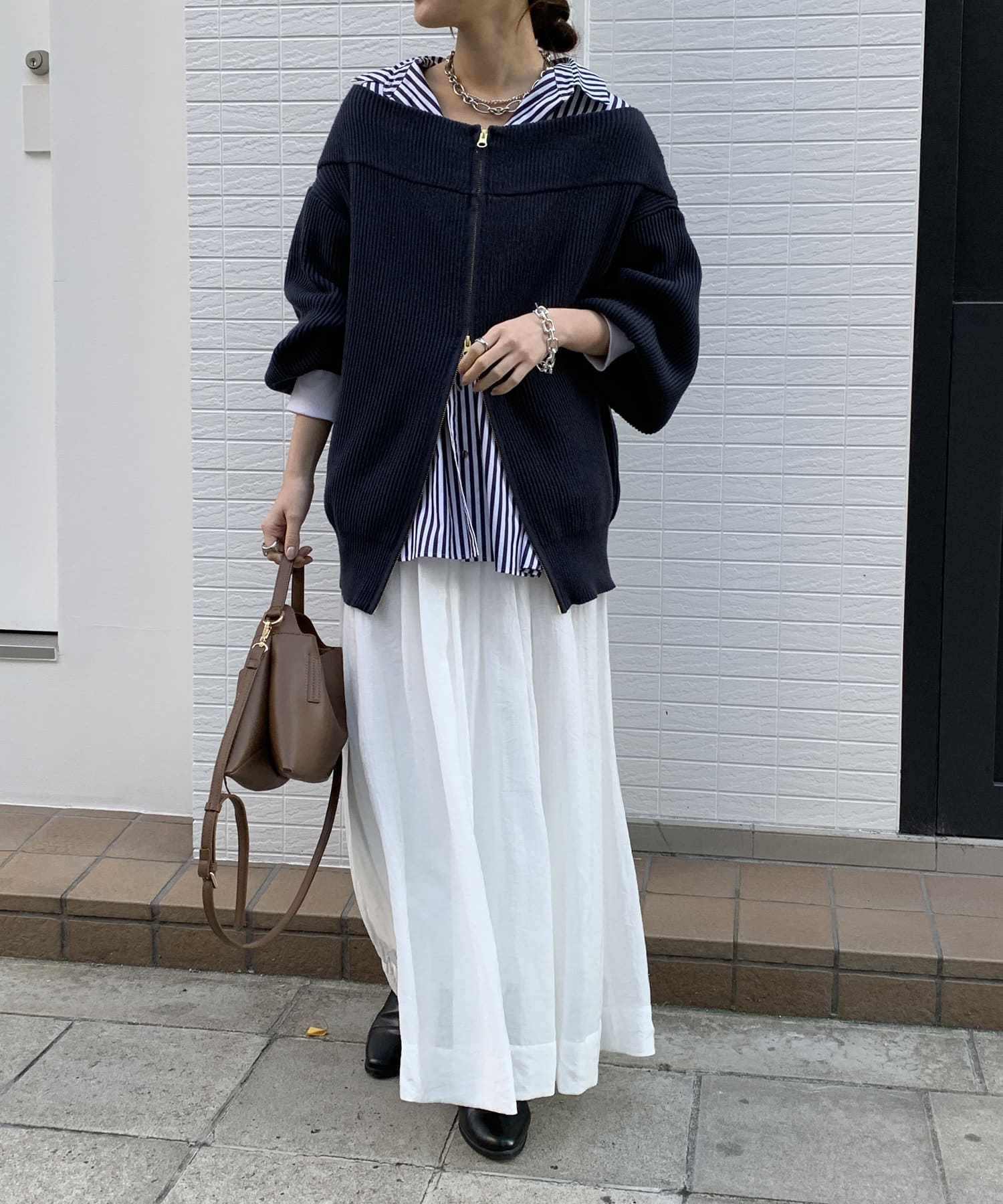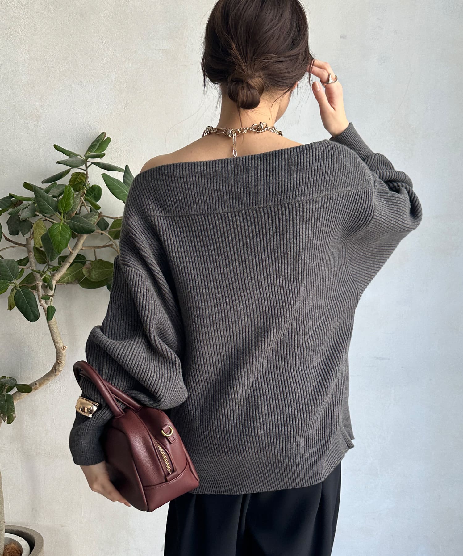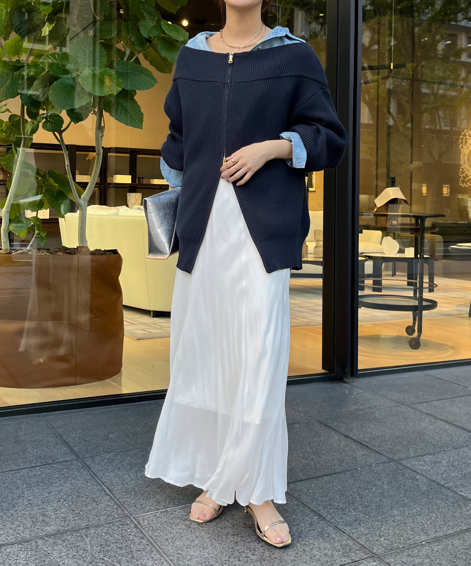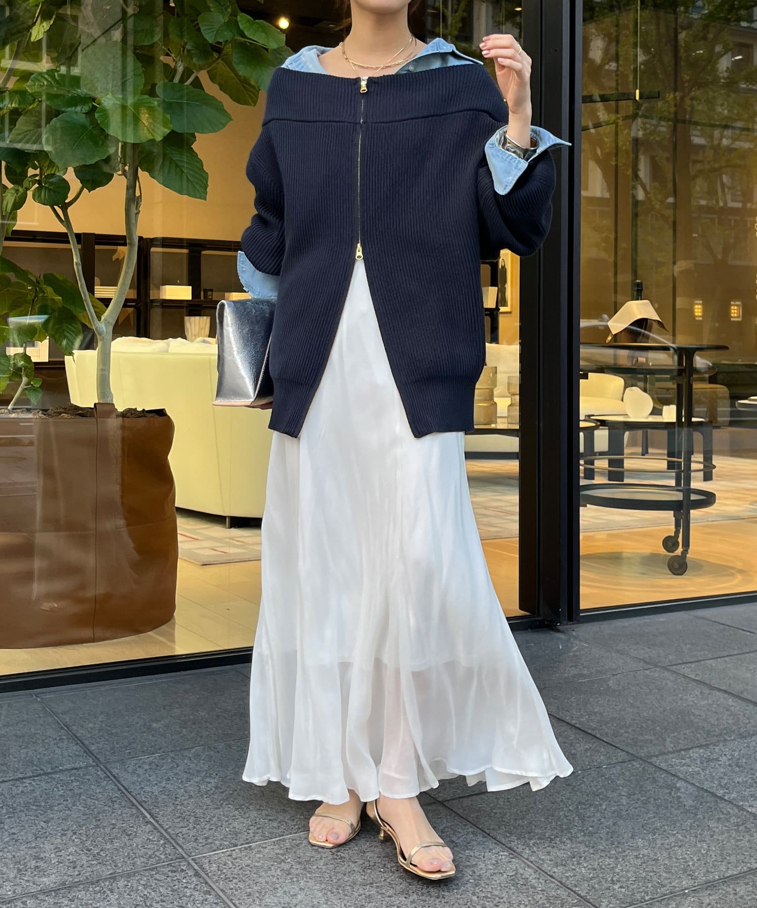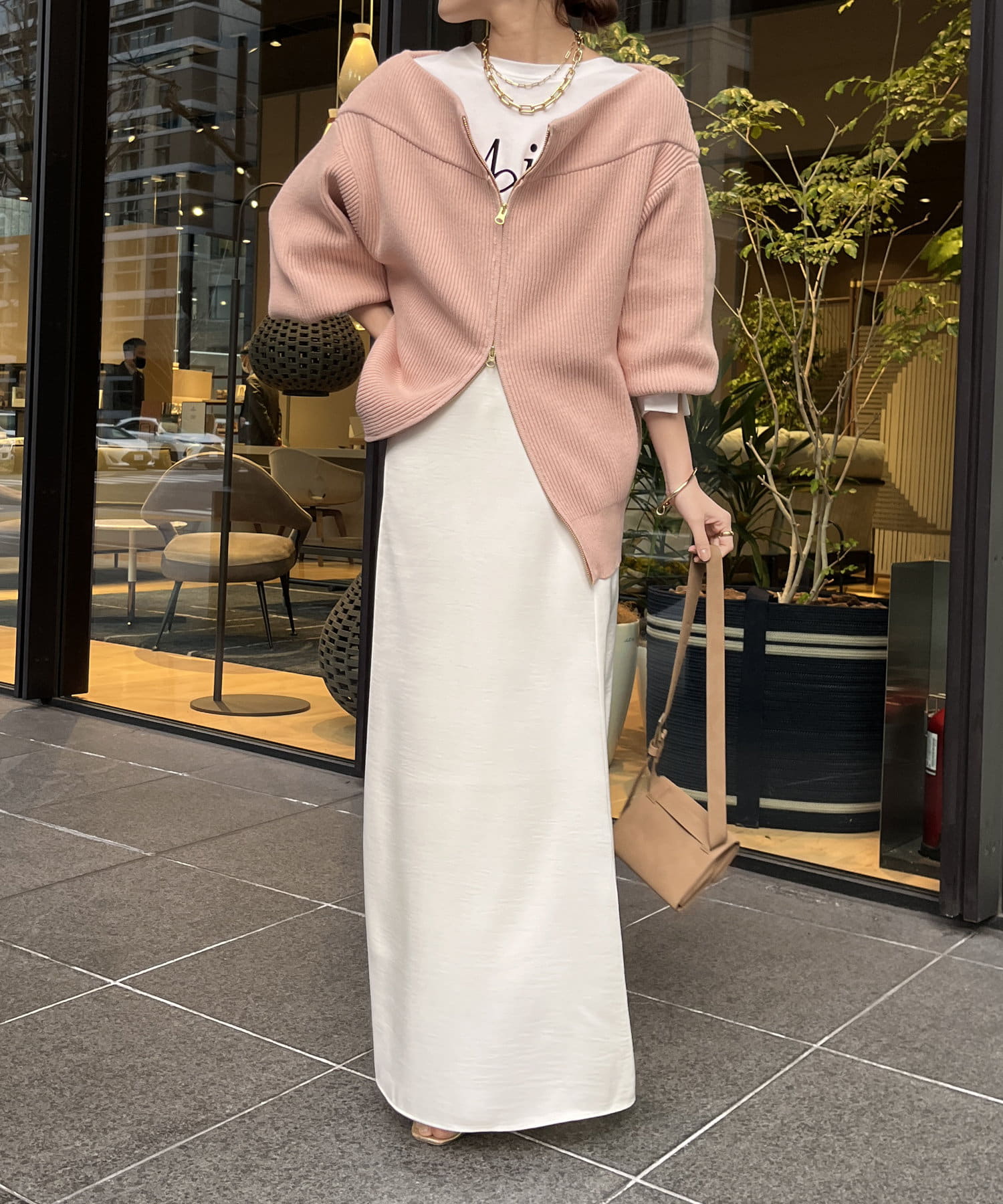 フロントにジップのデザインを施した新鮮な1着。ネックラインを広く取っているため、オフショルとして着用していただけます。