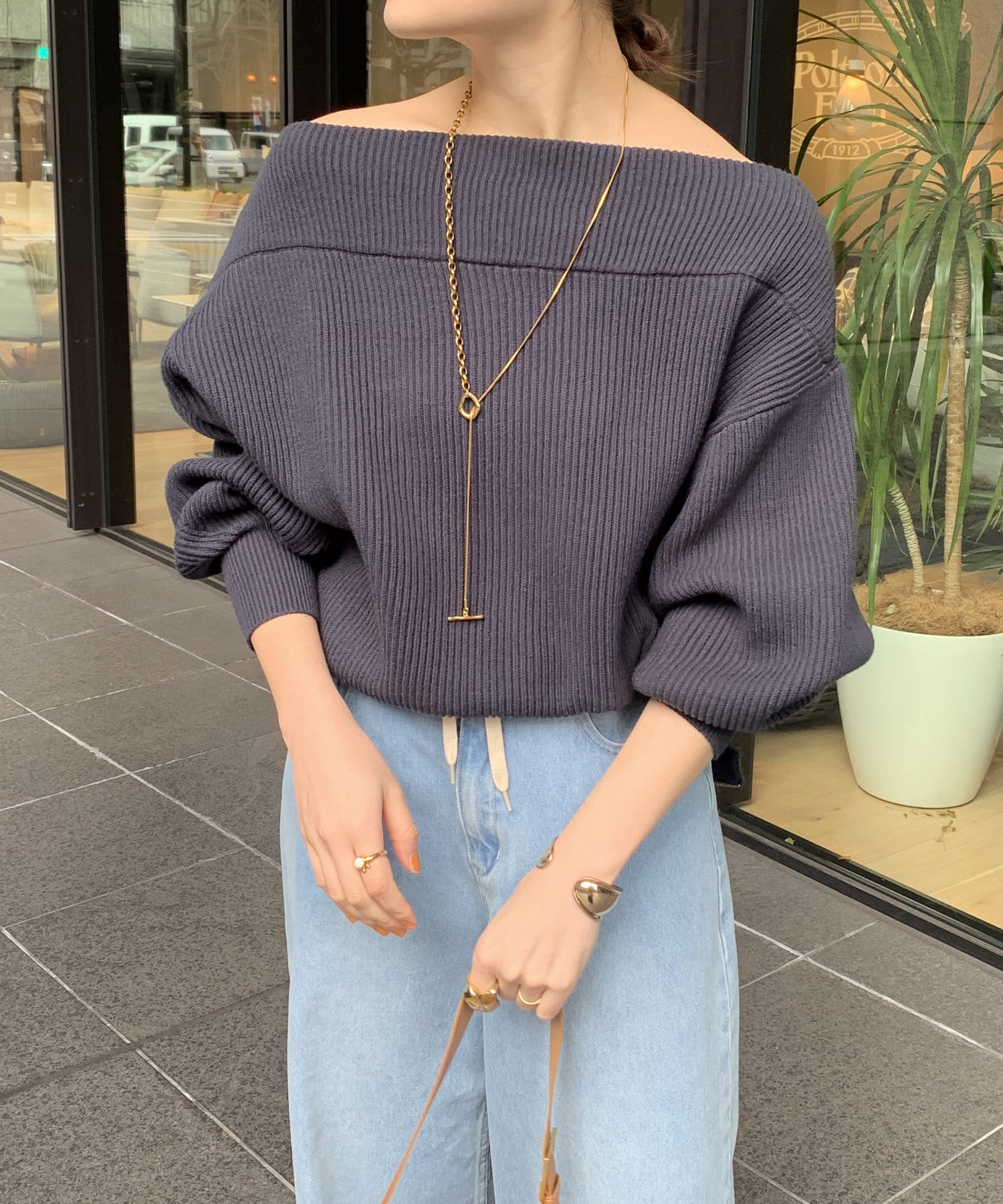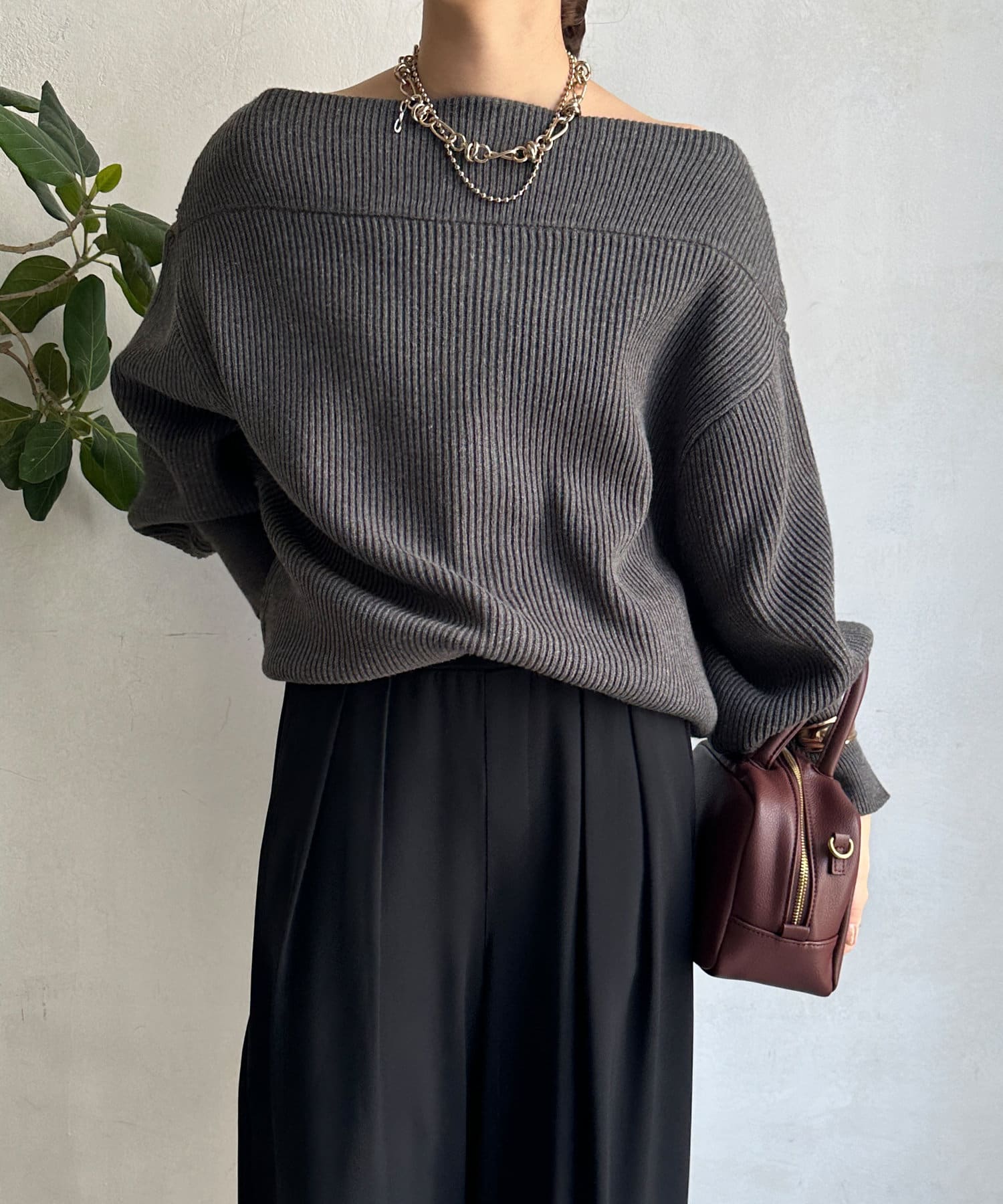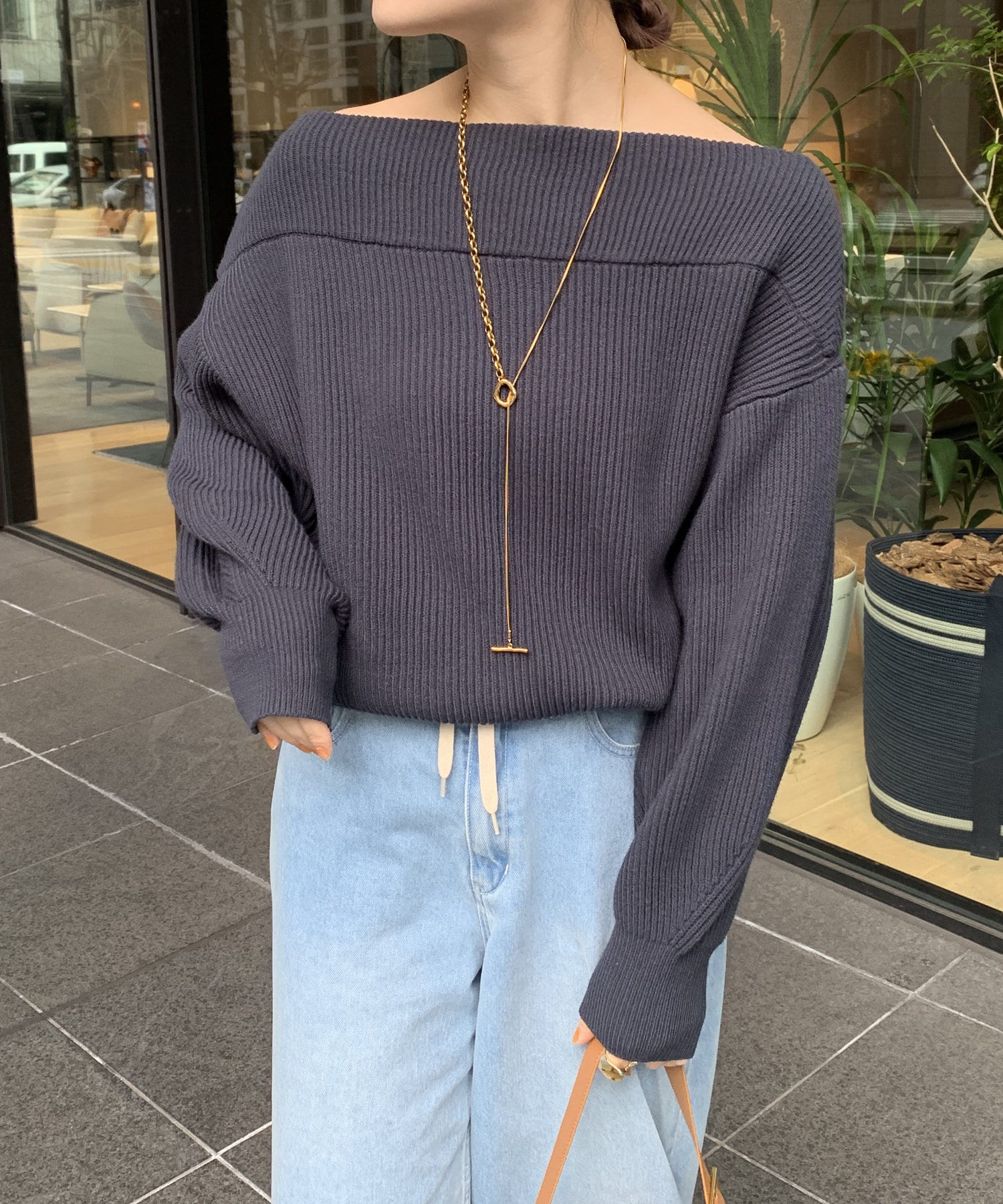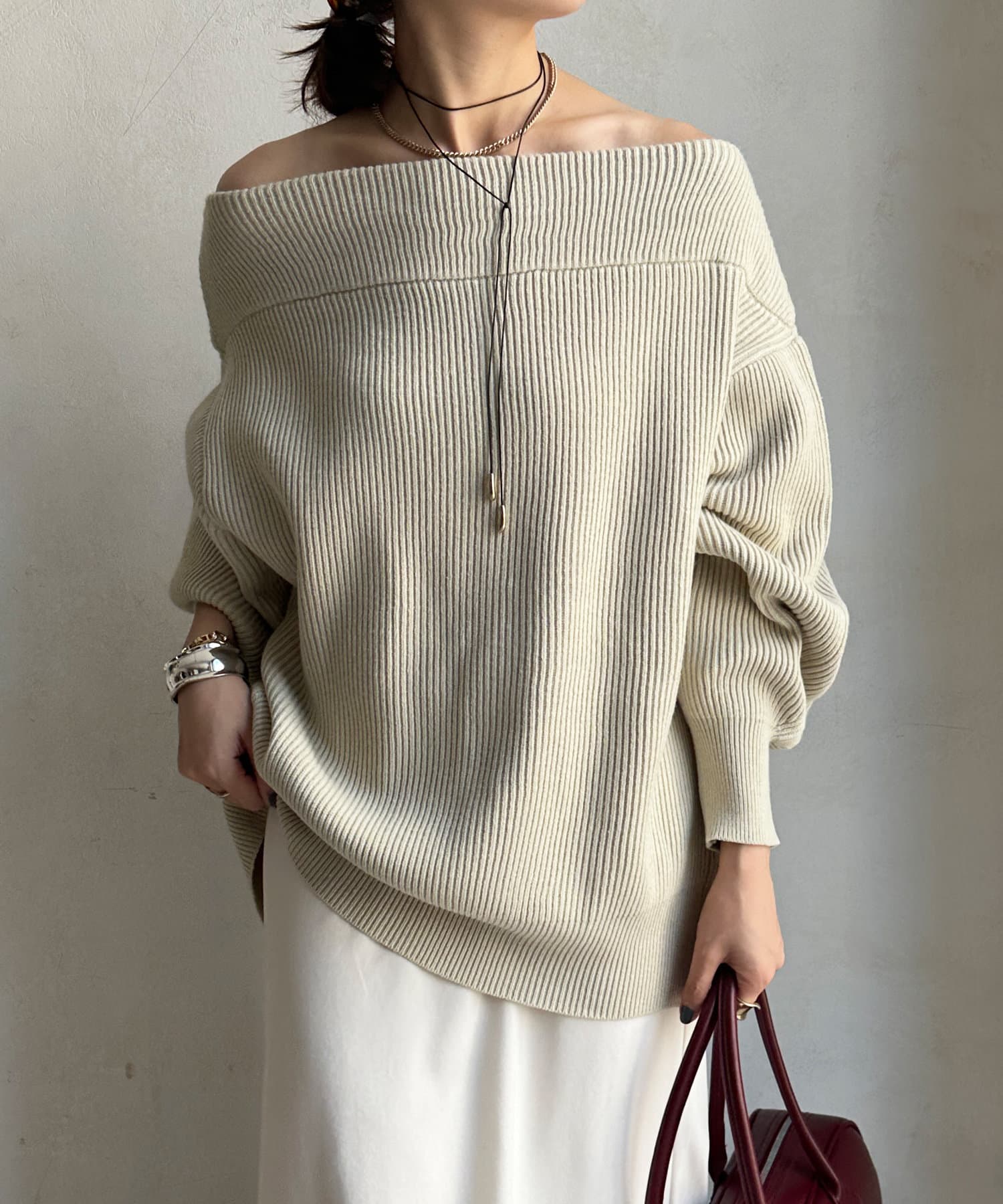フロントにジップのデザインを施した新鮮な1着。ネックラインを広く取っているため、オフショルとして着用していただけます。
