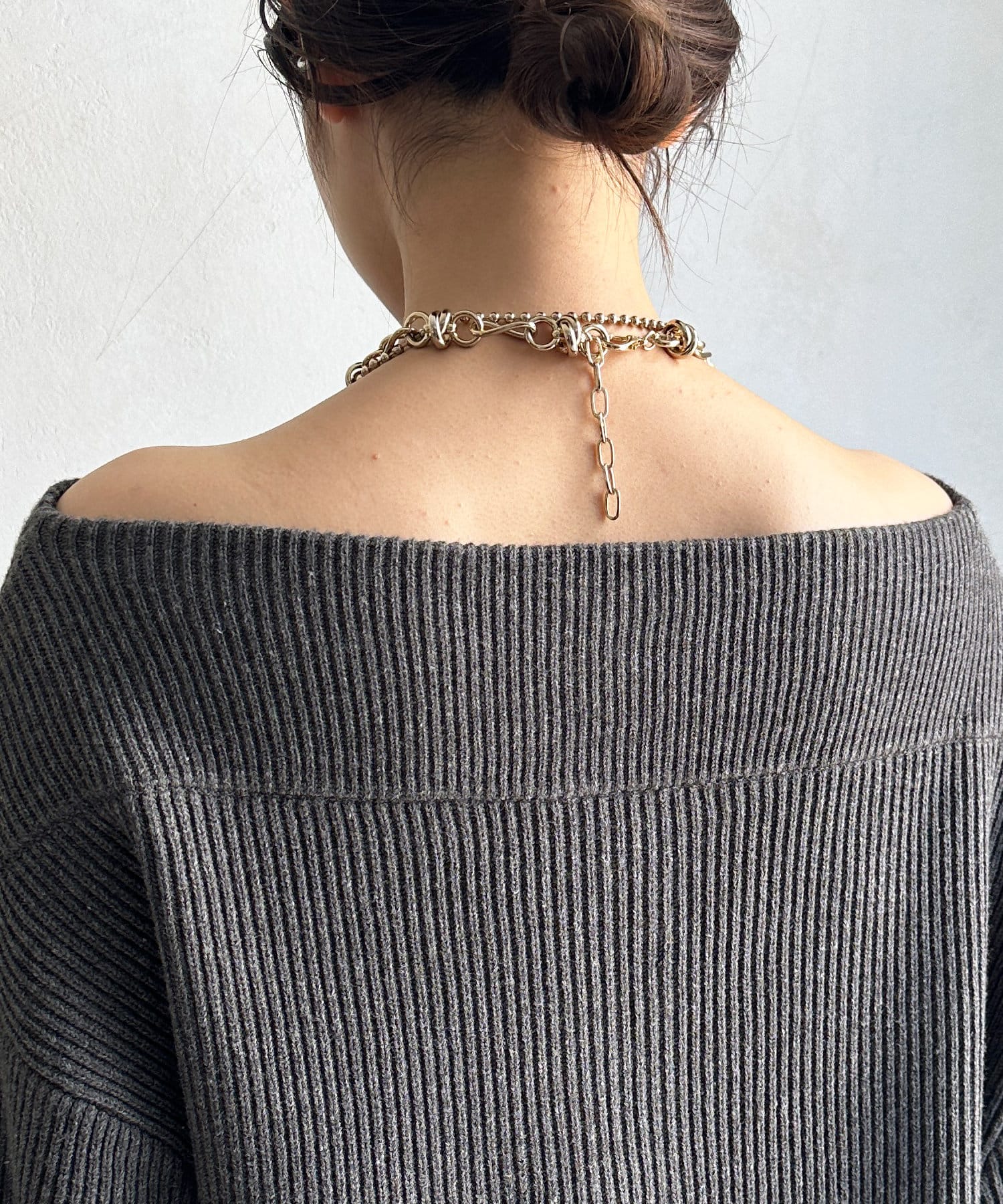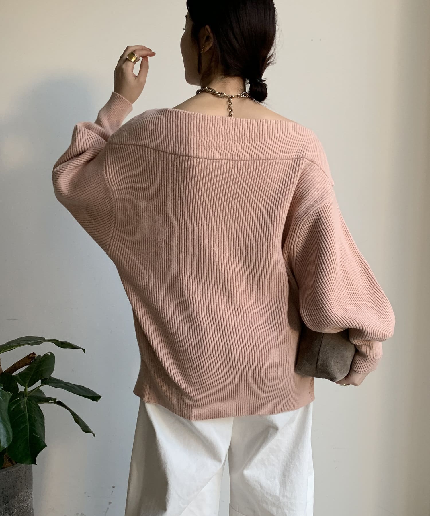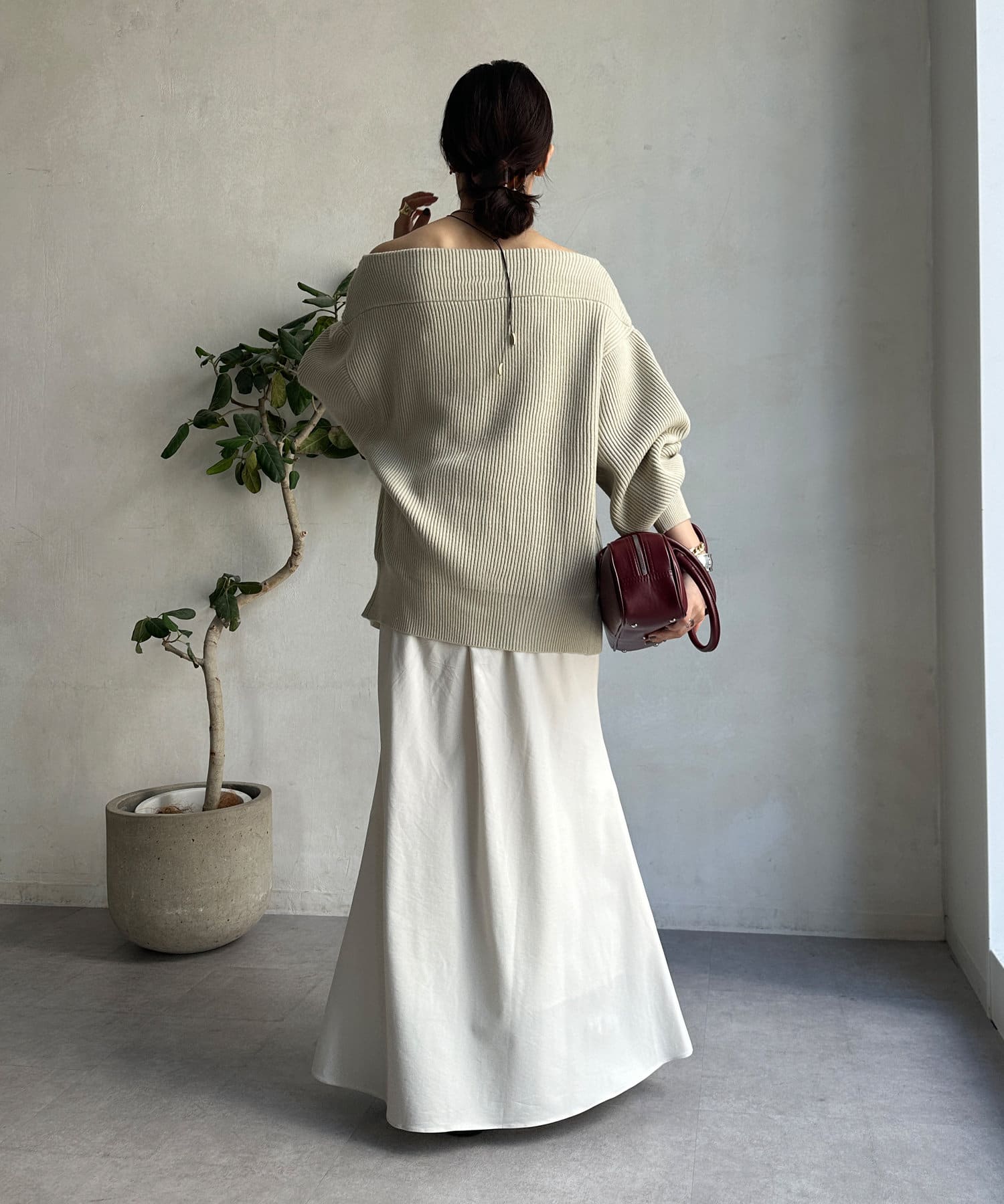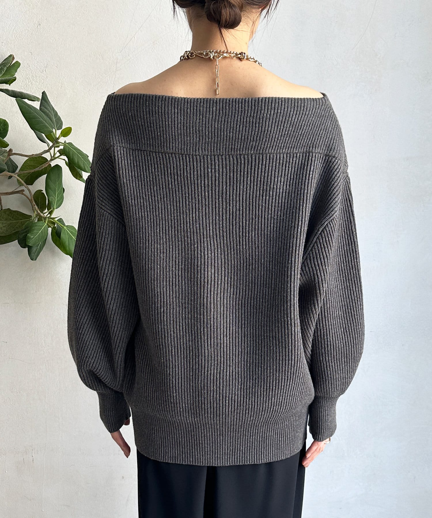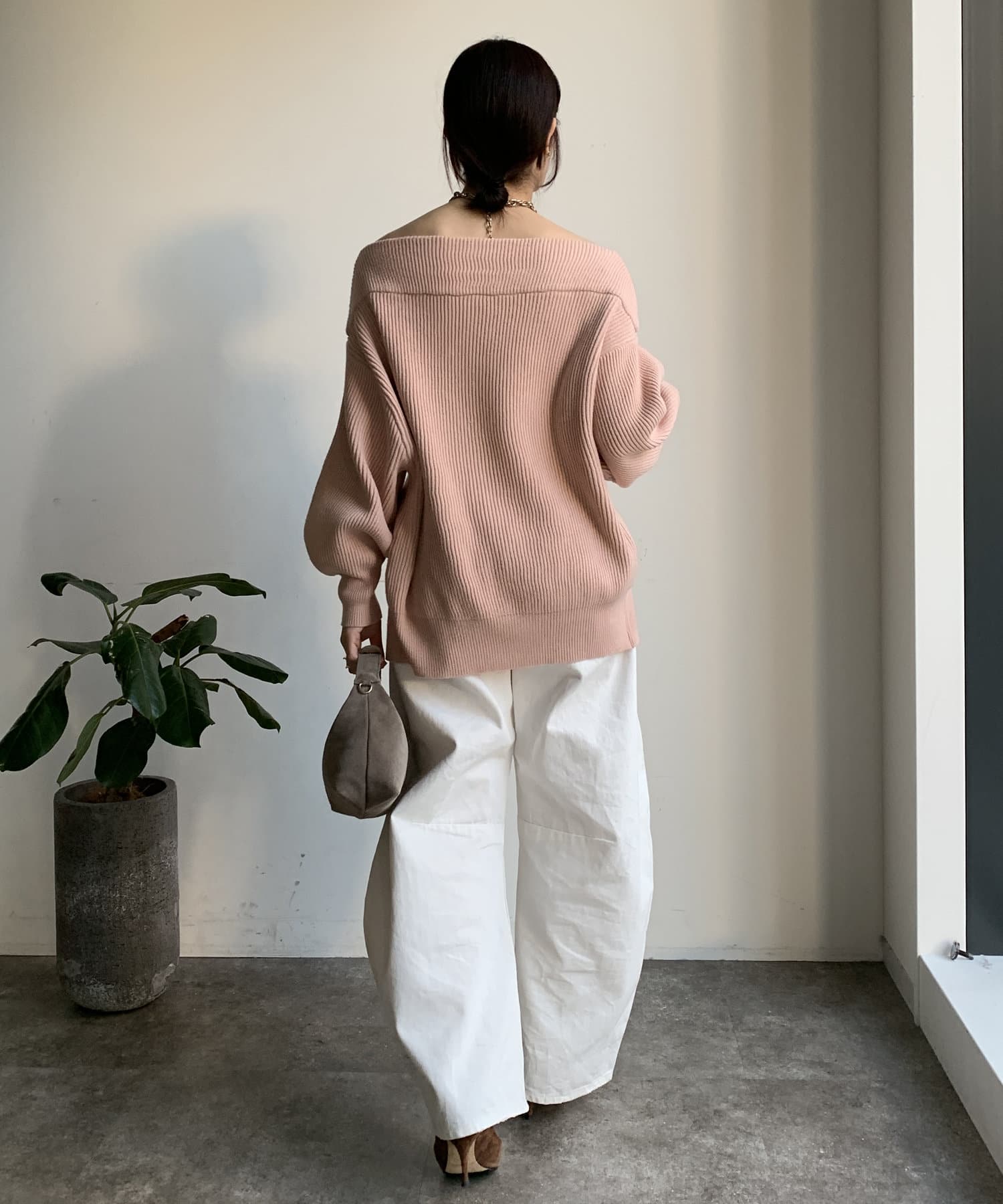 フロントにジップのデザインを施した新鮮な1着。ネックラインを広く取っているため、オフショルとして着用していただけます。