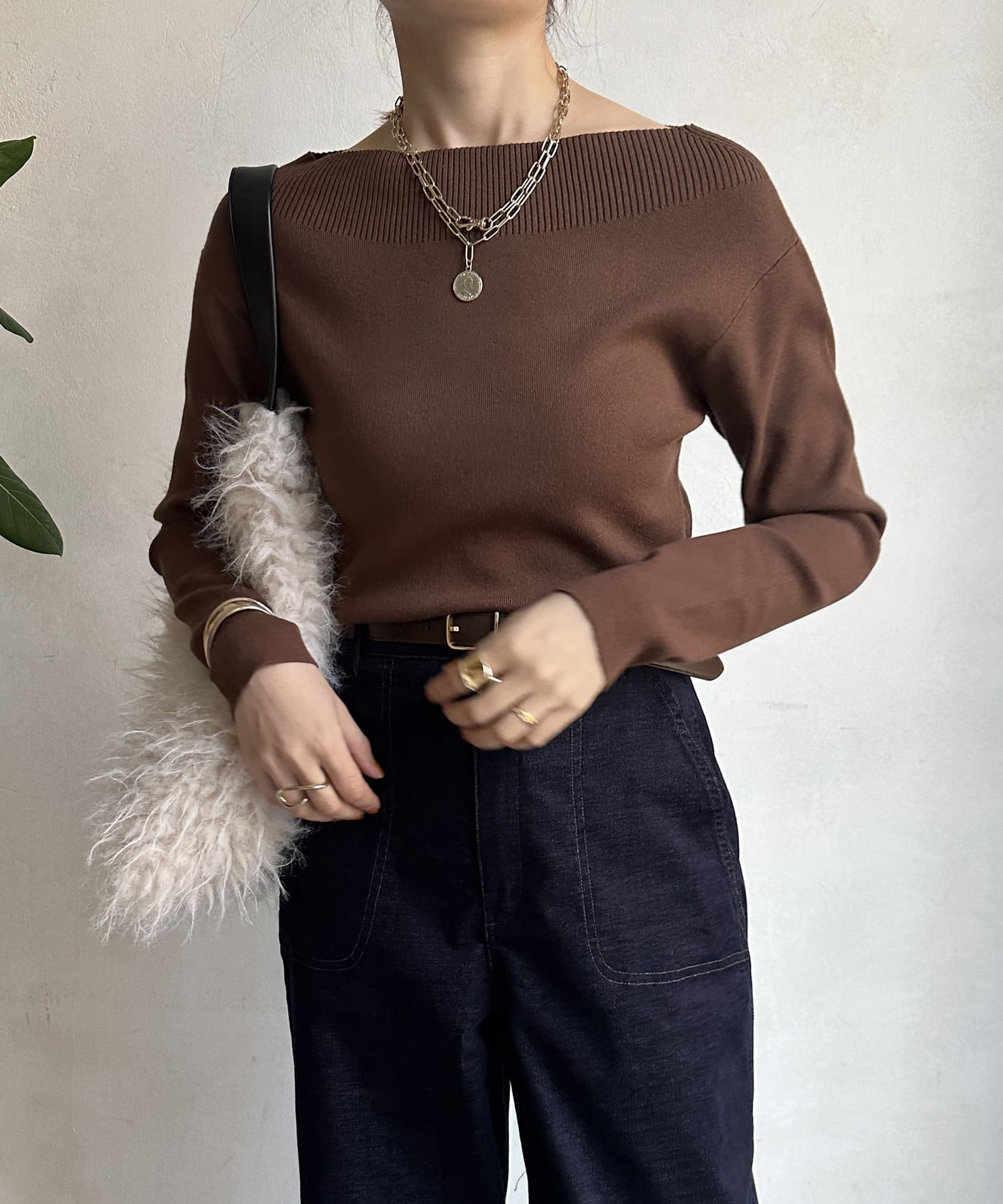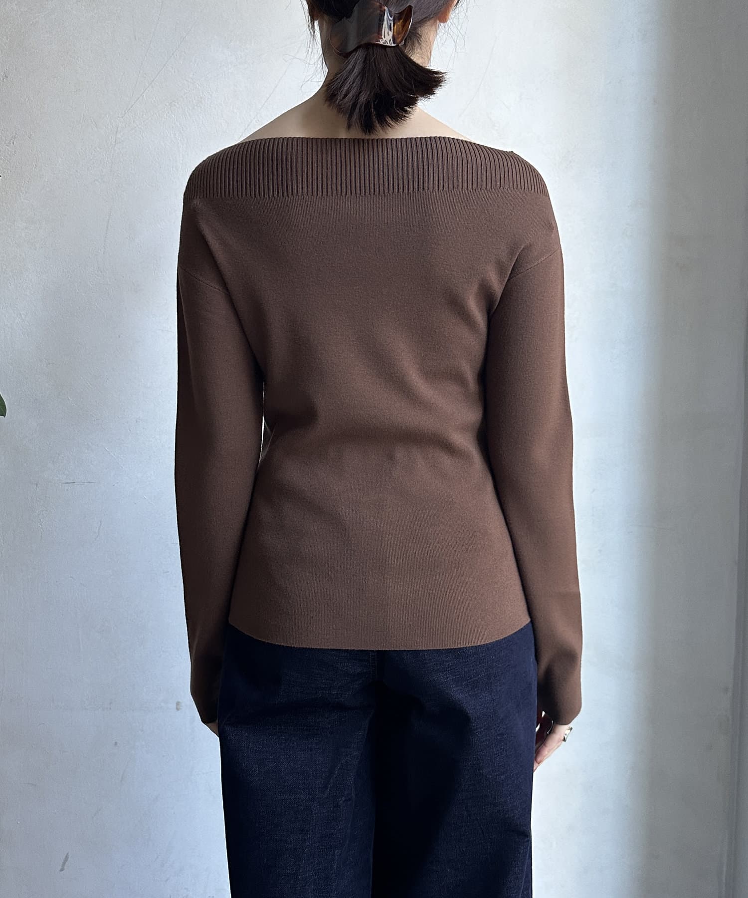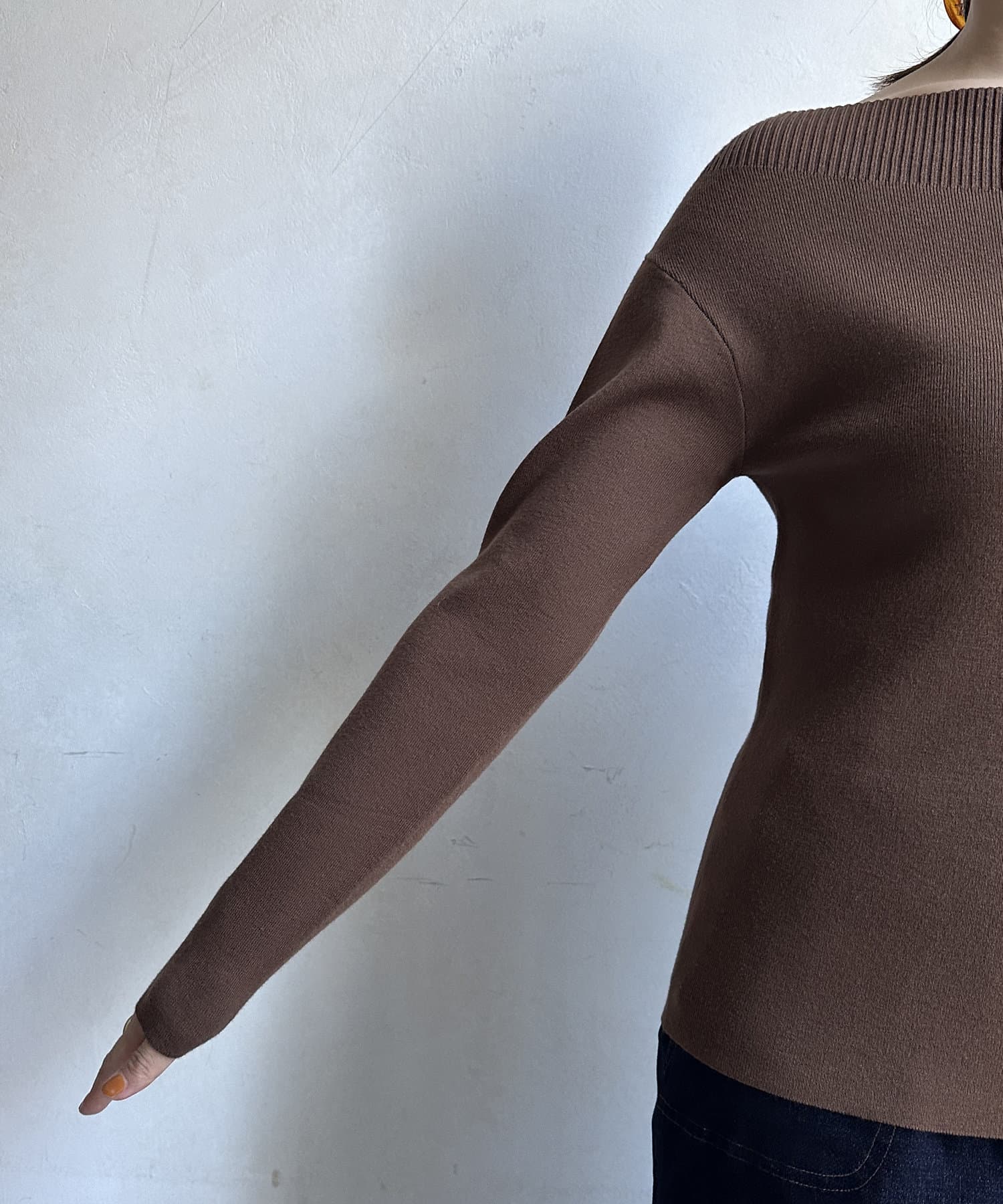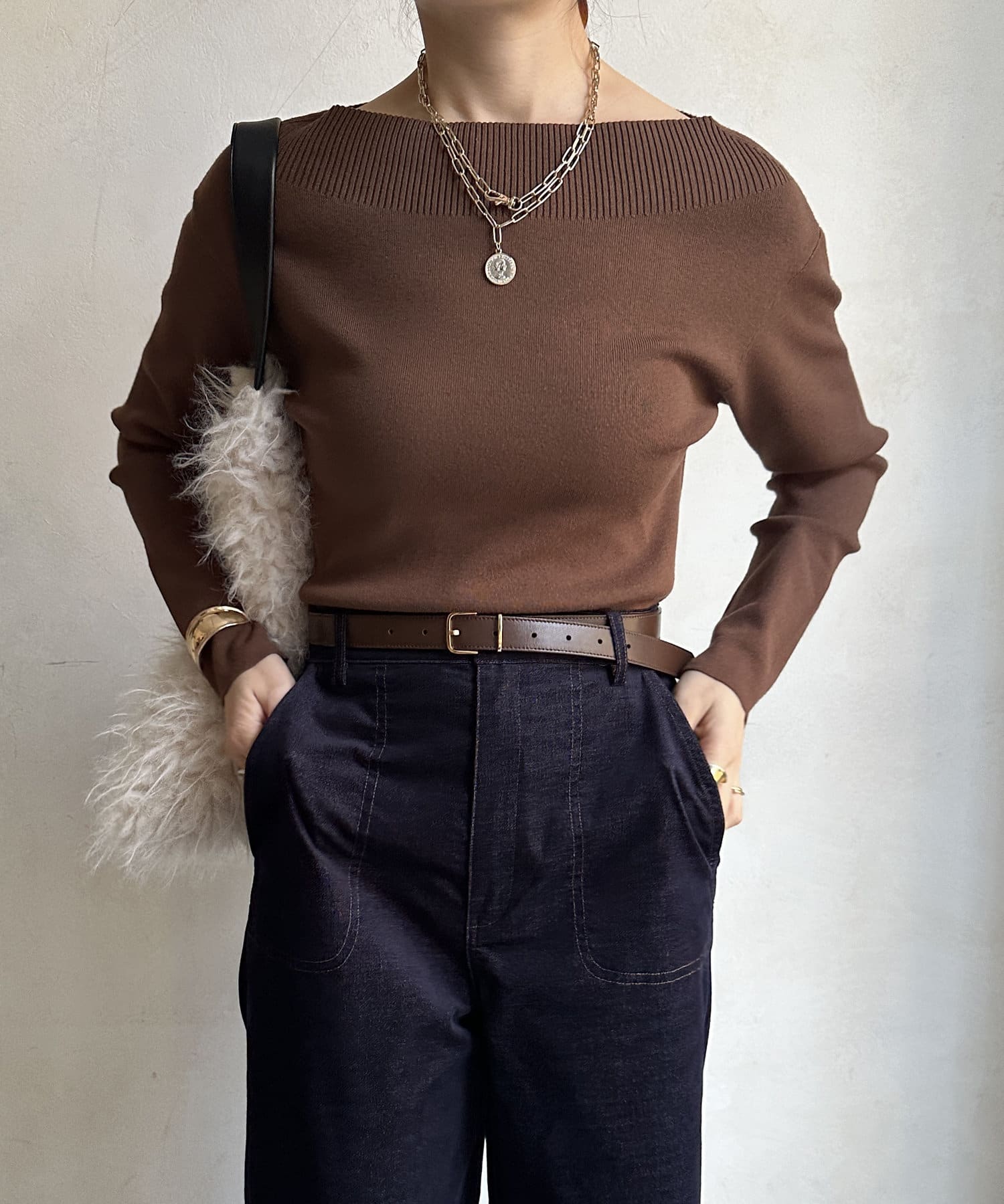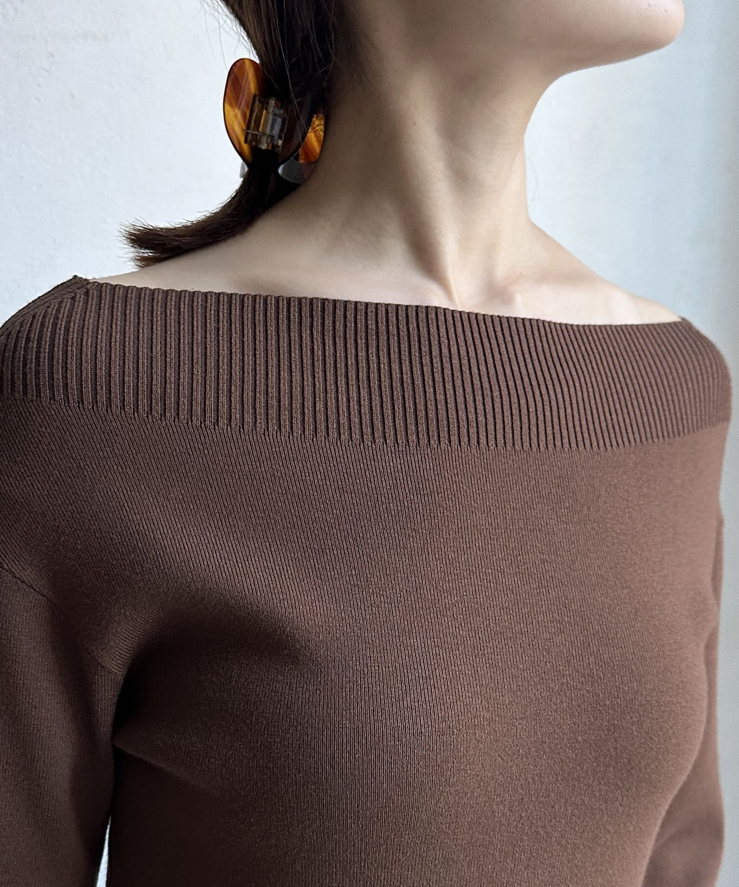 首元は横に開くボートネックデザインで、お顔周りをすっきりと見せてくれます。