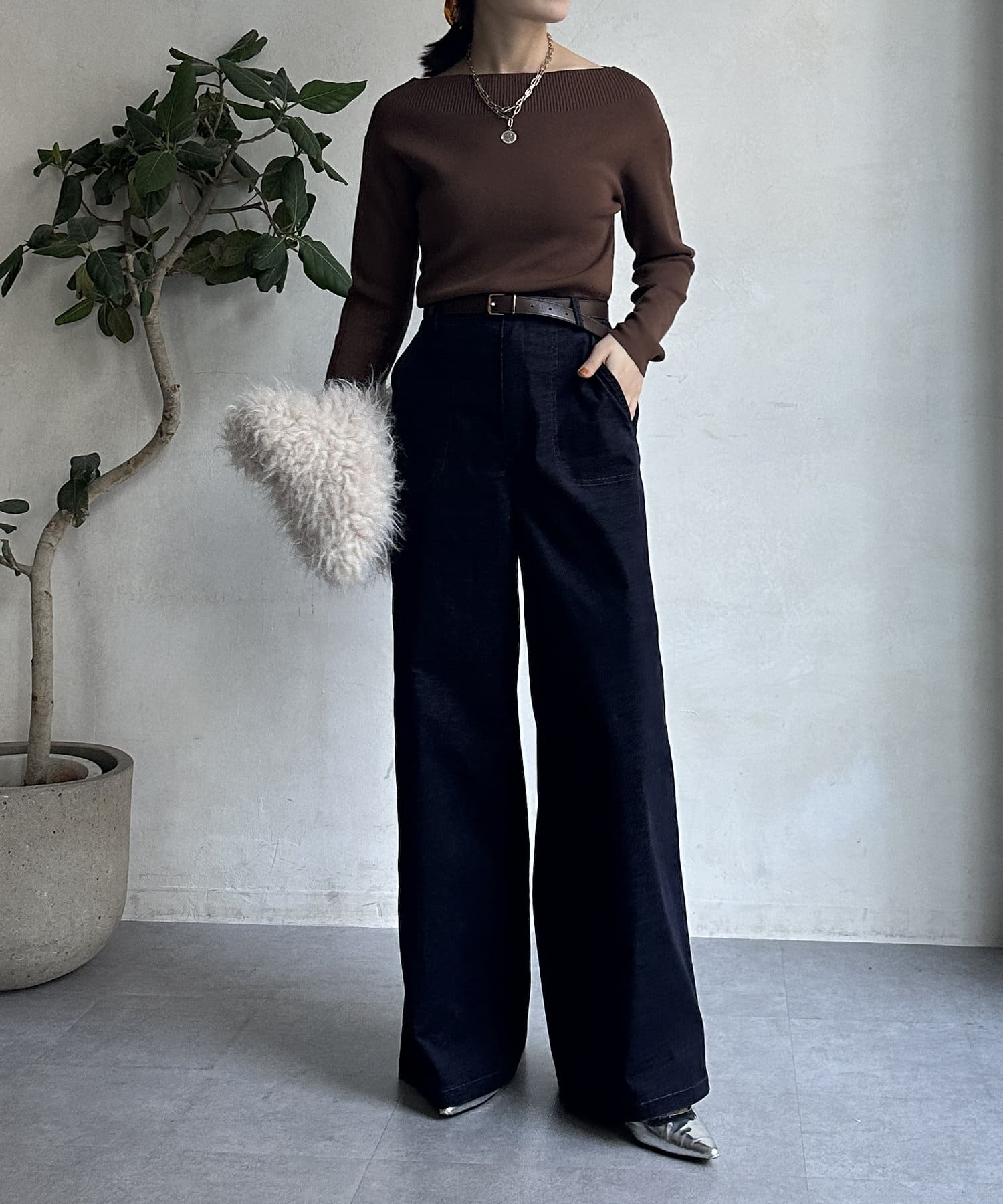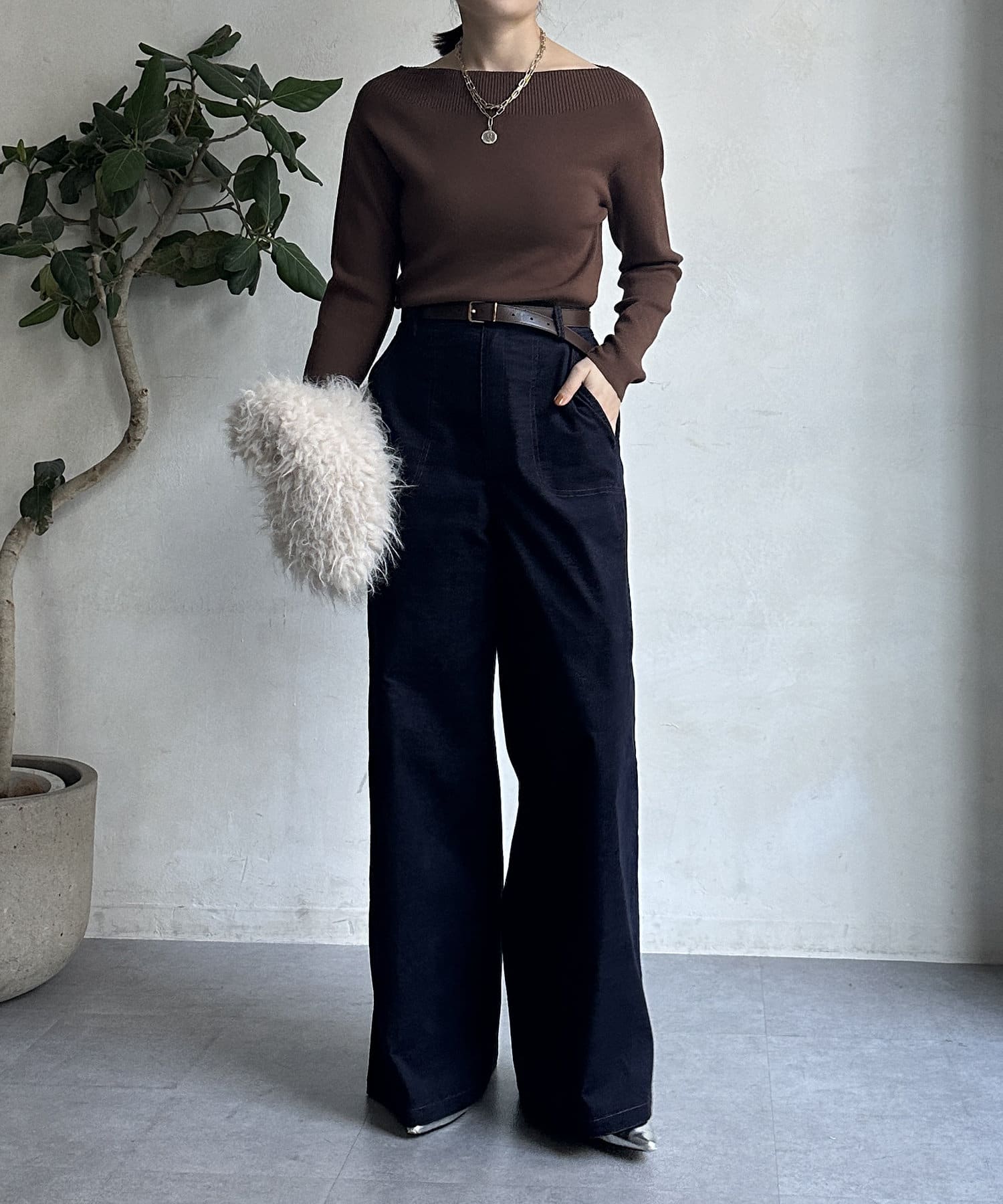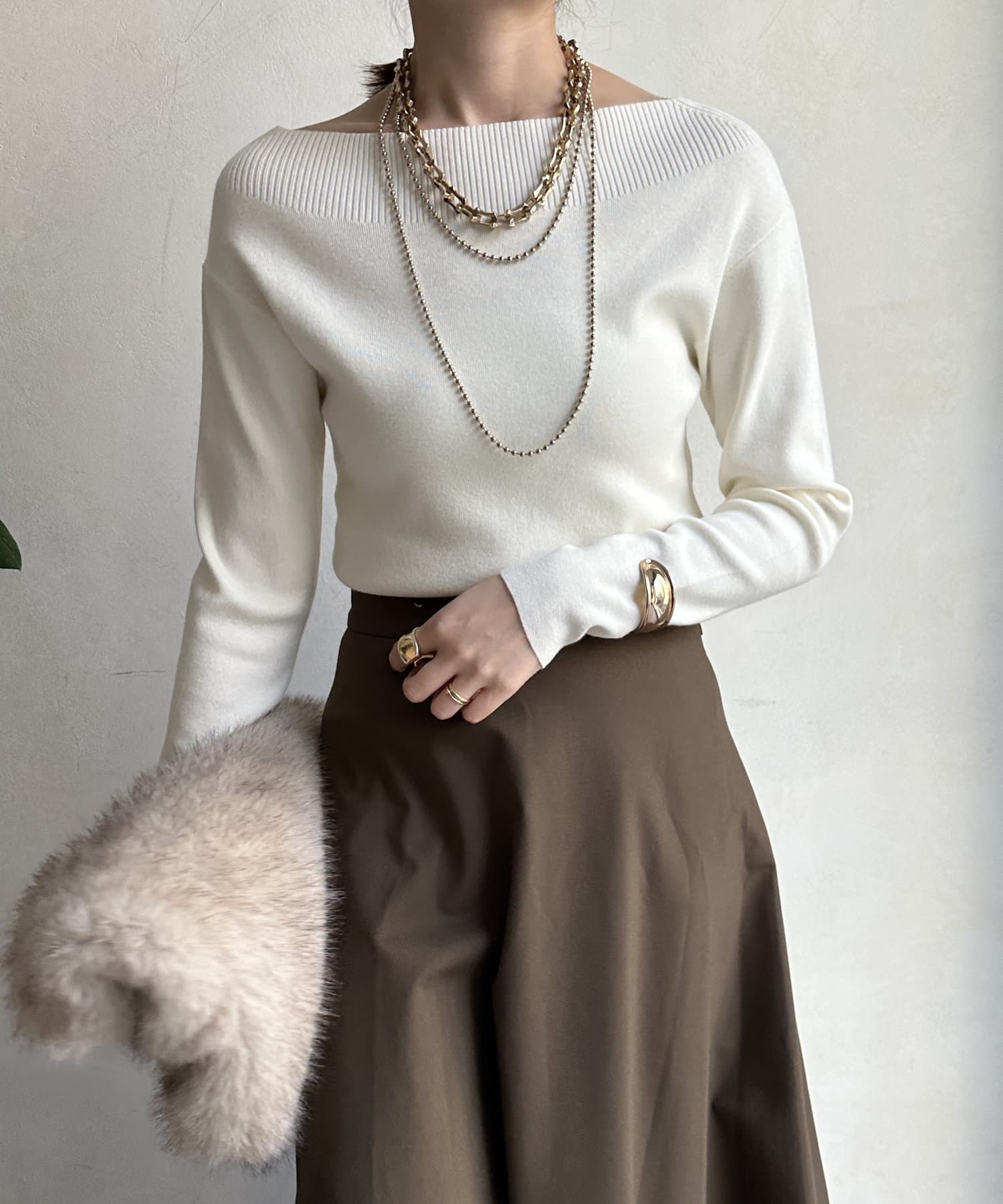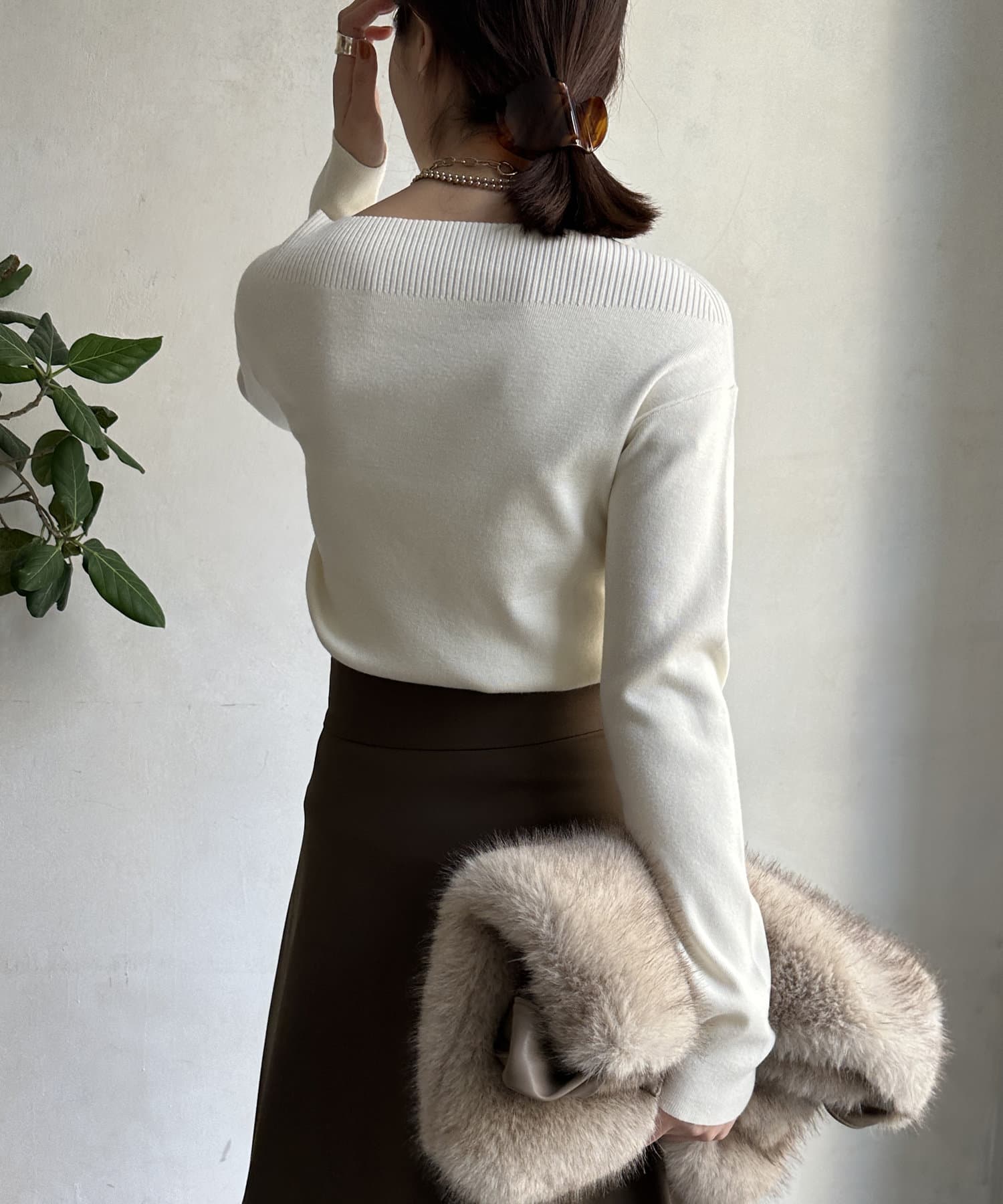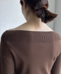 首元は横に開くボートネックデザインで、お顔周りをすっきりと見せてくれます。