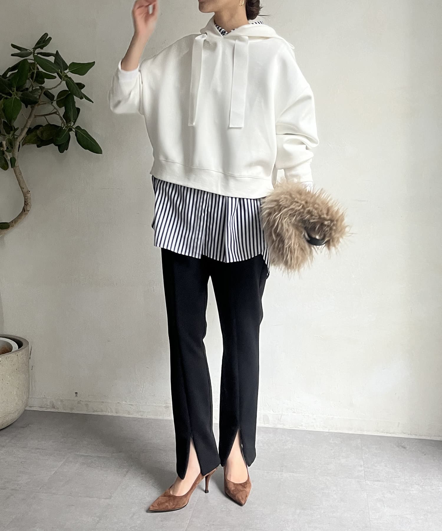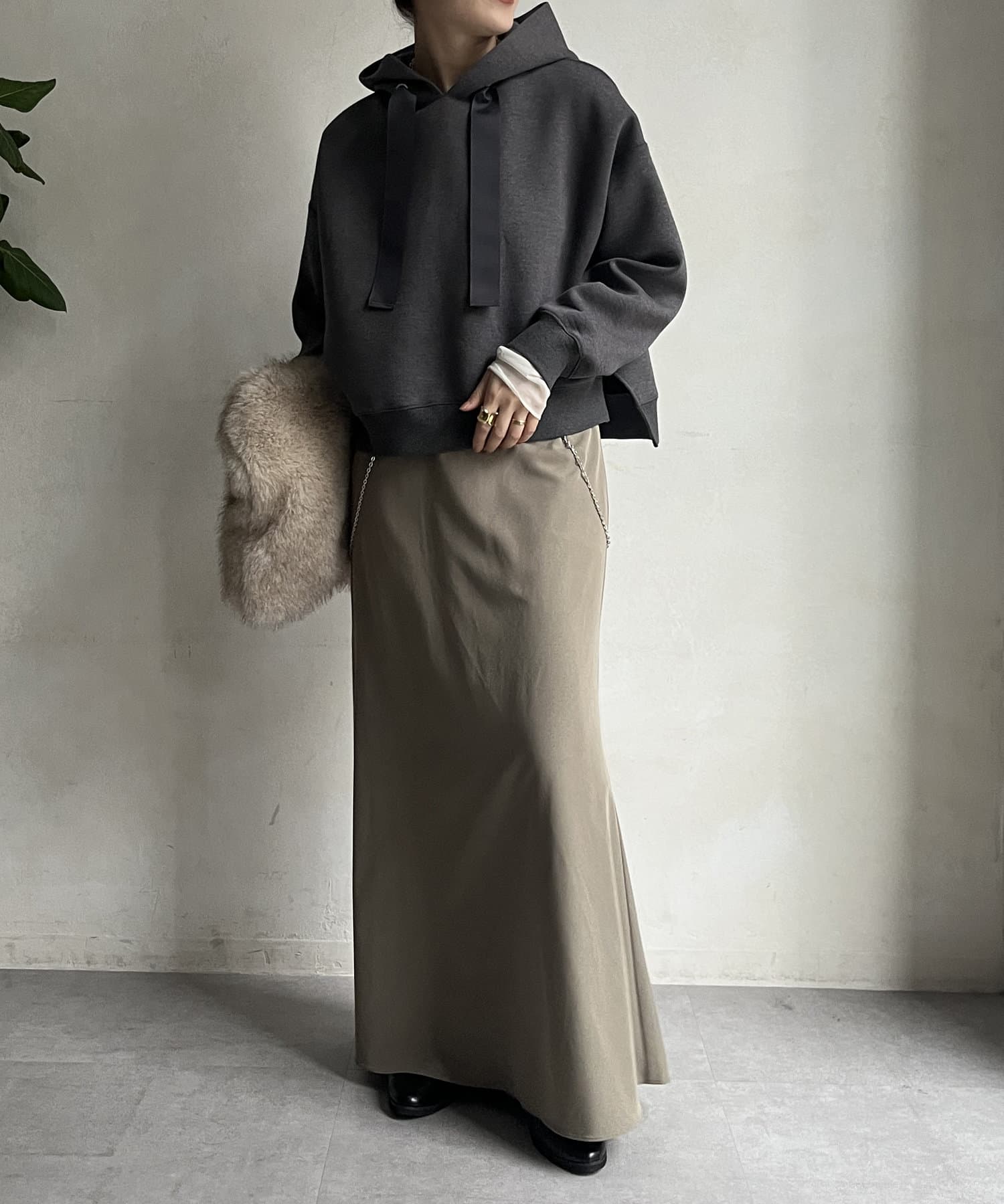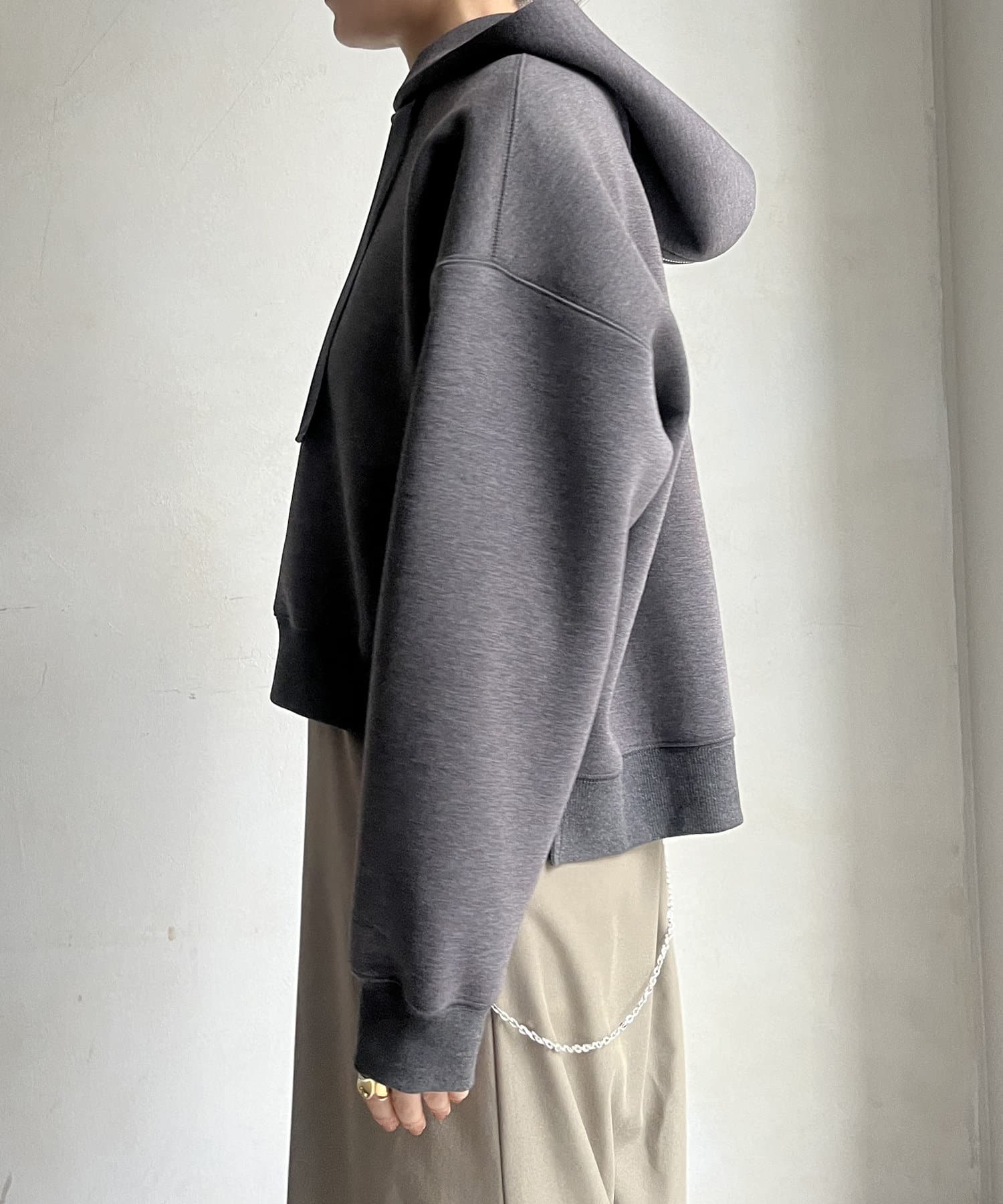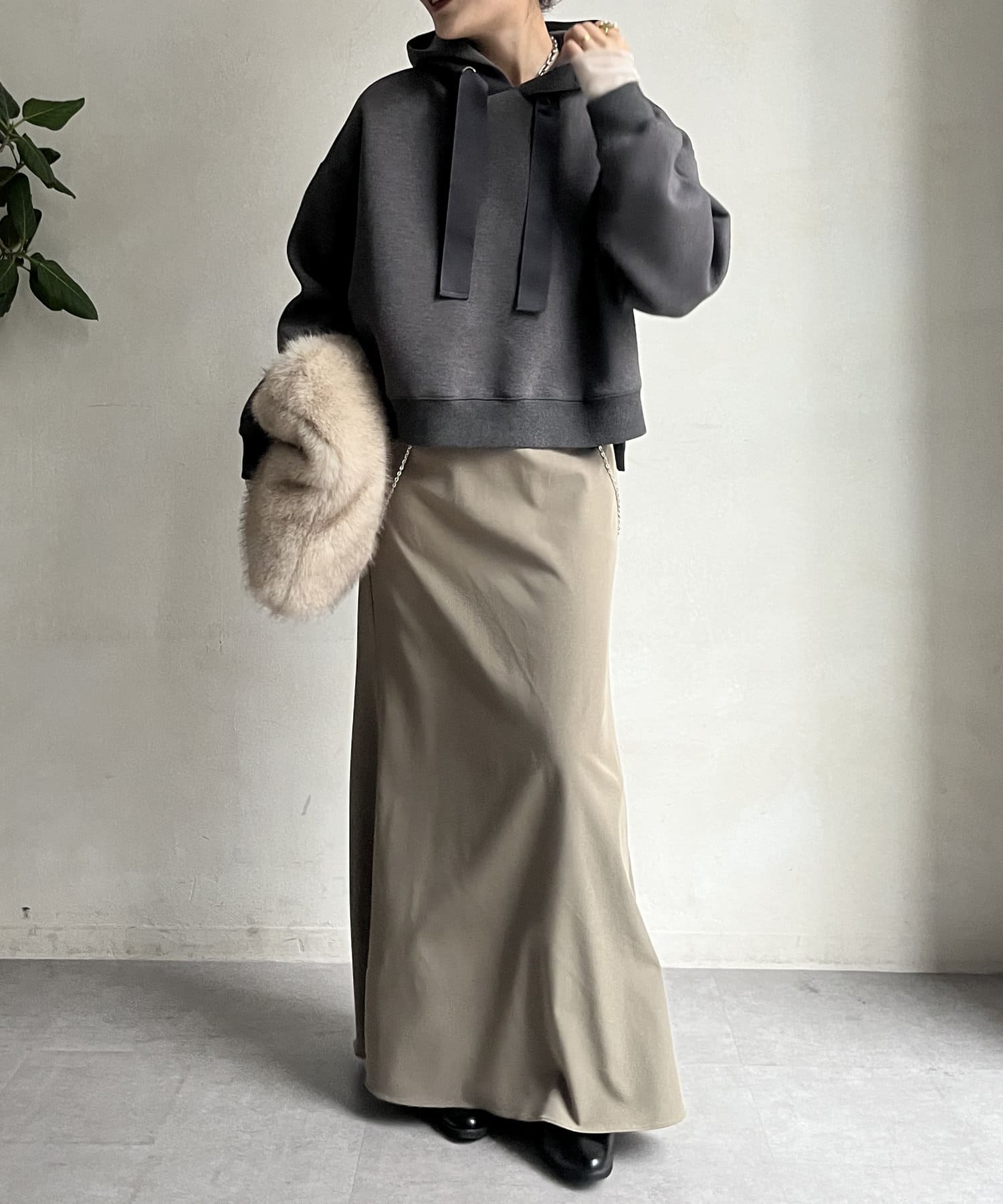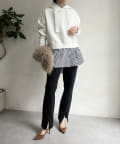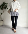 前後差のあるやや短めの丈になっているので、スカートやワイドパンツとの相性抜群!