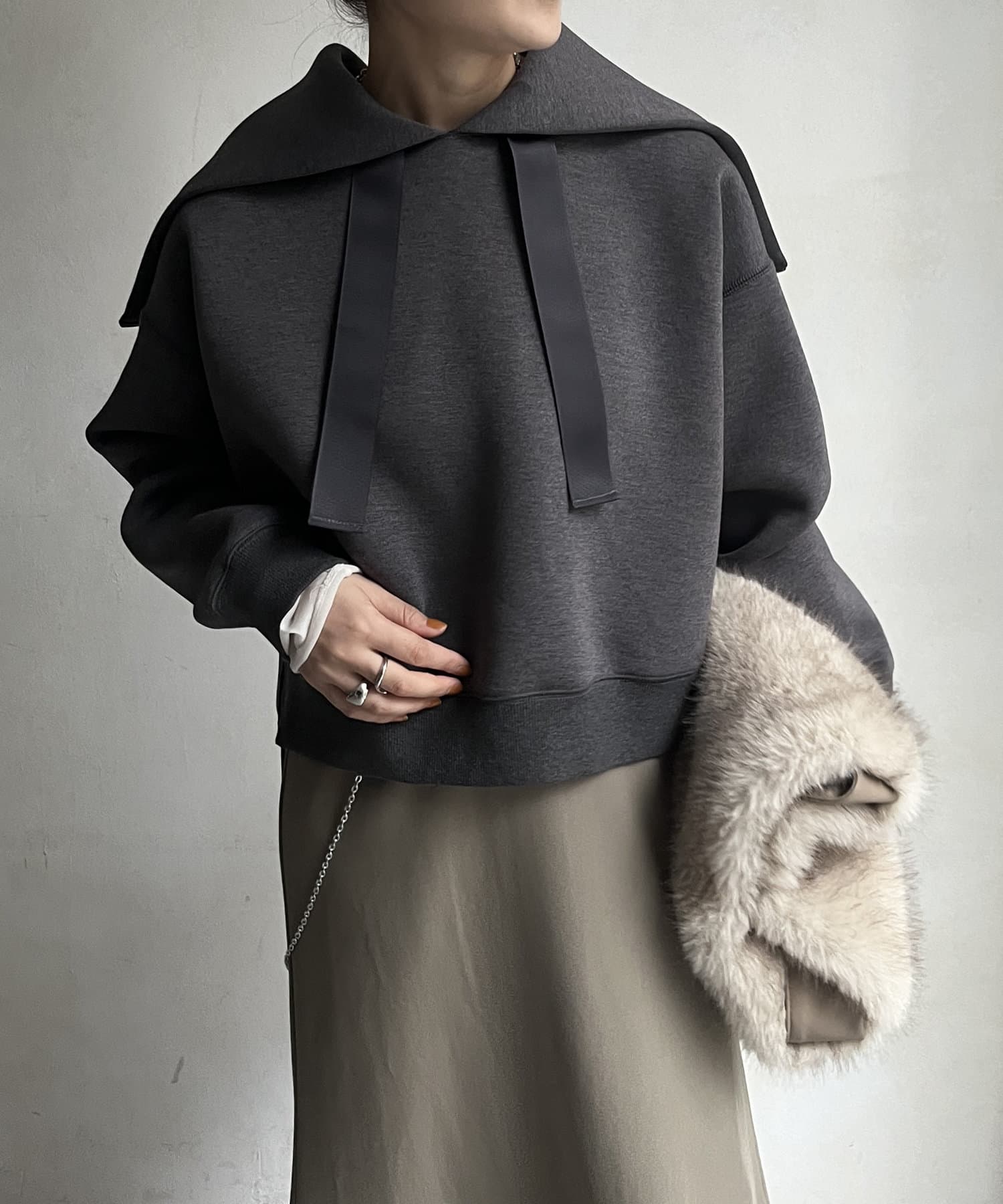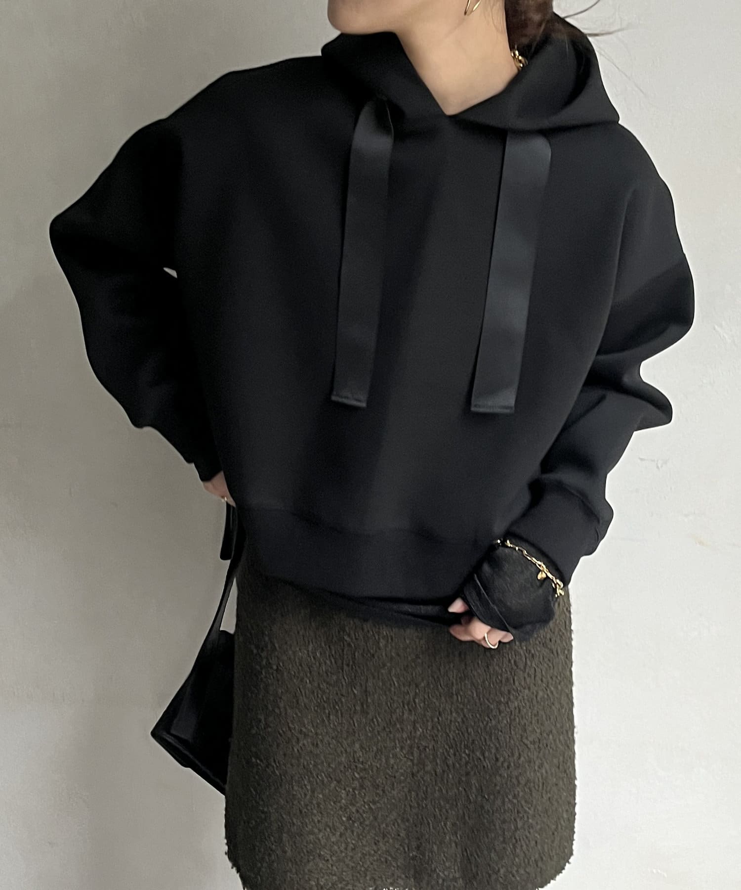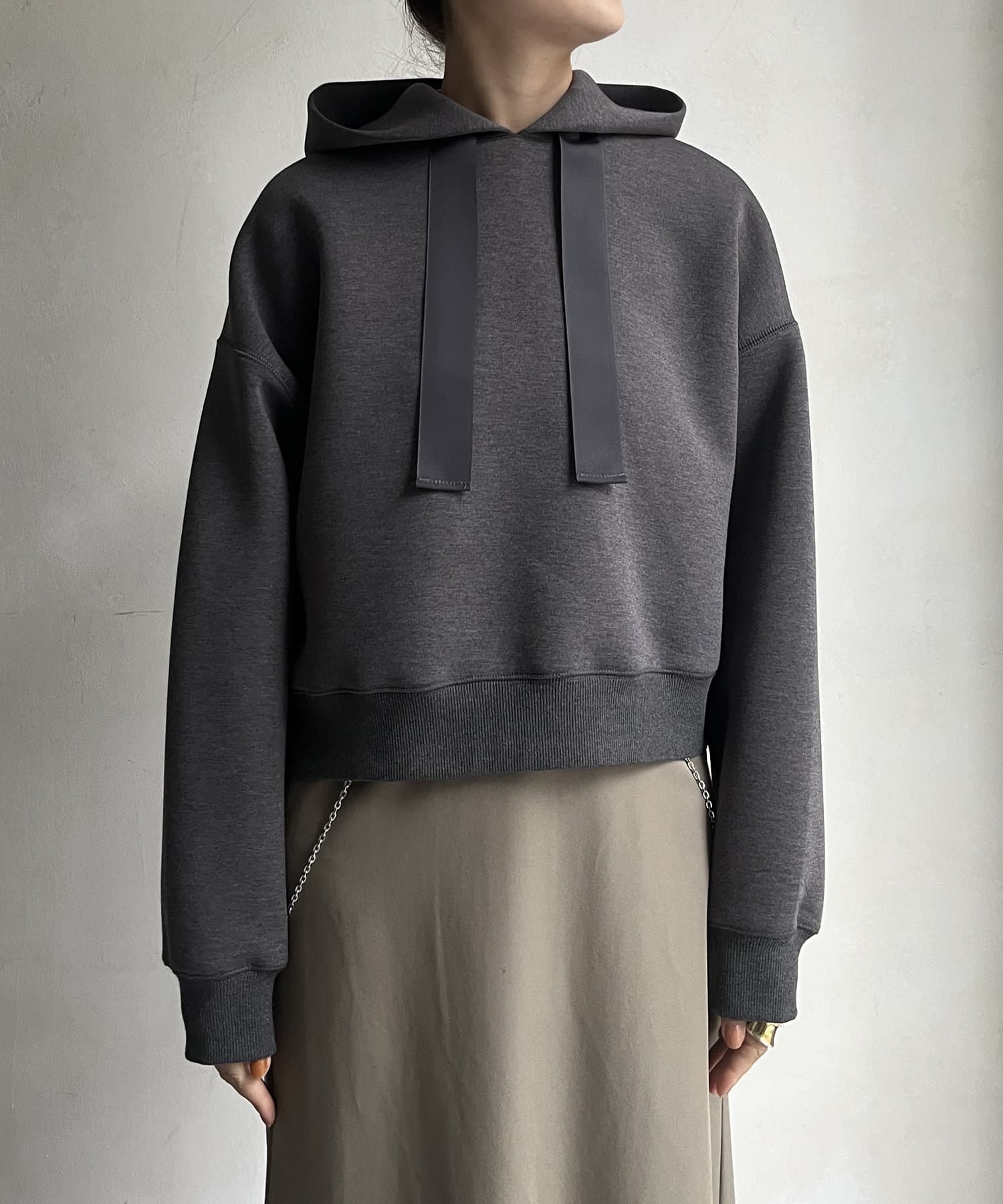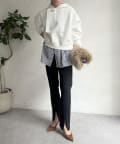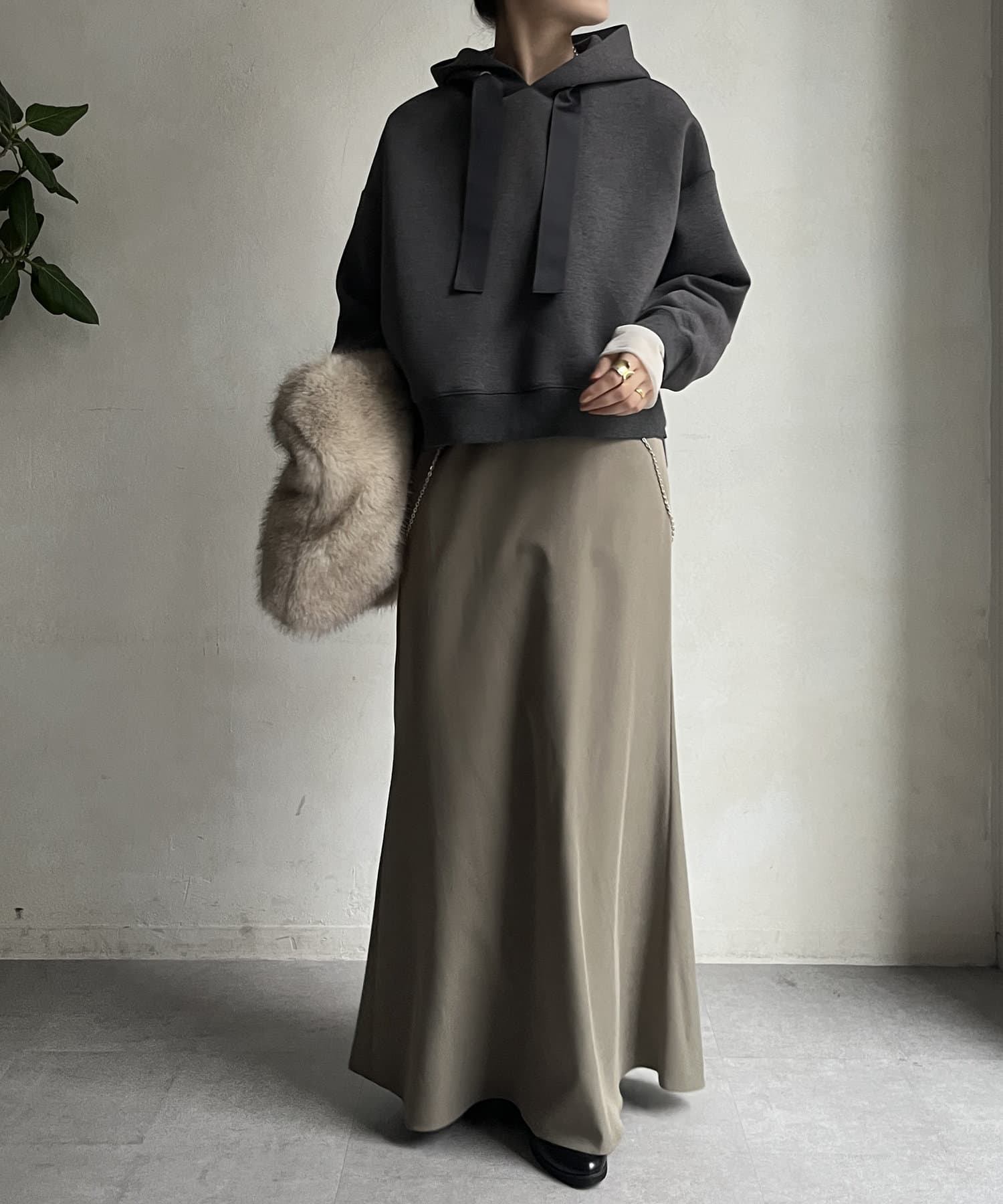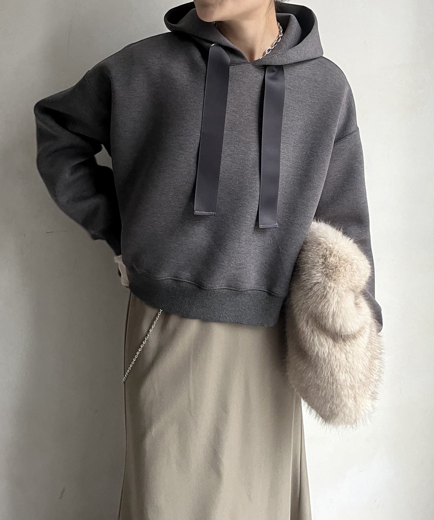 前後差のあるやや短めの丈になっているので、スカートやワイドパンツとの相性抜群!