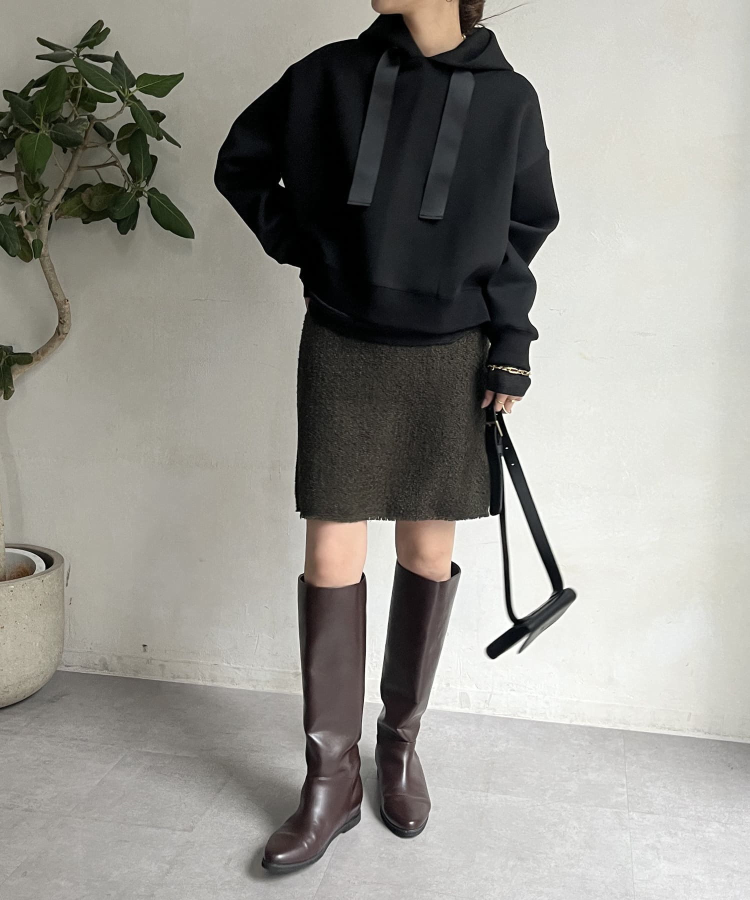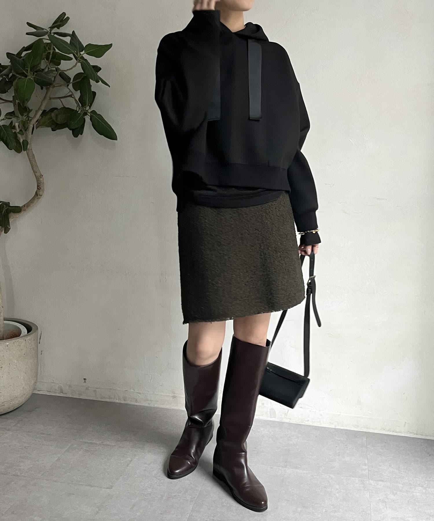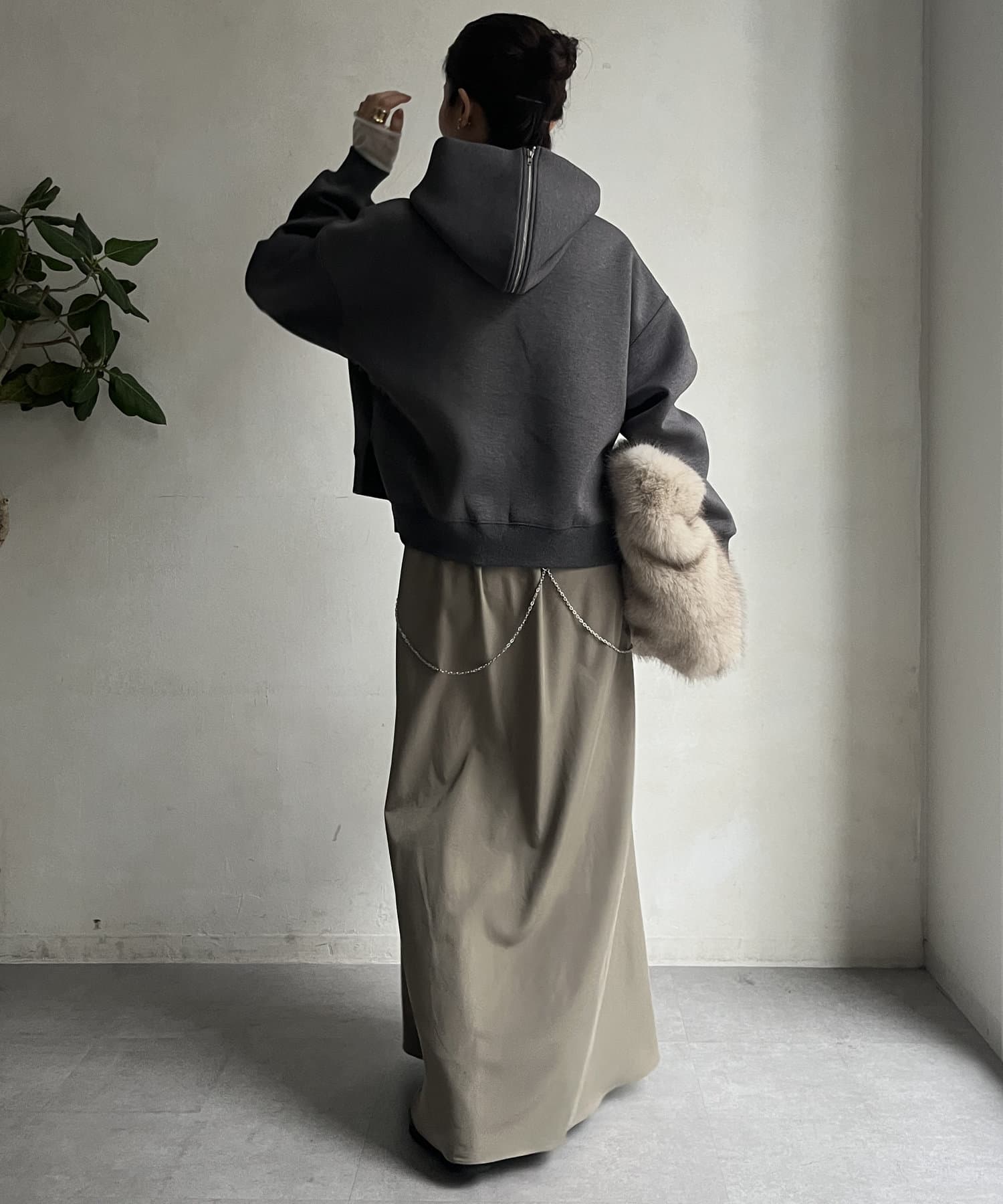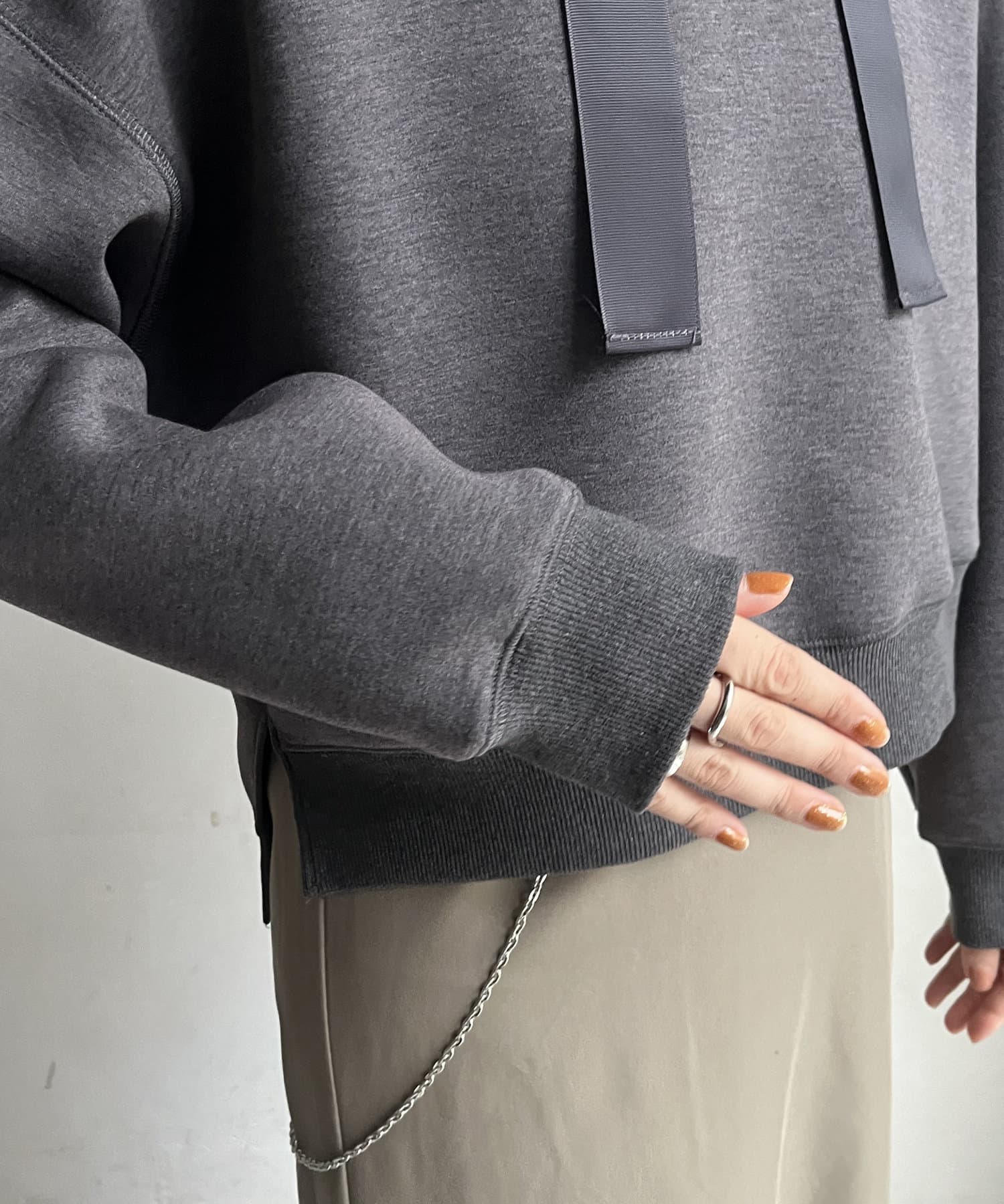 前後差のあるやや短めの丈になっているので、スカートやワイドパンツとの相性抜群!