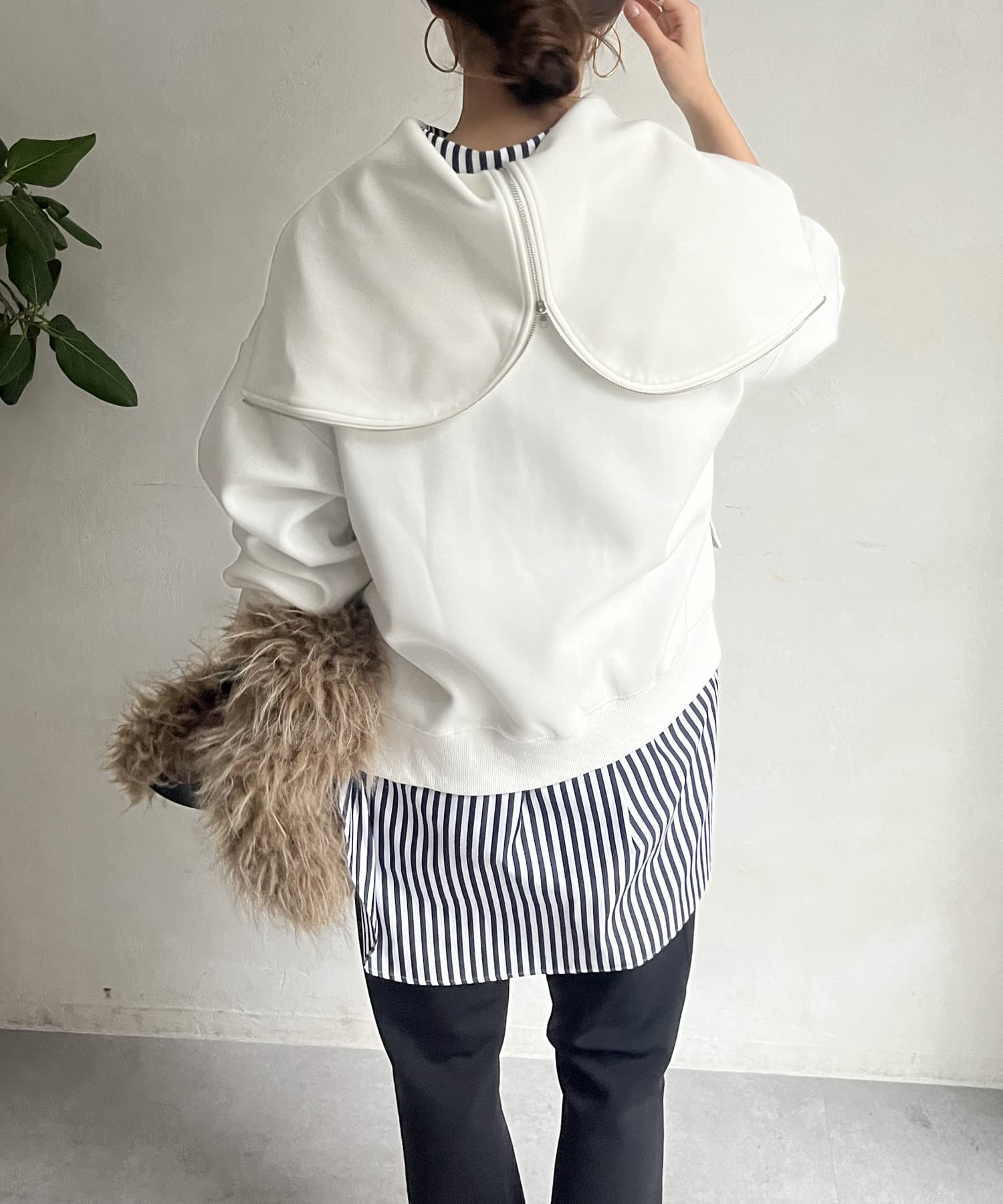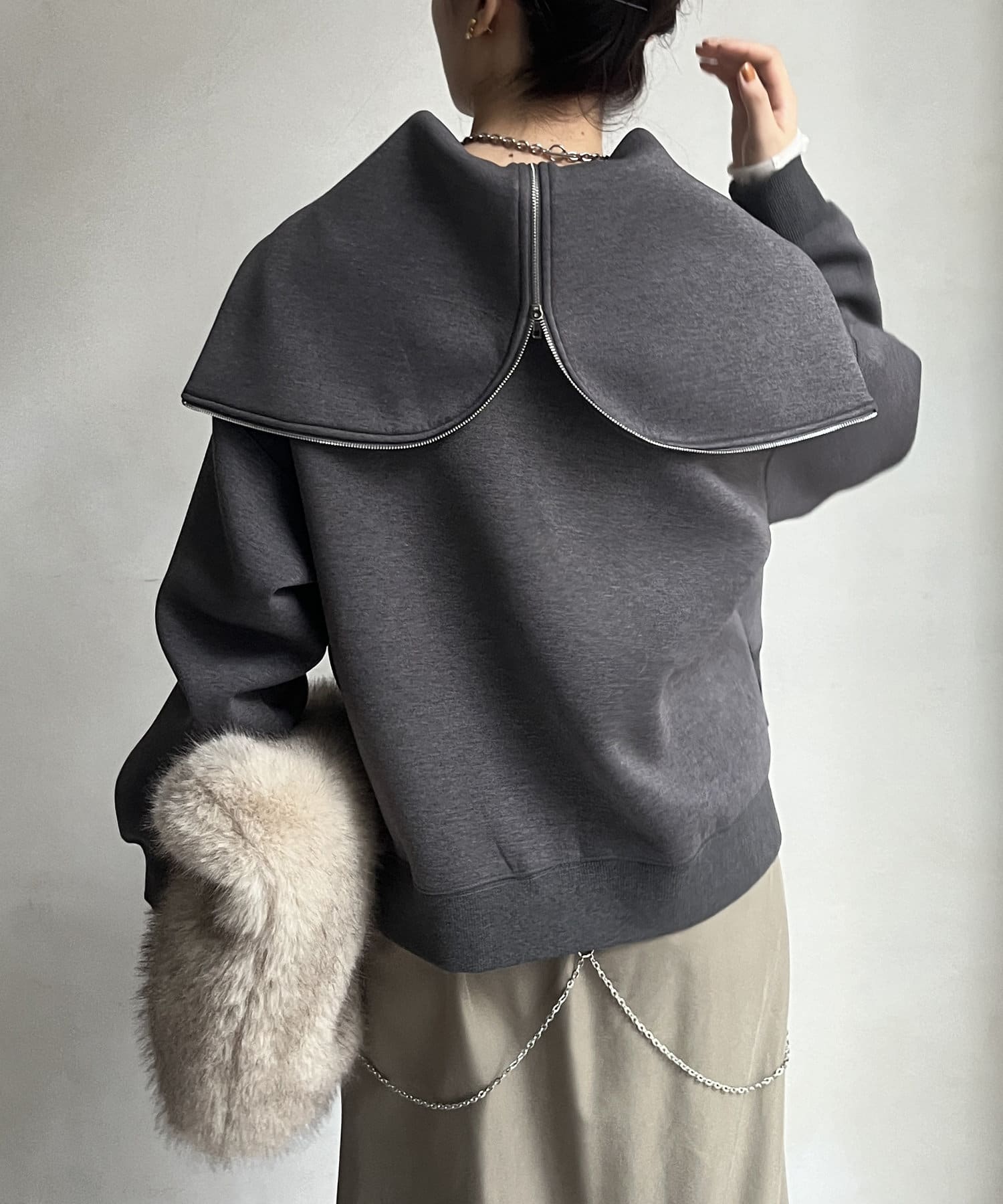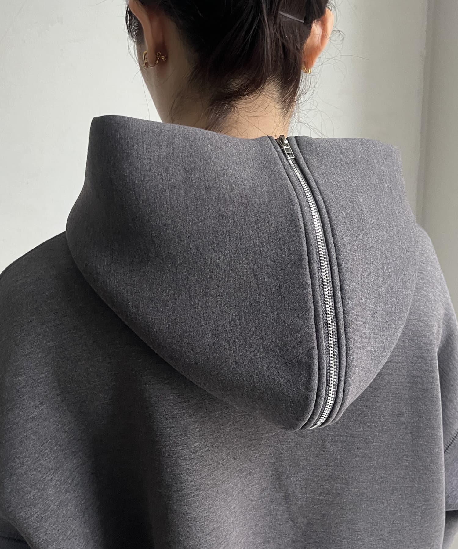 フードのジップを開くと襟のようなかたちになるので、