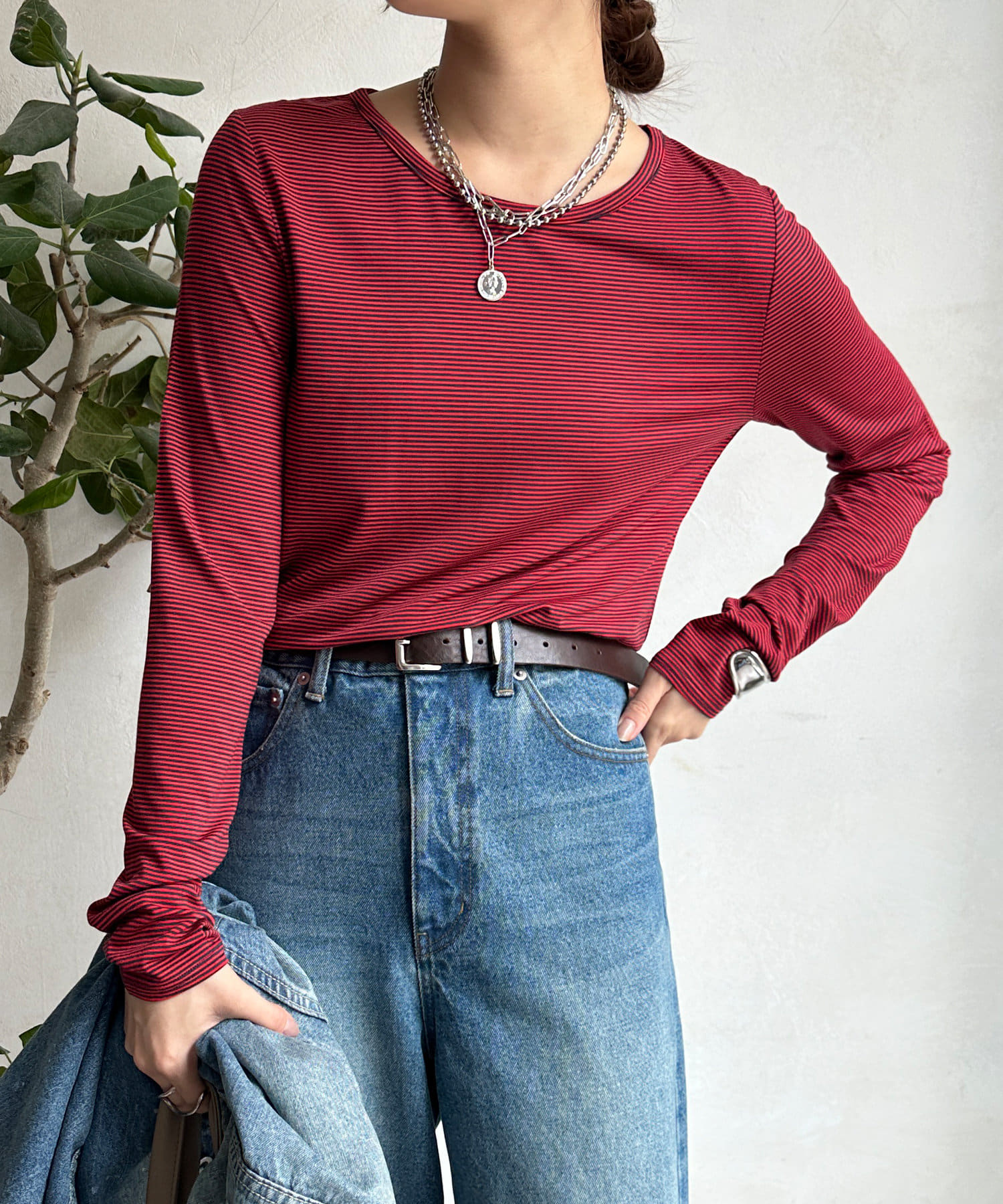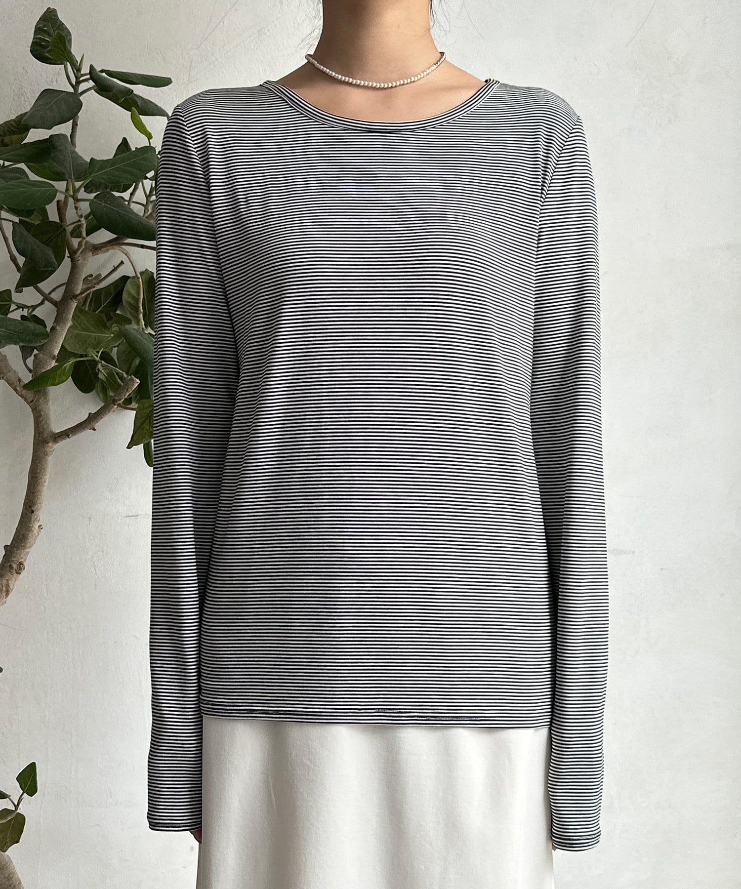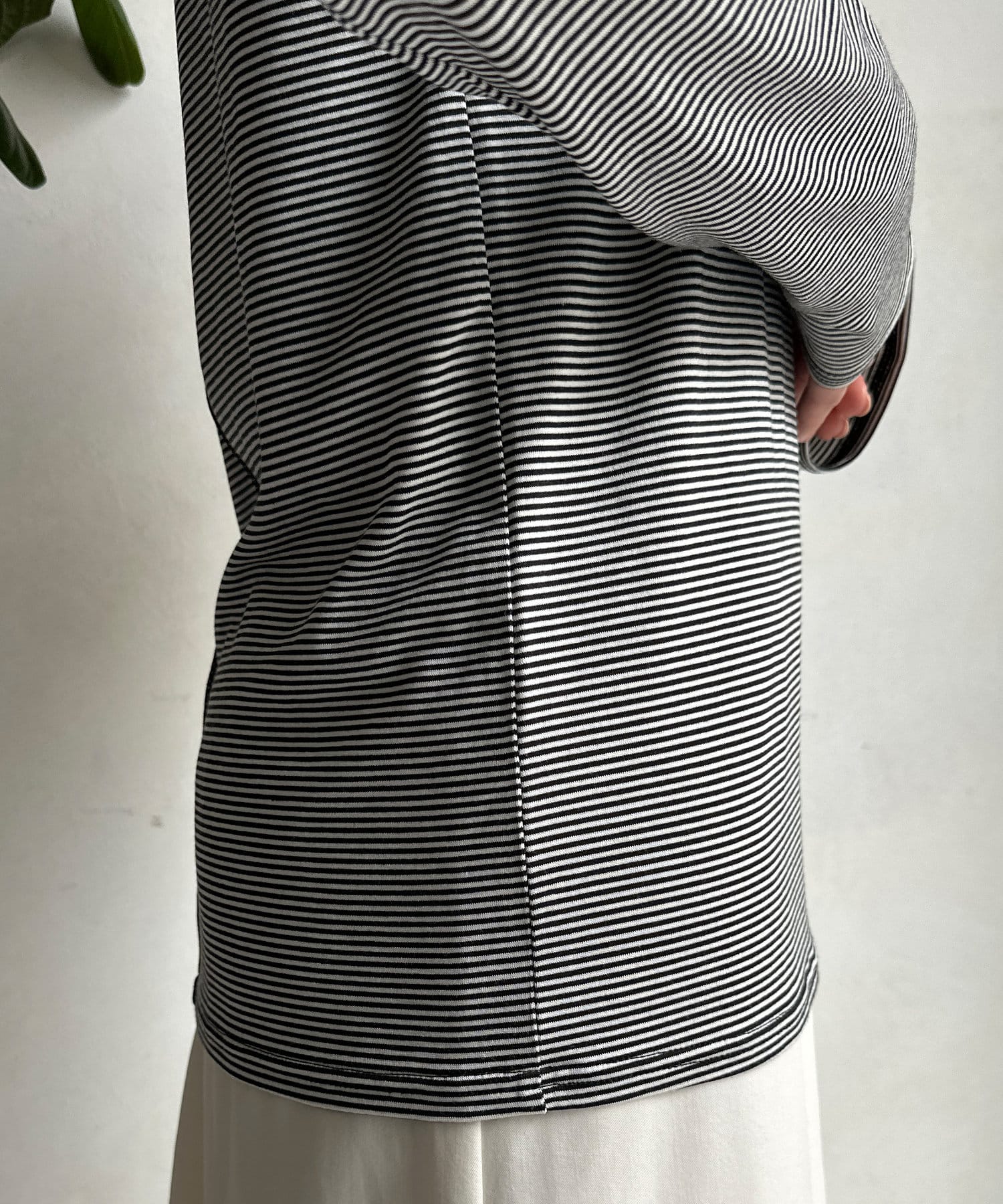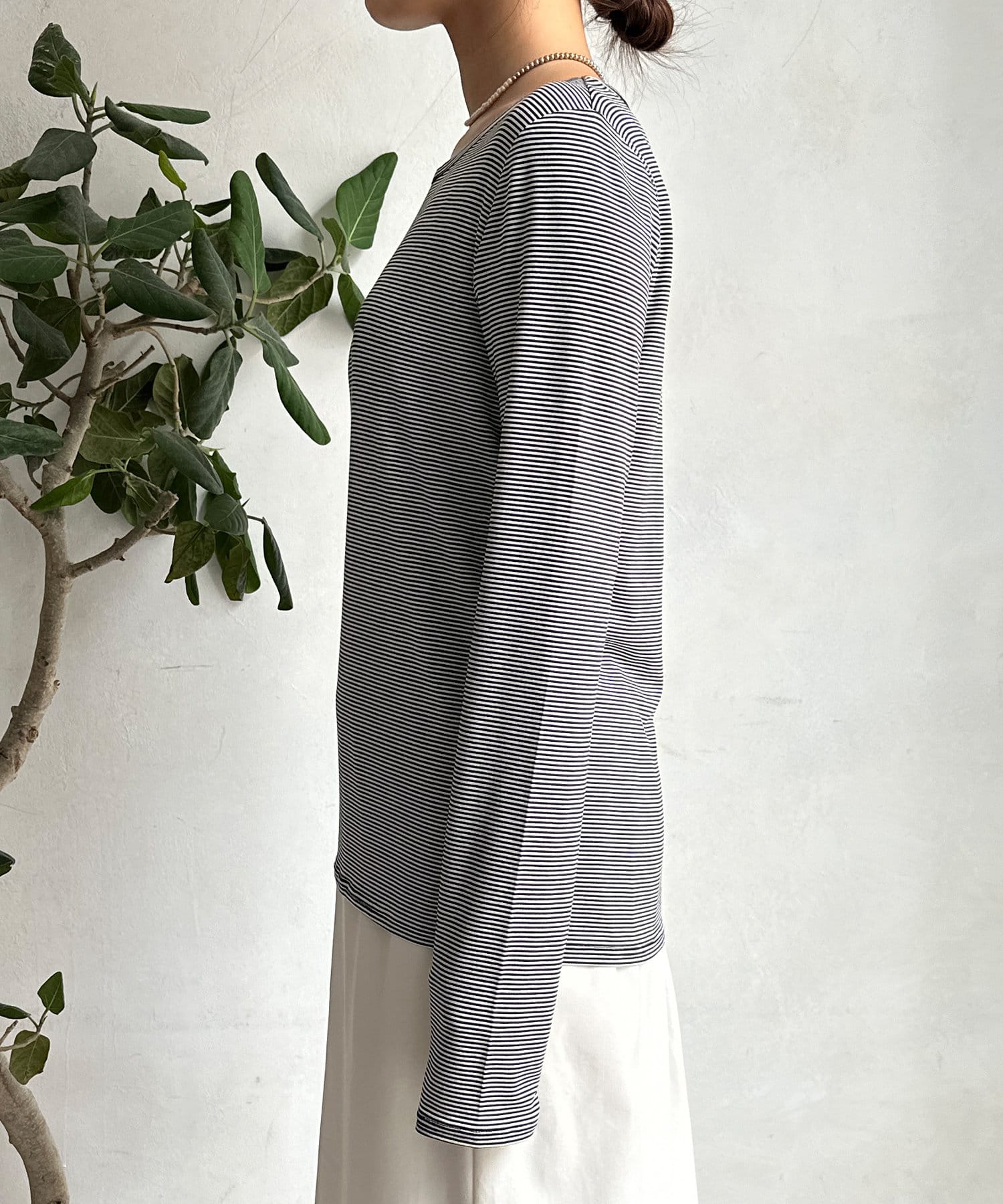 細めのボーダーが主張しすぎず馴染みやすい、1枚でもレイヤードでも着回しが楽しめるこだわりの詰まったカットソー。