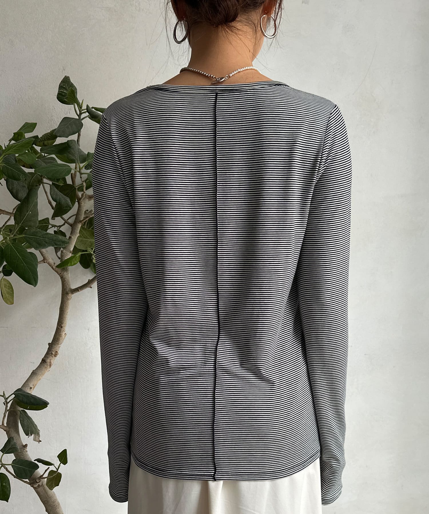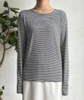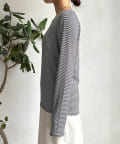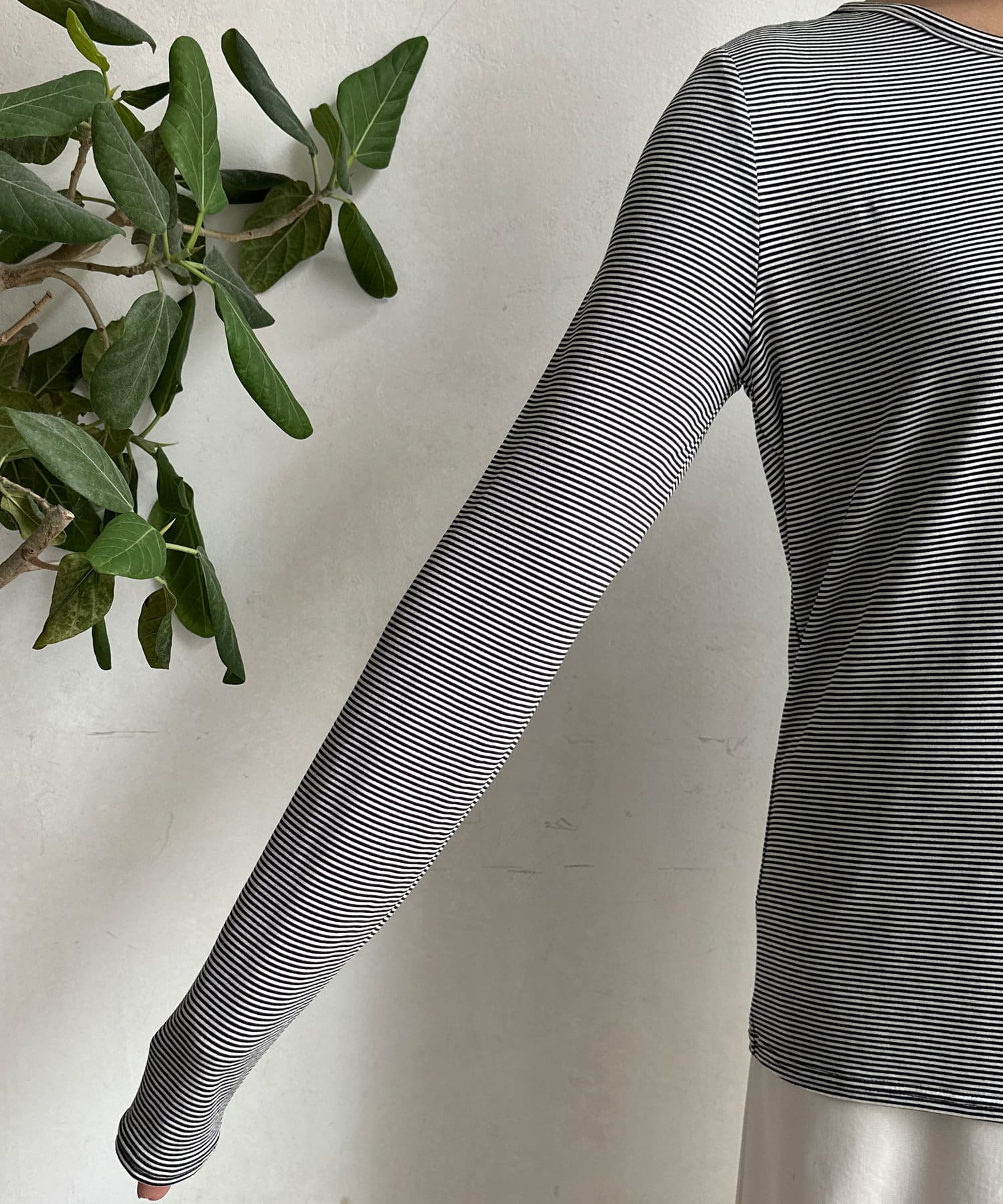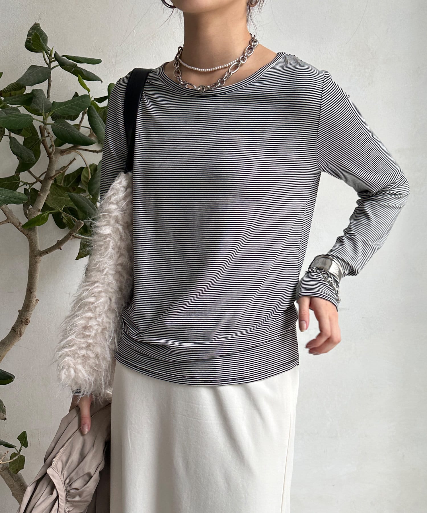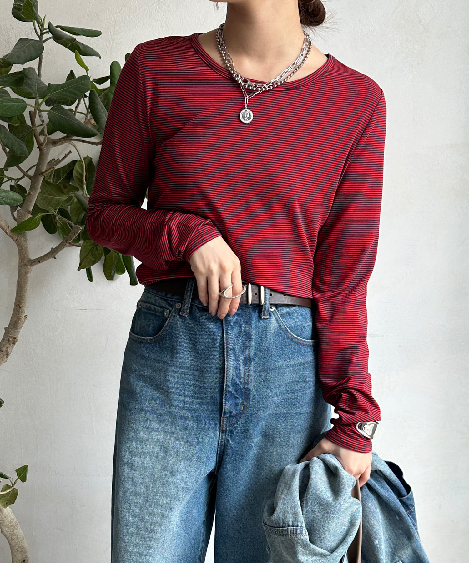 細めのボーダーが主張しすぎず馴染みやすい、1枚でもレイヤードでも着回しが楽しめるこだわりの詰まったカットソー。
