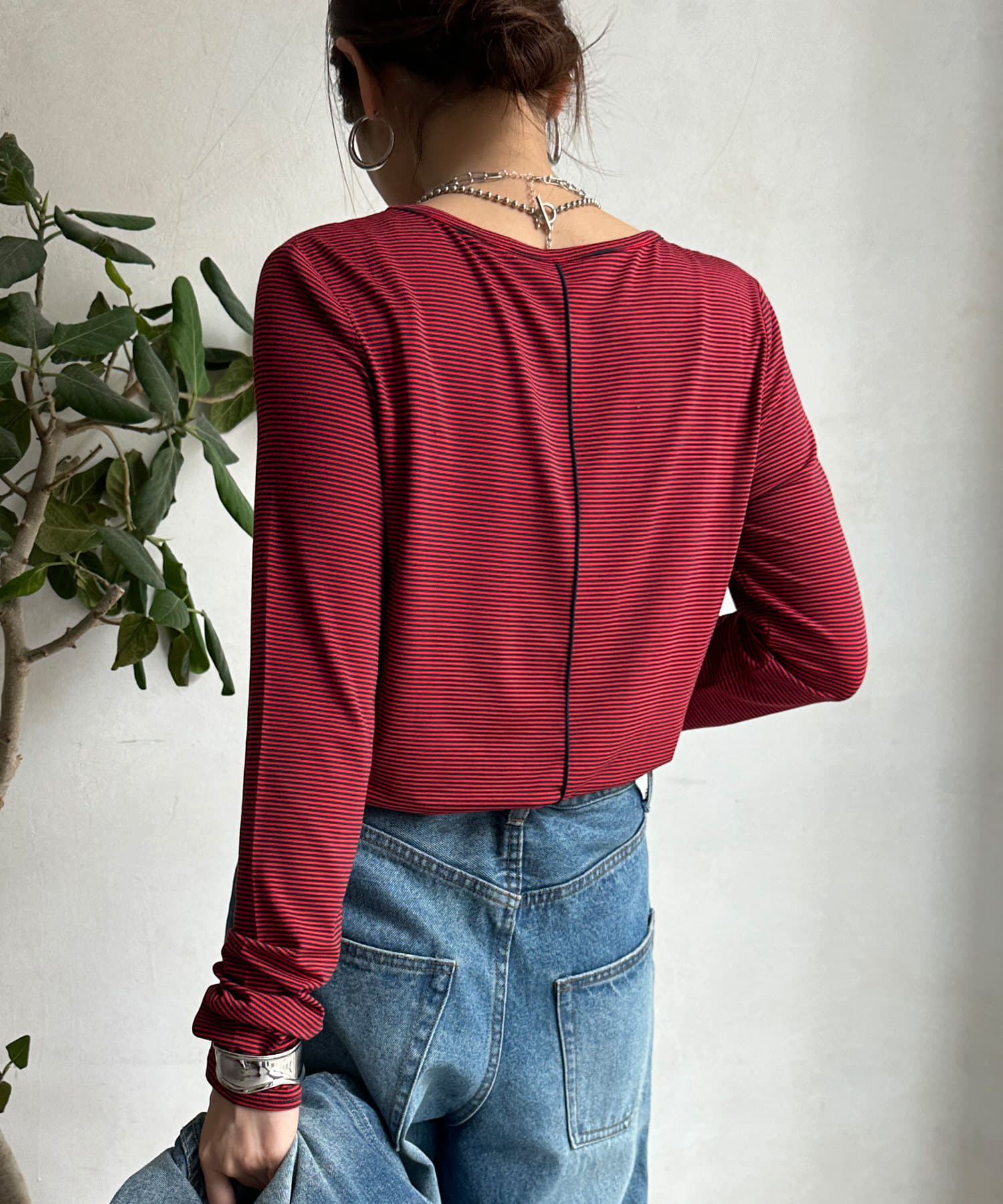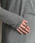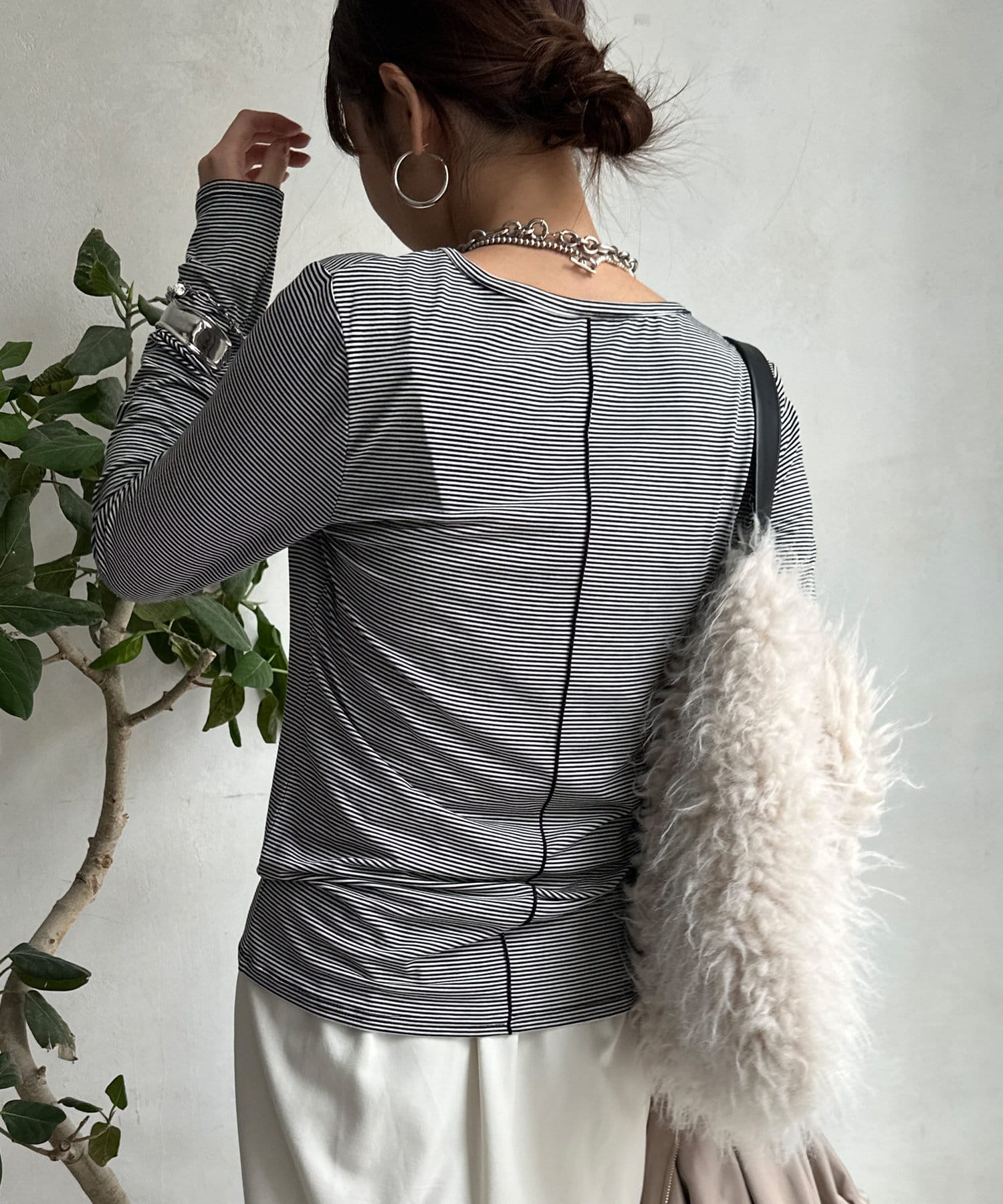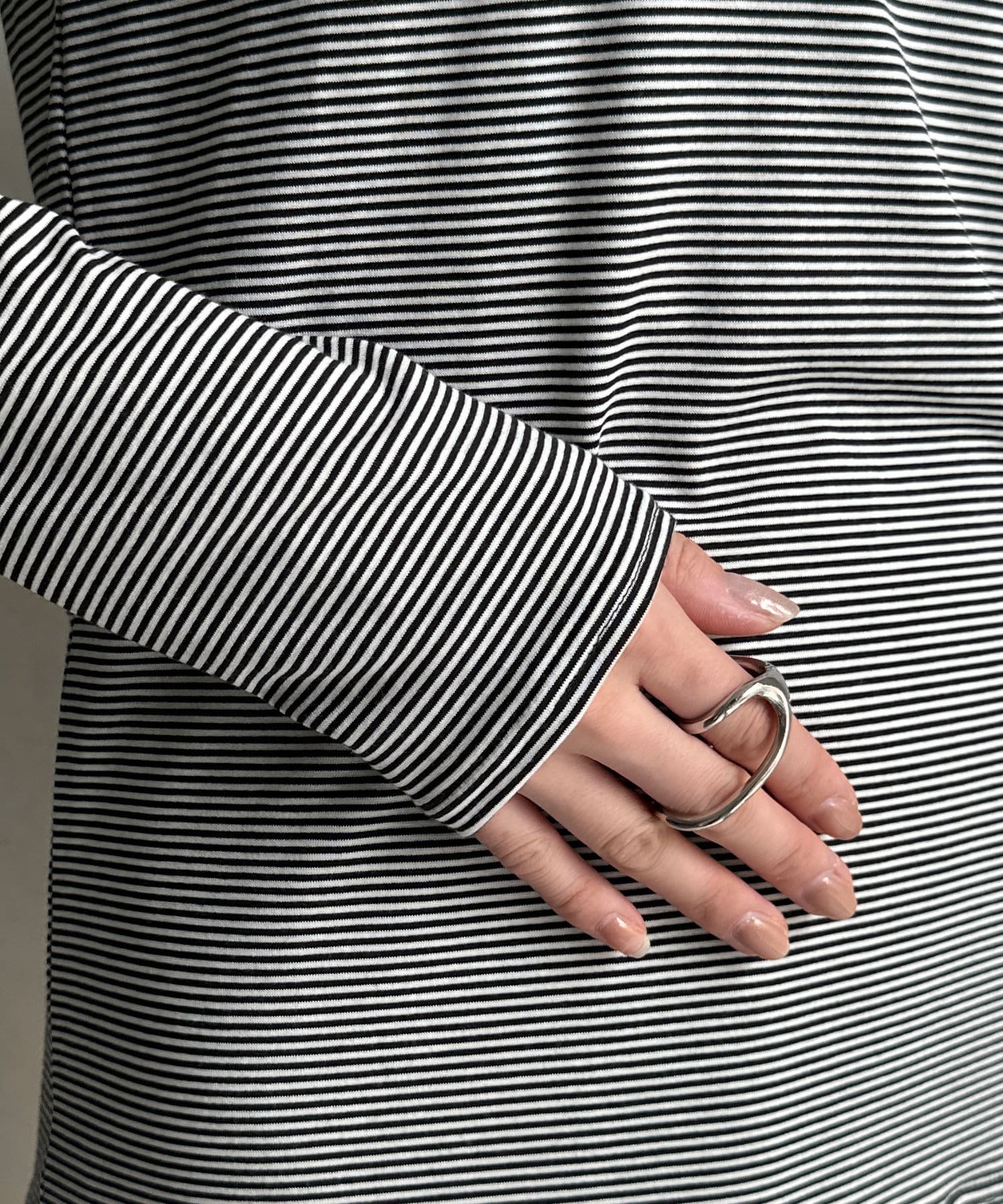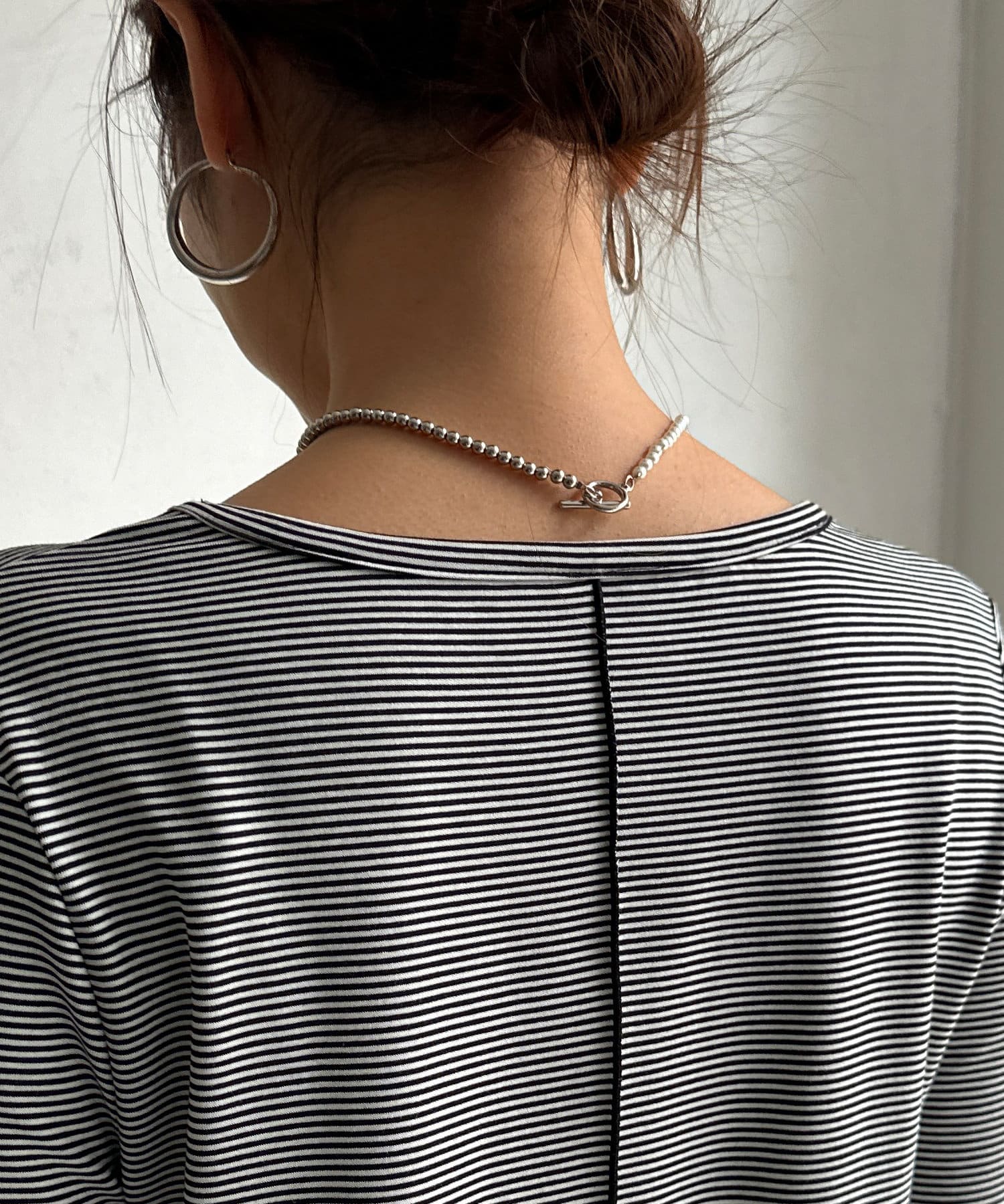 細めのボーダーが主張しすぎず馴染みやすい、1枚でもレイヤードでも着回しが楽しめるこだわりの詰まったカットソー。