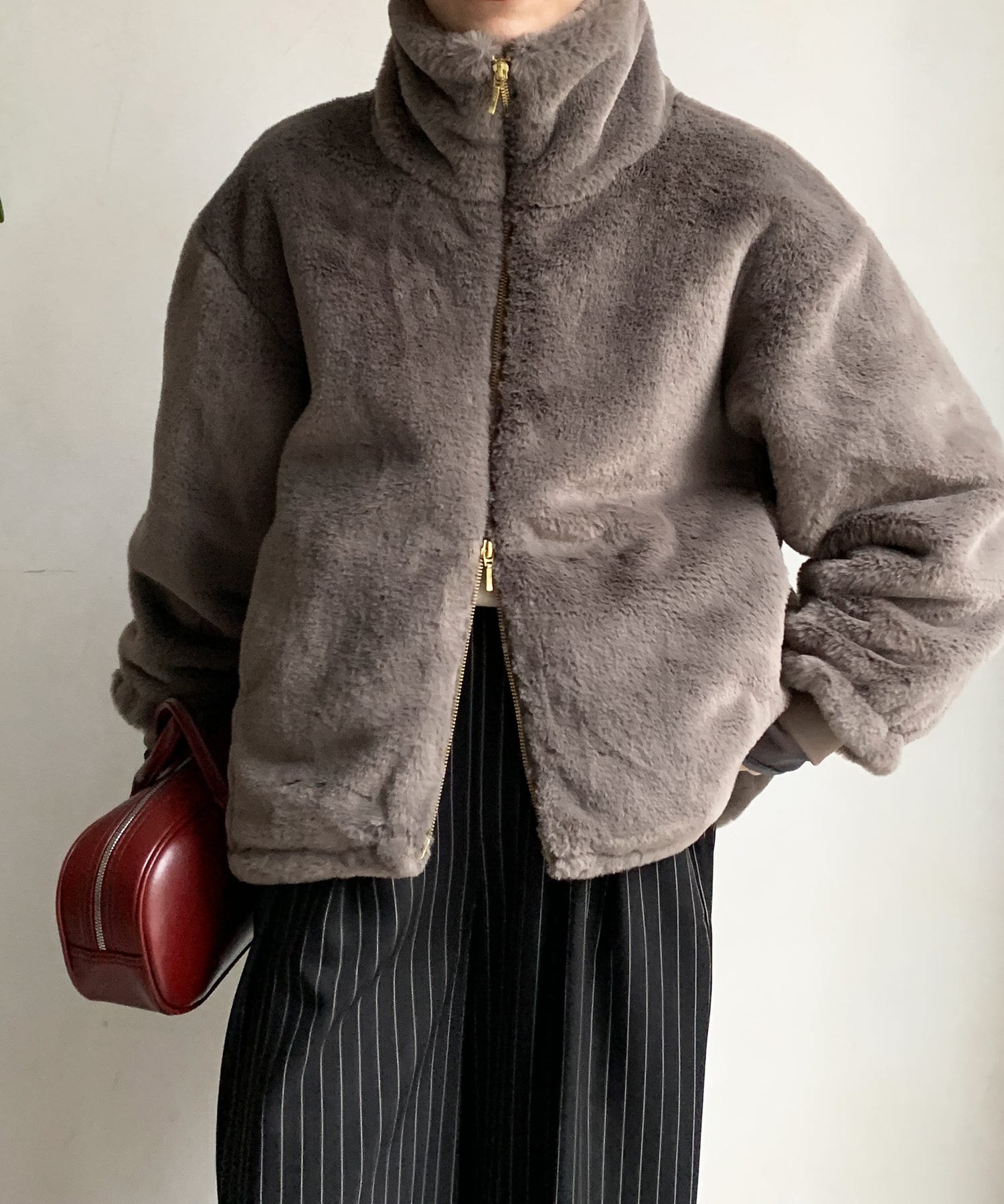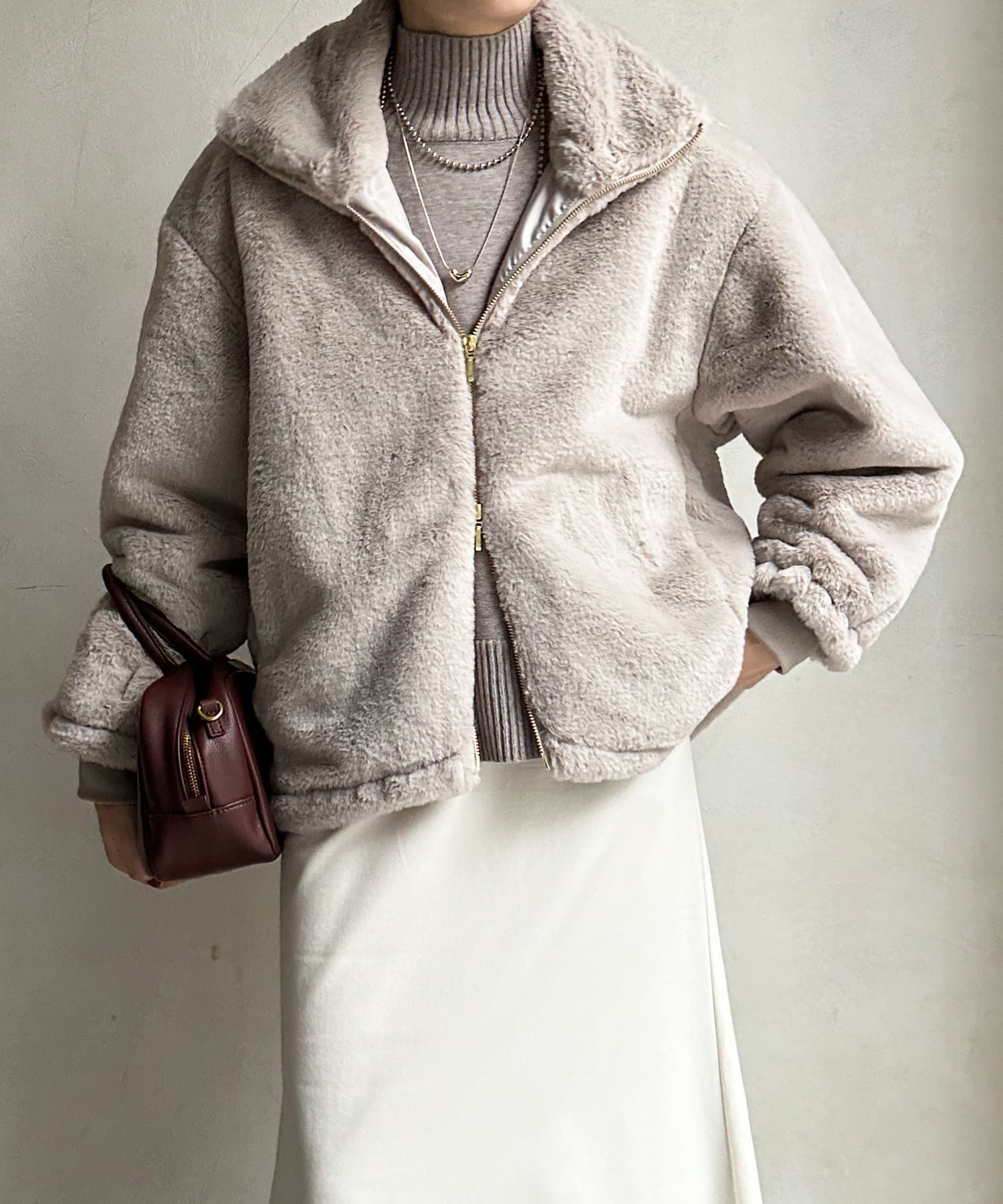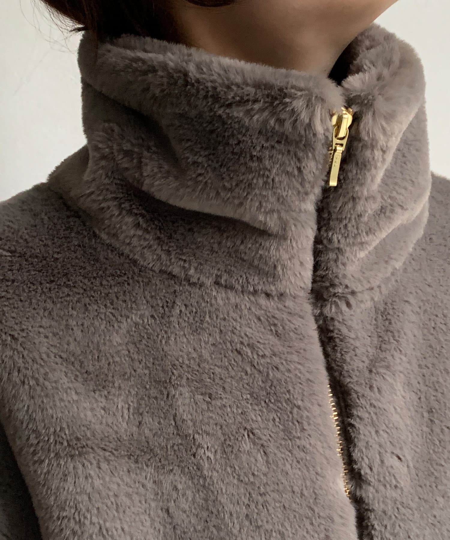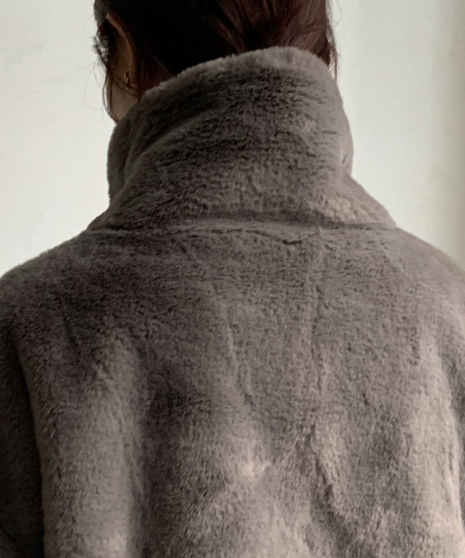 首元までしっかりと暖かいスタンドカラーのファーコート。
