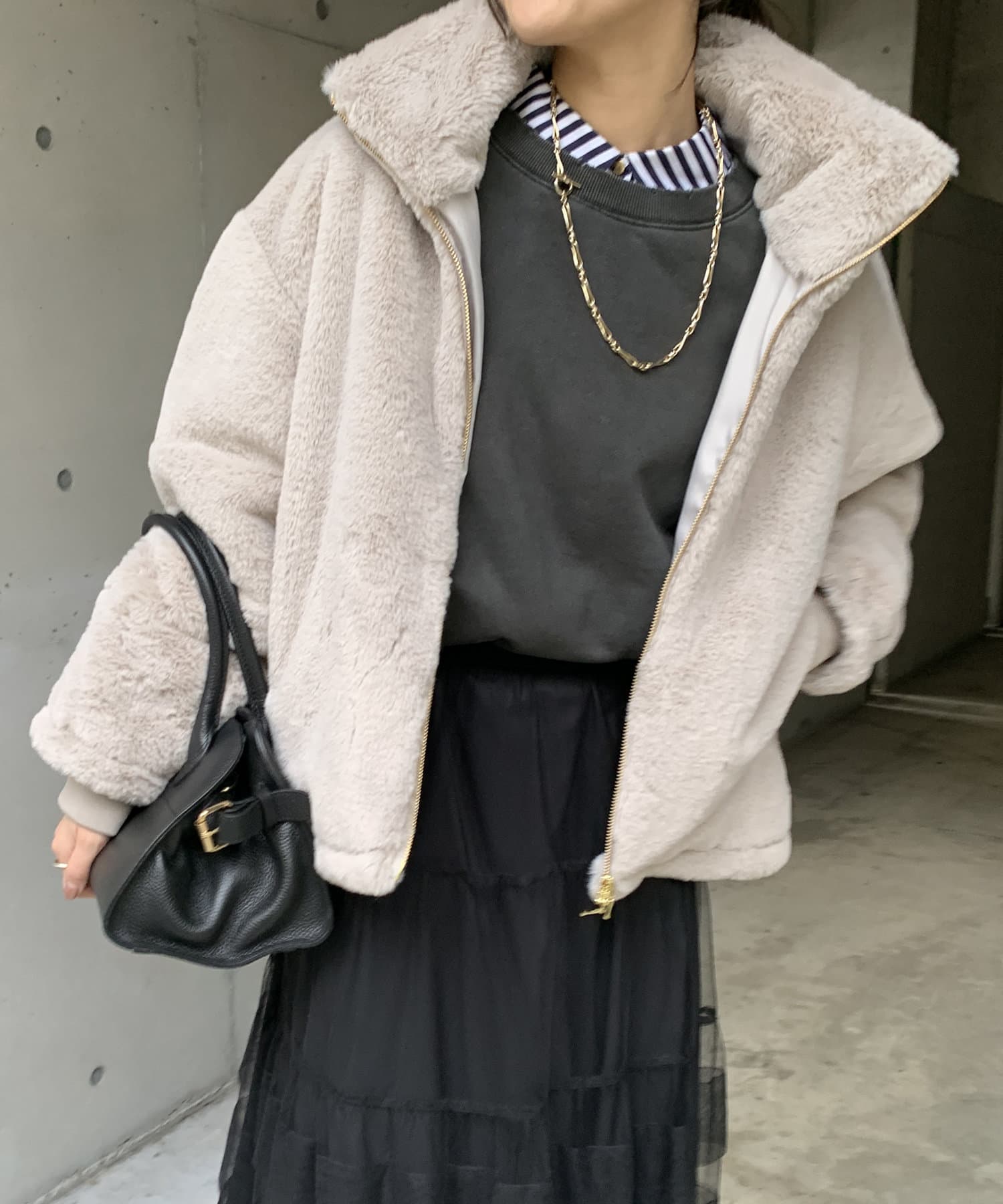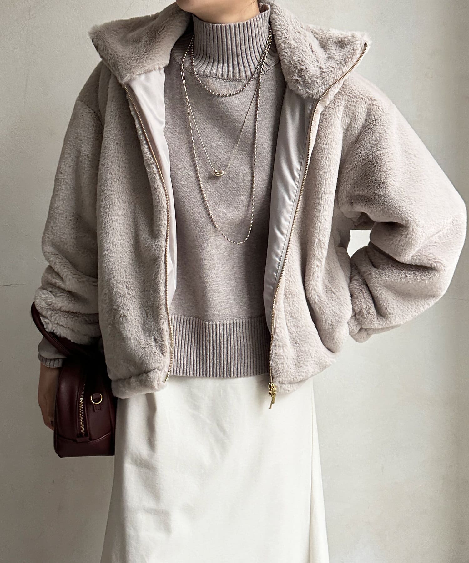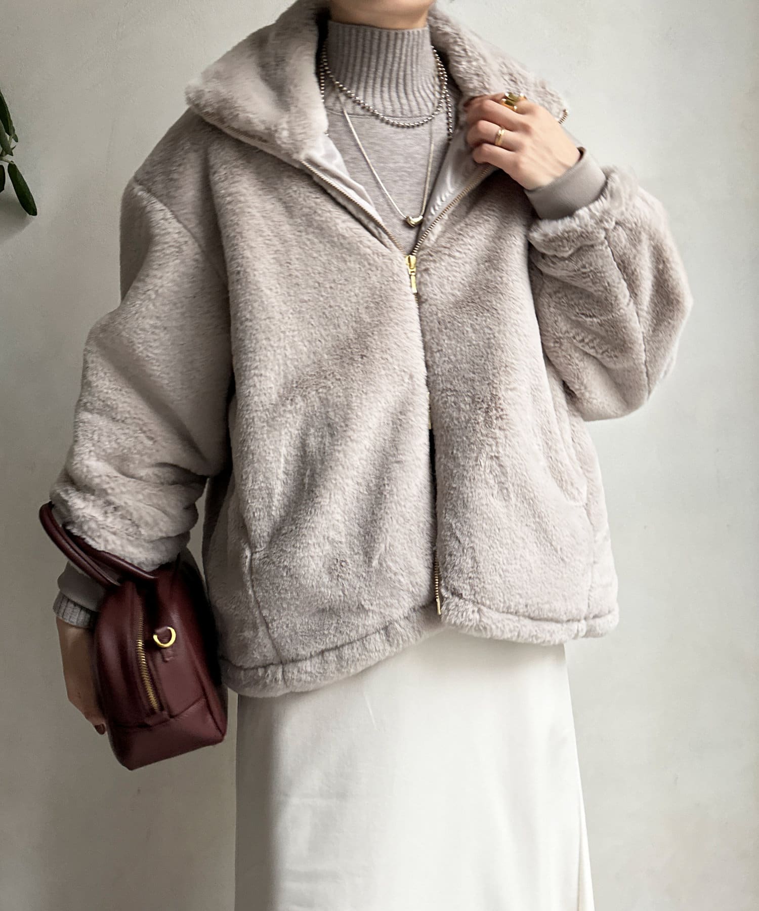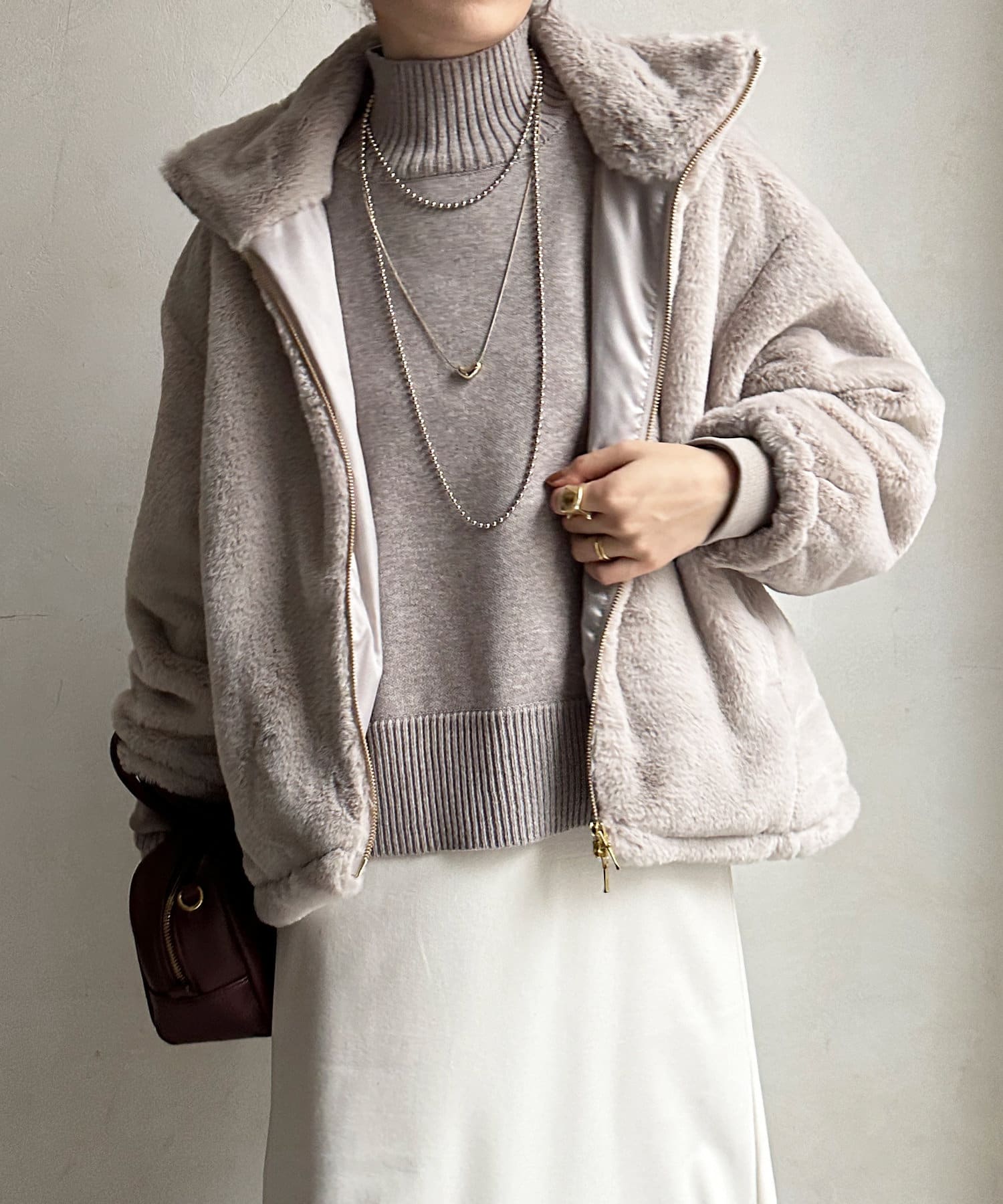 首元までしっかりと暖かいスタンドカラーのファーコート。