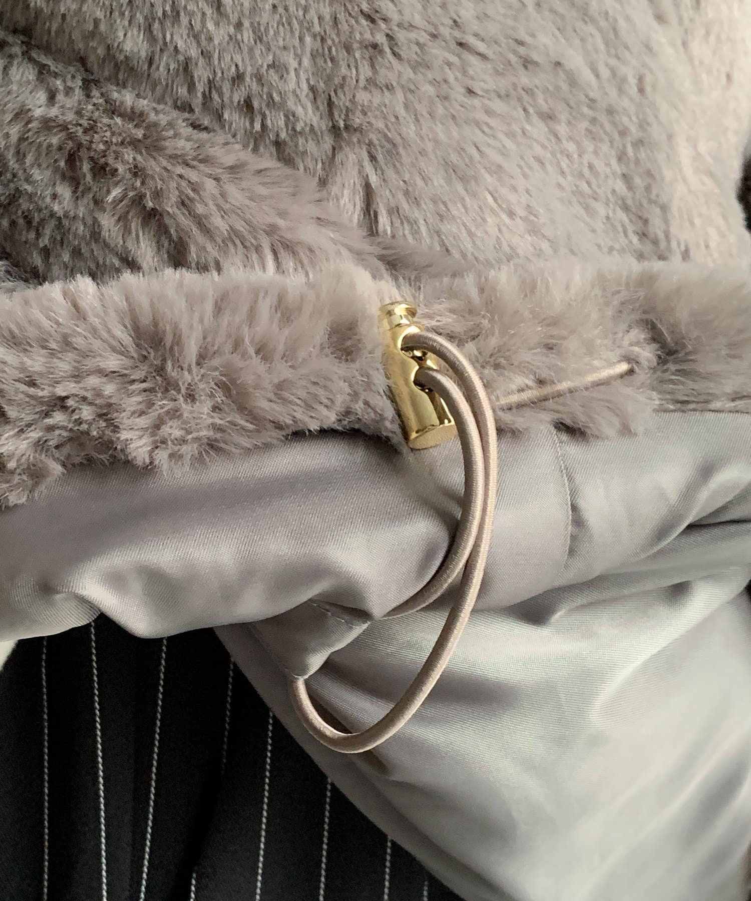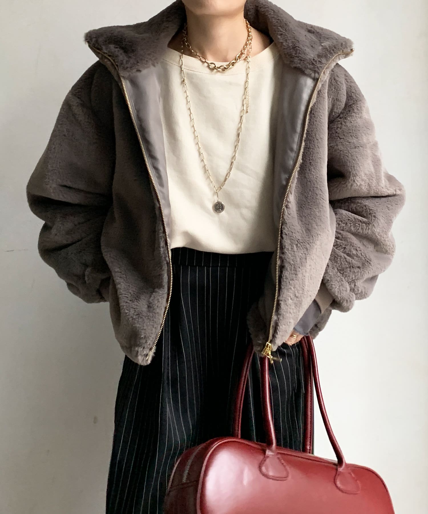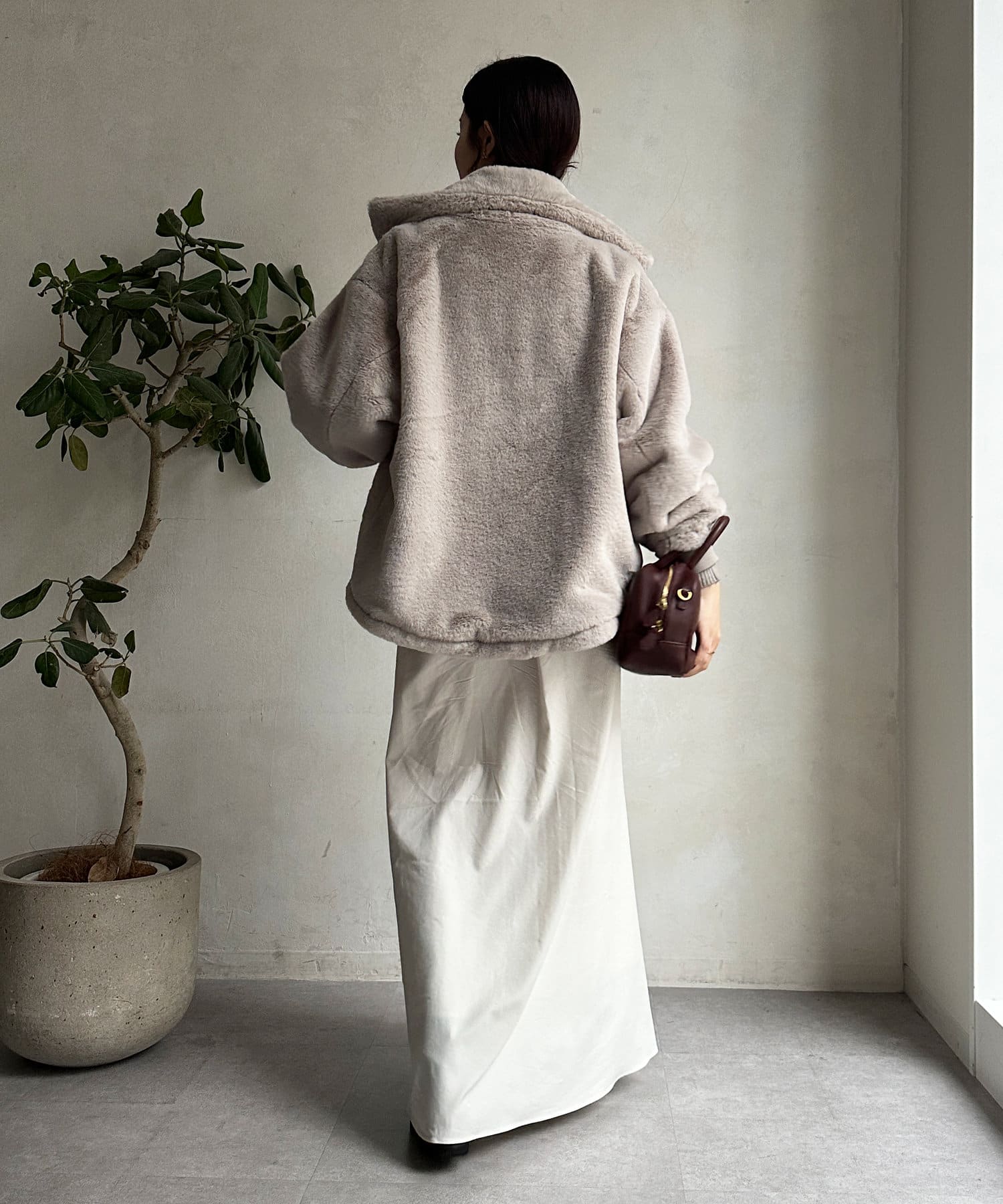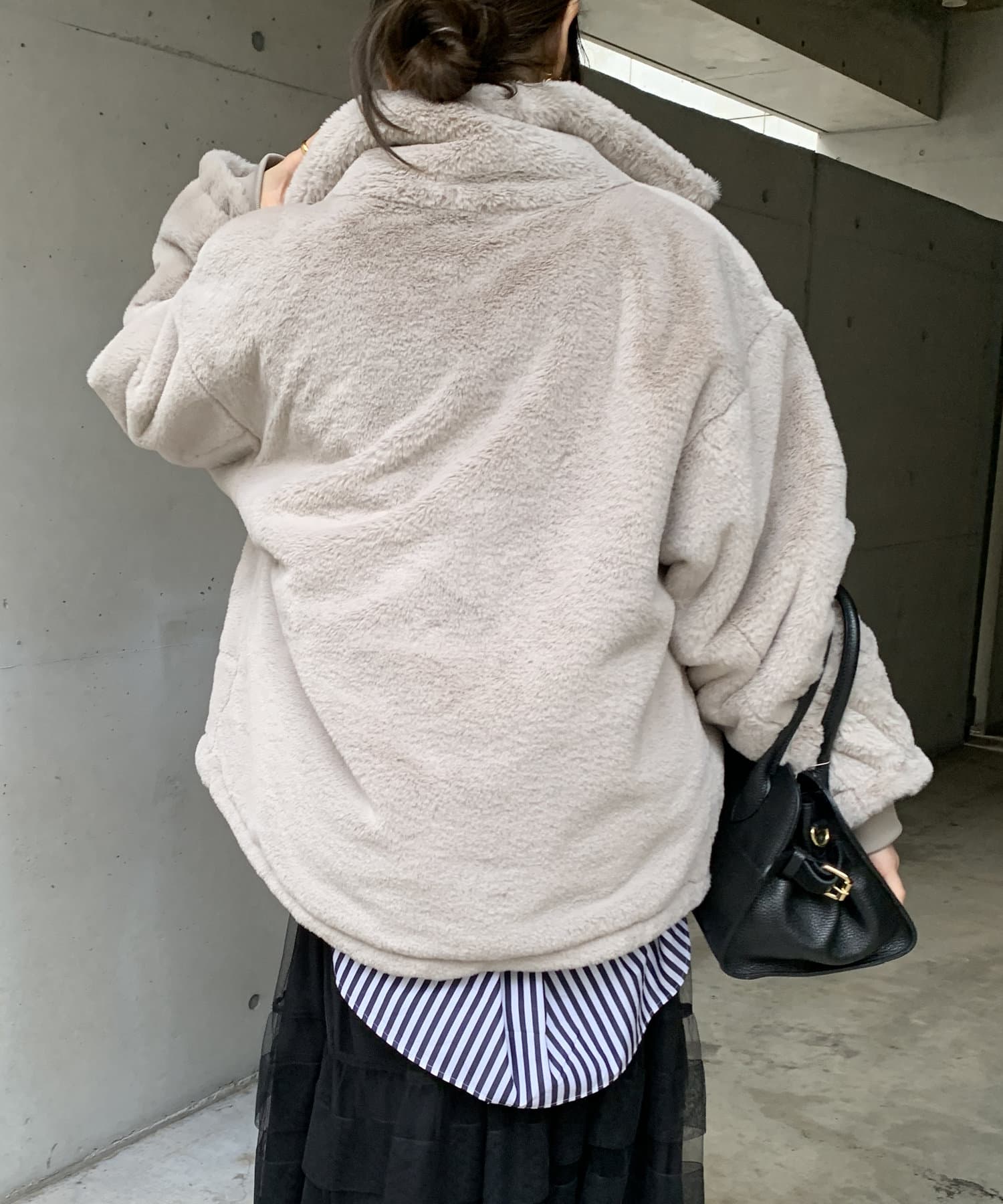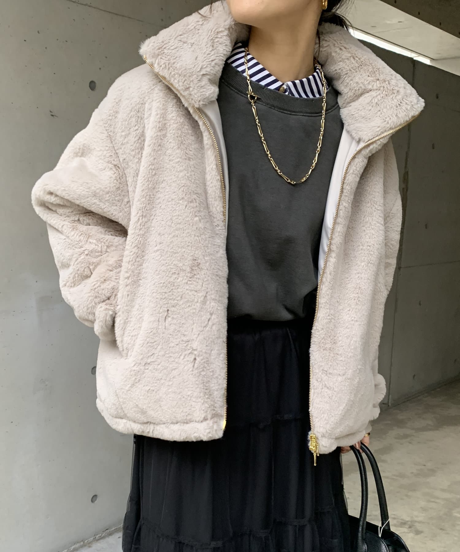 首元までしっかりと暖かいスタンドカラーのファーコート。