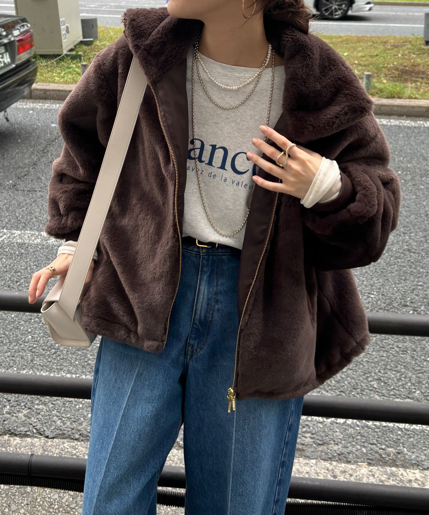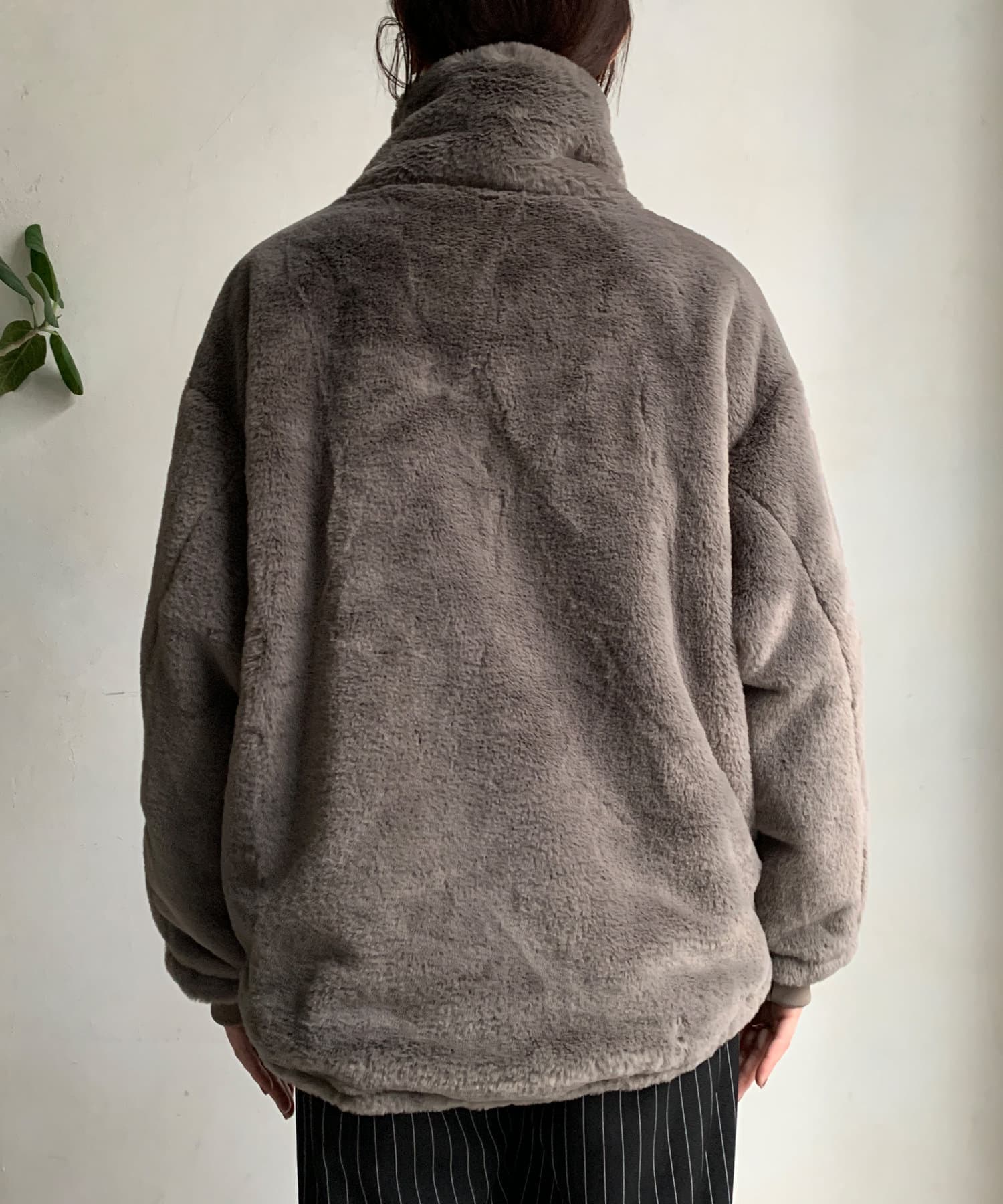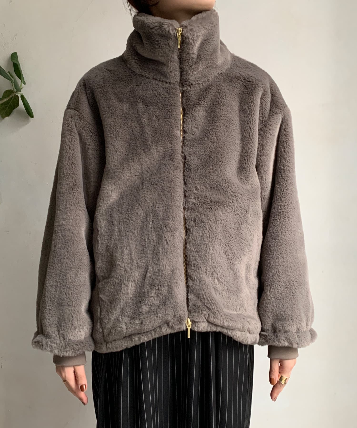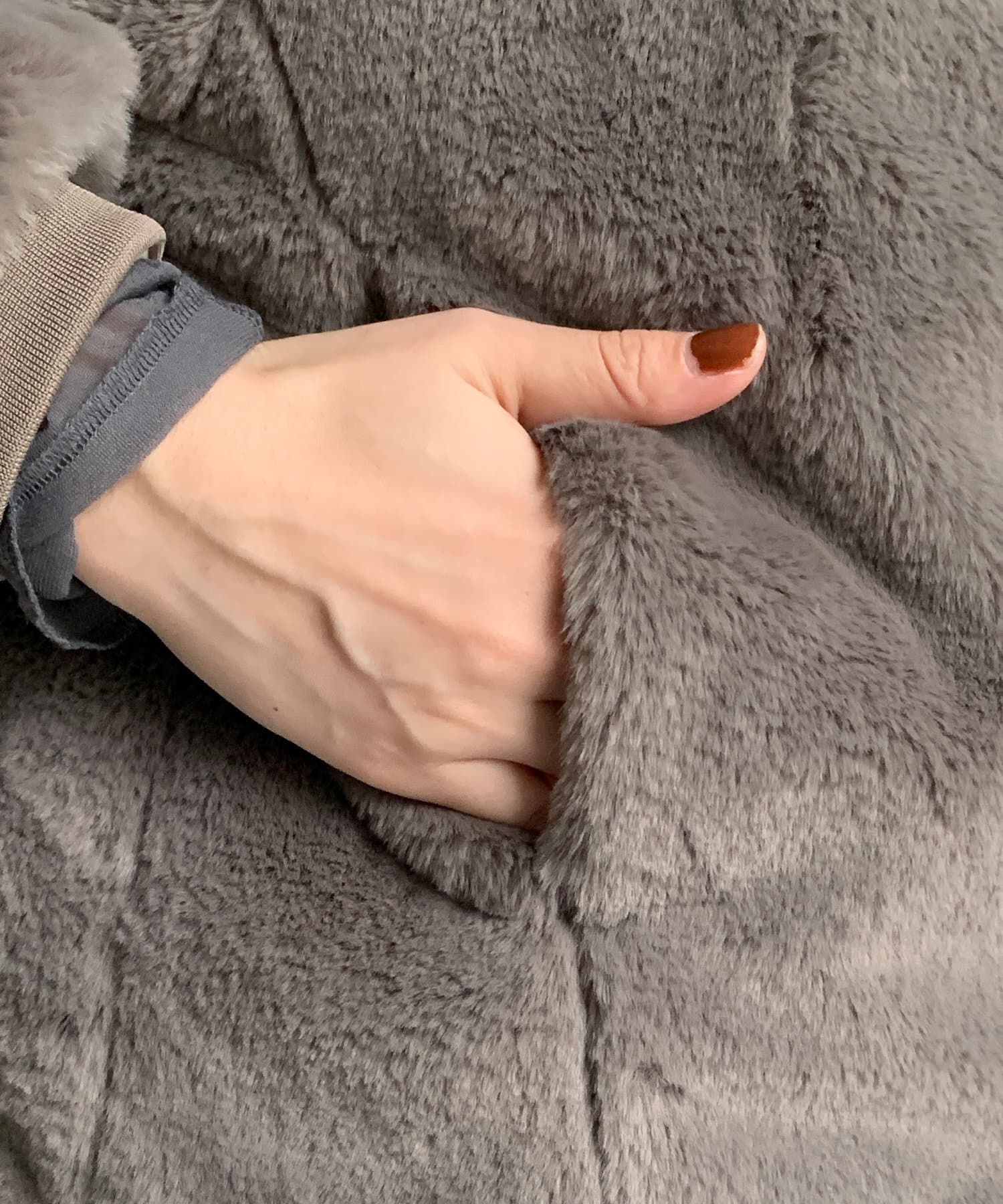 首元までしっかりと暖かいスタンドカラーのファーコート。