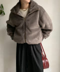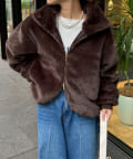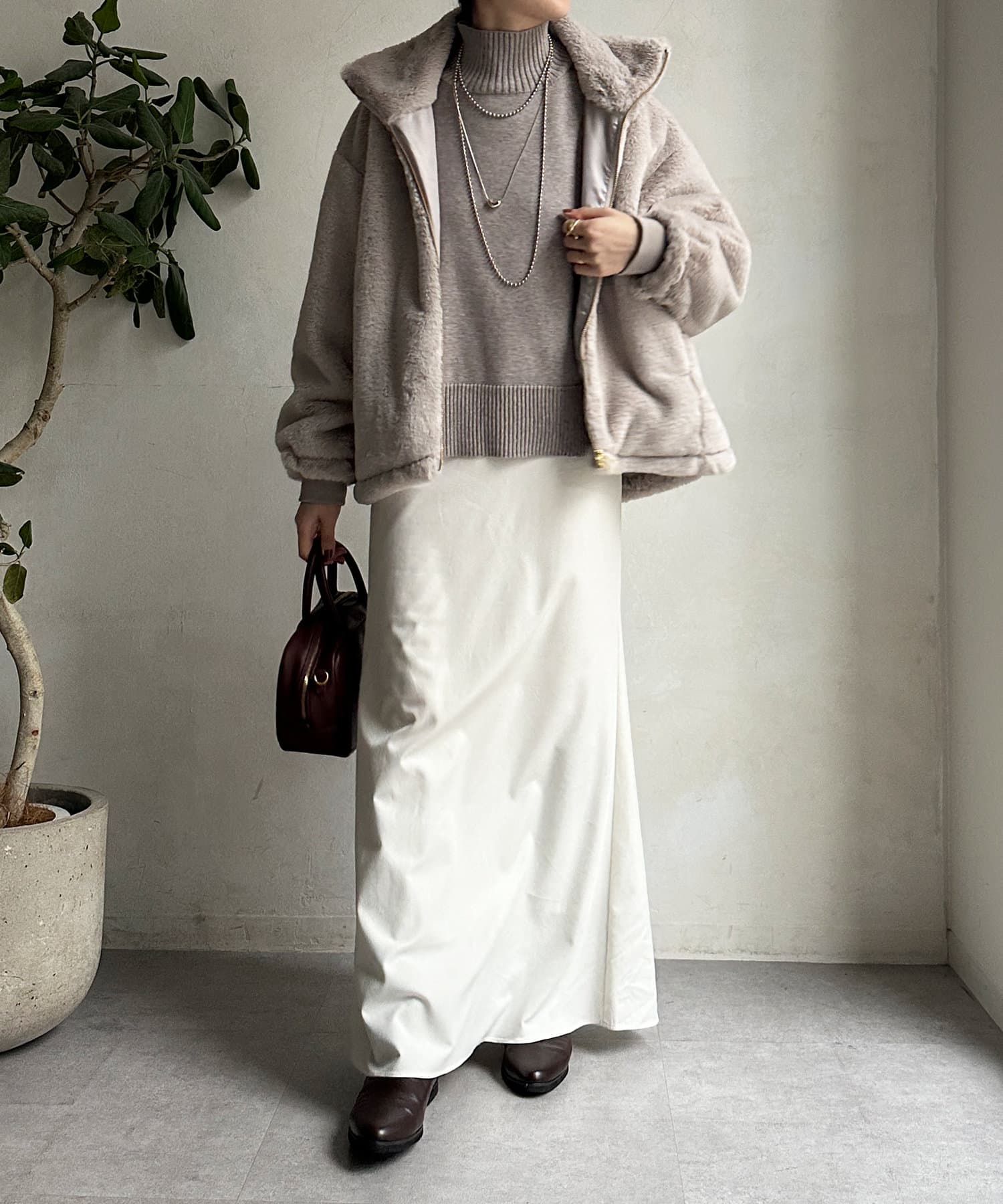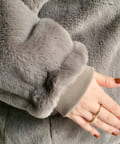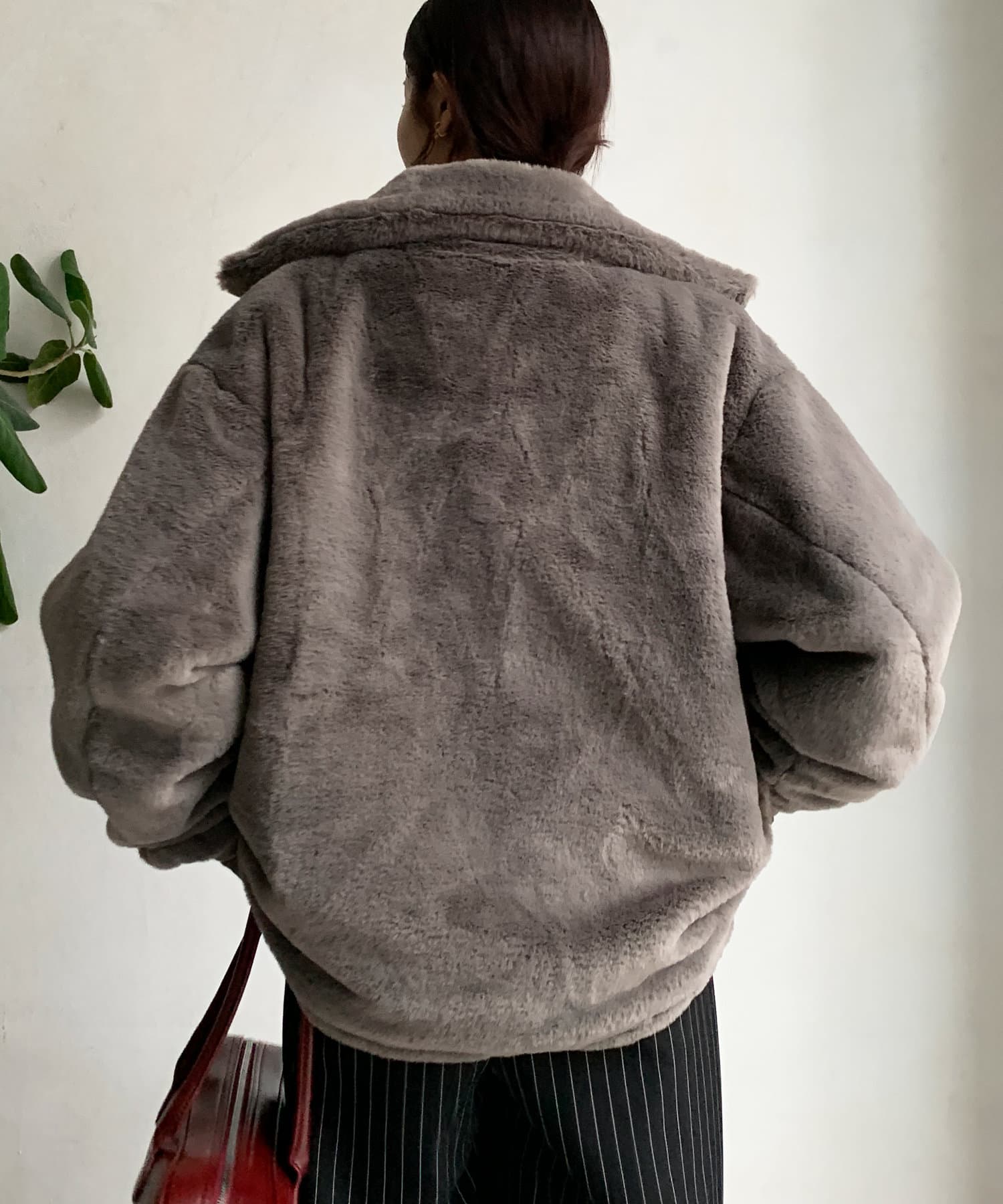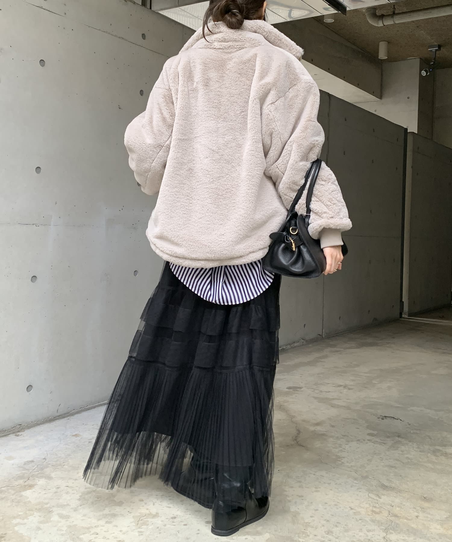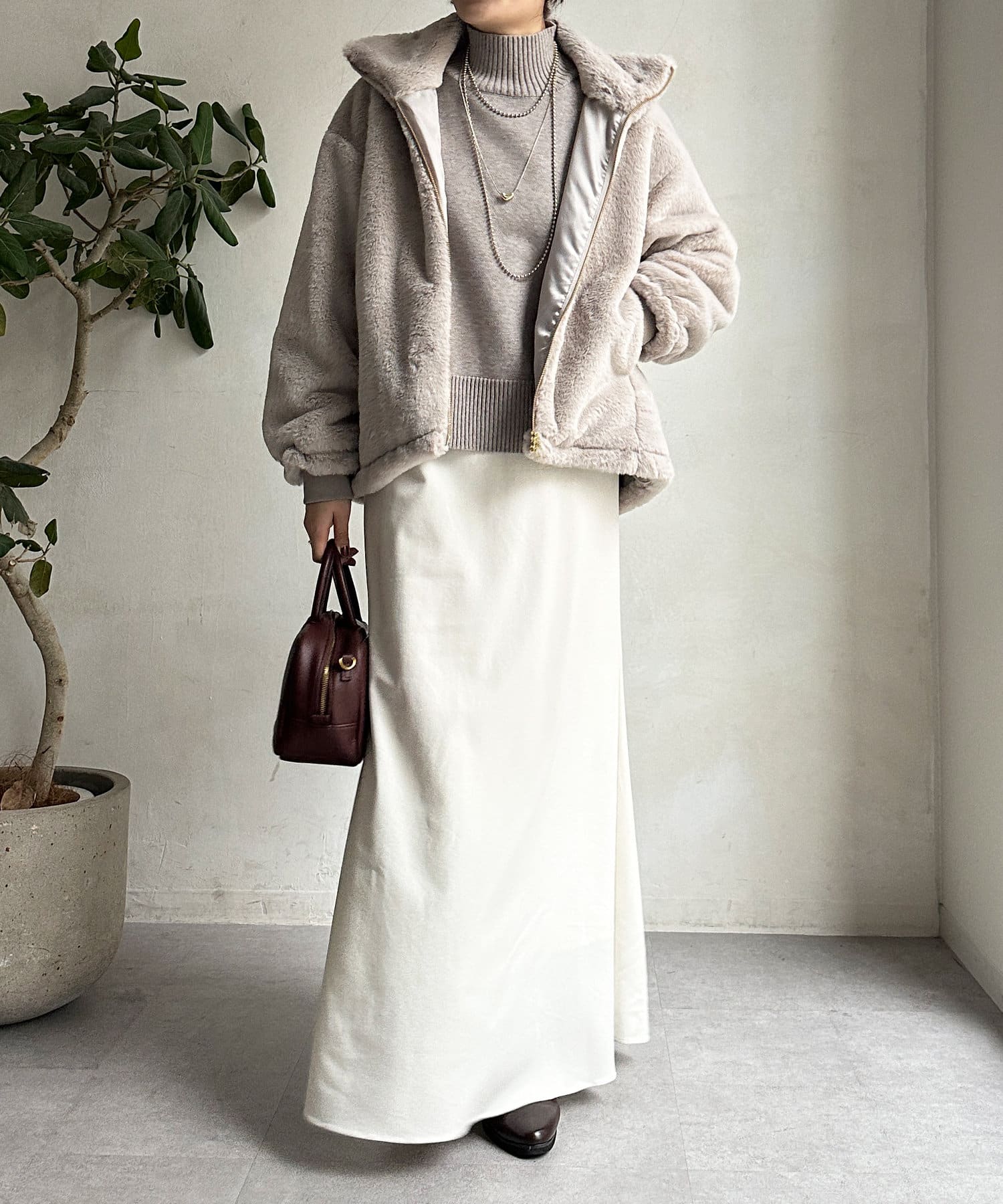 首元までしっかりと暖かいスタンドカラーのファーコート。