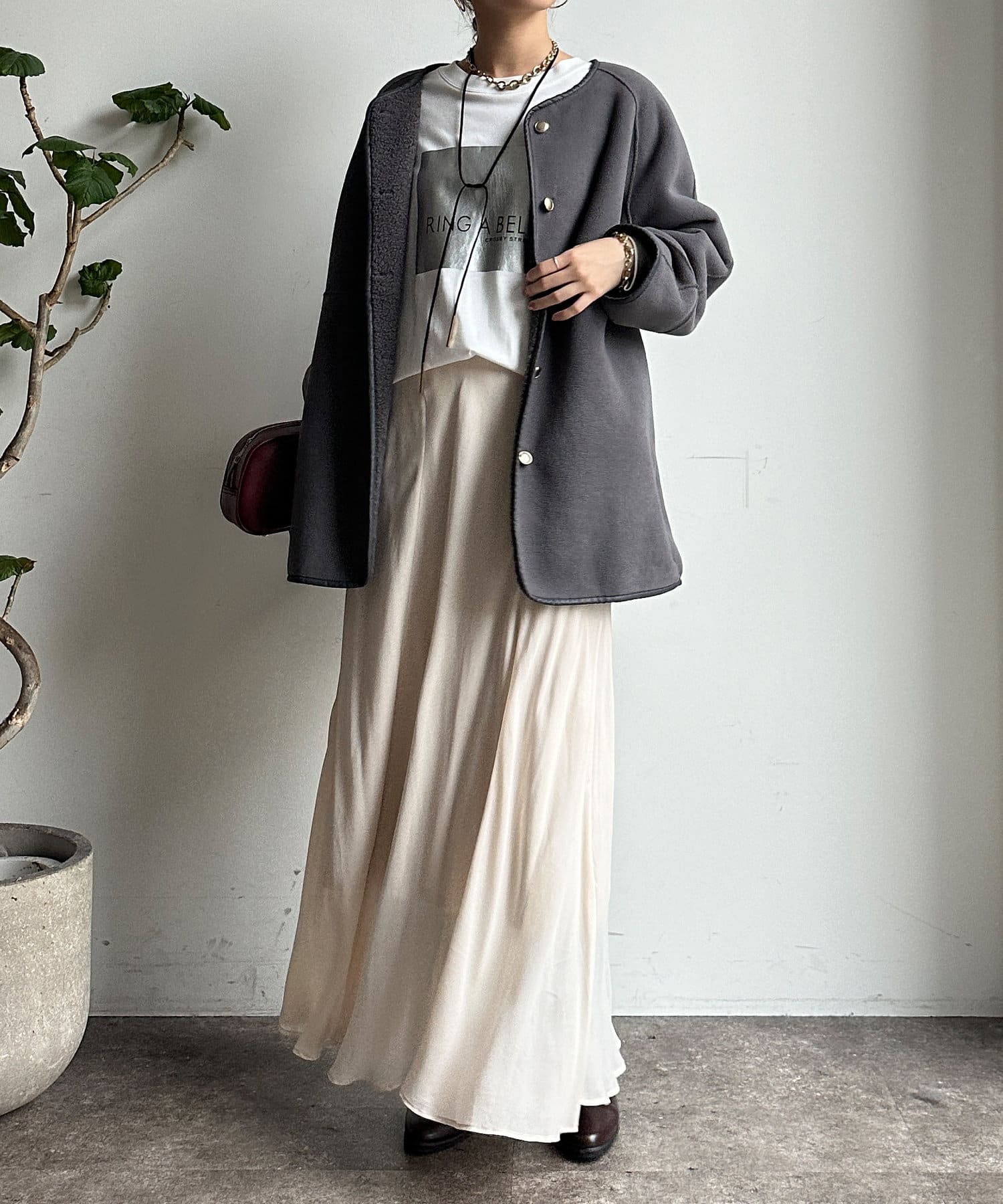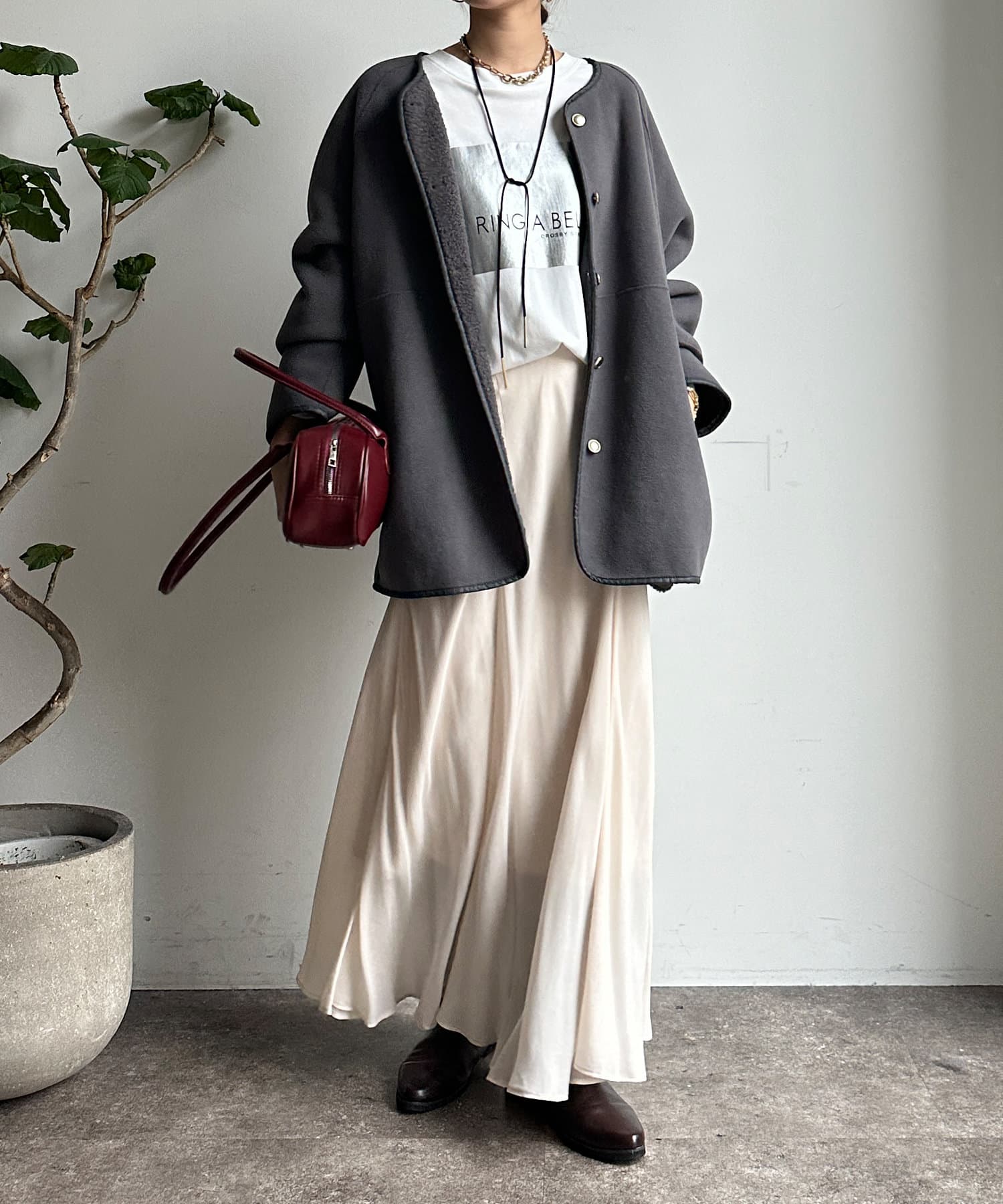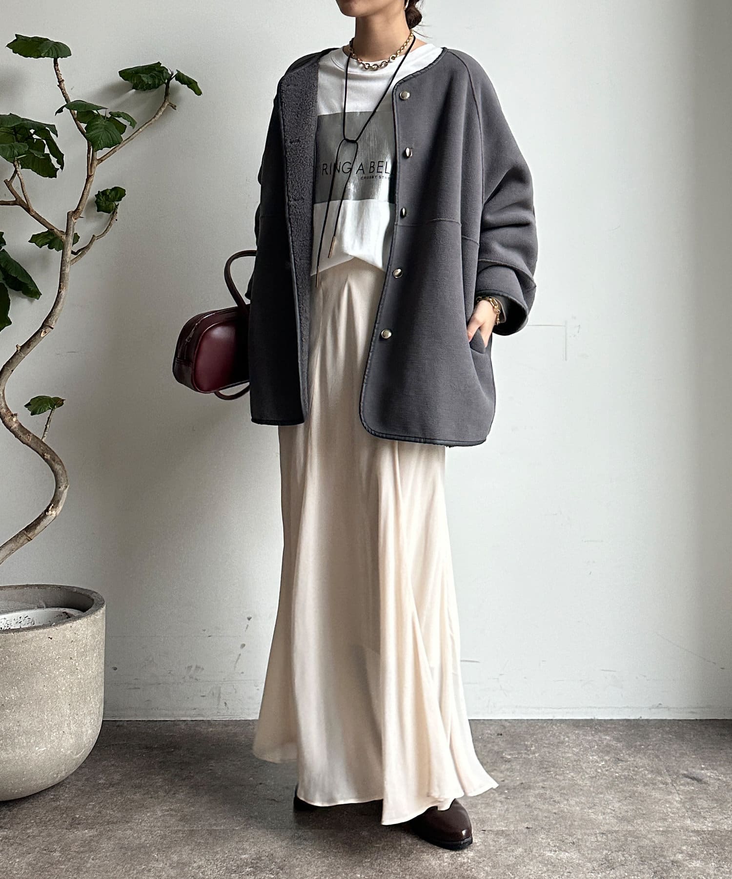表裏どちらでも着られるリバーシブルのデザインで着回しを楽しめる1着。