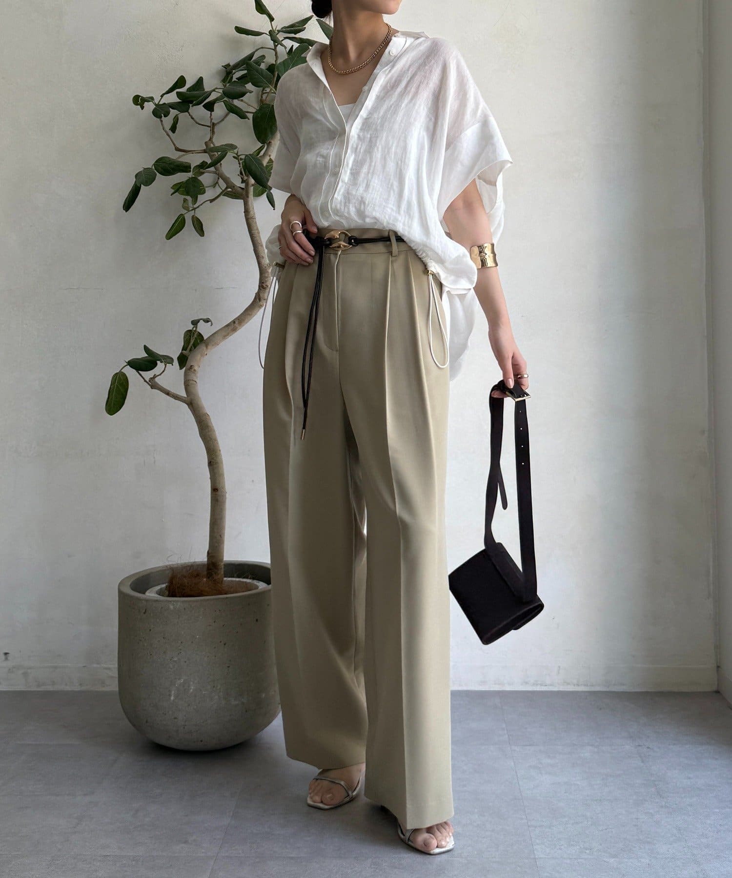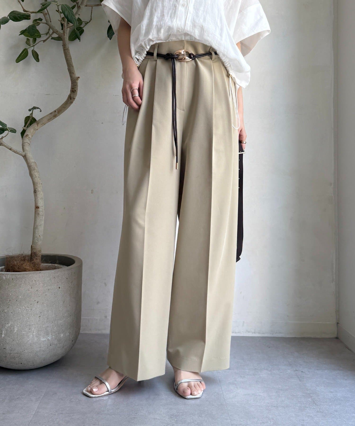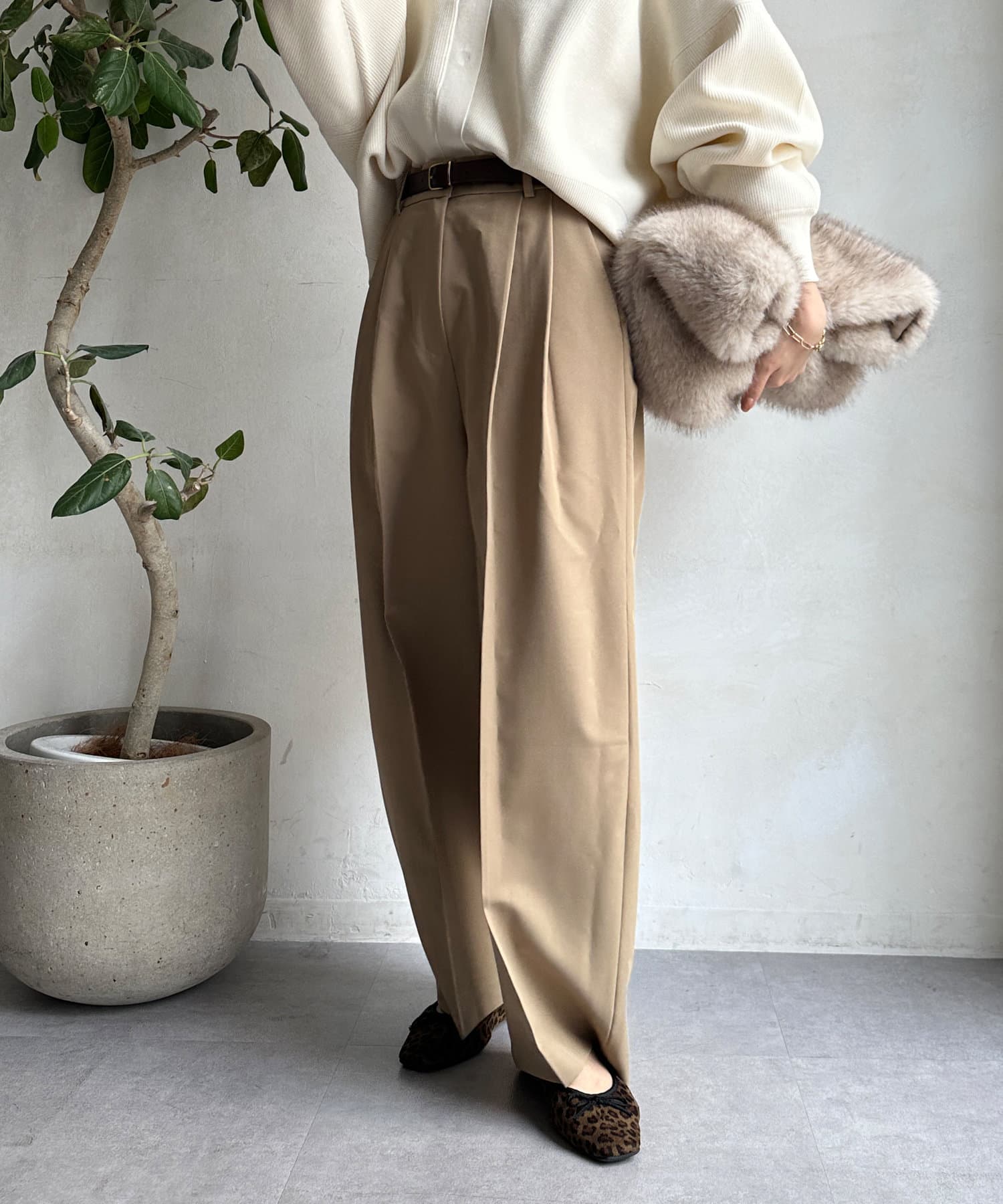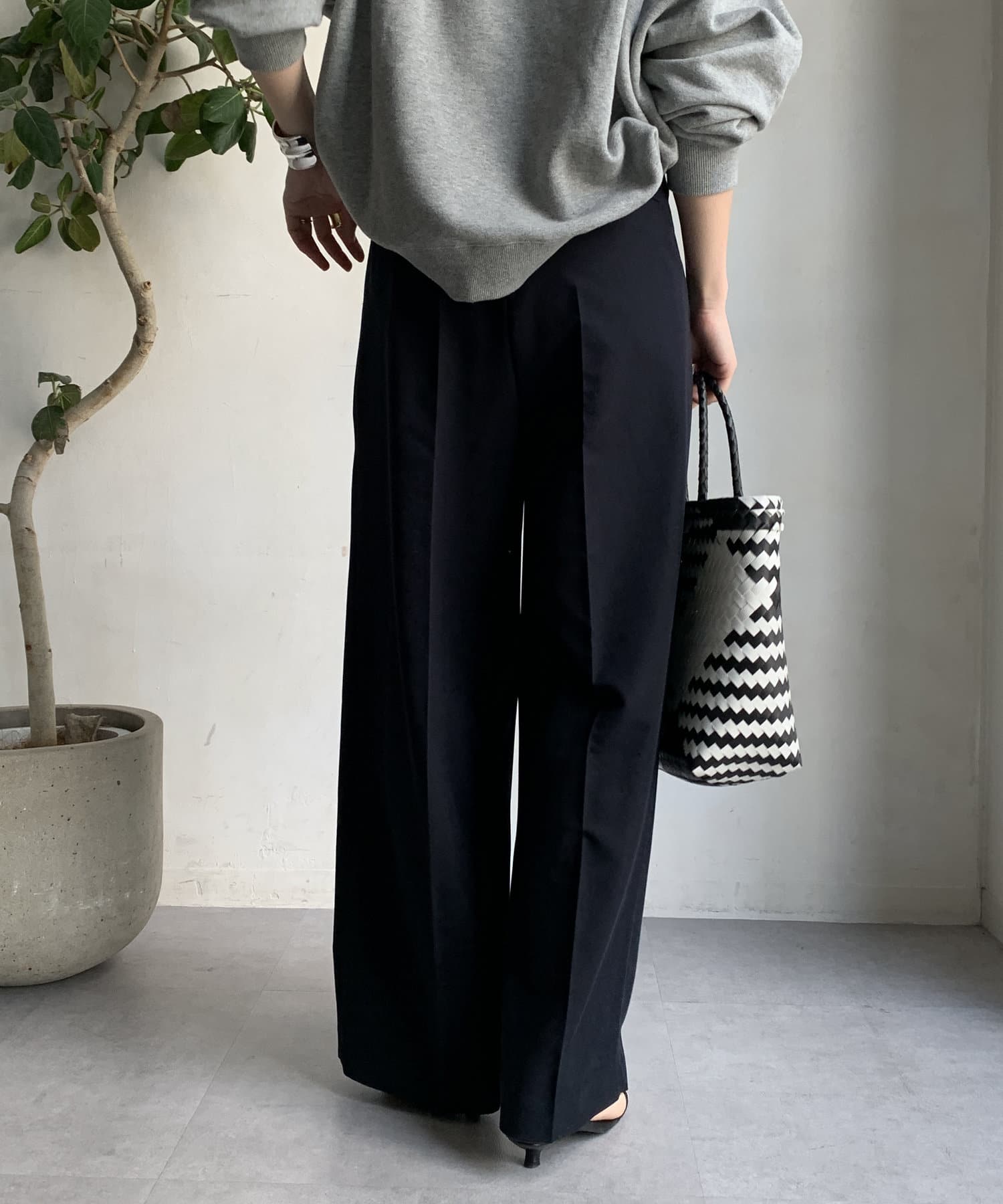 ゆるっとルーズなサイズ感でありながらも、センタープレスなどきちんと感のあるポイントを押さえることで、こなれ感のある印象に。