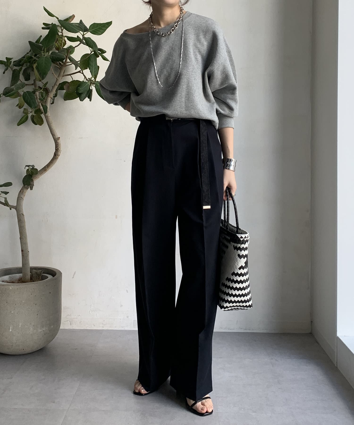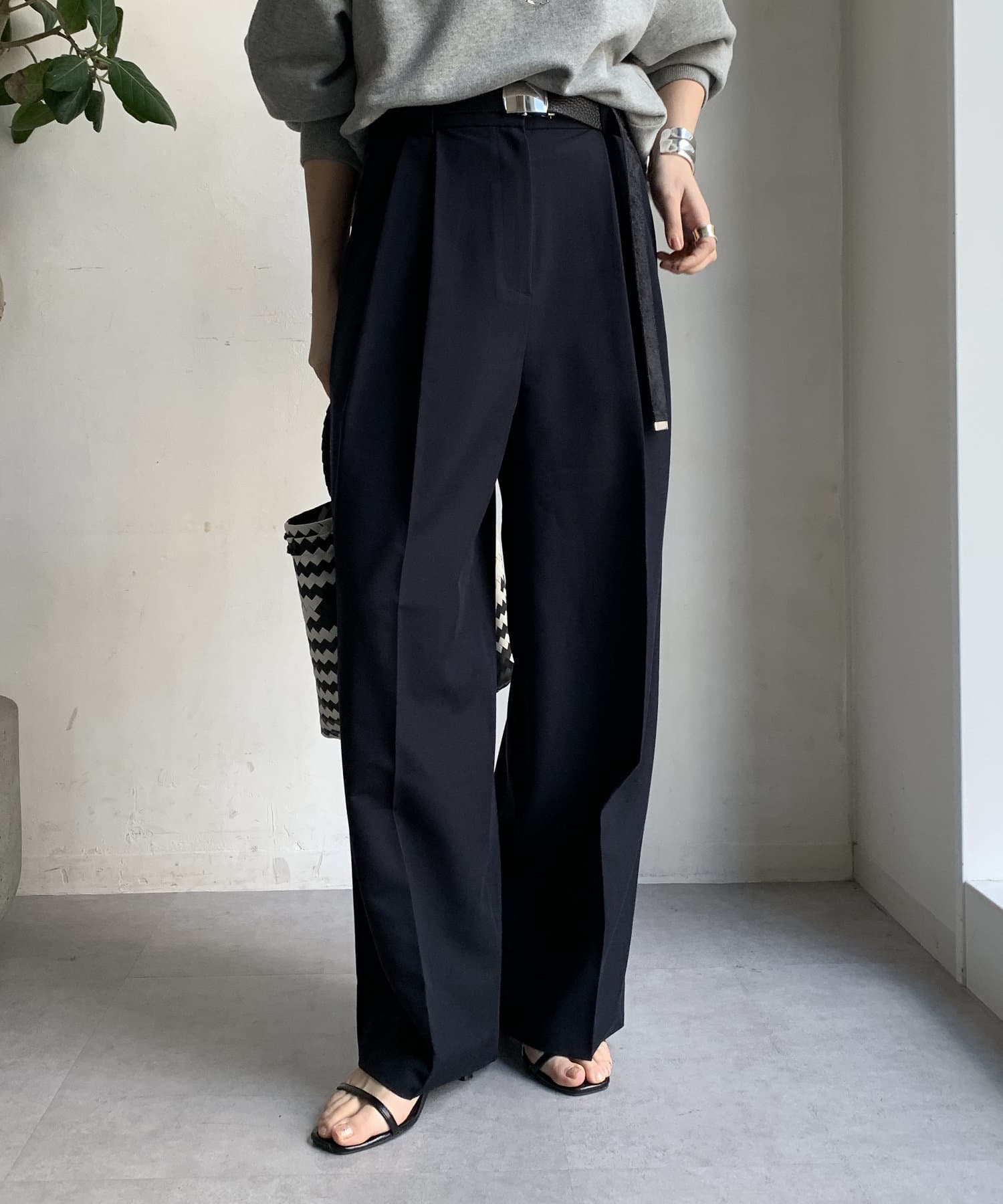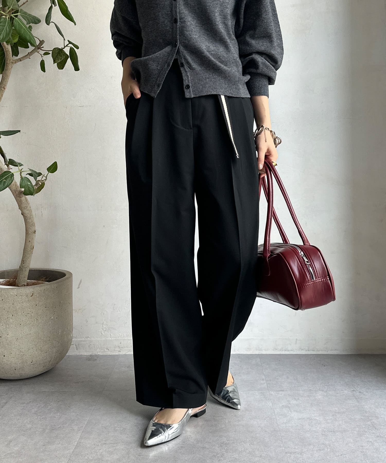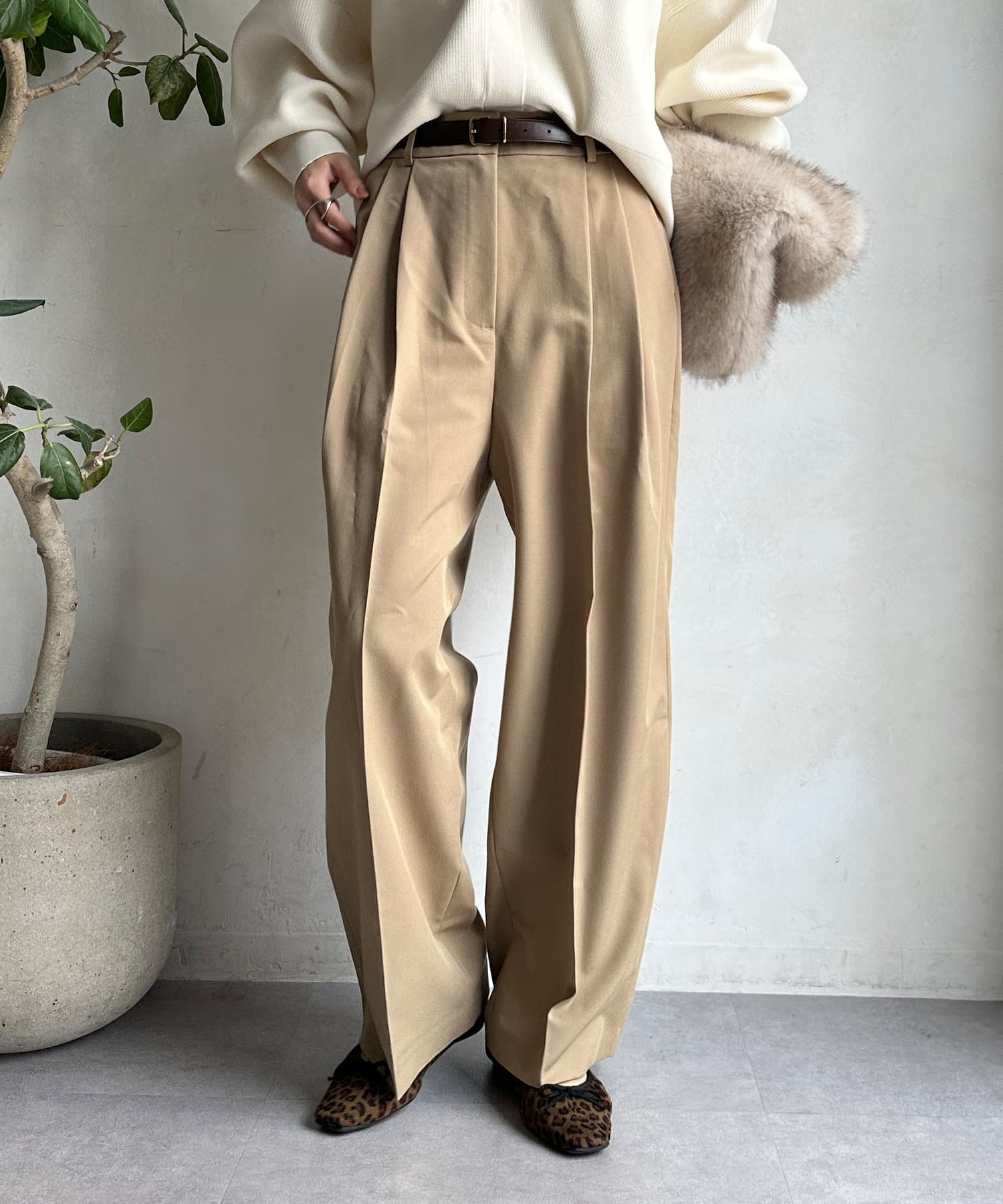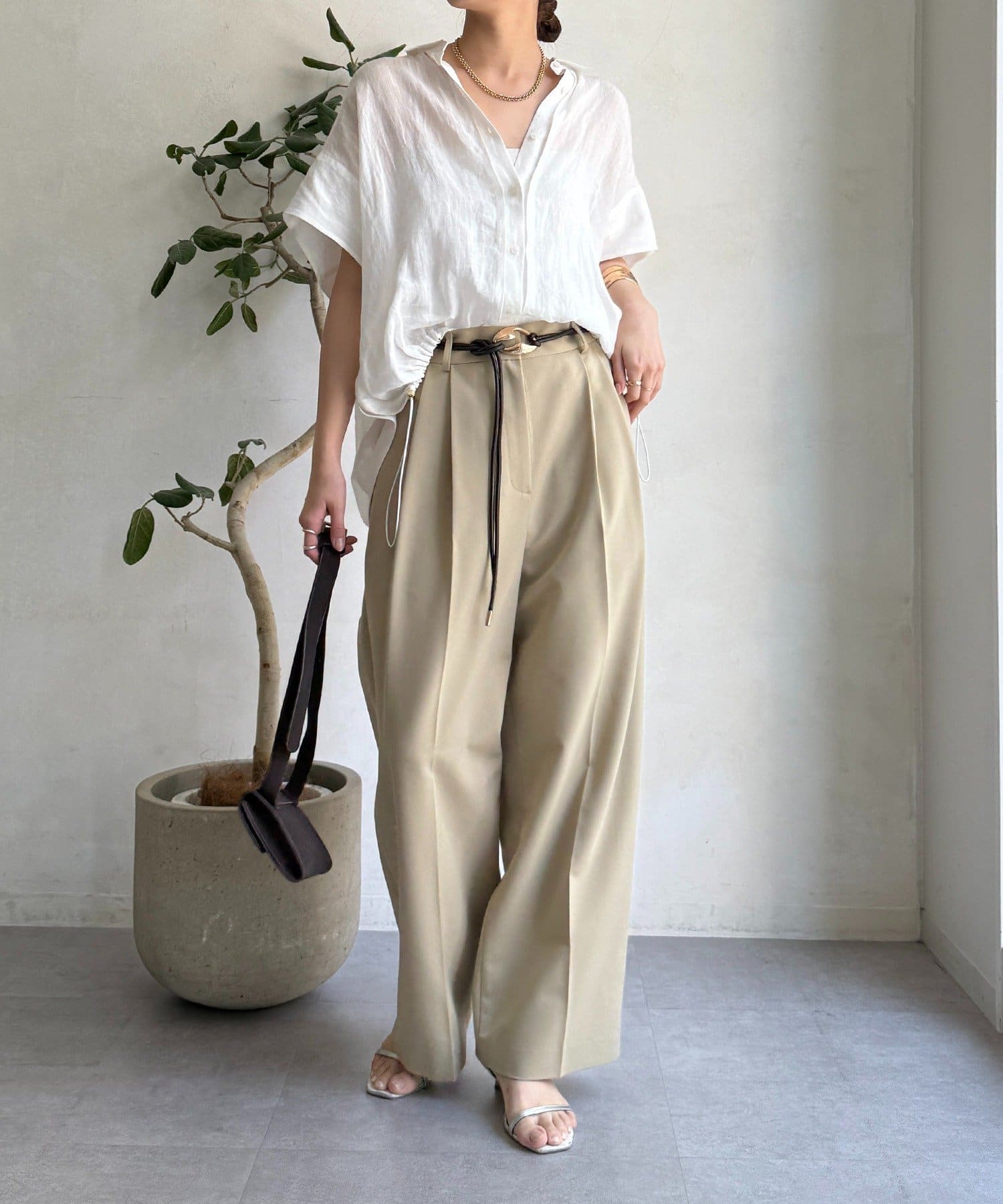 ゆるっとルーズなサイズ感でありながらも、センタープレスなどきちんと感のあるポイントを押さえることで、こなれ感のある印象に。