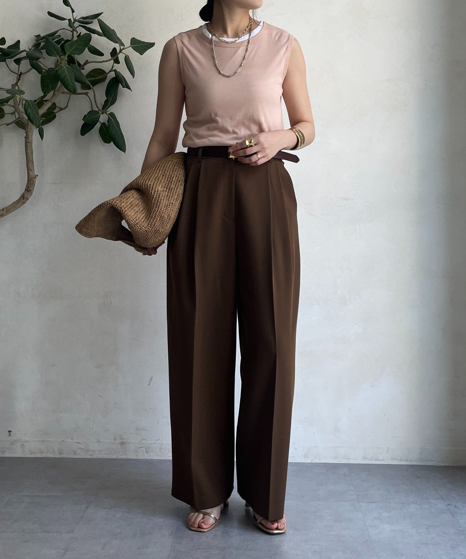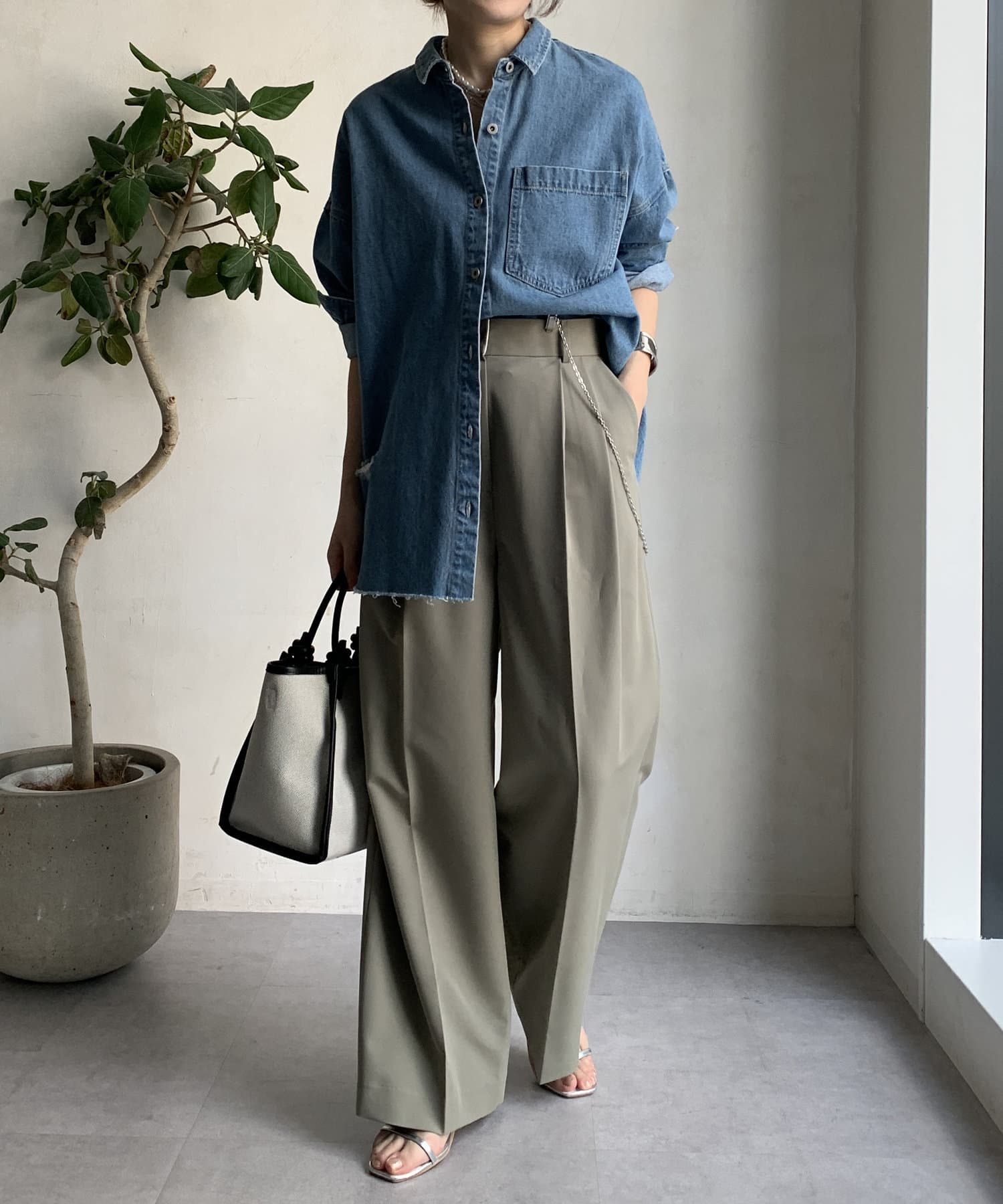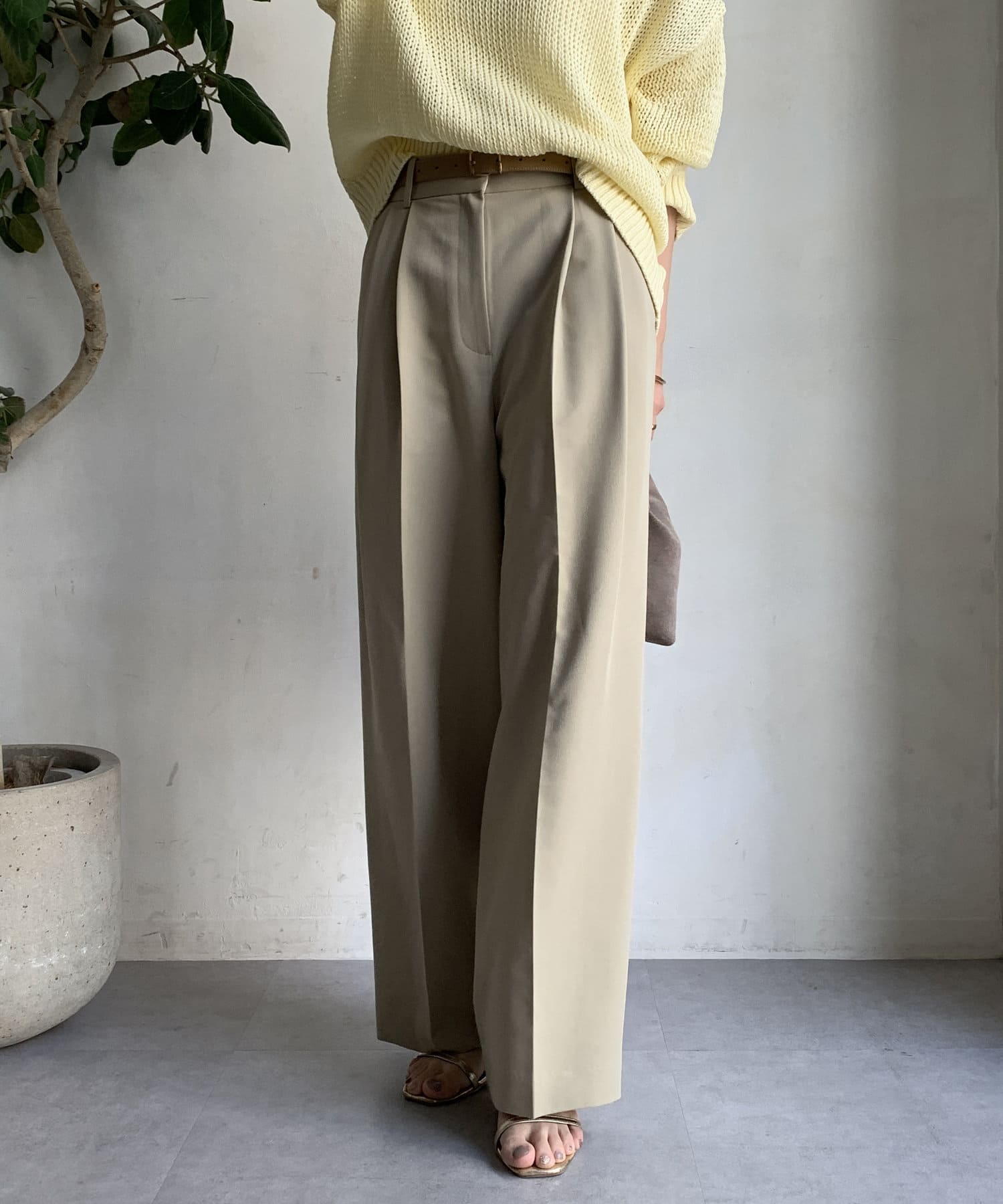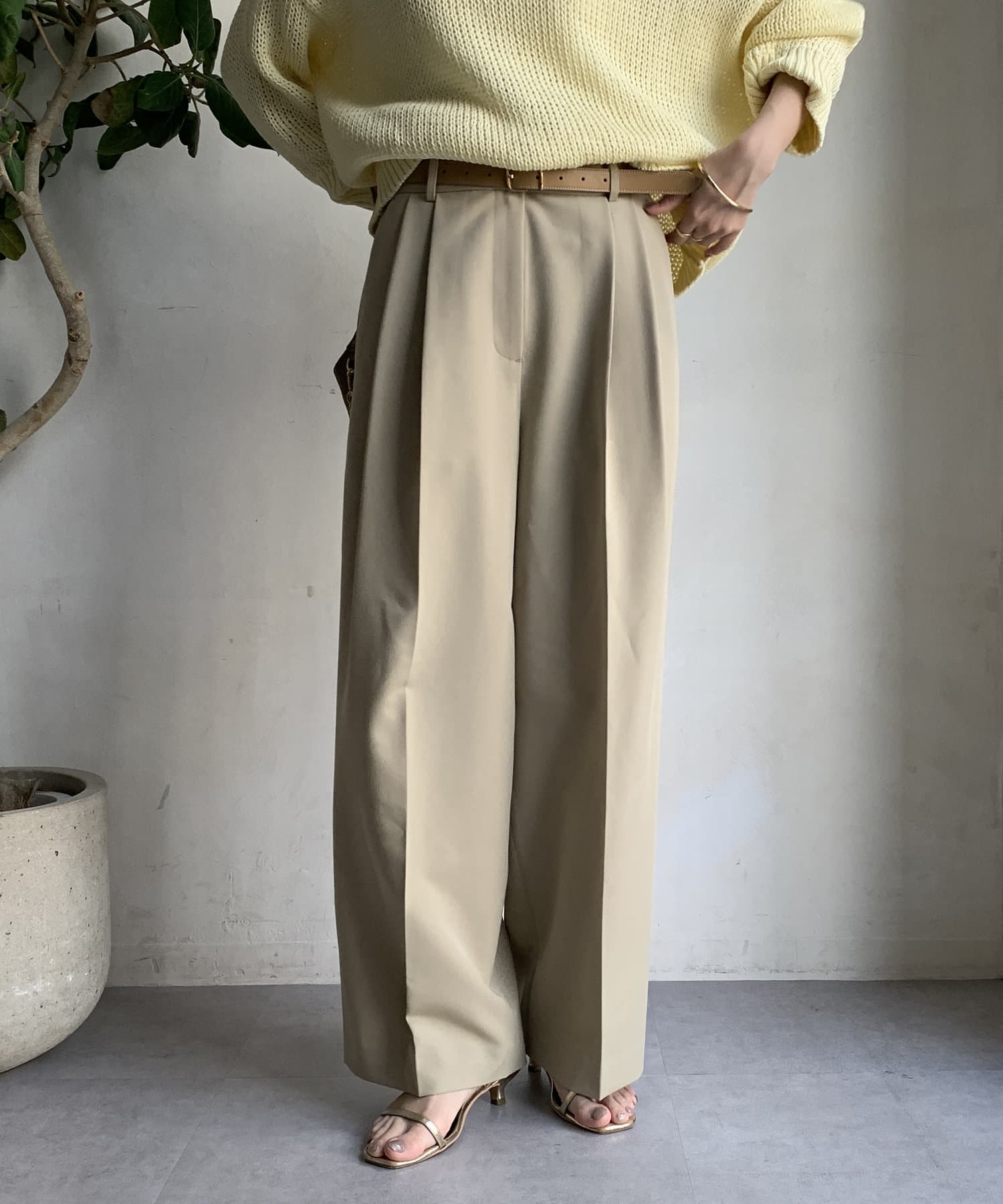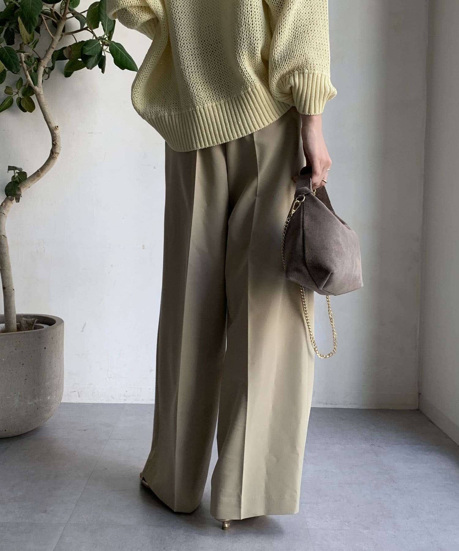 ゆるっとルーズなサイズ感でありながらも、センタープレスなどきちんと感のあるポイントを押さえることで、こなれ感のある印象に。