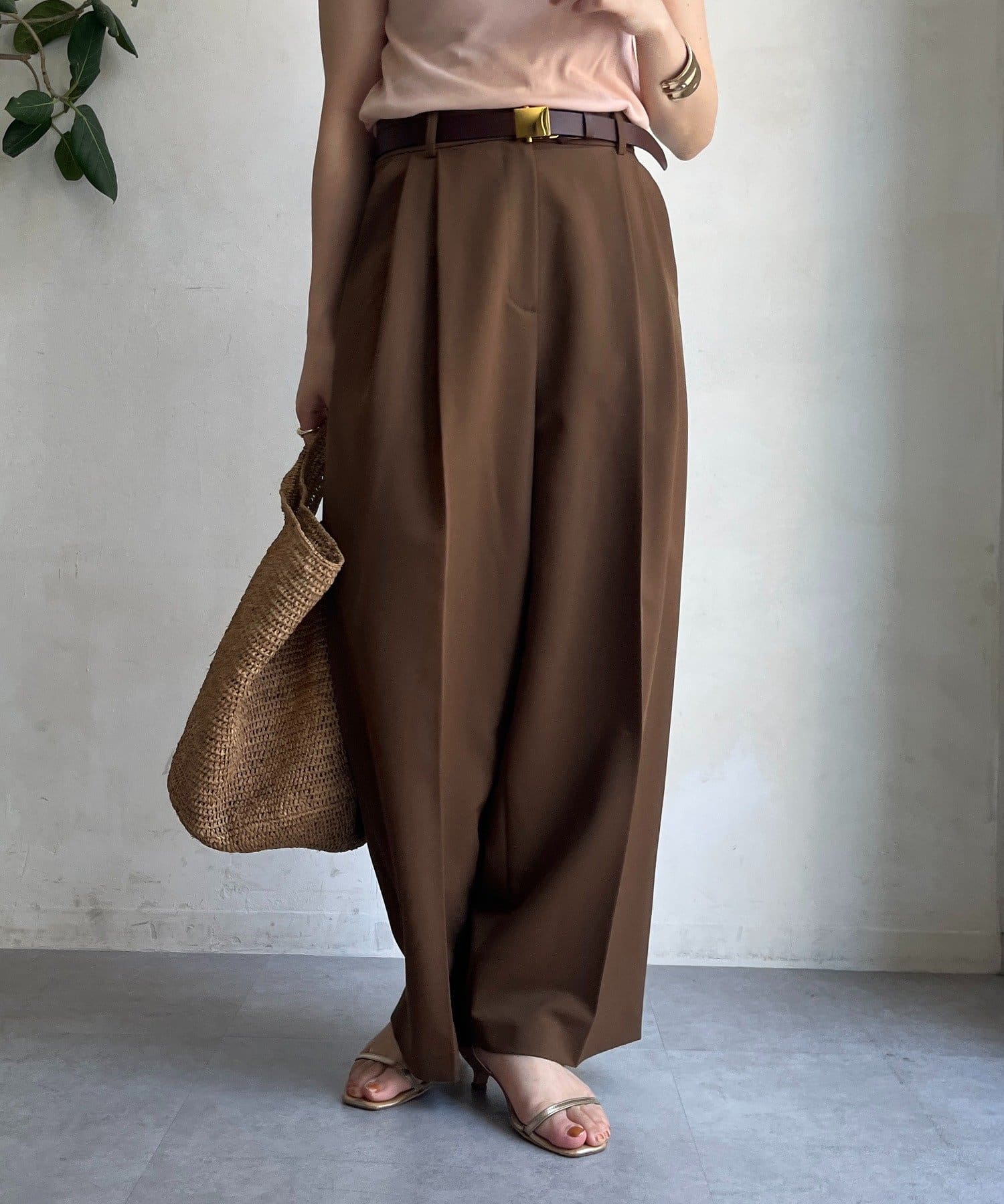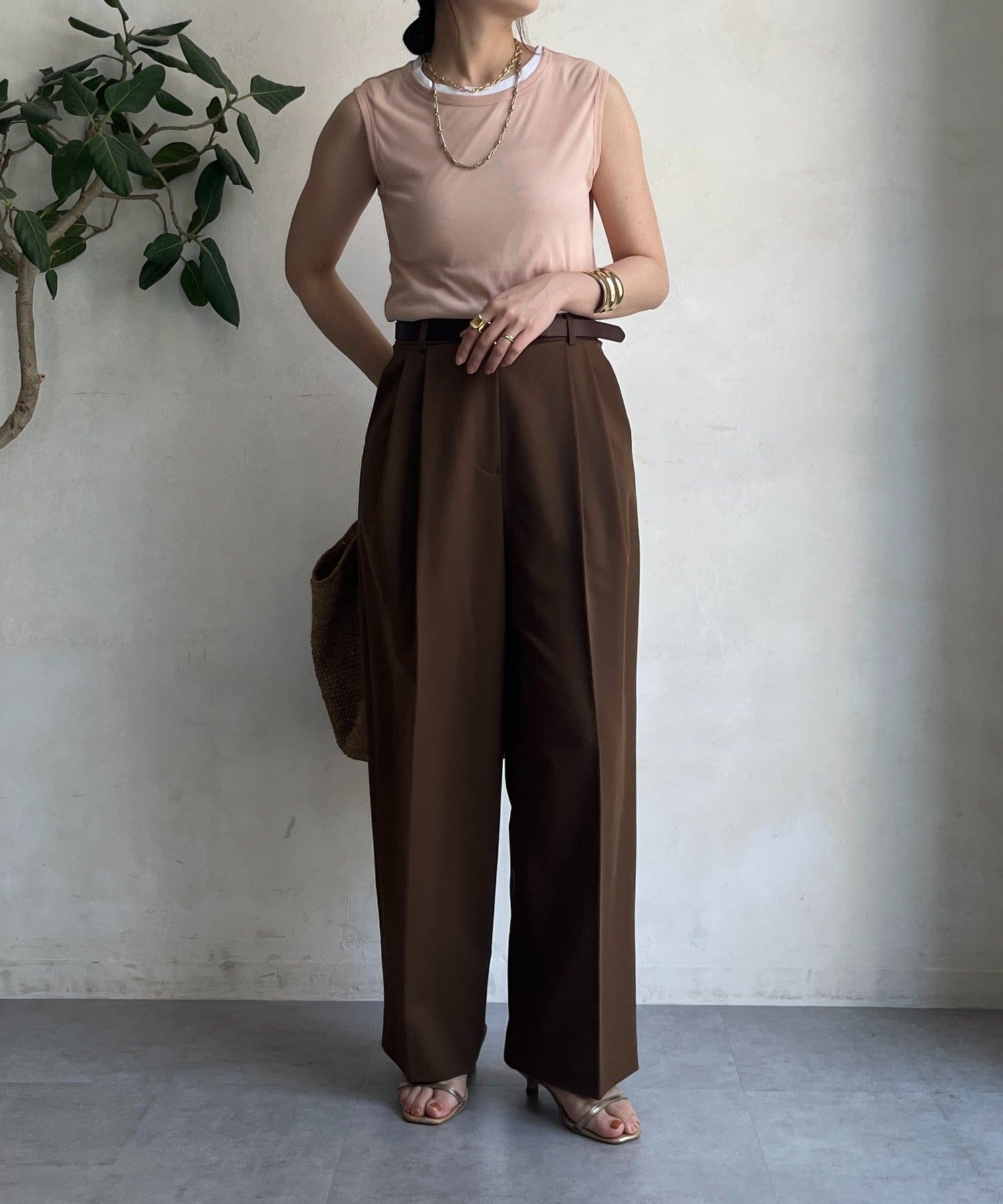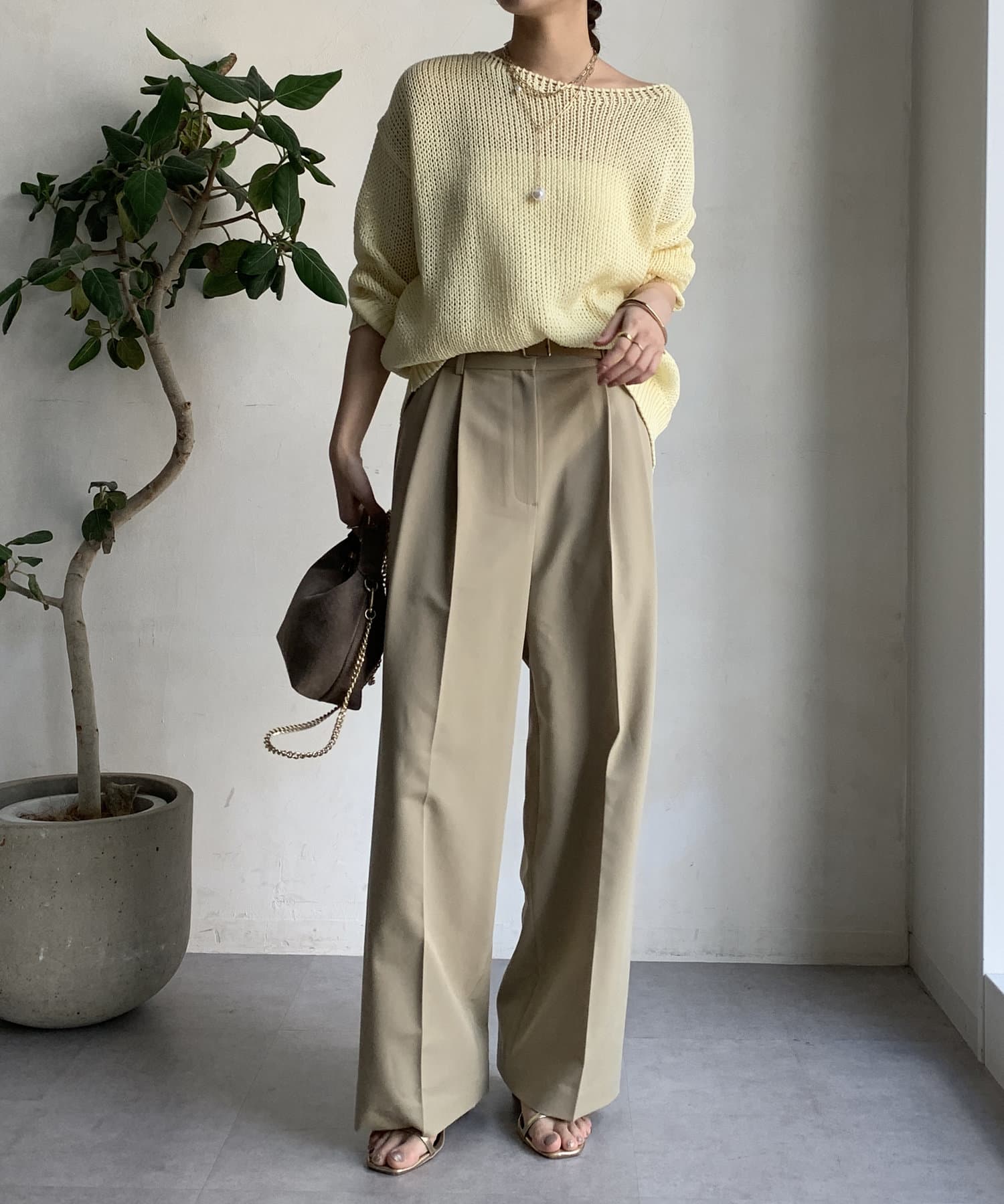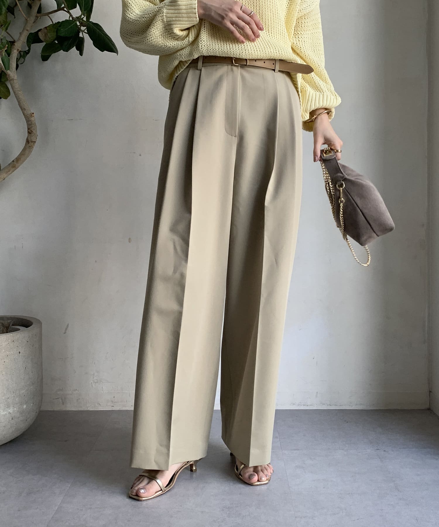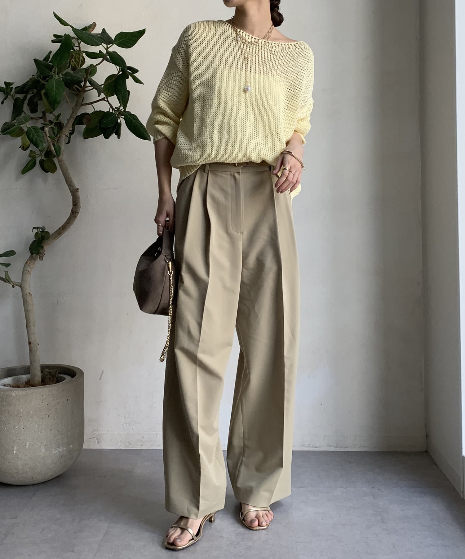 ゆるっとルーズなサイズ感でありながらも、センタープレスなどきちんと感のあるポイントを押さえることで、こなれ感のある印象に。