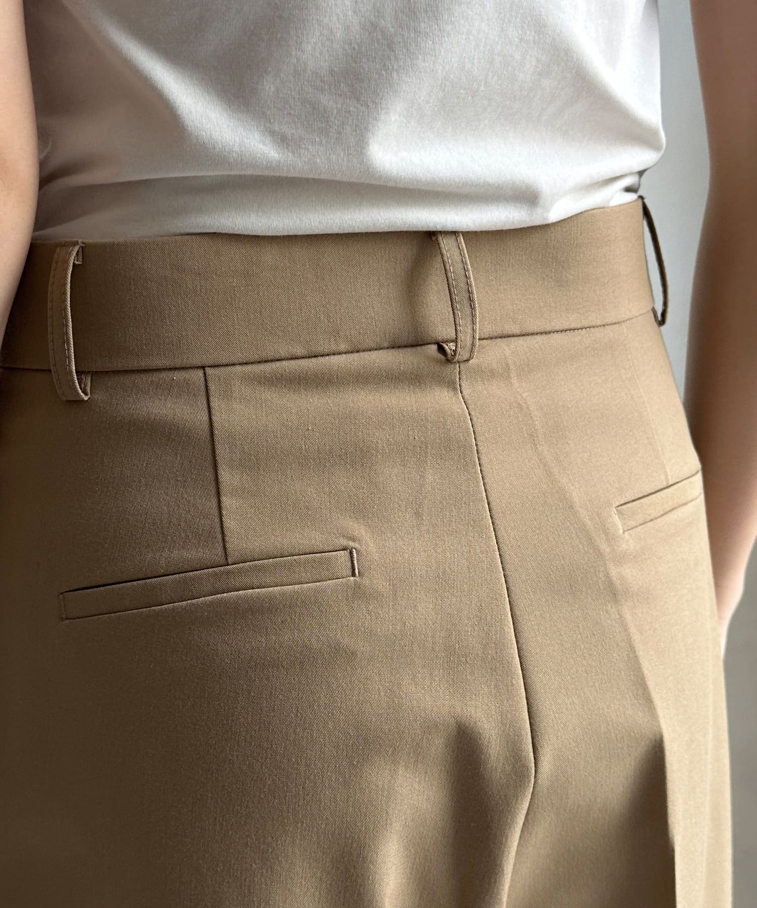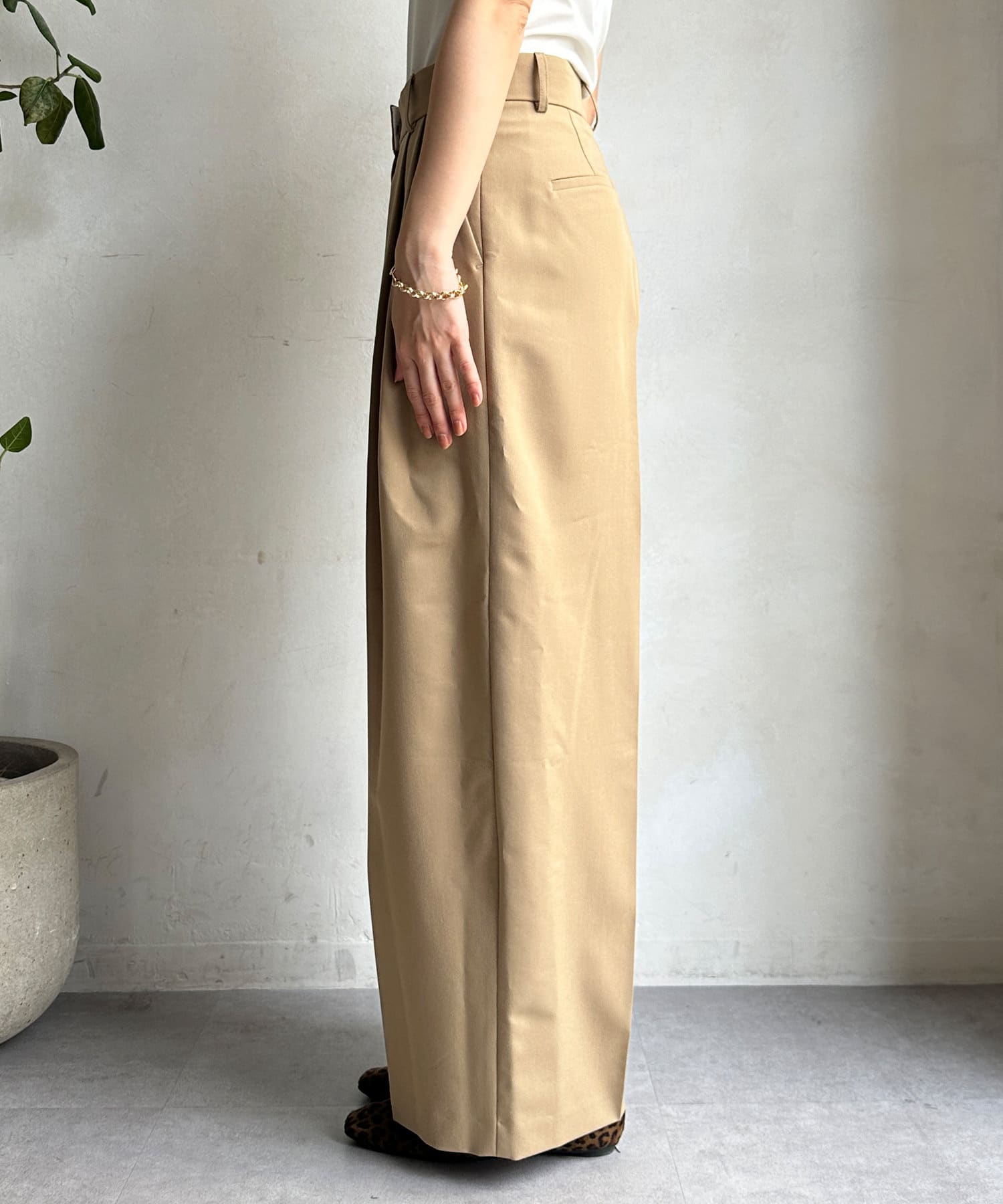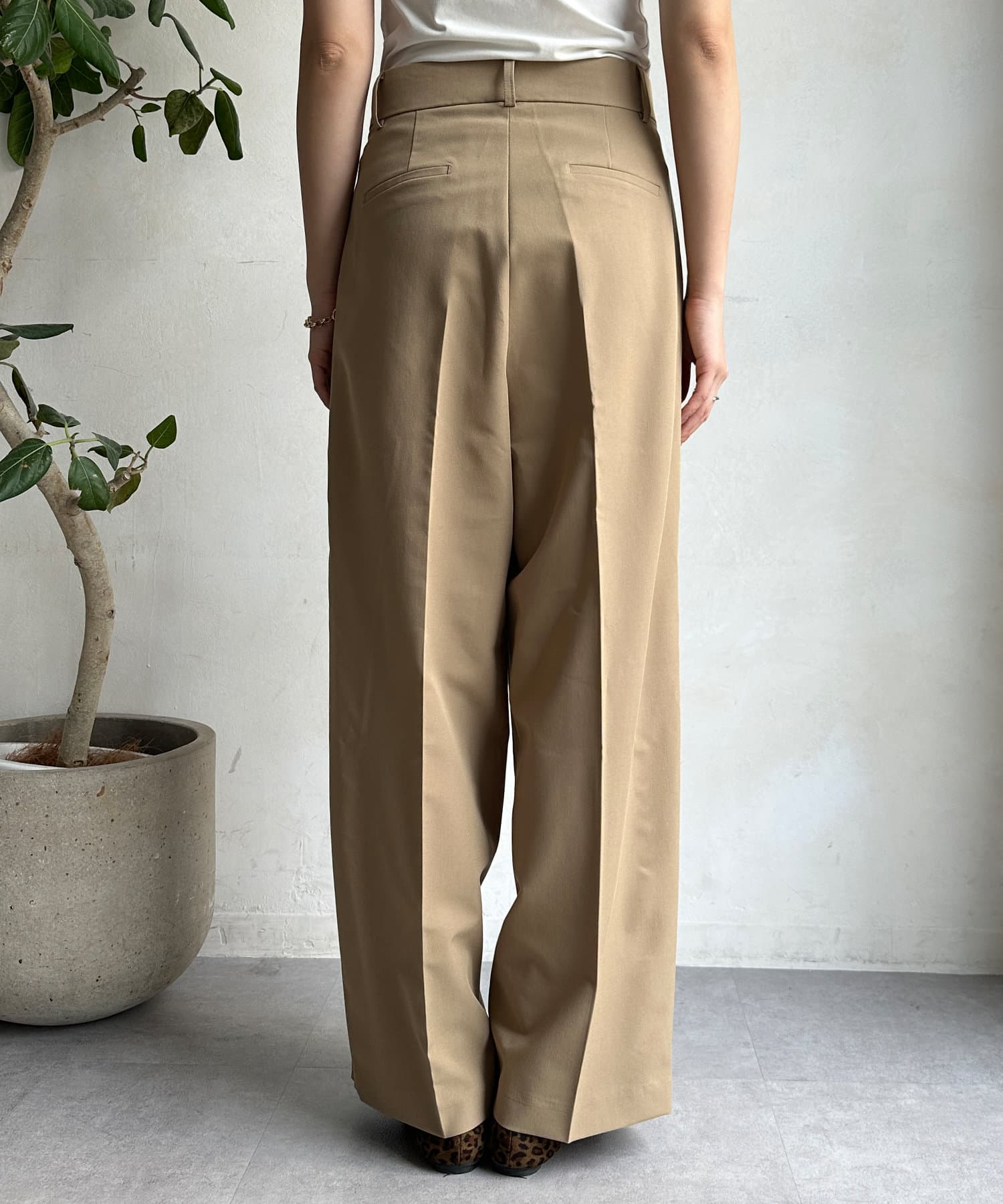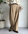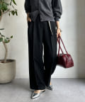 落ち感のある素材を使用し、カジュアルになりすぎないパンツ。