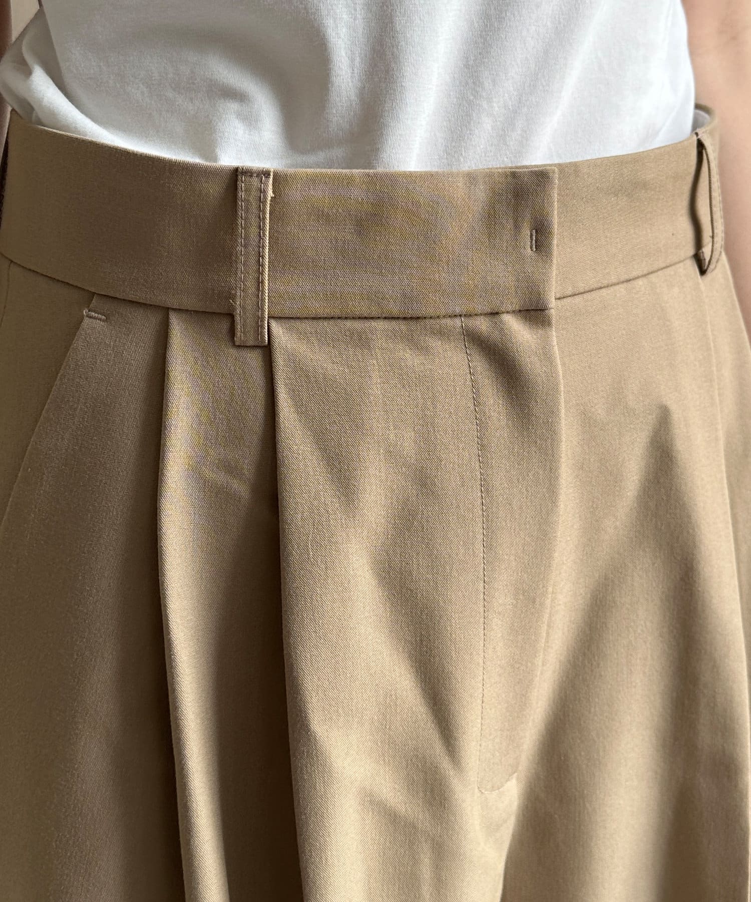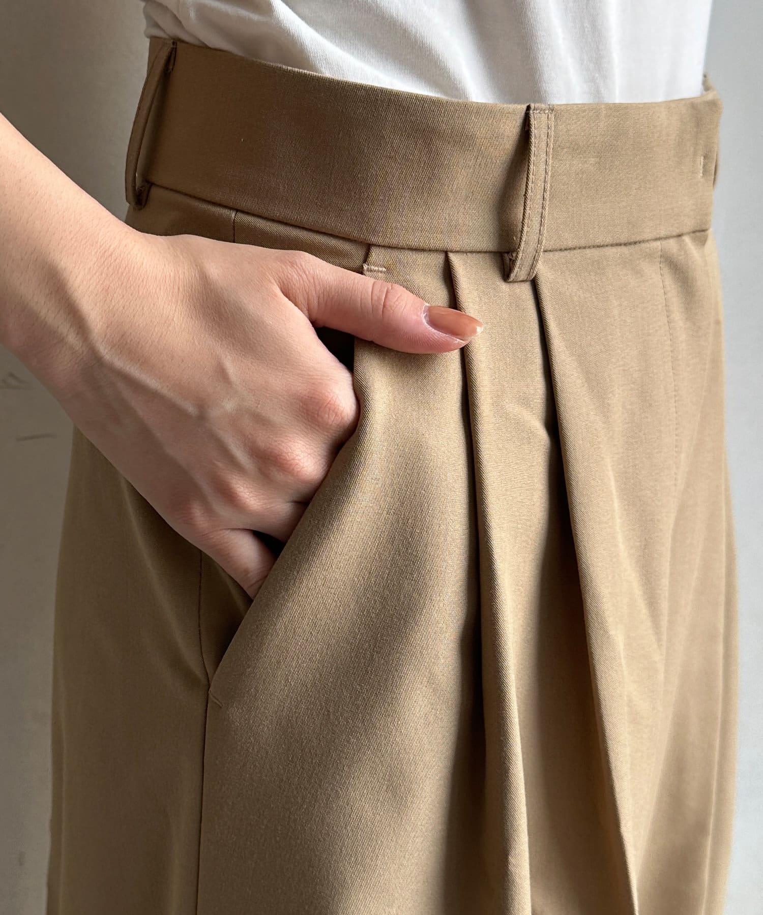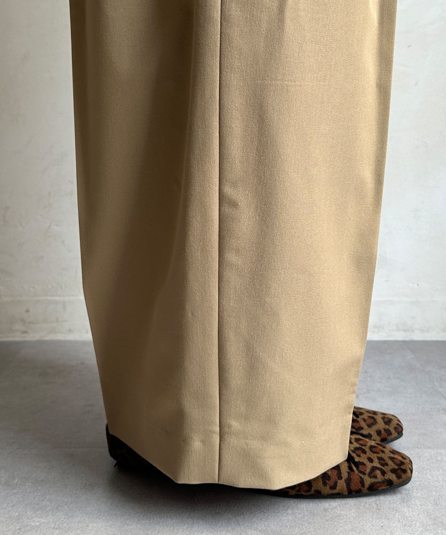 落ち感のある素材を使用し、カジュアルになりすぎないパンツ。
