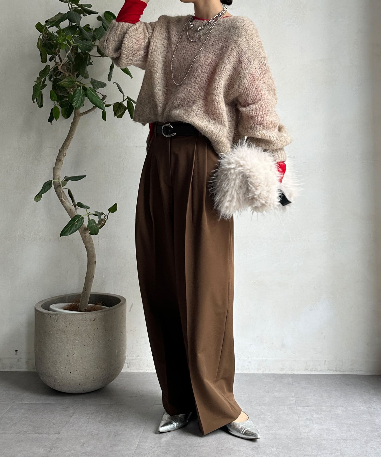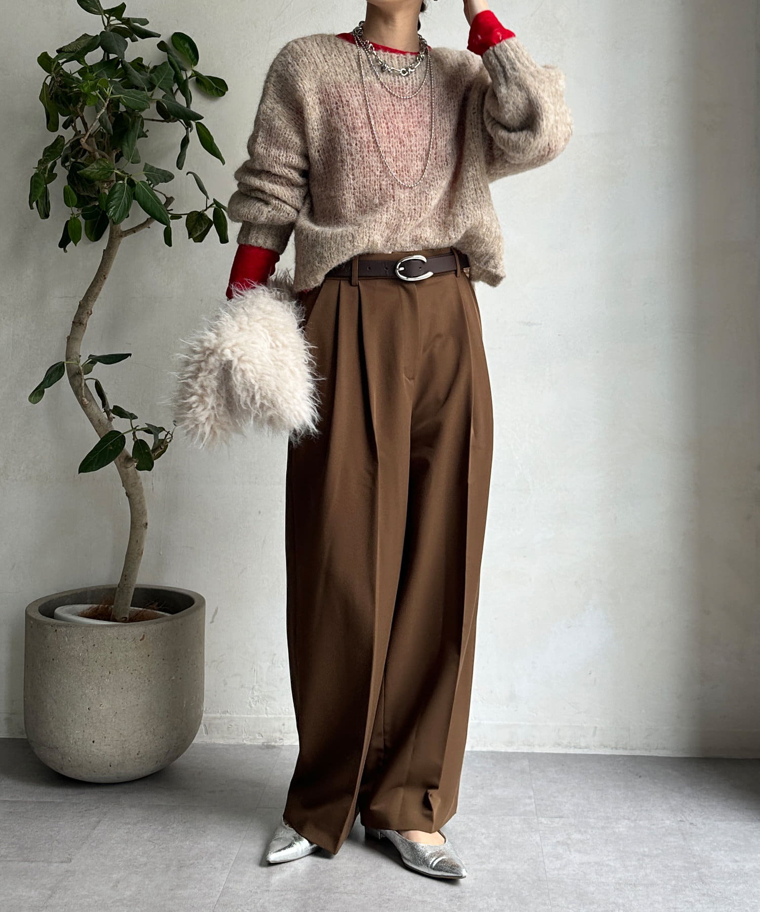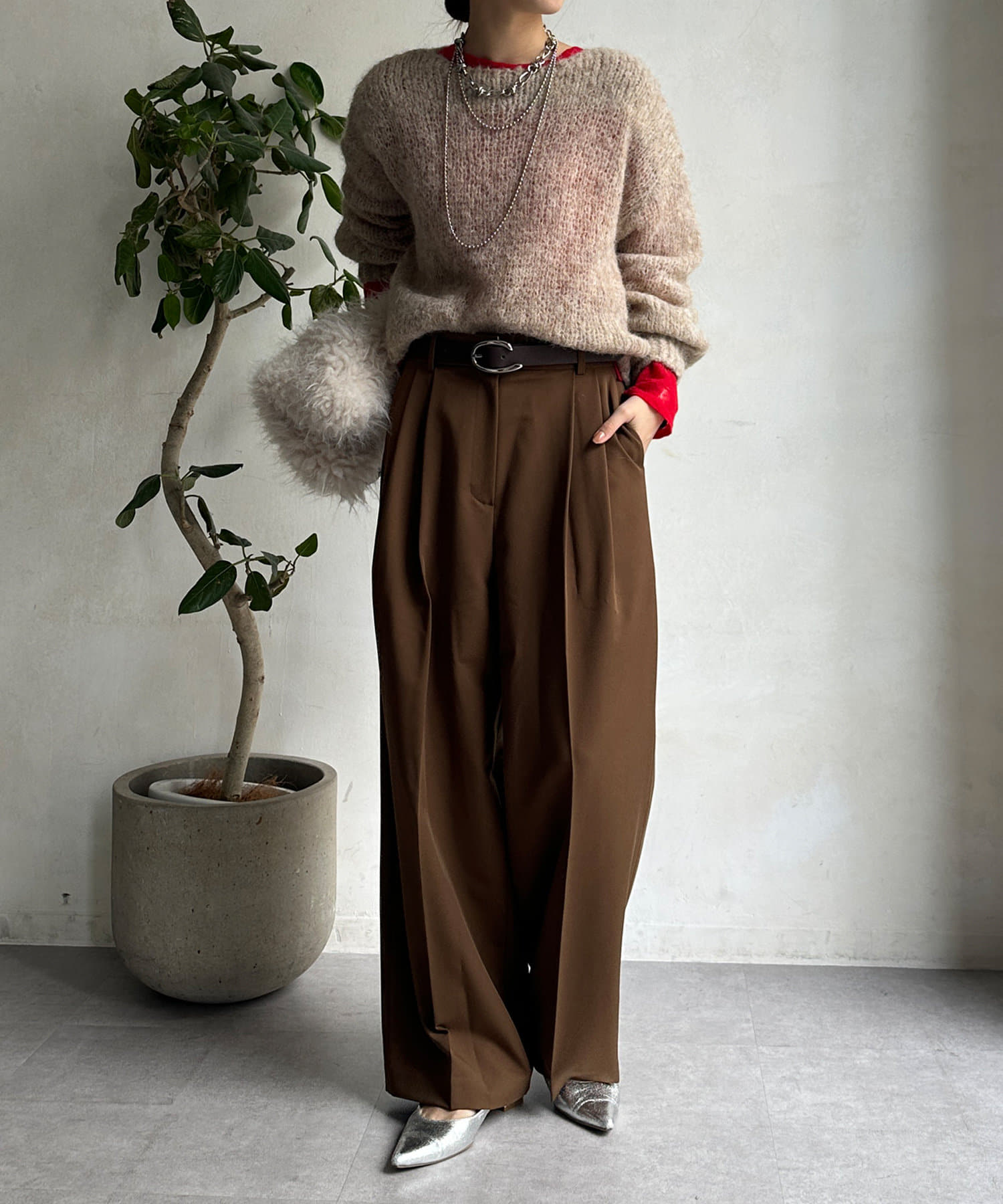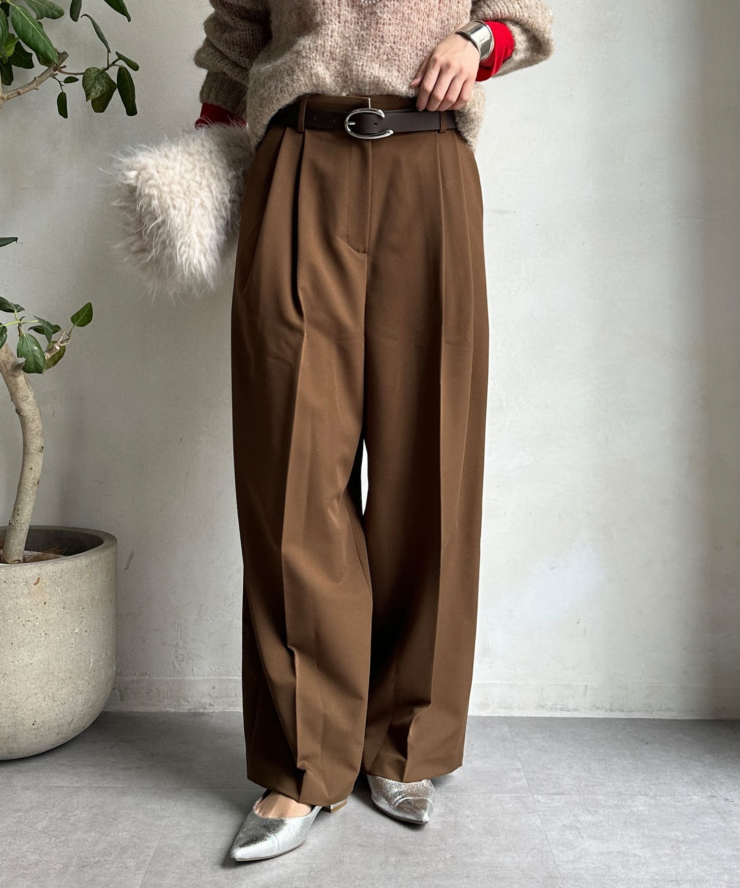 シンプルなトップスとスタイリングした際も、しっかりとおしゃれ見えしてくれるシルエットです。