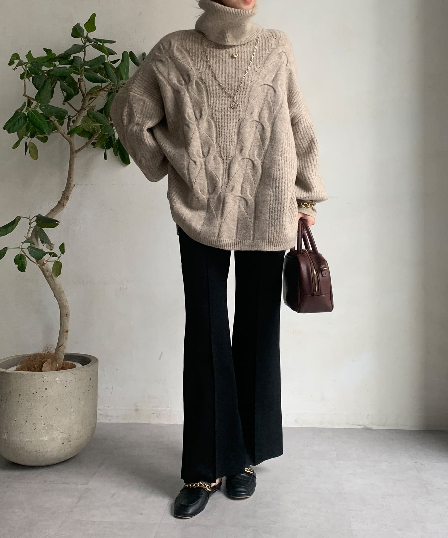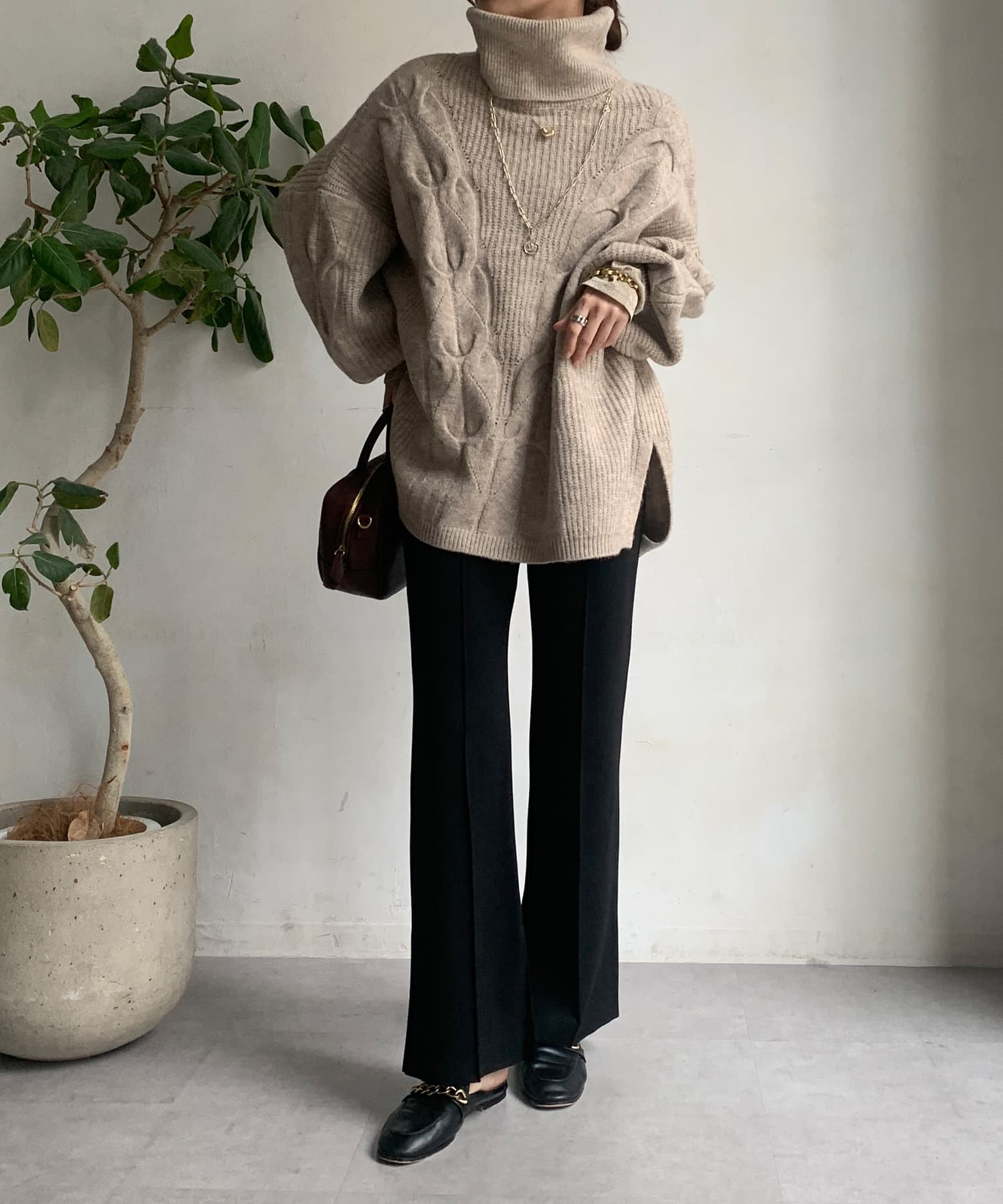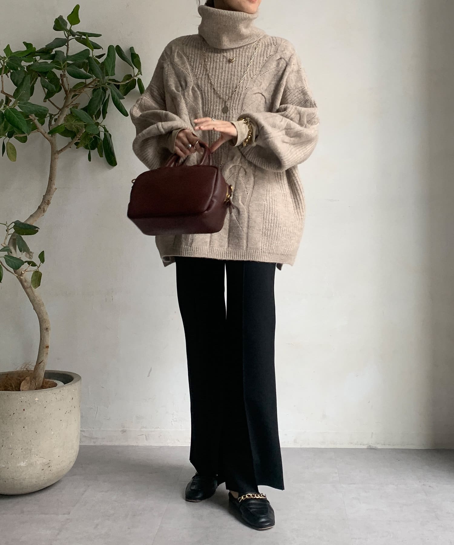丈の長いざっくりニットやカーディガンなどに合わせて、足元はフラットシューズやブーツインなど。