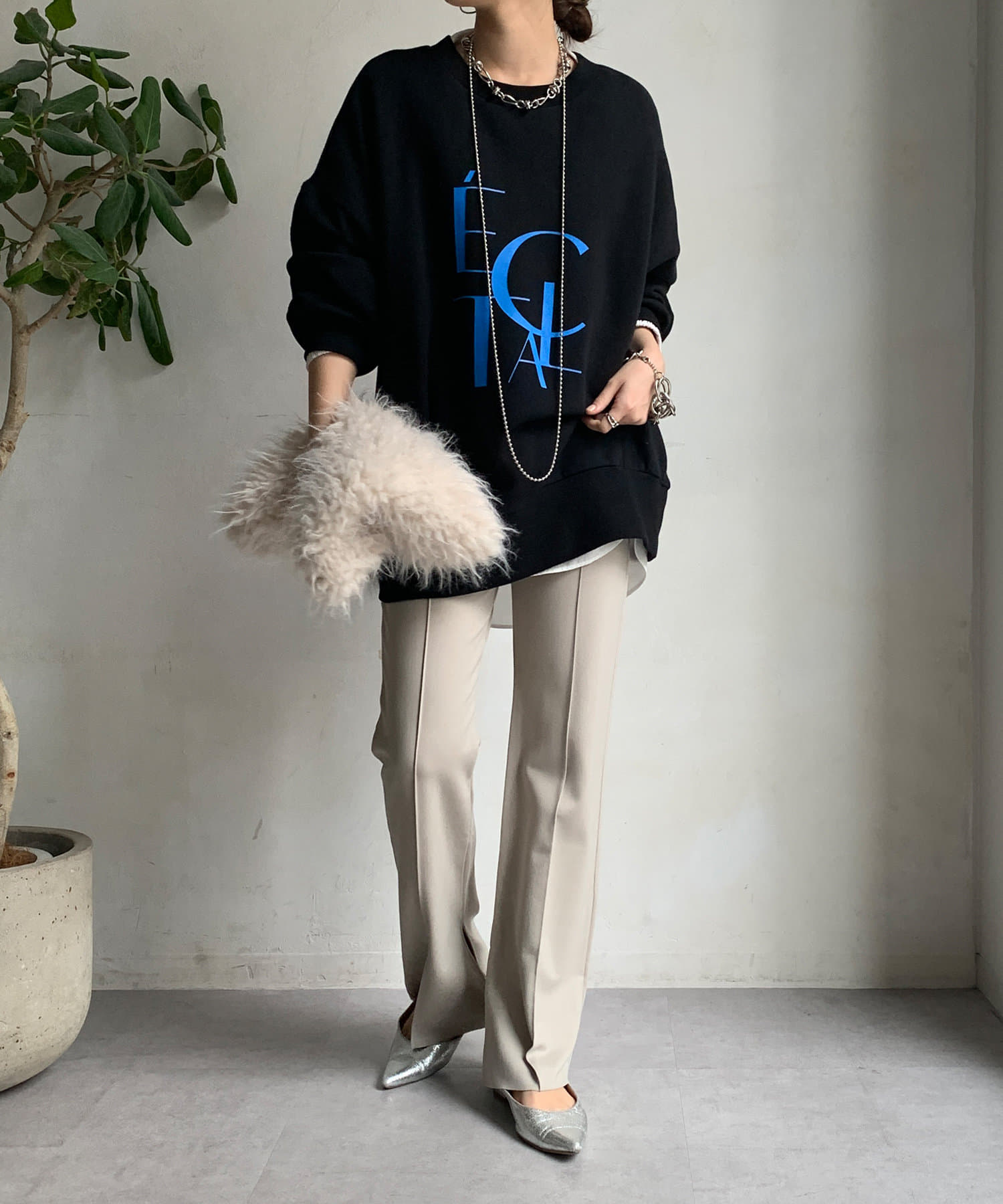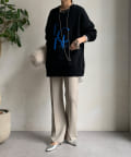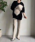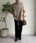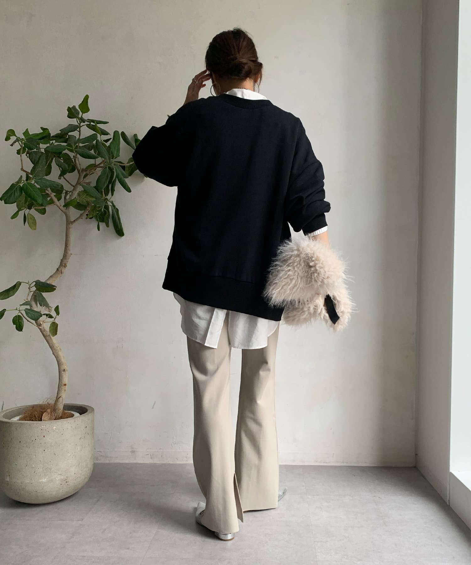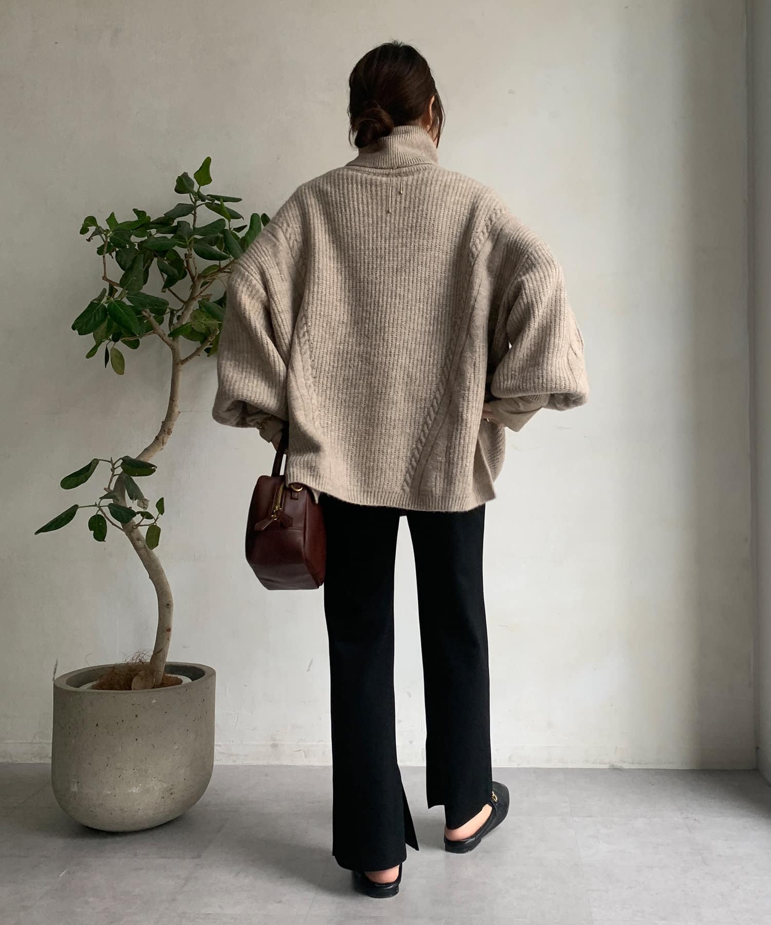 丈の長いざっくりニットやカーディガンなどに合わせて、足元はフラットシューズやブーツインなど。