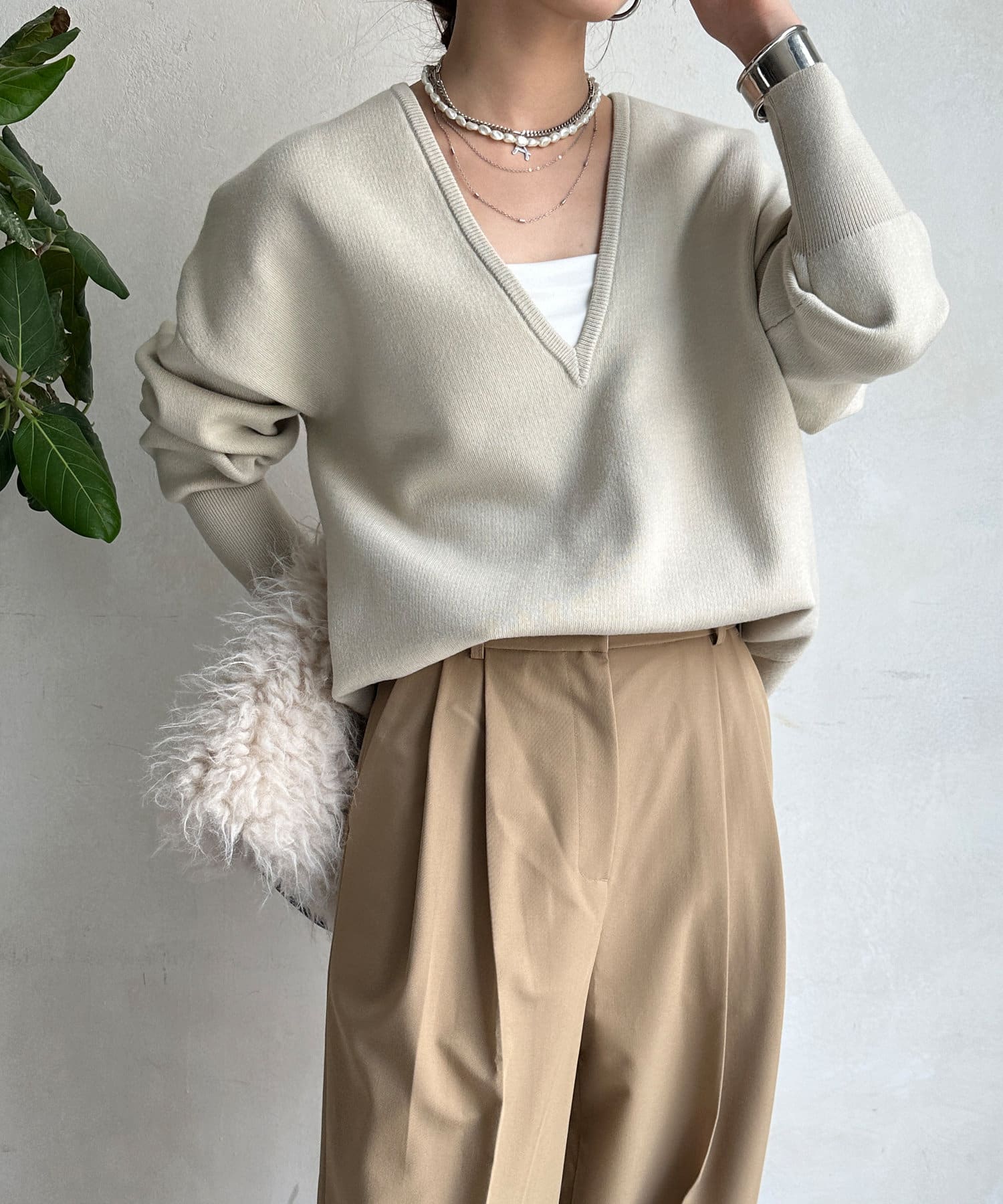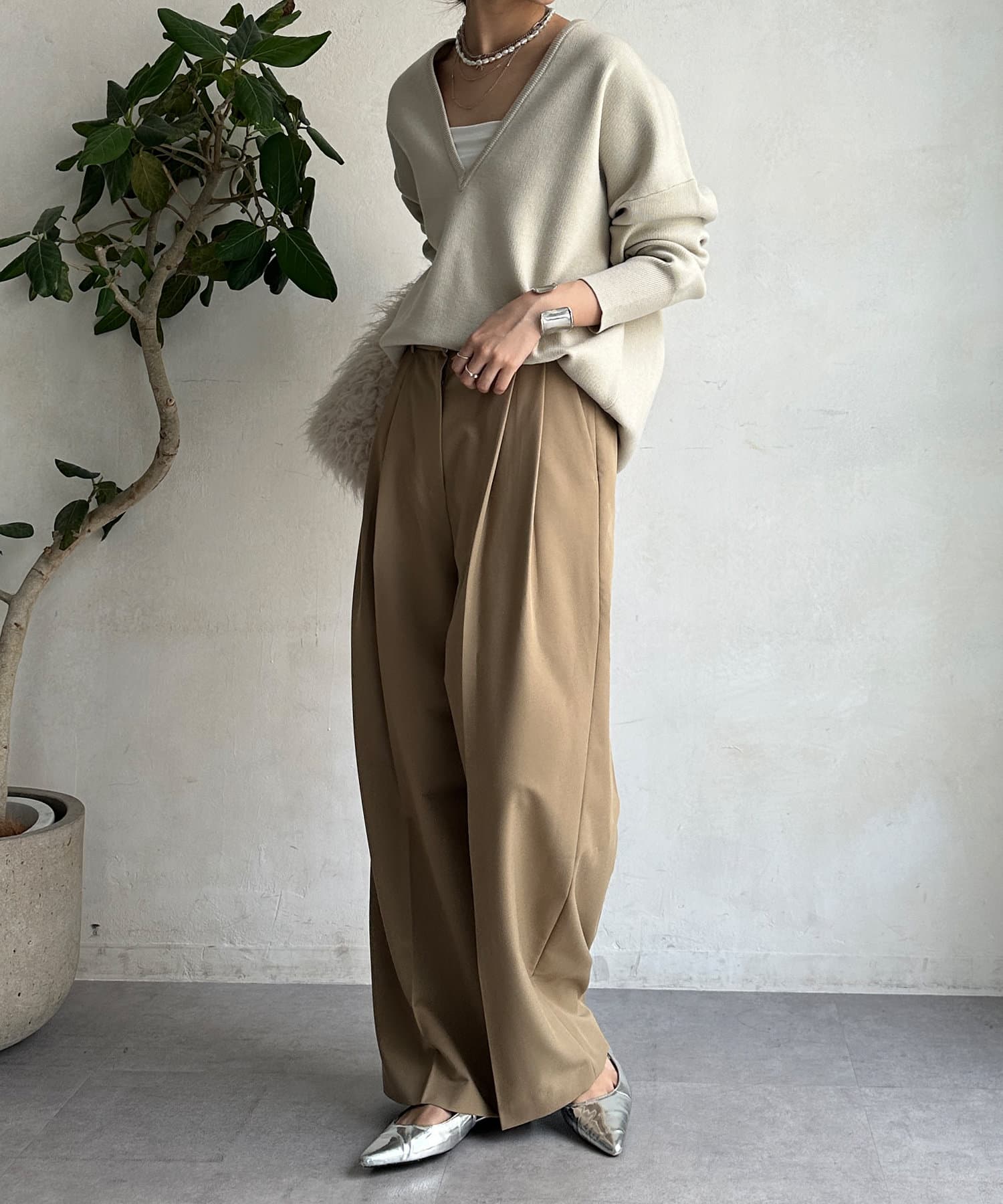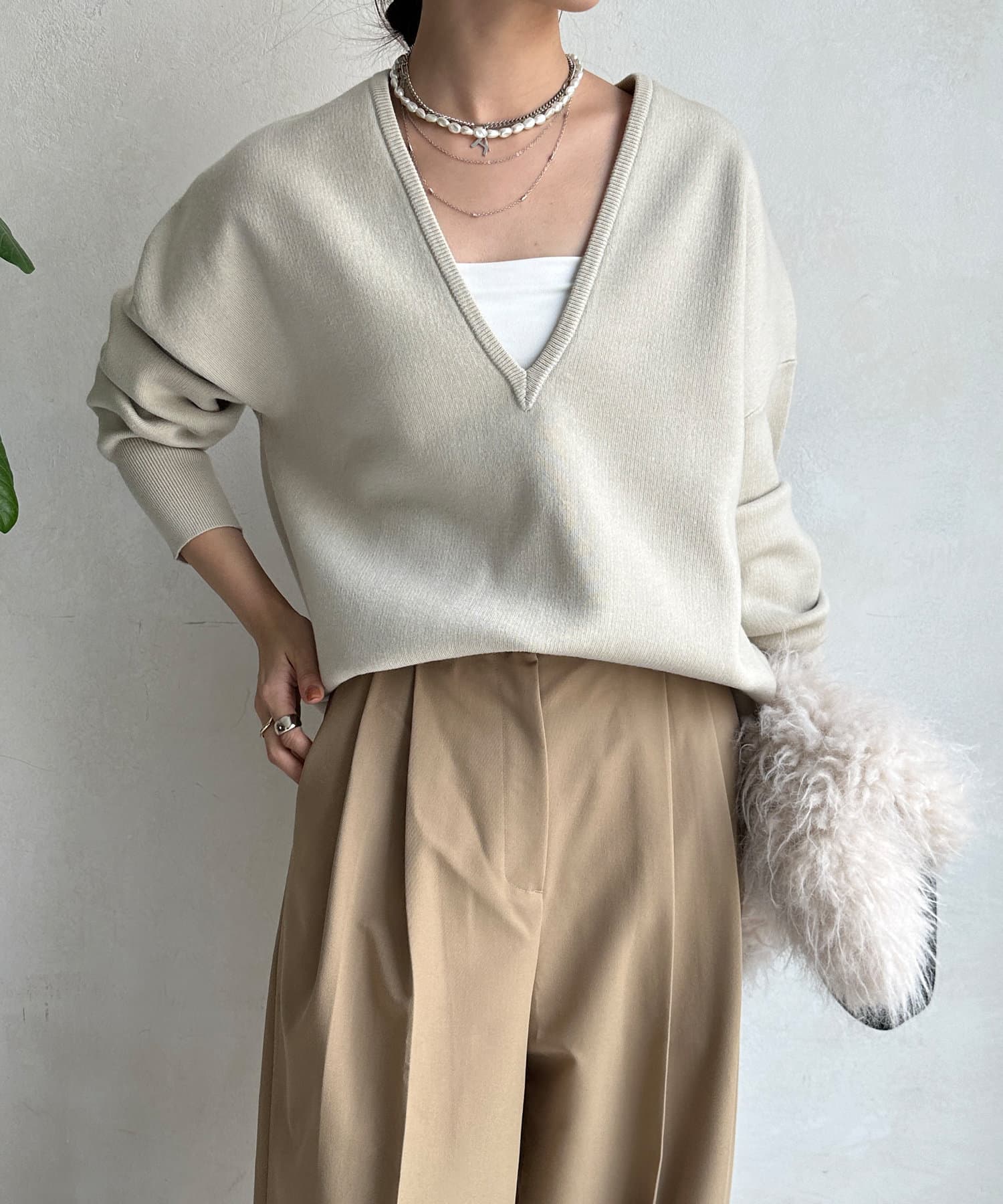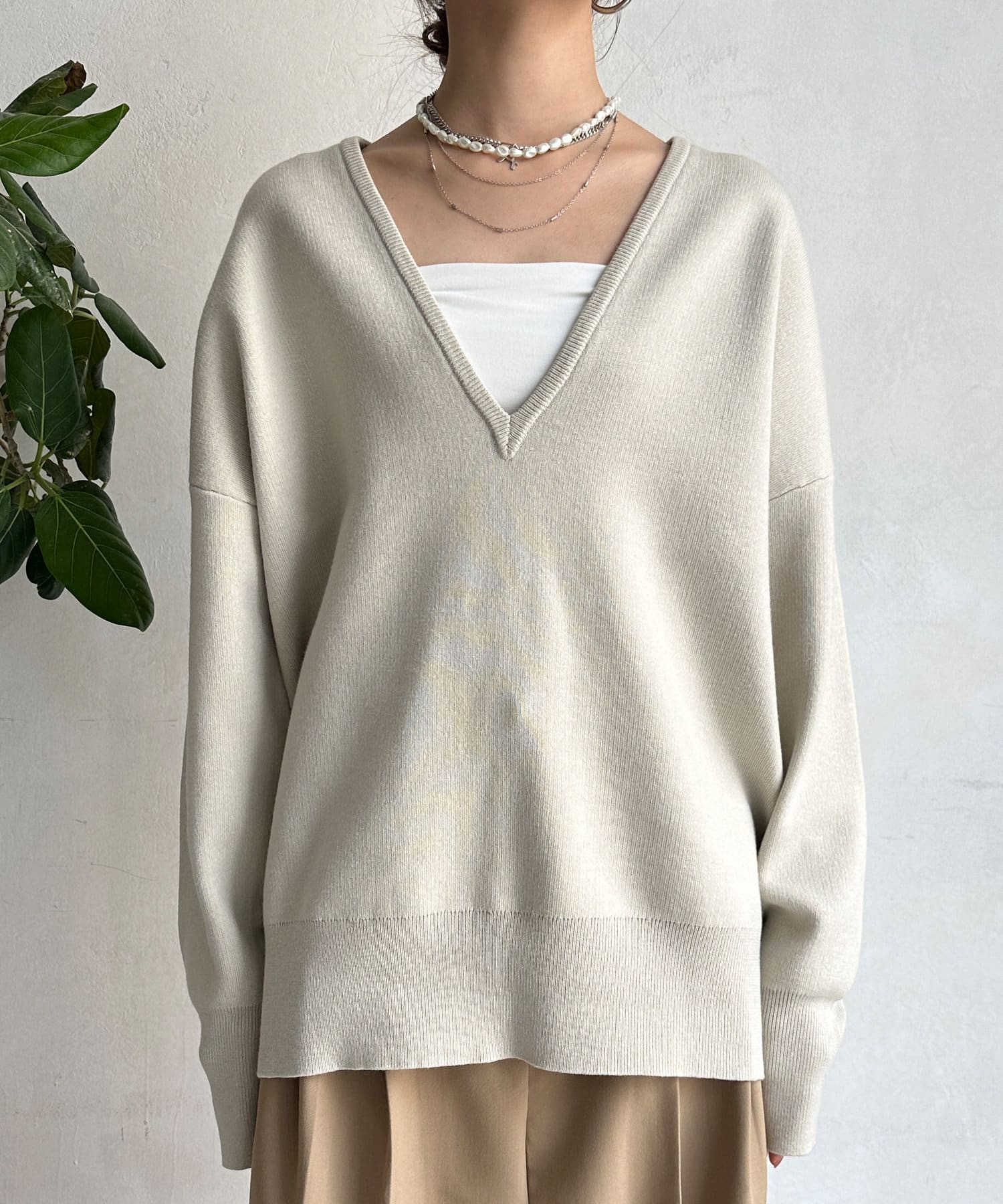 レイヤード映えする深Vネック。