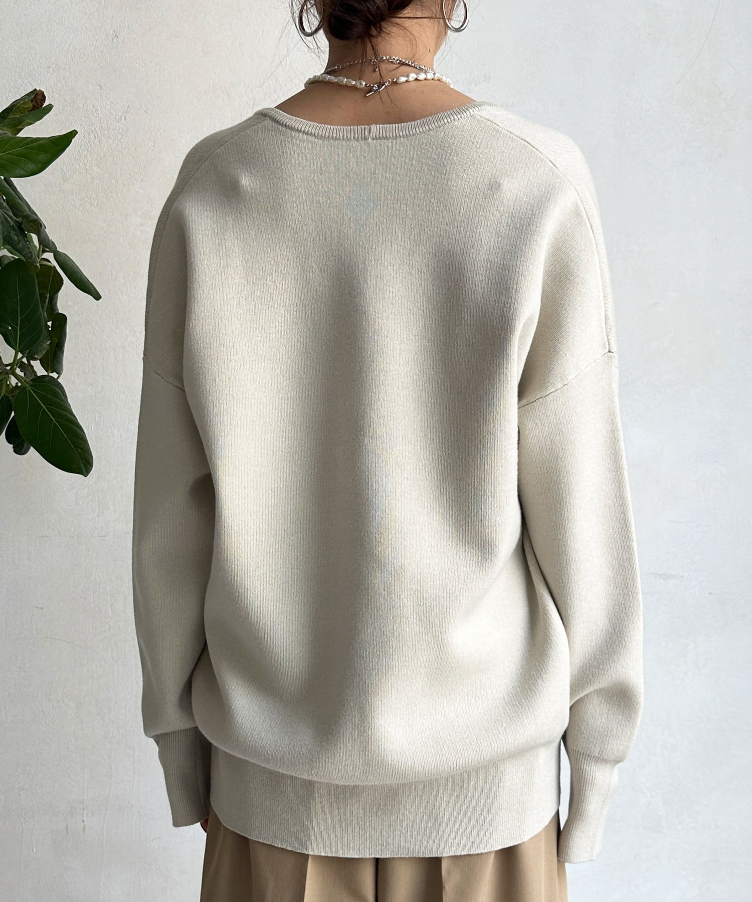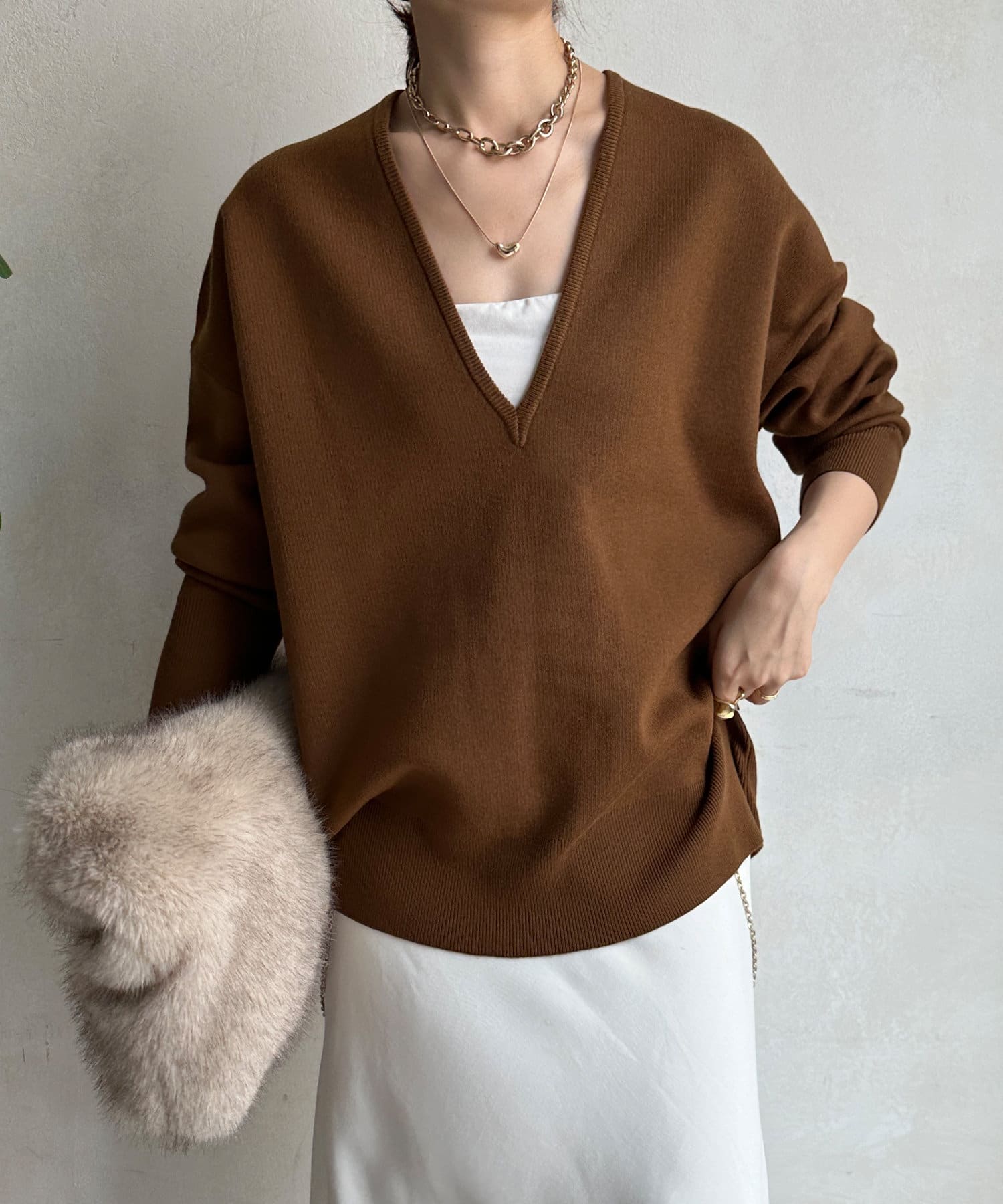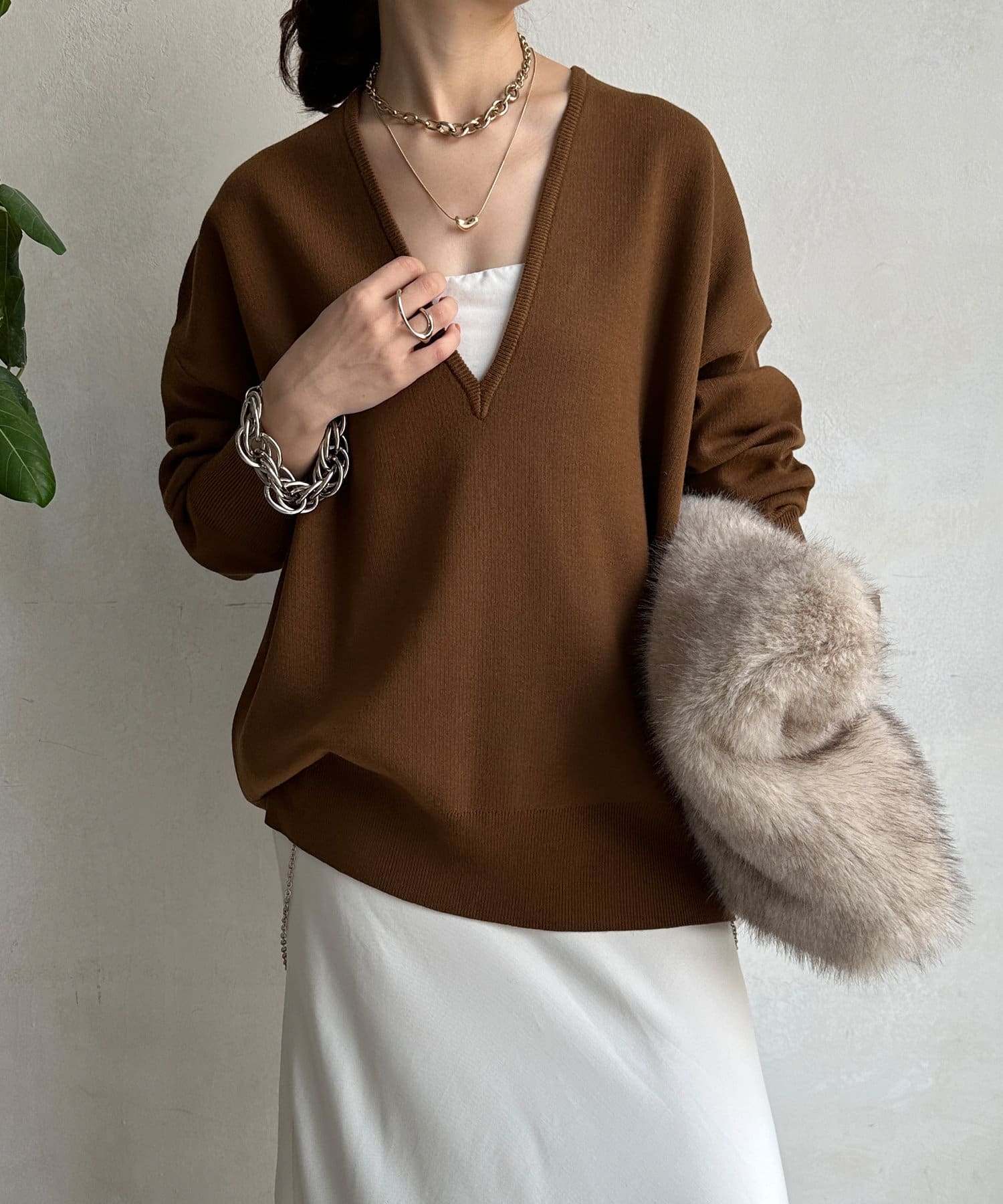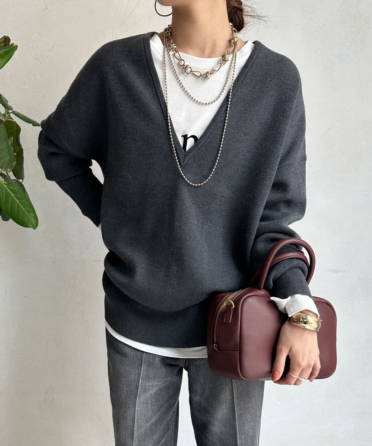 レイヤード映えする深Vネック。