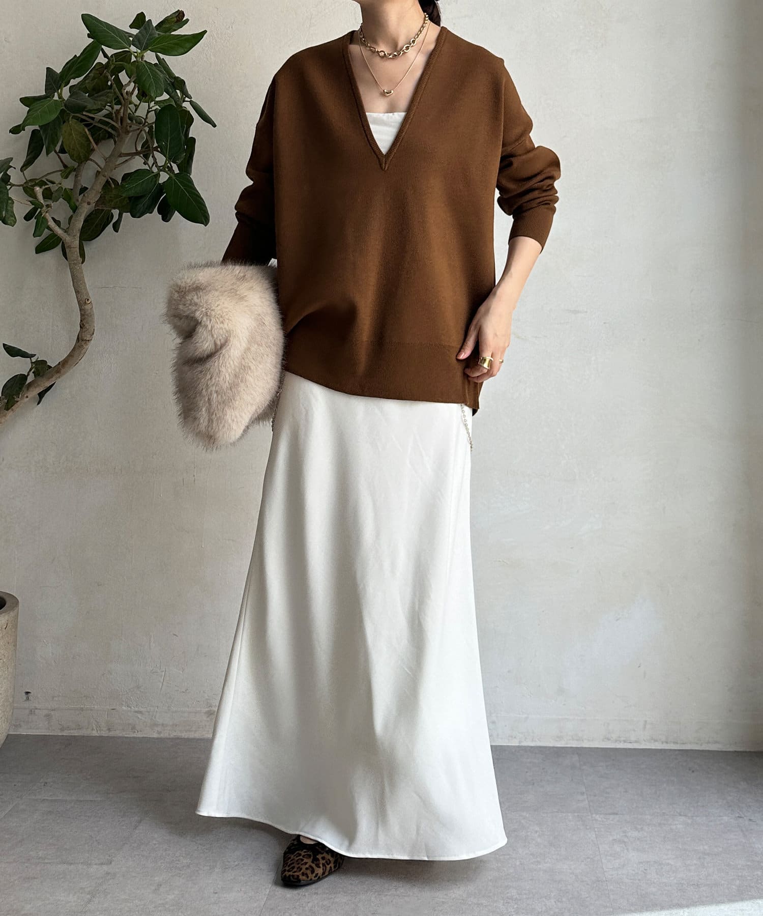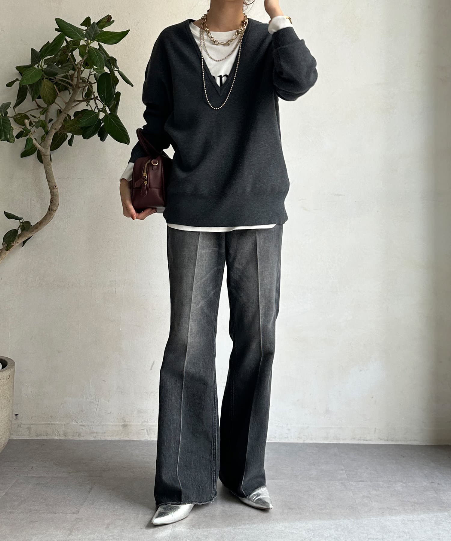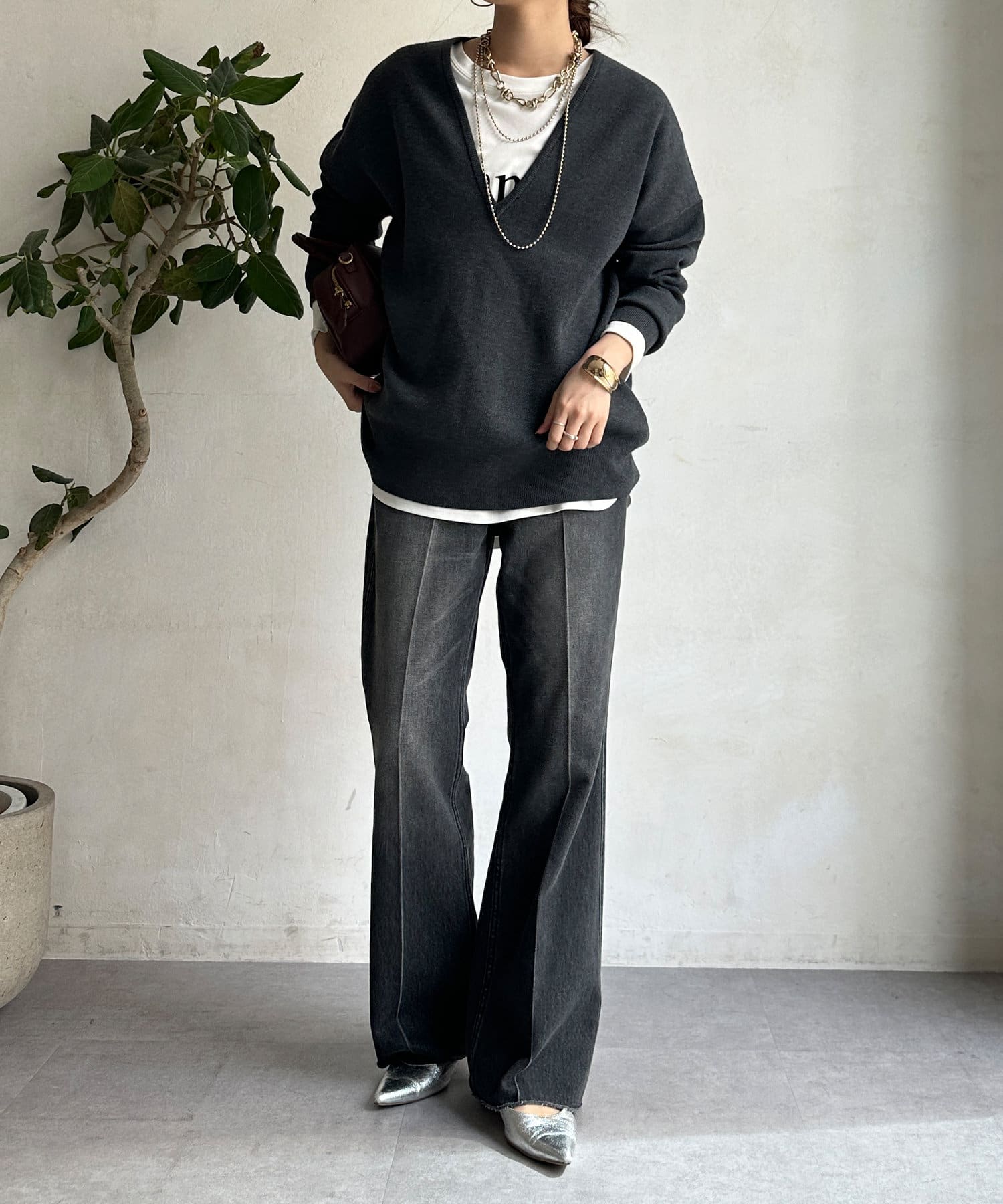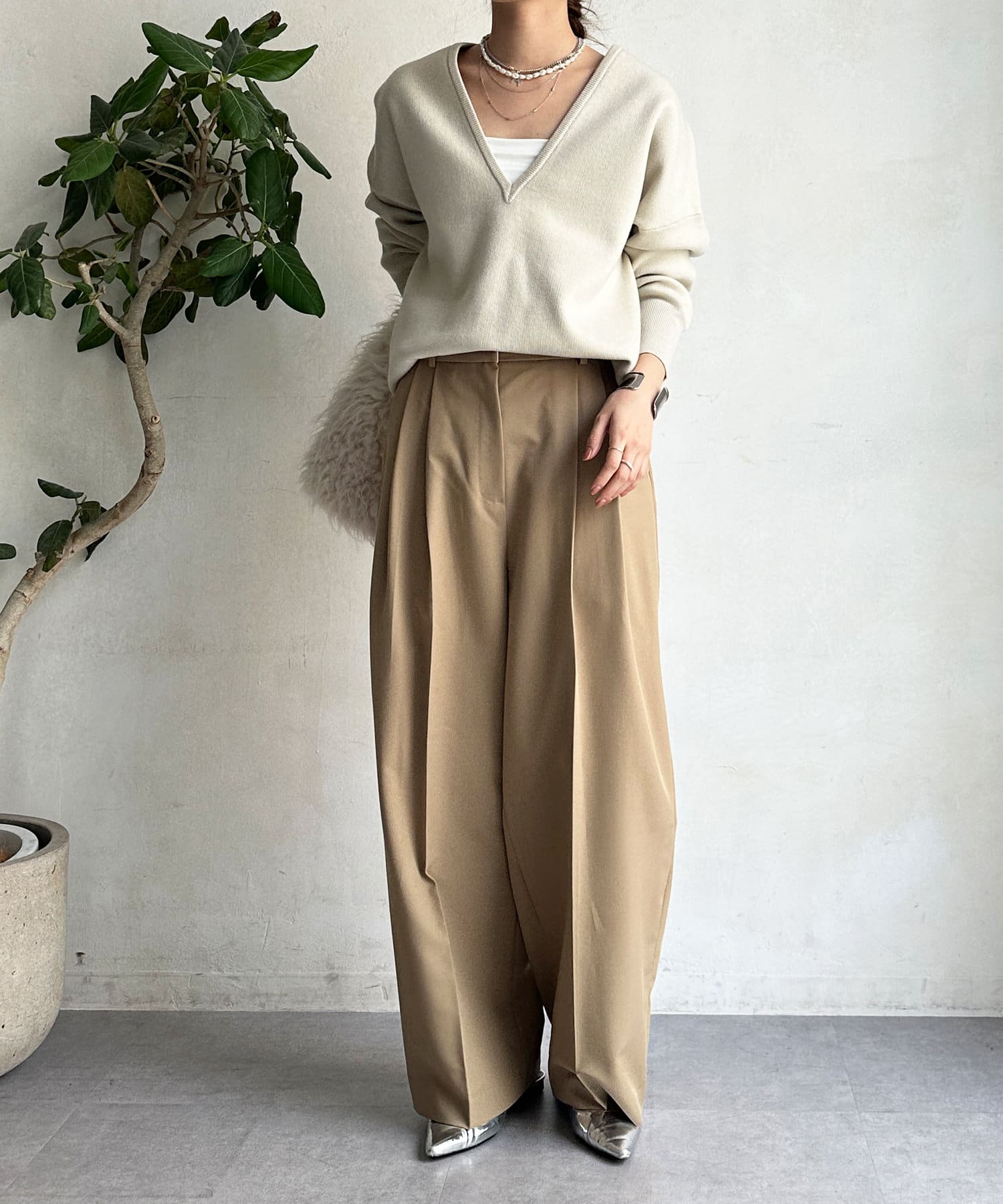 レイヤード映えする深Vネック。