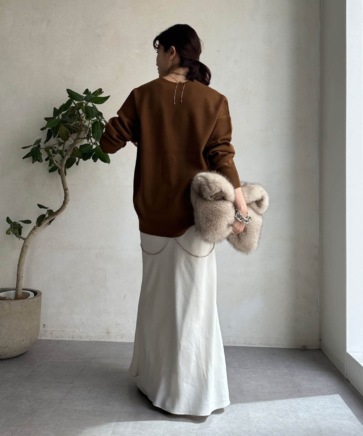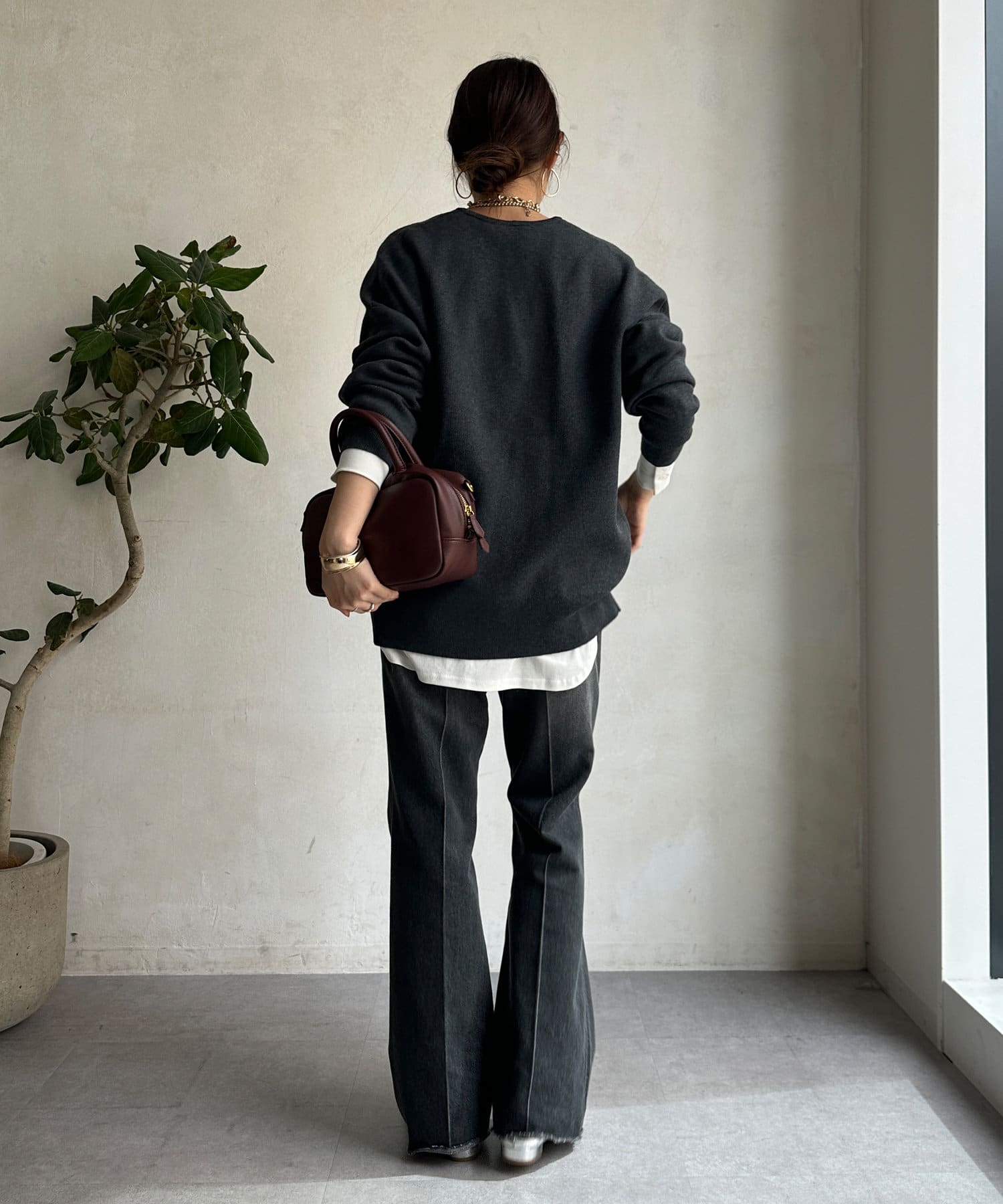 ヒップ周りを覆ってくれるシルエットは、身幅にもゆとりがあり、身体のラインを拾わずに楽々。