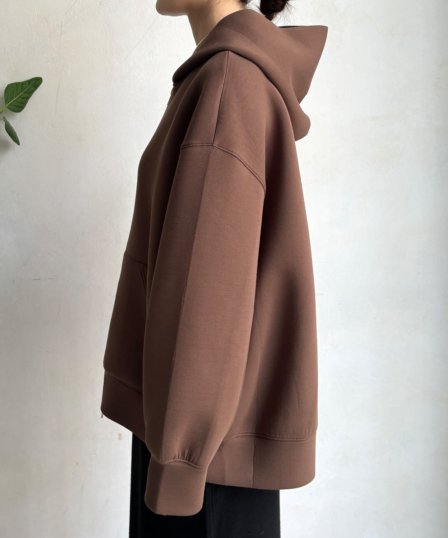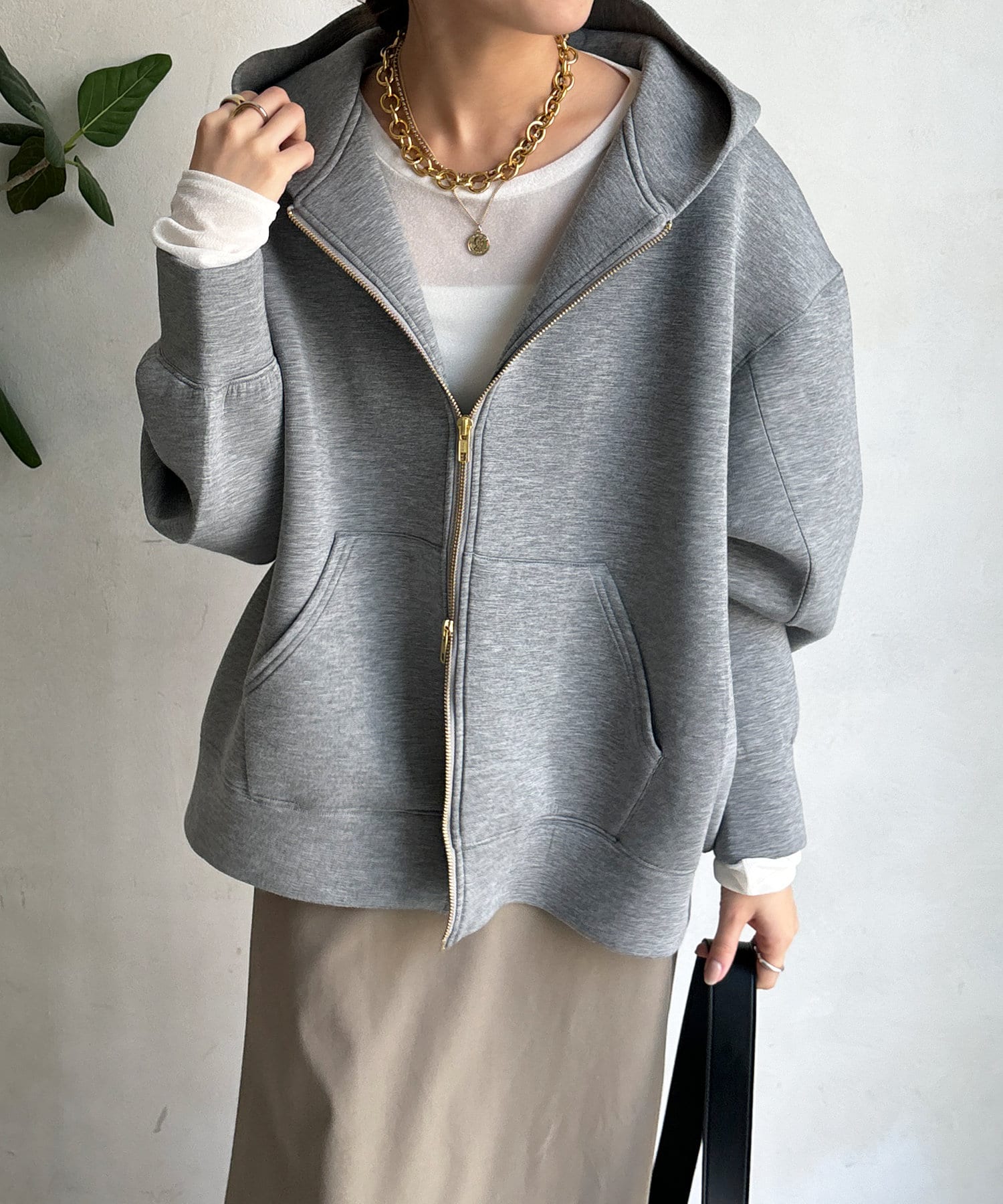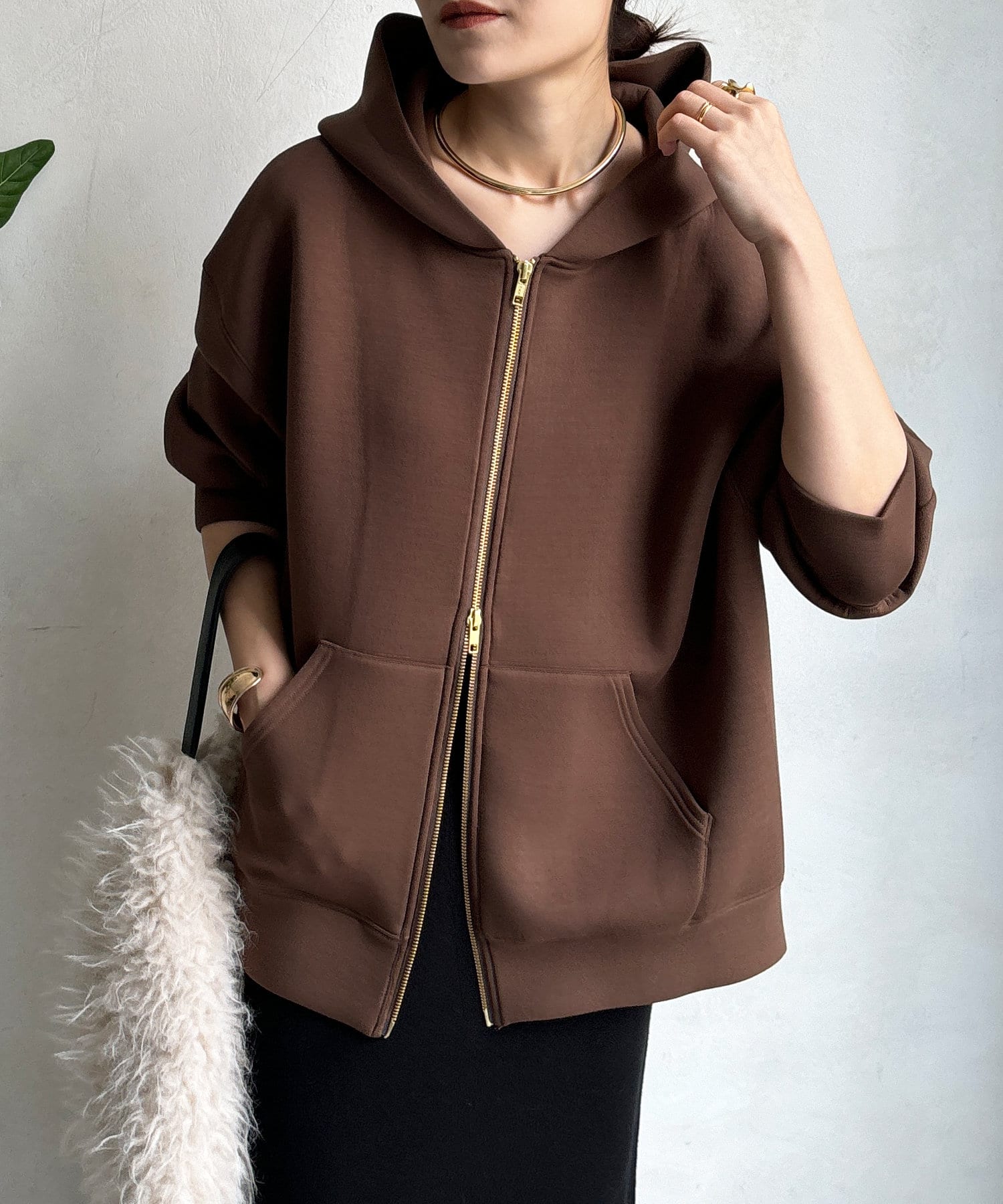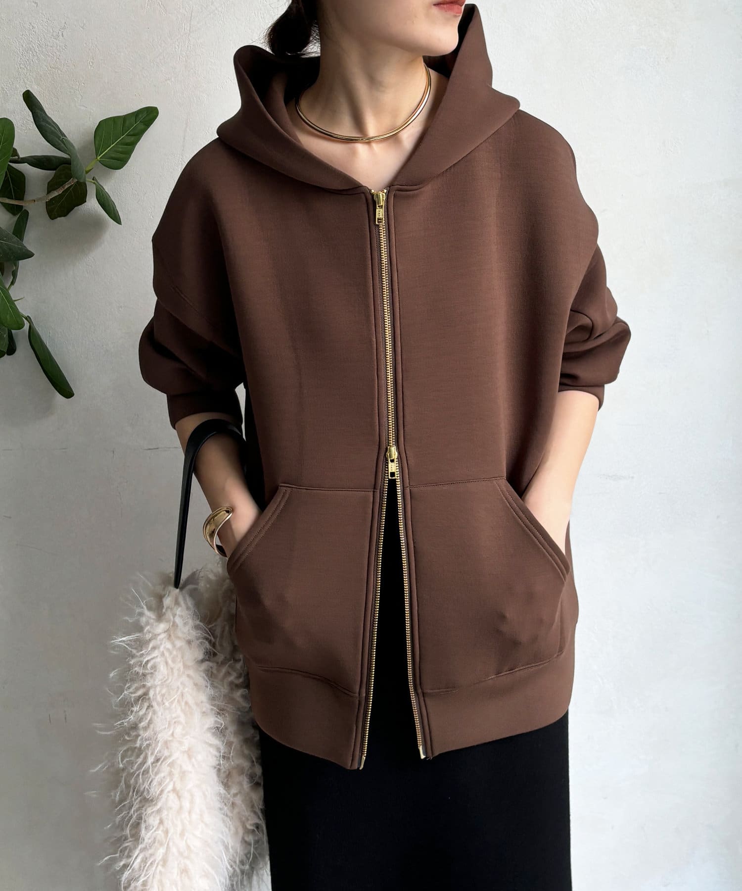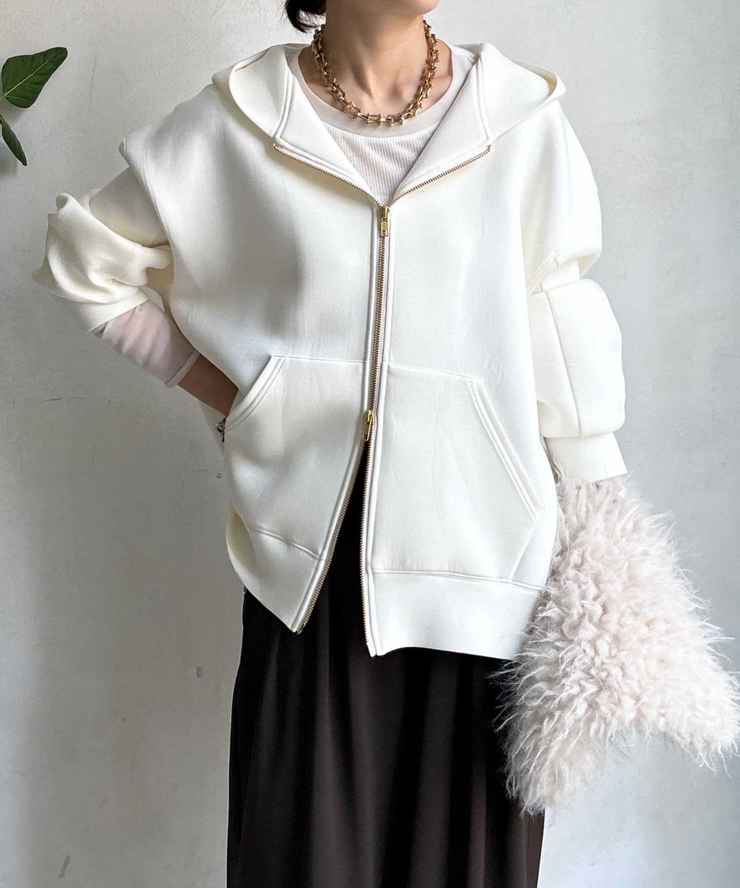 フラットな表面感でカジュアルになりすぎないジップアップパーカーが登場!