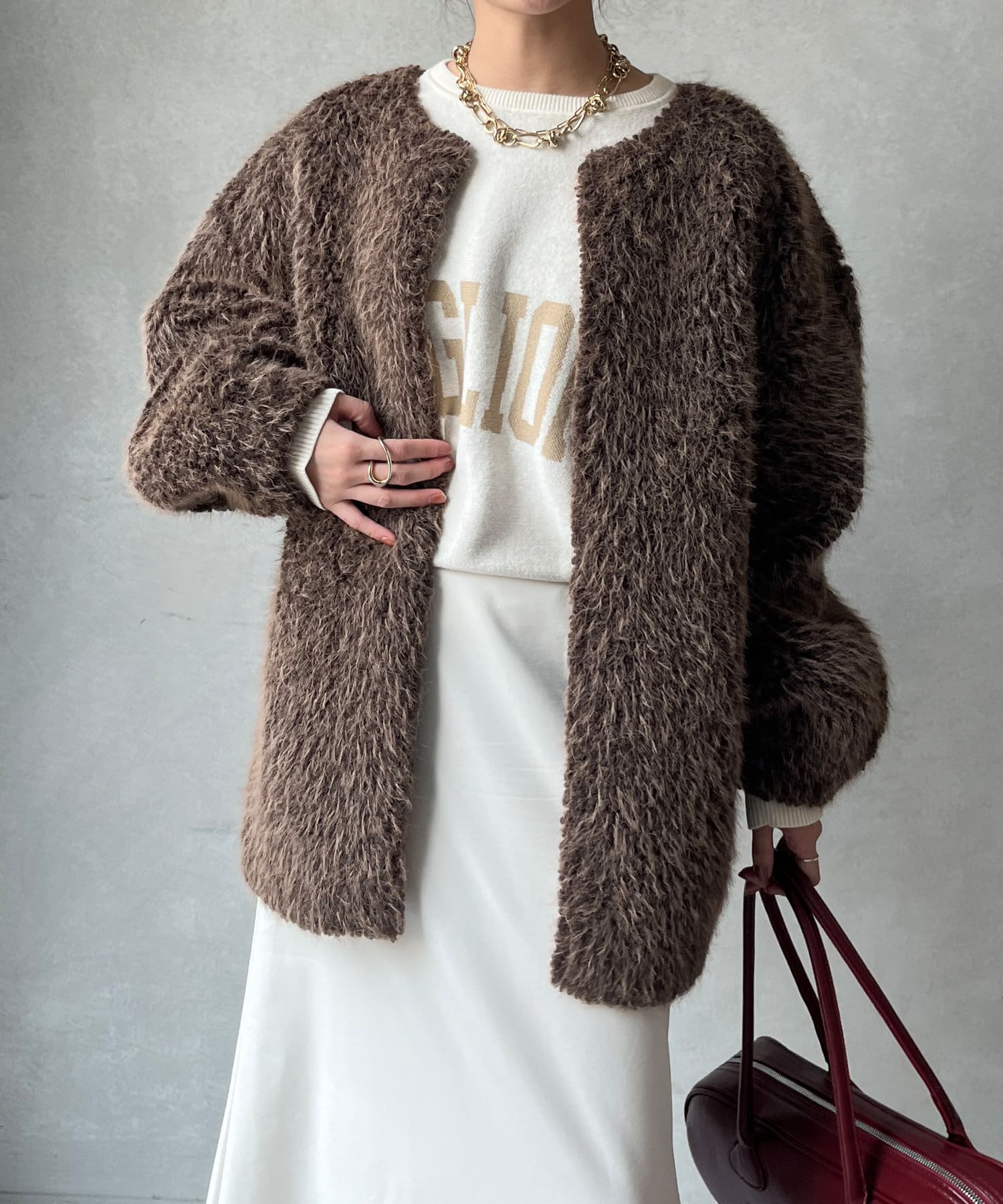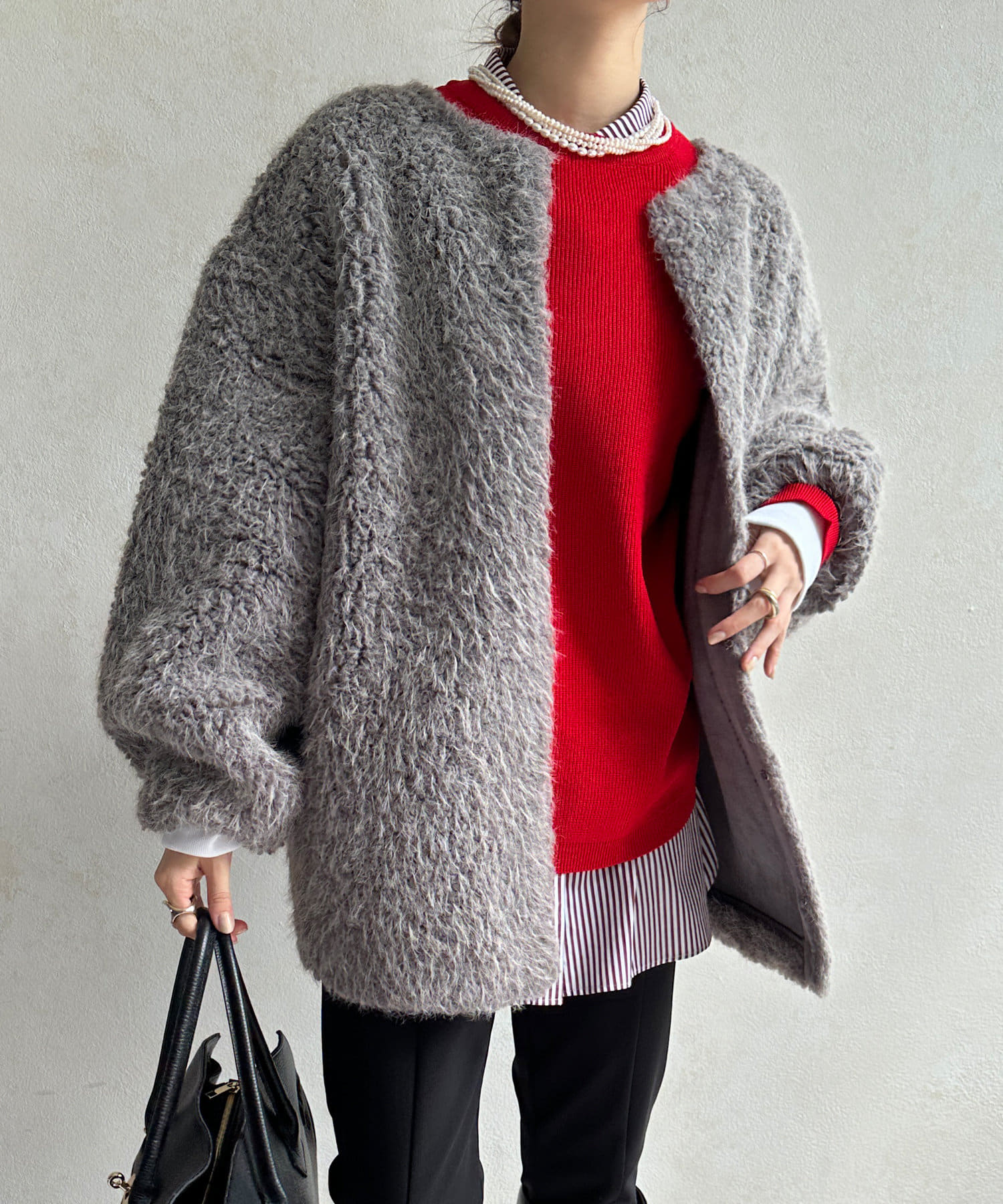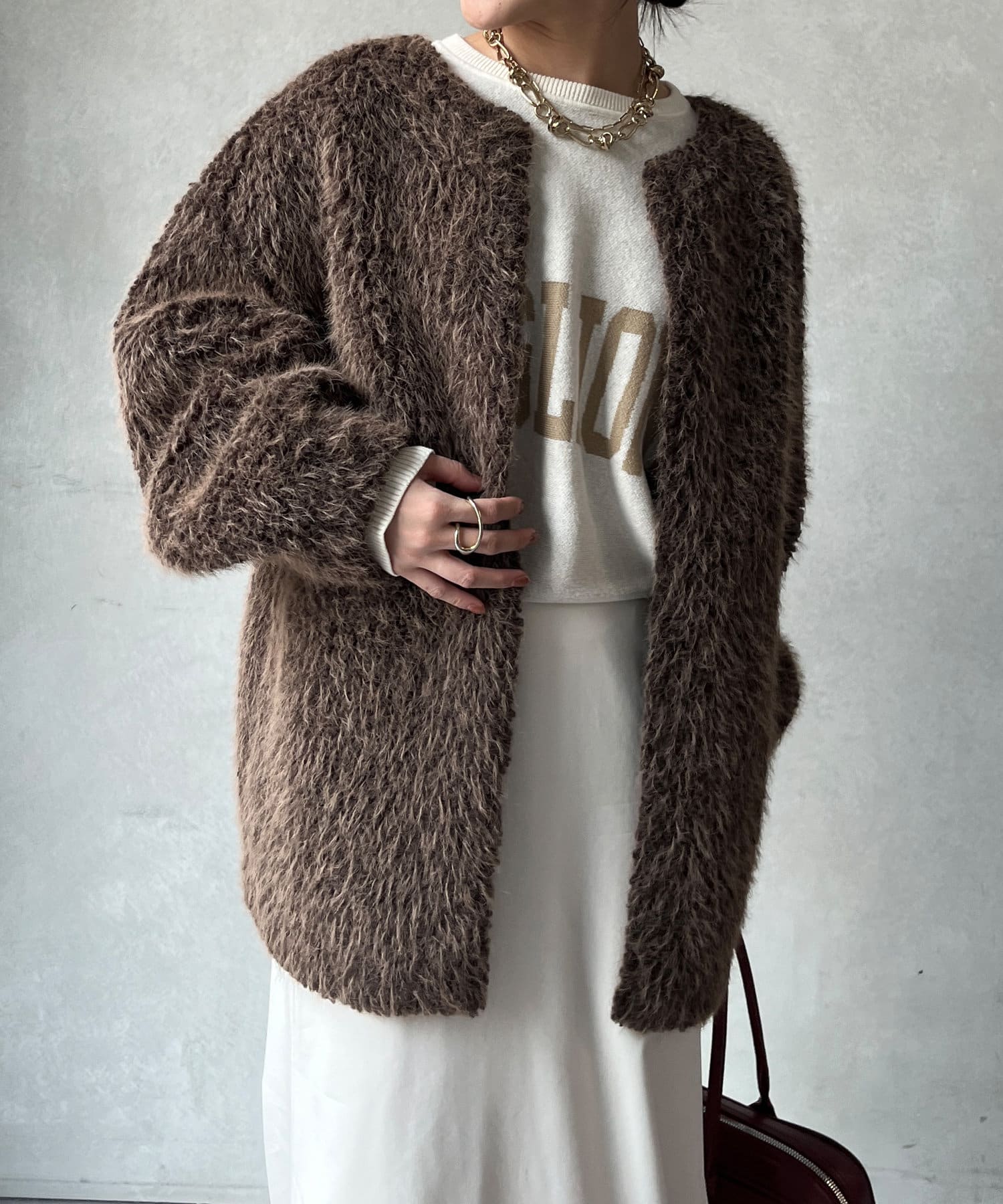 今年気になる毛足感のあるシャギー素材で仕上げたミドル丈コート。